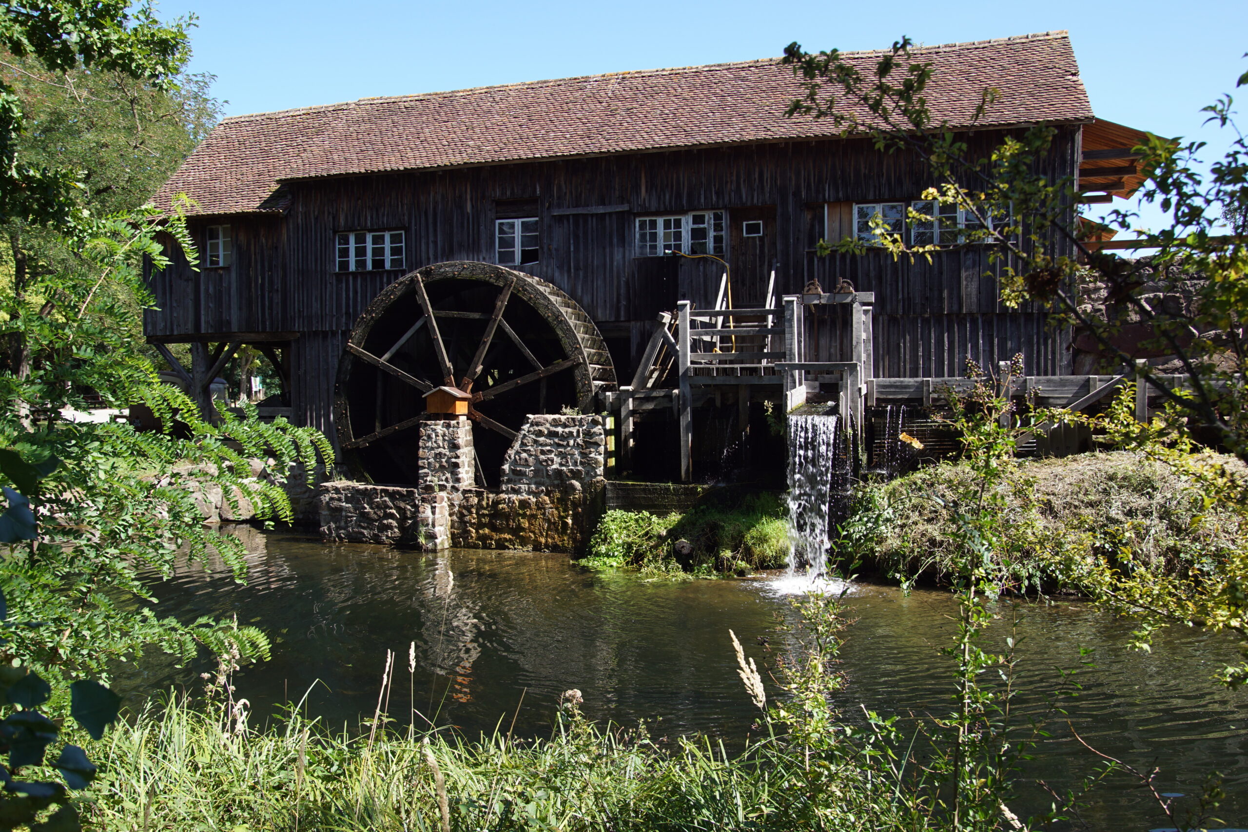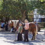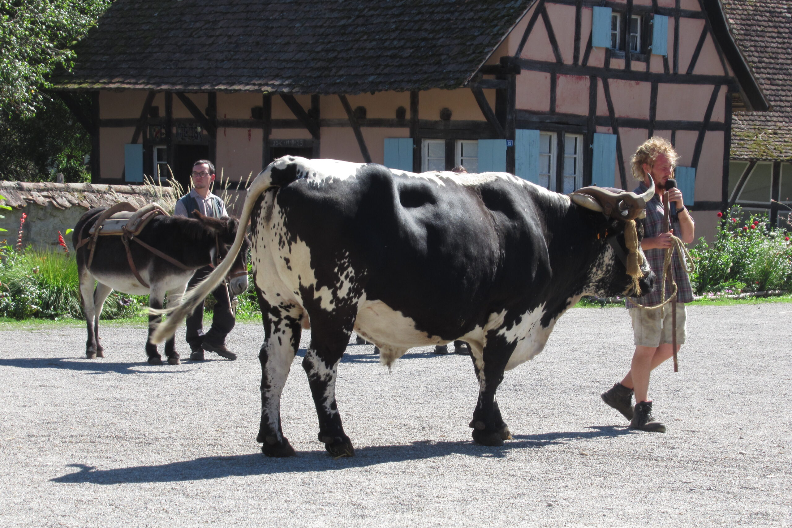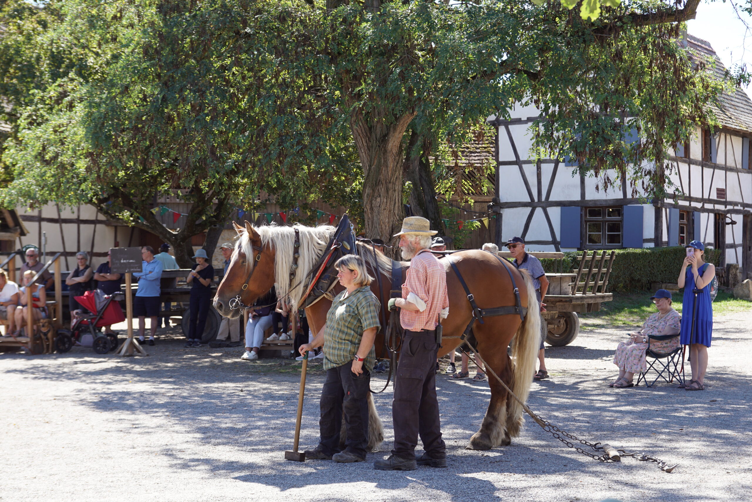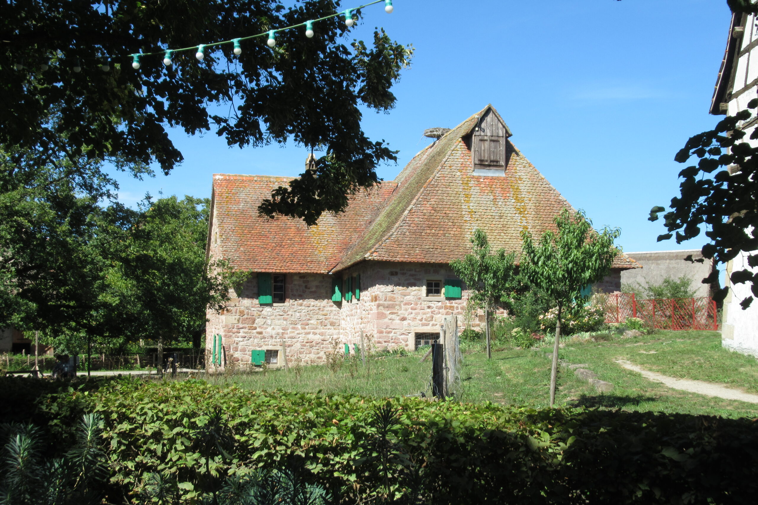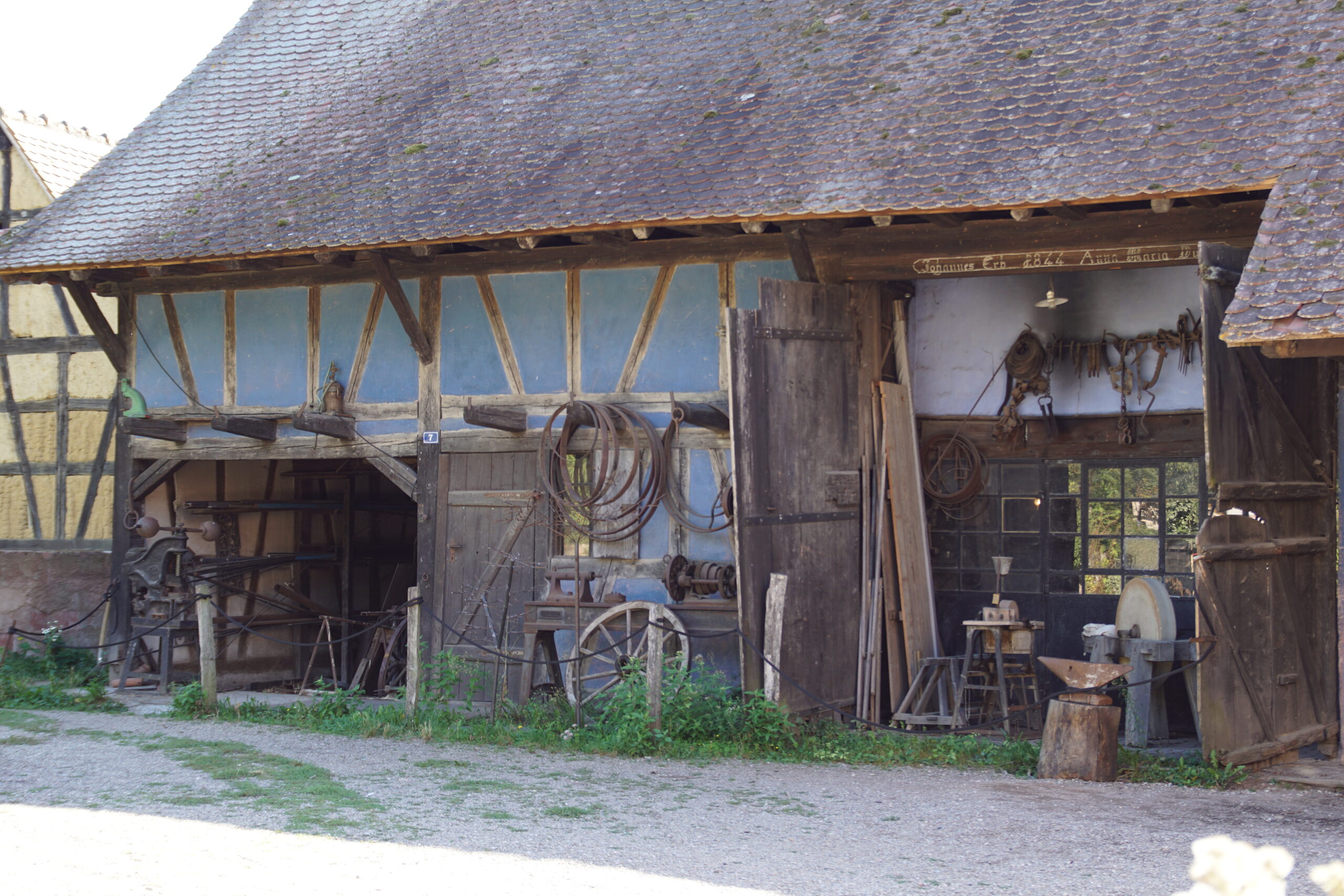 • Après un pique-nique à l’ombre sur le grand parking nous remontons 13km/20mn pour arriver vers 14h00 à l’Écomusée d’Alsace*** près de Ungersheim. C’est un étonnant village d’antan reconstitué (bâtiments récupérés et remontés sur ce site de 10ha), où vivent et travaillent artisans et animaux. Des champs et vergers sont exploités. Vous pouvez y voir à l’œuvre et avoir des explications de différents métiers (pharmacien, forgeron, poterie, cuisine, etc.). Nous y avons passé 3h00, c’était très intéressant et sympathique, mais il faut y prévoir une journée complète (aires de pique-nique sur place). Horaires 10h/18h fermé  lundi, 11€ à 16,5€.