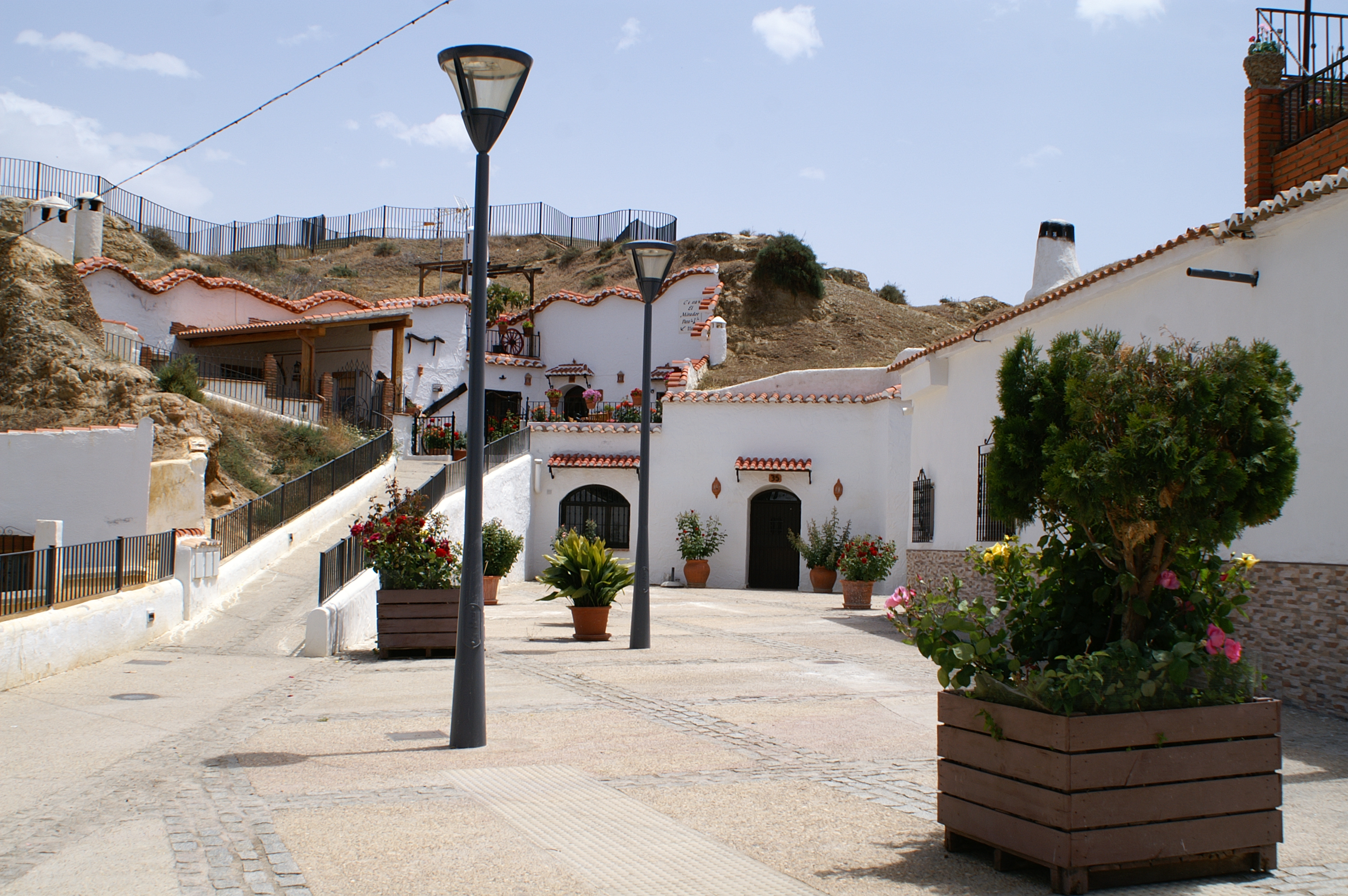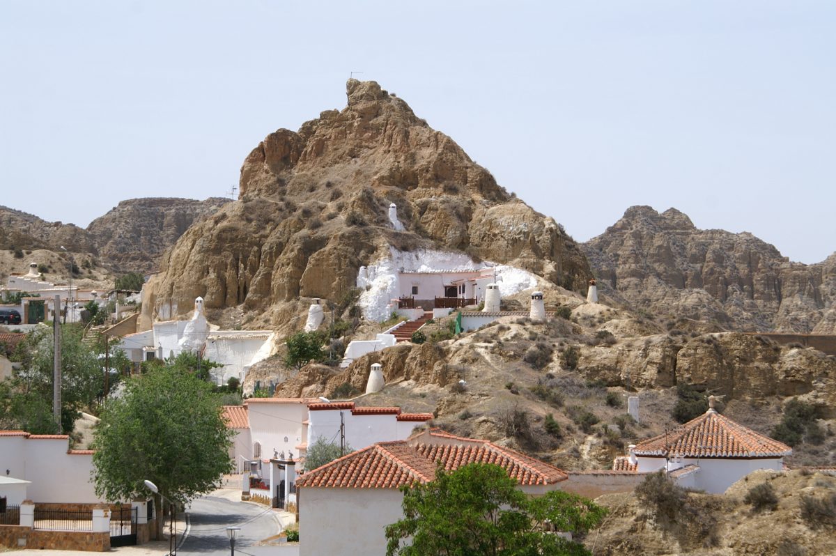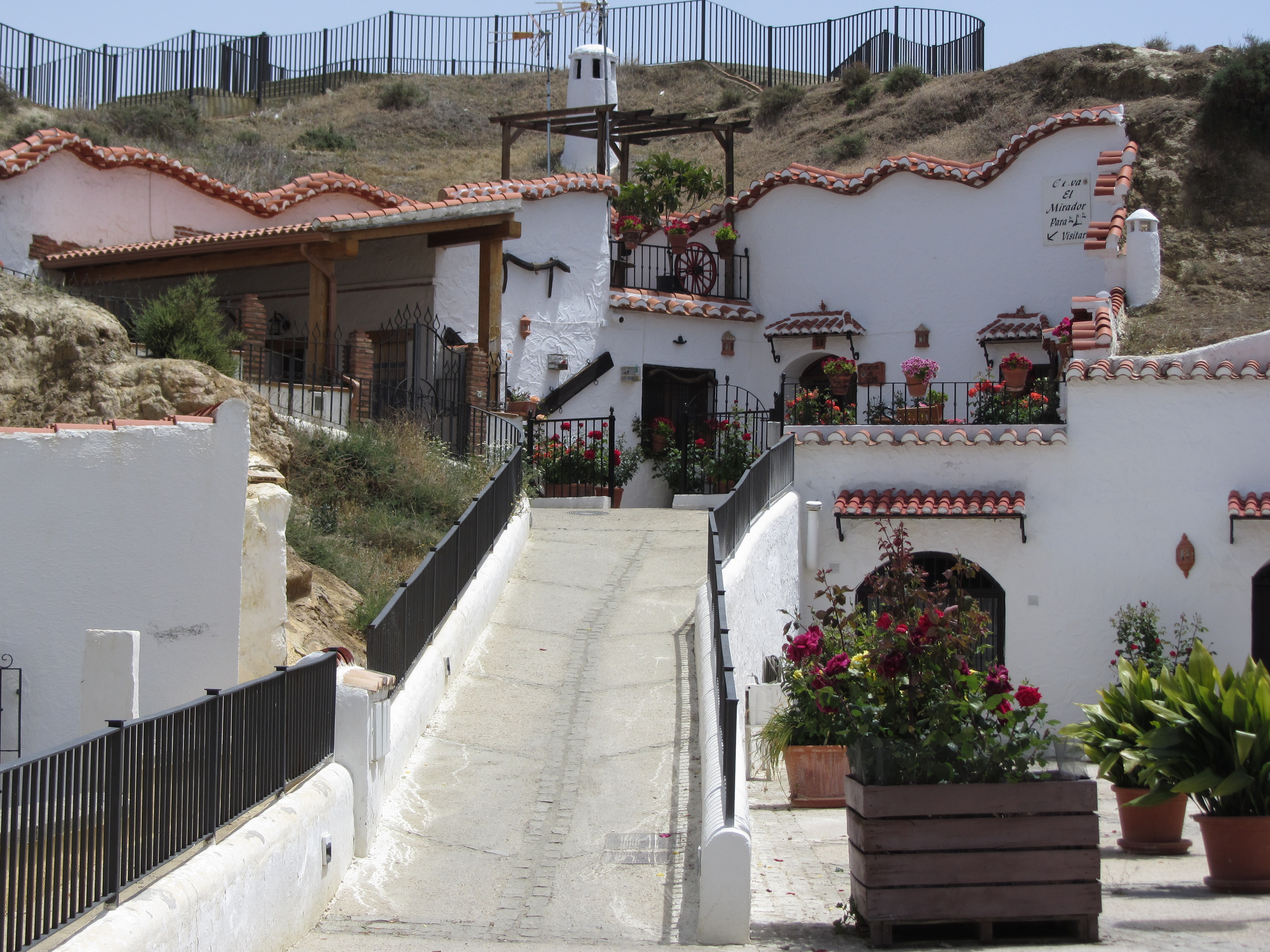 - J12 de Baeza à Tabernas : mardi 24 pour Ubeda à 5km, et cette ville nous inspire plus ! c’est animé est assez joli** mais la Capilla El Salvador* est payante (14€/3 pers.) et moyennement intéressante. La synagogue de l’Eau ne propose que des visites guidées à heure fixe (raté à 5mn près…). Par contre la longue route vers le sud est très belle (des oliviers, des cultures, le désert, les fleurs des talus). Pique-nique à Guadix et visite succincte du site troglodyte** photo ci-dessus. Traversée du désert pour atteindre Tabernas (spectacle cowboy** au Fort Bravo Texas/Hollywood à 16€/pers.), les western spaghetti ont été tournés dans la région, et malgré le peu de spectateurs, le site et le show sont sympas. Chambre d’hôte au Jardin del Desierto avec repas « maison » sur place (un couple charmant dont Monsieur parle Français et cuisine…).