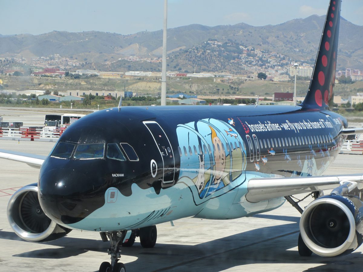 - J18 à Malaga puis vol retour: lundi 30 Mai, au programme la visite de la Cathédrale (ouvre à 10h00- 5€/pers. avec audio-guide), énorme mais bel édifice un peu coincé par les immeubles environnants (voir la Pieta, entre autres). Et en face le Palais Episcopal (expos gratuites), mais celui-ci est fermé sans raison ! donc récupération des bagages à l’hôtel et en route vers l’aéroport (lavage voiture, plein d’essence) pour rendre la voiture (formalités rapides, RAS après 1500km). Fast food hors de prix au Mum’s kitchen de l’aérogare. Puis « surprise, surprise » c’est l’Airbus unique aux couleurs de Tintin qui va nous emmener vers Bruxelles en 2h45. Bien sûr, à notre arrivée c’est de la belle « drache » du Nord et 14°C !! les vacances sont bien finies…