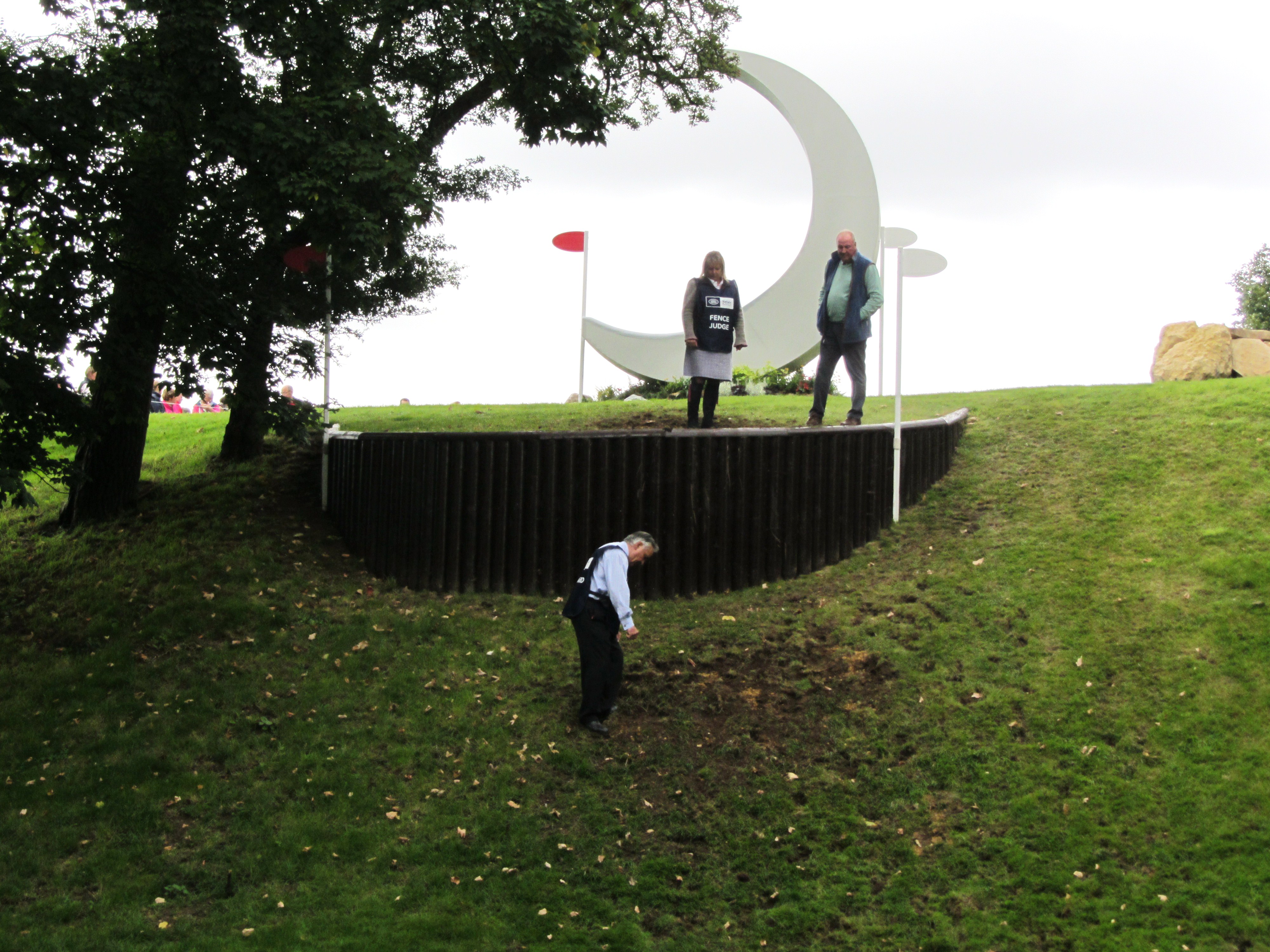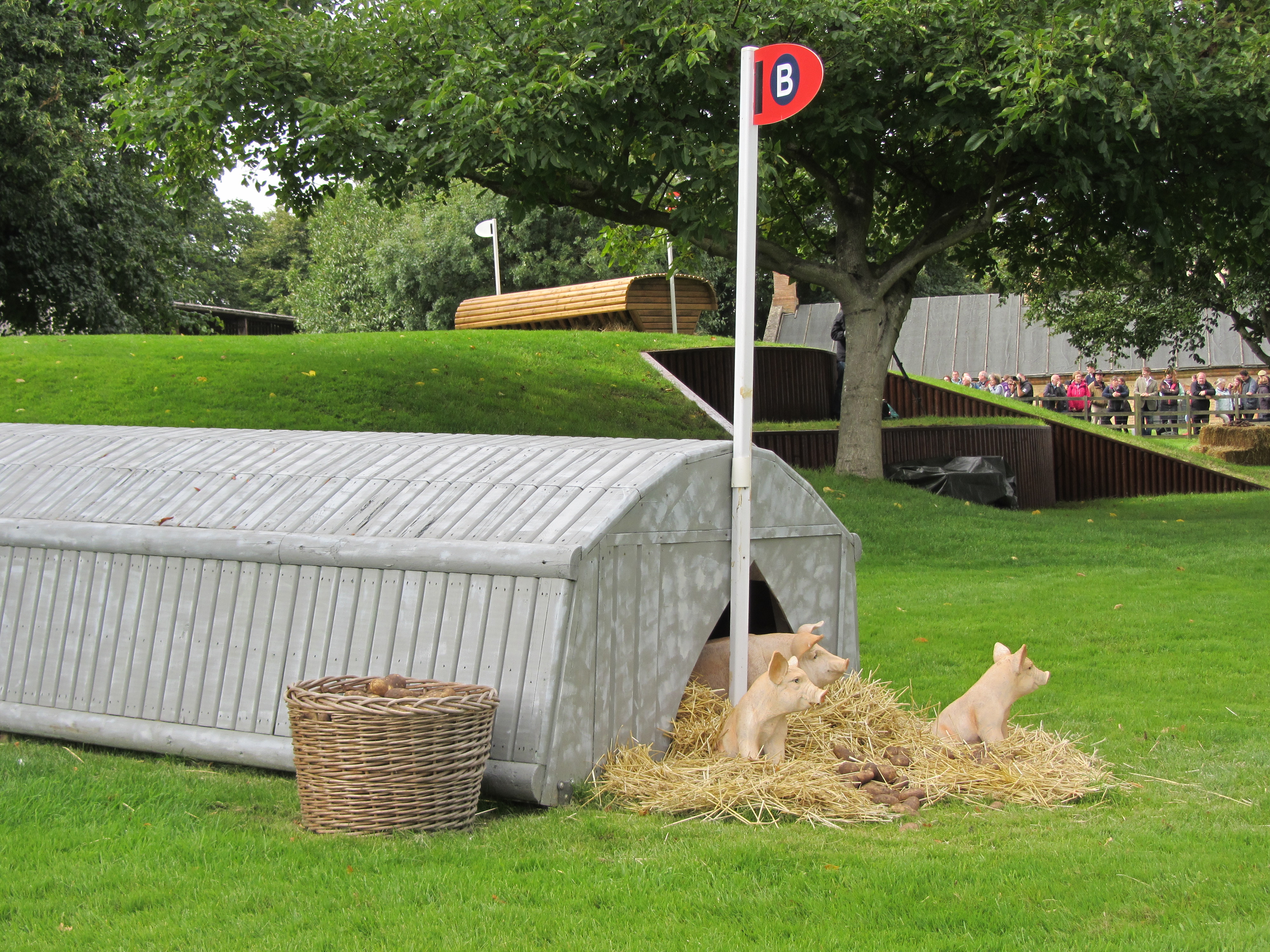 - La partie Cross Test comporte environ 31 obstacles de cross (48 sauts) sur 6370m en 11 minutes 10 environ. Superbe terrain assez vallonné. De l’avis des spécialistes, le chef de piste (Captain Mark Phillips, excusez du peu…), en plus d’inverser le sens habituel, a concocté des obstacles costauds. Rentrer dans le « maxi » fut presque impossible (sauf 2 couples), mais aucun incident notoire.