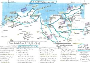 - La préparation : région déjà abordée il y a près de 25/30 ans… donc retour aux sources avec le Guide Petit futé St Malo et +, la carte IGN Top75, et un programme de 4 boucles personnalisées de 60 à 100km depuis St Cast (voir carte photo ci-dessous à D.). Vous remarquerez que ces circuits et visites « tiennent » dans un rectangle de 30km x 20km.