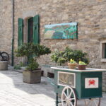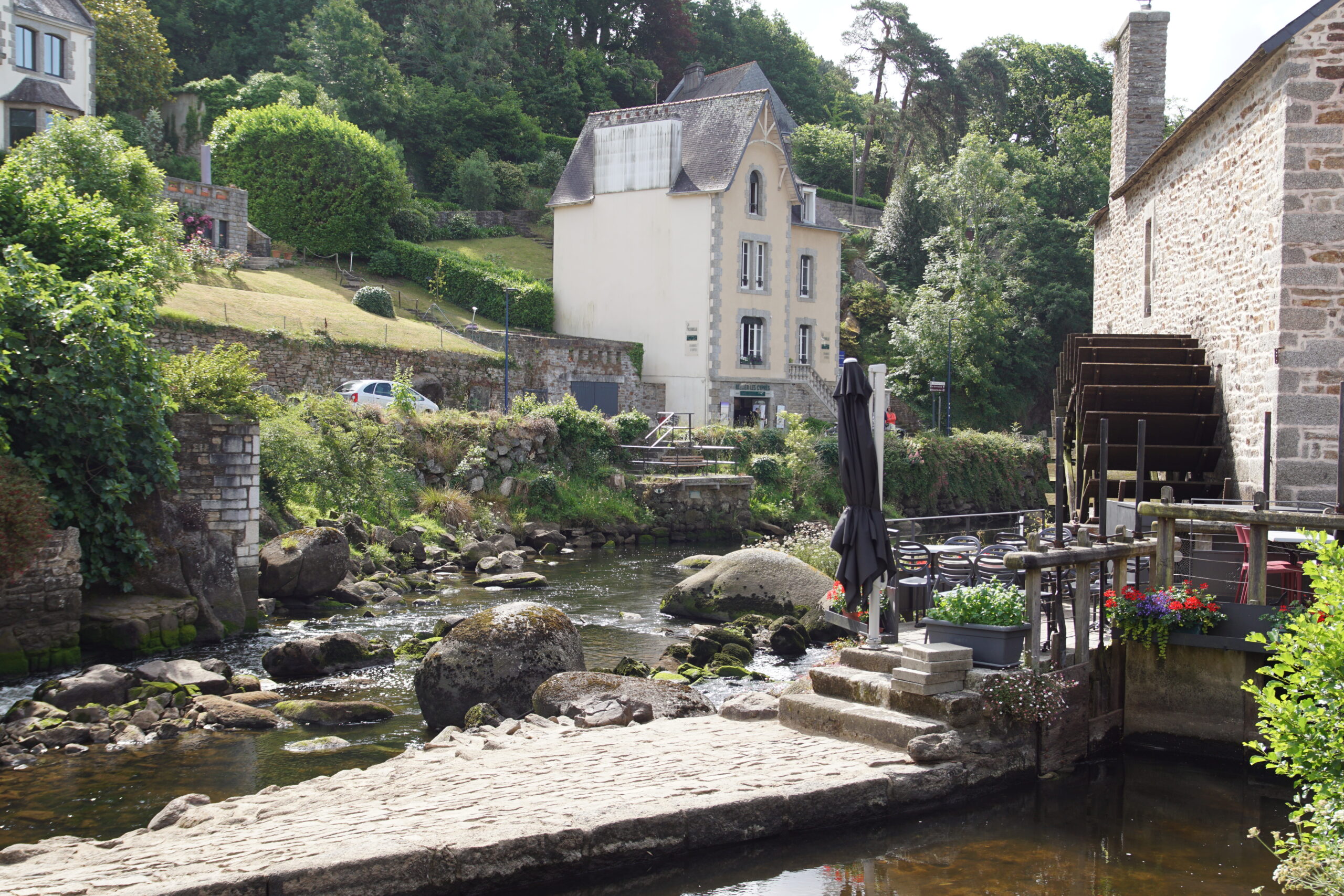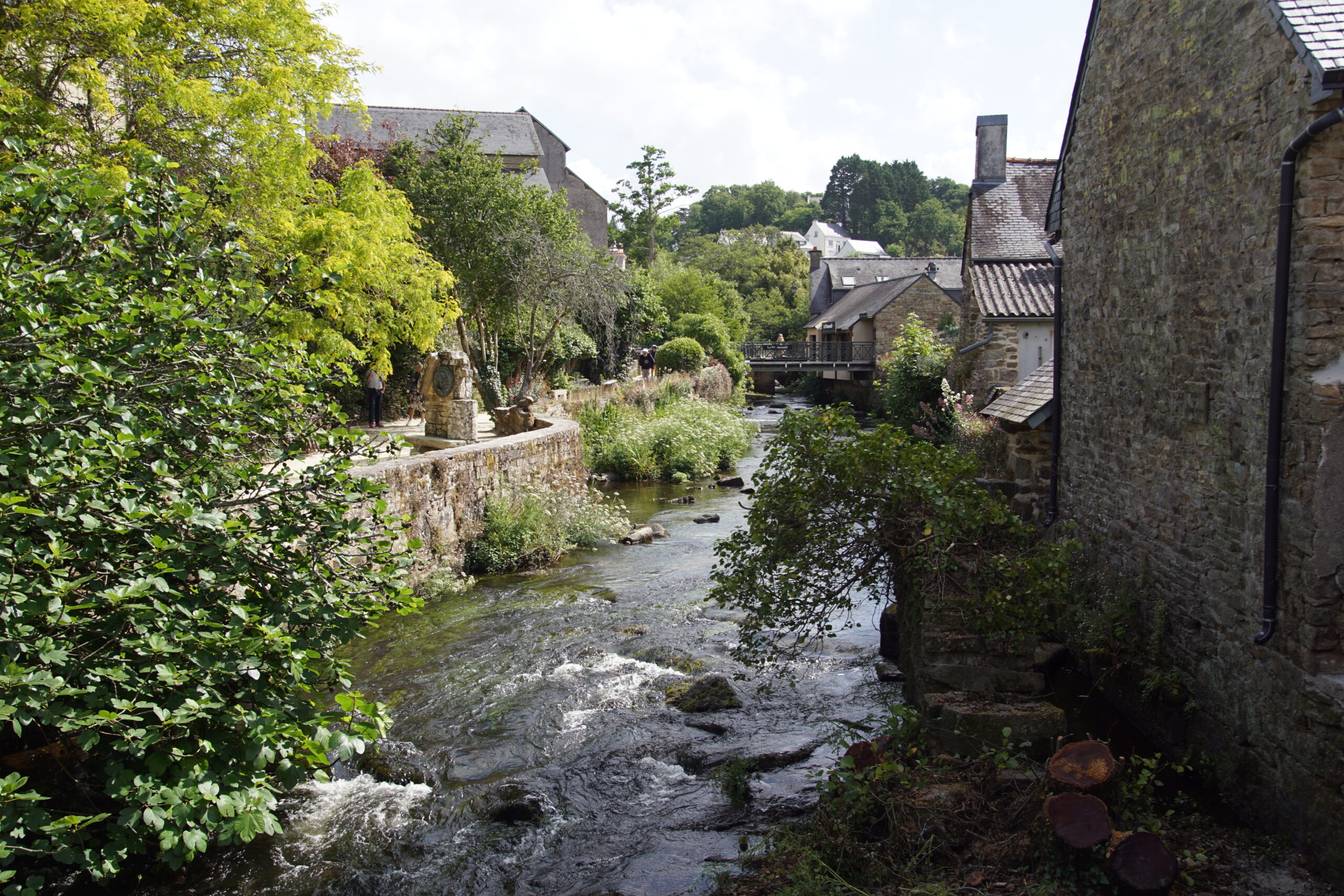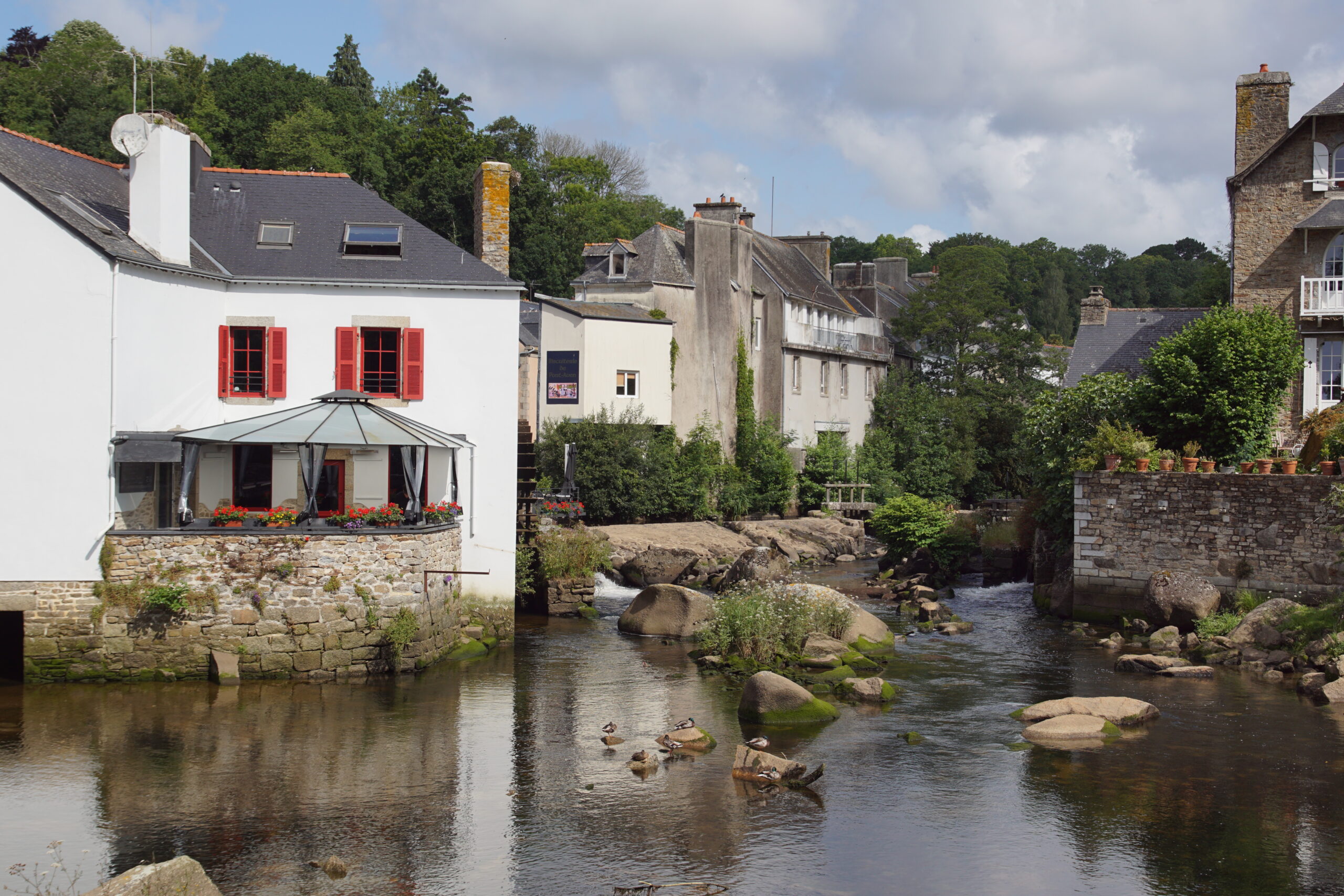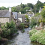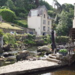 - La météo annonce une journée pas trop mal vers le Sud-Est (et pas trop bien au Nord-Ouest pour Crozon), donc nous modifions le programme pour filer directement vers Pont-Aven***, ses galettes, ses peintres, etc. à 40km/30mn. Balade agréable en traversant la ville sur toute sa longueur, il y a un nombre impressionnant de galeries d’art, de jolies maisons colorées, un cours d’eau (l’Aven) et un ancien moulin. Personnel sympa à l’Office du tourisme, qui nous remet la carte du bourg où figure la « promenade Xavier Grall** » des jardins et lavoirs. Un beau moment tranquille passé ici !