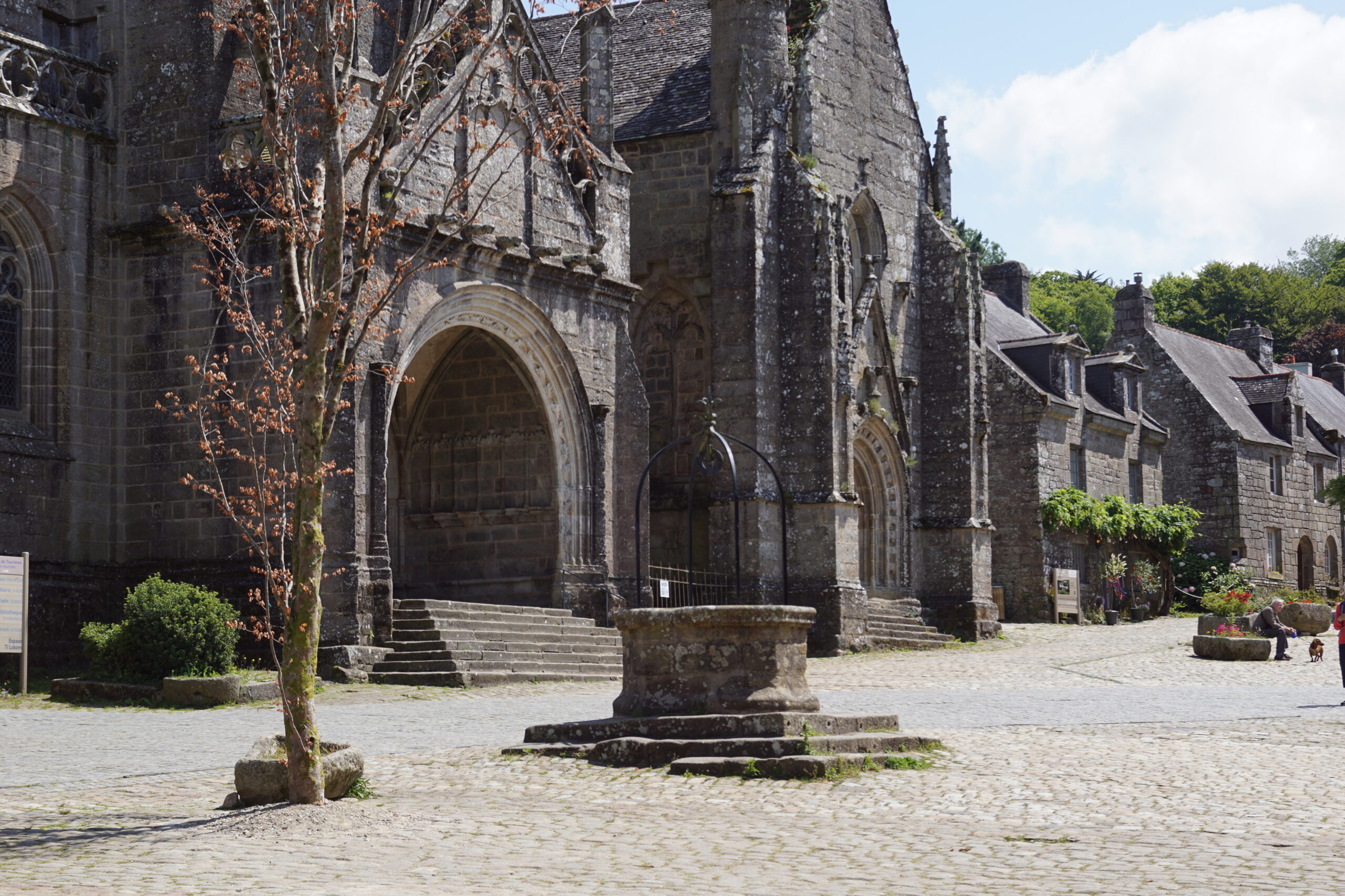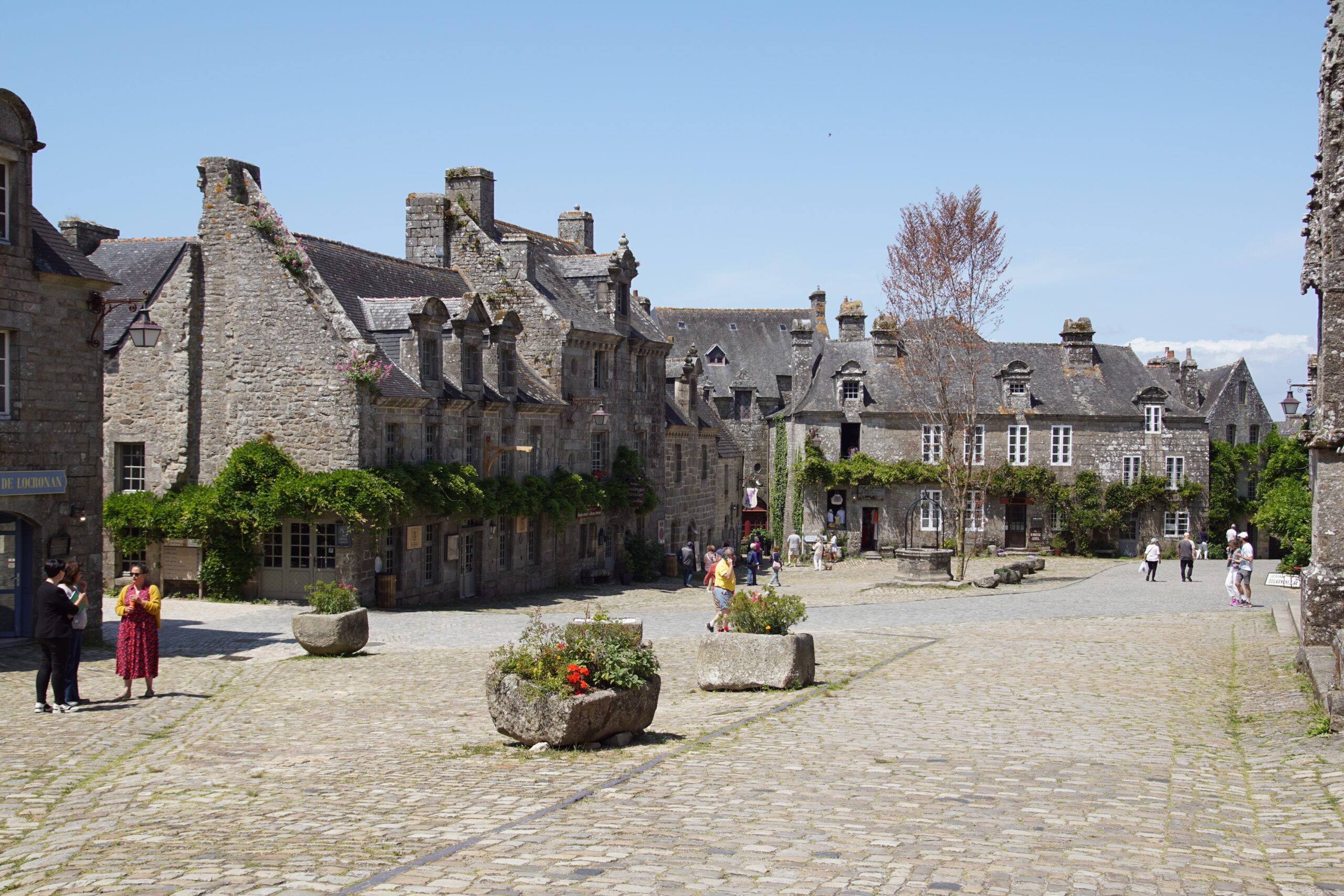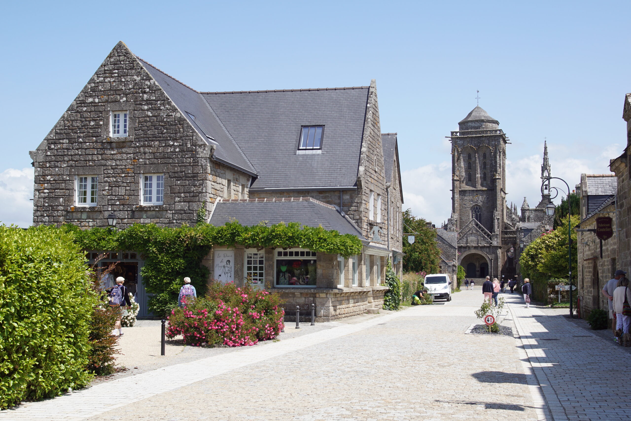 - Nous remettons le cap vers le Nord de Quimper mais plus exactement pour Locronan*** à 43km/40mn (parking juste avant le rond point). Ce village superbe figure dans tous les guides touristiques, et il le mérite, surtout que ce lundi de début de saison ce n’est pas la foule ! La grande place avec l’église est remarquable (photo ci-dessus), mais aller à l’aventure par les ruelles permet de belles découvertes.
