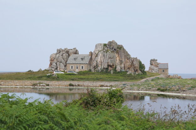 • On ajoute 15km/30mn pour le parking d’accès à la maison* du Gouffre de Plougrescant… Brrrr. Bon la maison coincée entre les rochers est présente sur tous les magazines (photo ci-dessus) et le site est joli. Continuer sur le chemin balisé (550m) vers la mer pour atteindre les amoncellements de rochers où il y en a 2 gros qui laissent un espace où la mer s’engouffre et gronde lorsqu’elle se déchaîne. C’est ça « le Gouffre** » et escalader ces rochers est très dangereux ! et les idiots nombreux. Sur la droite le site protégé propose de belles vues.