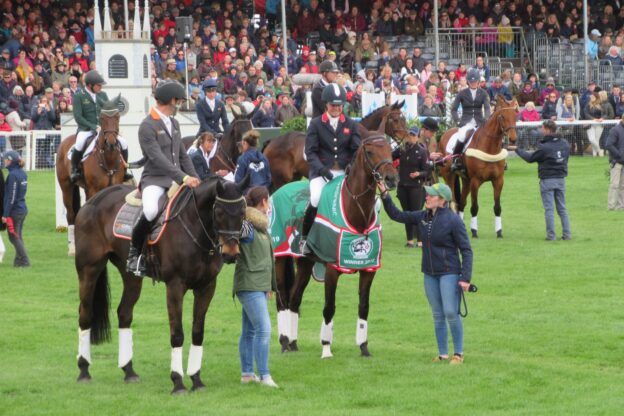 Pour le sport, Andrew Nicholson à battu son record de 38 parcours terminés ici depuis 1984 et attrape la 5ème place (à 57 ans…), mais c’est Piggy French qui gagne, et nous sommes sur la dernière et 15ème photo ci-dessous (cliquer dessus pour agrandir) ! belle brochette de couples primés et assistants sur cette photo d’en tête).