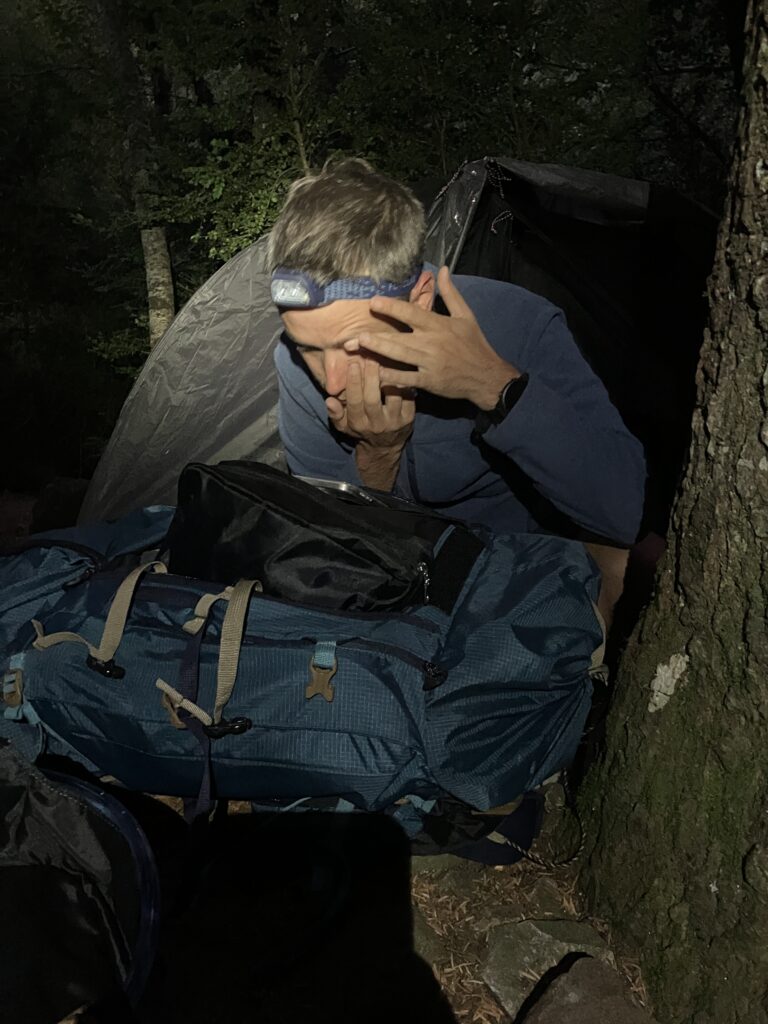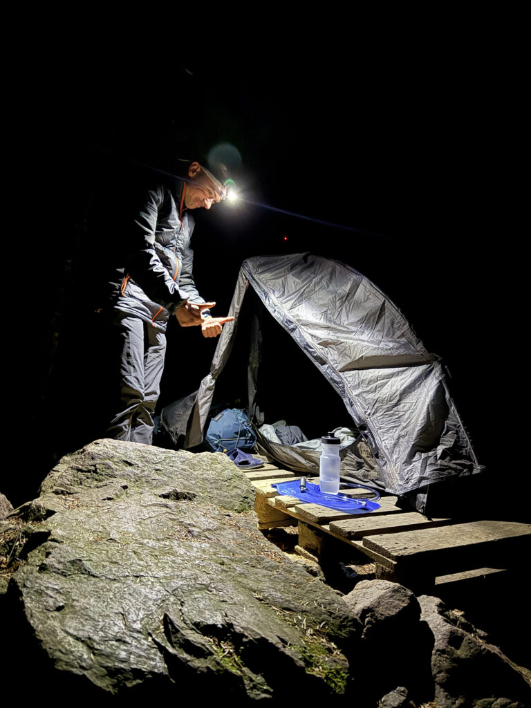 Réveil à l’heure prévue (5h15 ! 🥱), on range nos affaires comme on peut et on va prendre le petit dej dans la salle commune (biscuits secs, confiture, thé). On remballe ensuite la tente à la lumière des frontales, mais ça va maintenant on gère. On remplit les poches à eau et gourdes, Xavier met ses lentilles, et c’est parti vers 7h du matin.