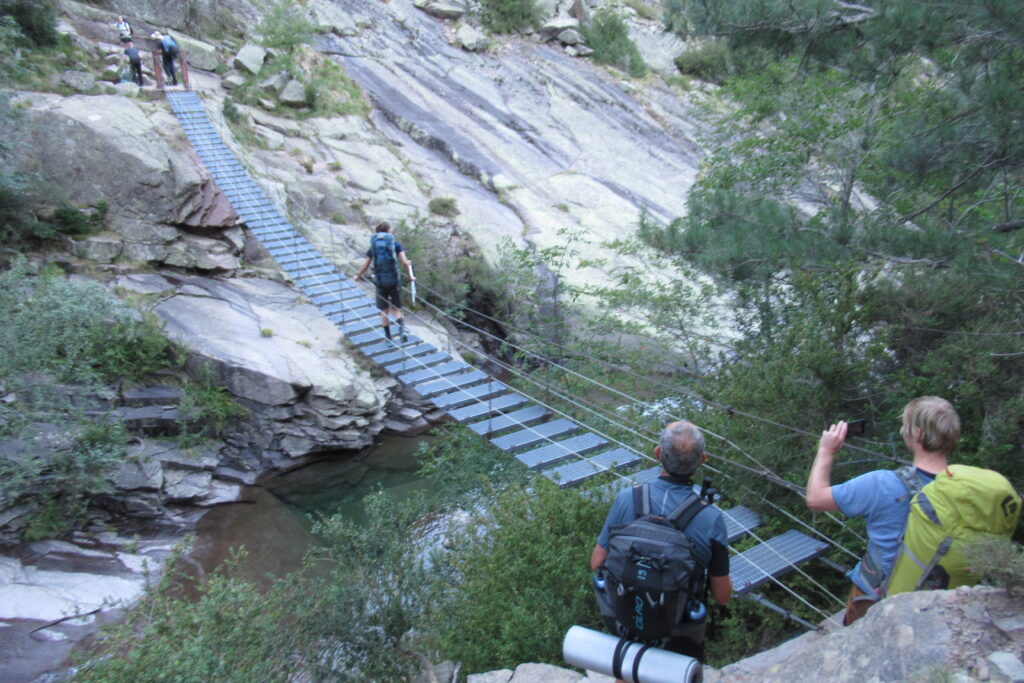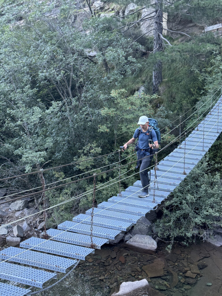 On commence relativement facilement jusqu’à la passerelle de la Spasimata, suspendue au dessus d’un cours d’eau à 15 mètres de haut. On voit bien en bas à travers les planches de métal ajourées et ça bouge un peu, il ne faut pas avoir le vertige 😅.