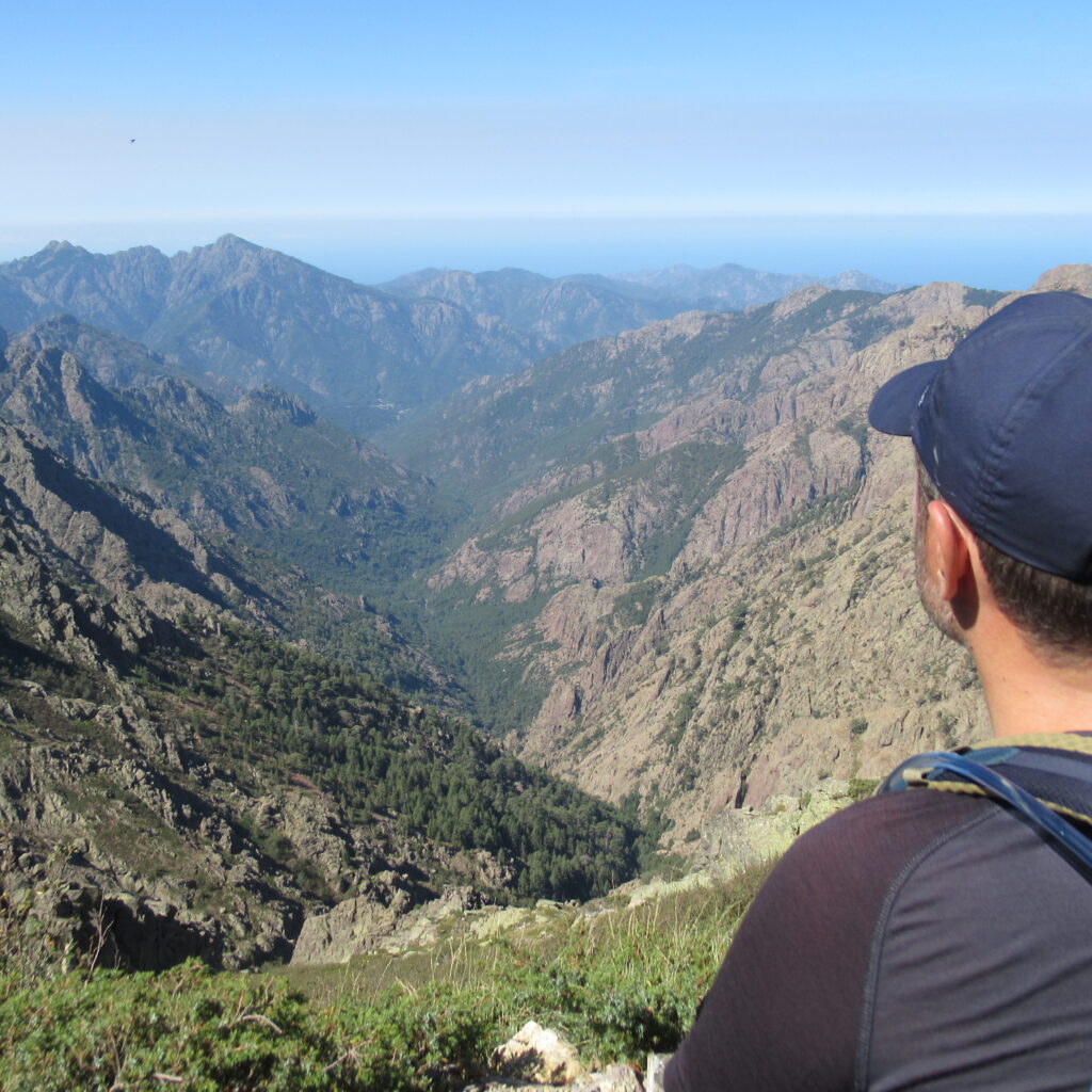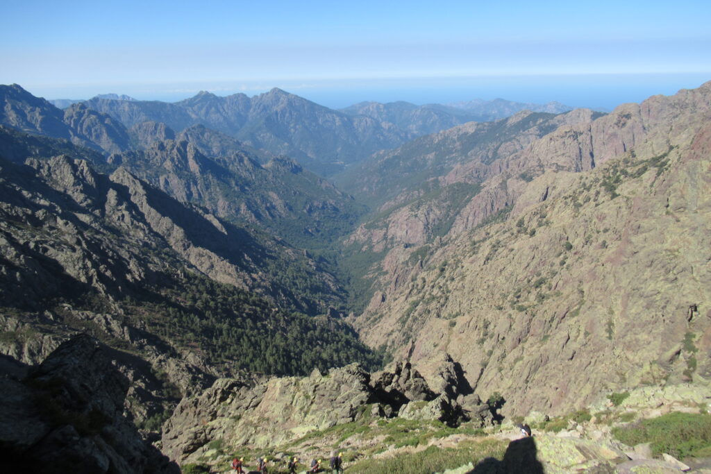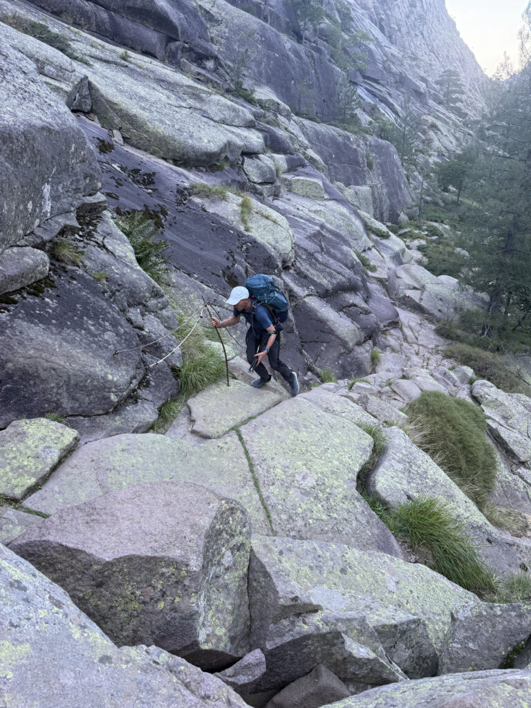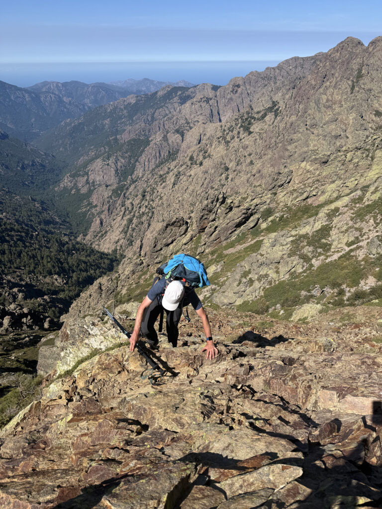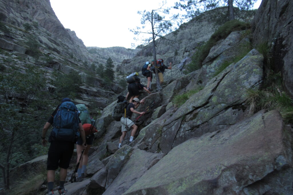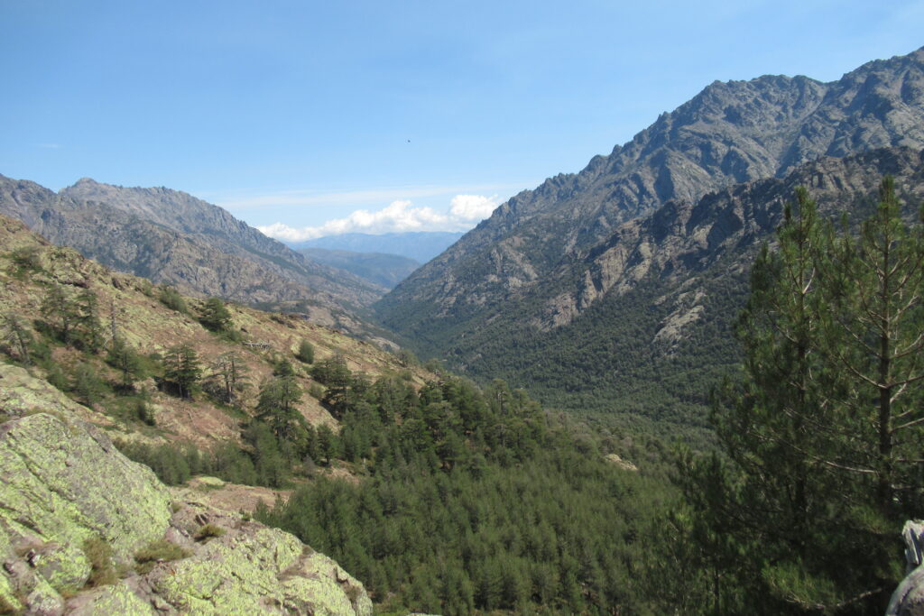 On change alors de décor avec une immense vallée peuplée d’arbres et entourée de hautes montagnes rocheuses. Quelques passages délicats au début, puis cela descend légèrement. Par moments il faut encore utiliser les mains pour assurer une meilleure prise. Enfin on arrive au dernier col de la Bocca Stagnu, et on aperçoit tout en bas le refuge d’Asco, dans la toute petite « station » de ski du même nom. Mais il est loin… très loin… infiniment loin 😫.