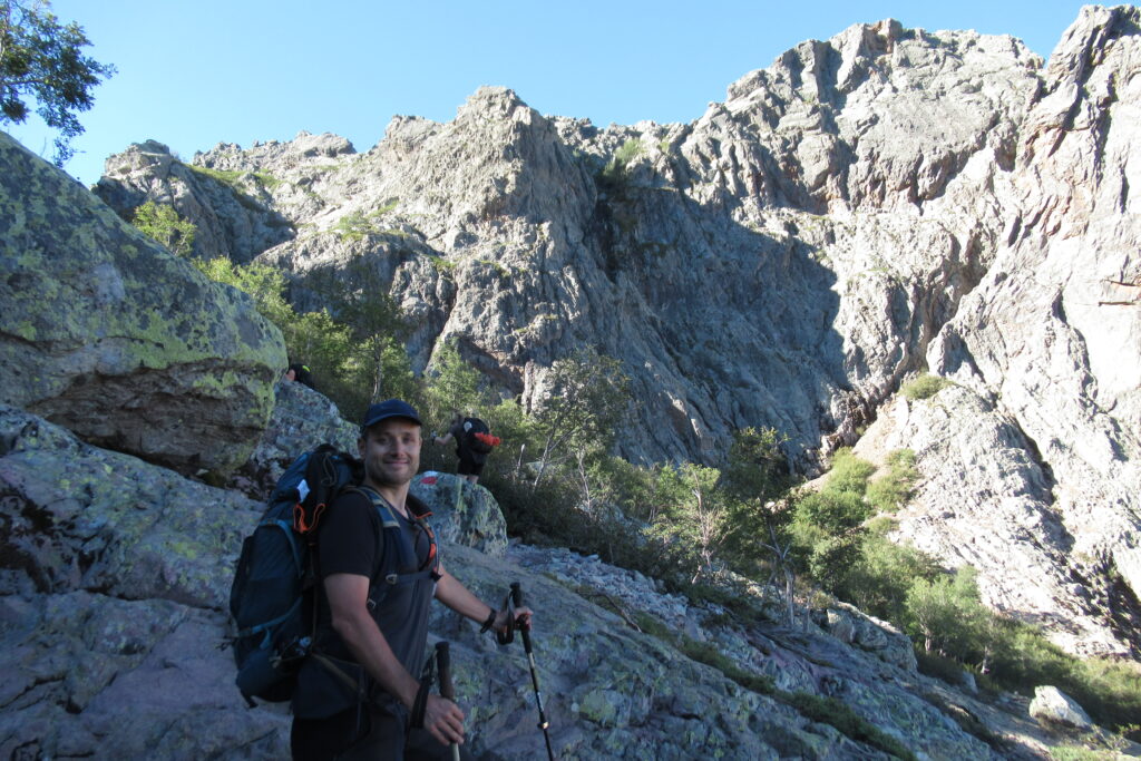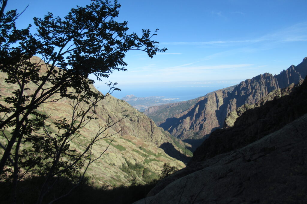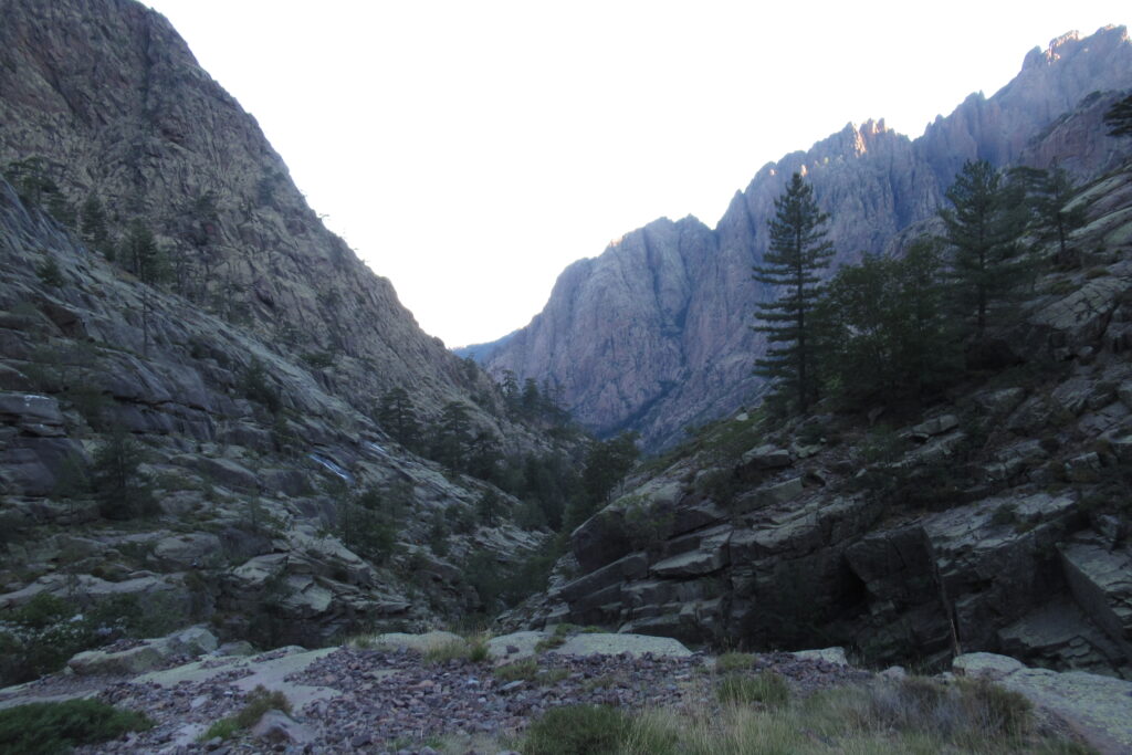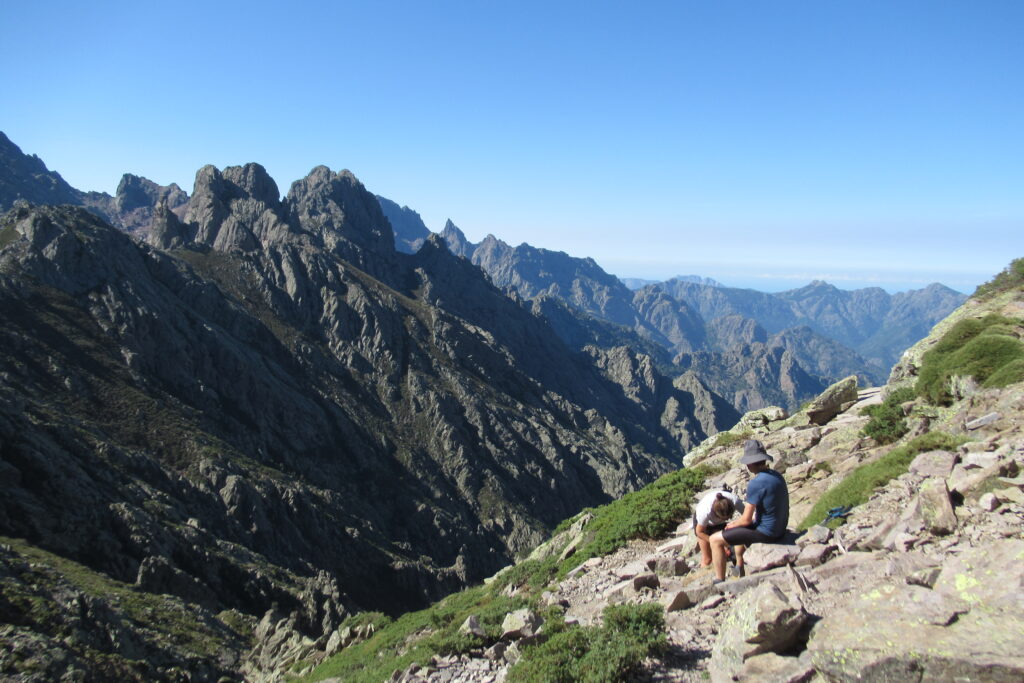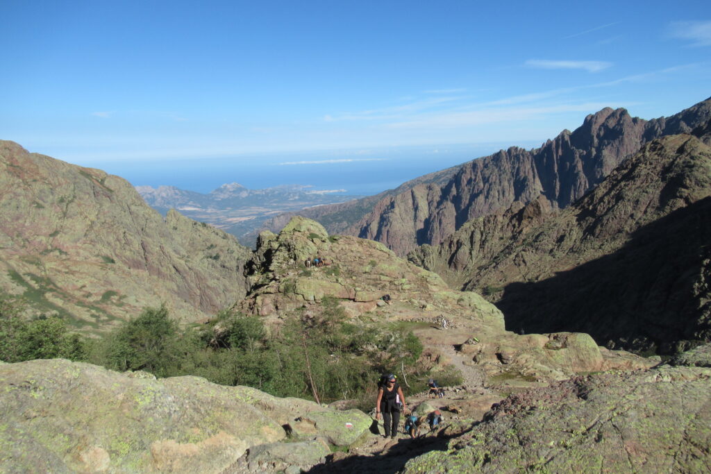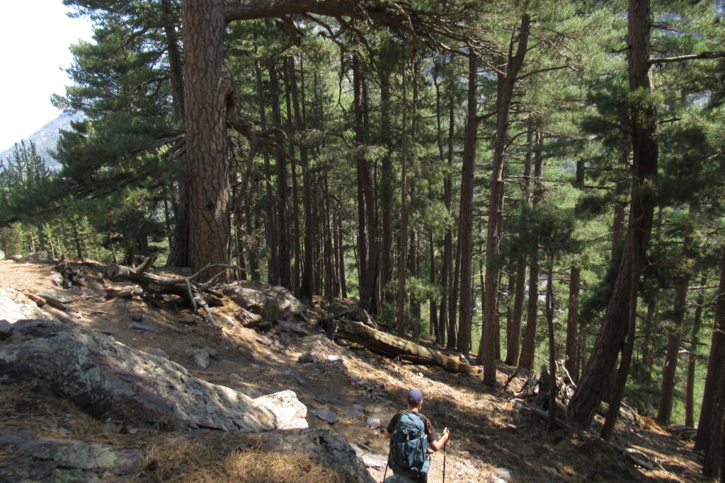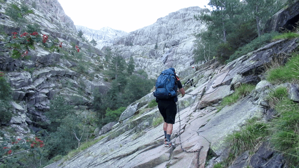 On change alors de décor avec une immense vallée peuplée d’arbres et entourée de hautes montagnes rocheuses. Quelques passages délicats au début, puis cela descend légèrement. Par moments il faut encore utiliser les mains pour assurer une meilleure prise. Enfin on arrive au dernier col de la Bocca Stagnu, et on aperçoit tout en bas le refuge d’Asco, dans la toute petite « station » de ski du même nom. Mais il est loin… très loin… infiniment loin 😫.