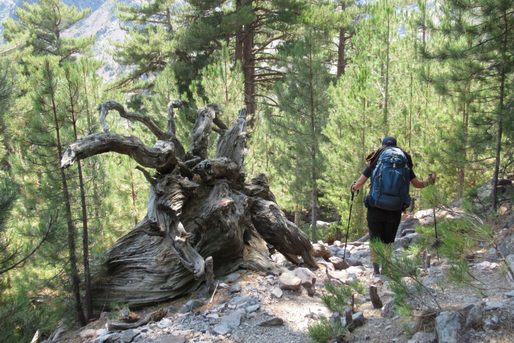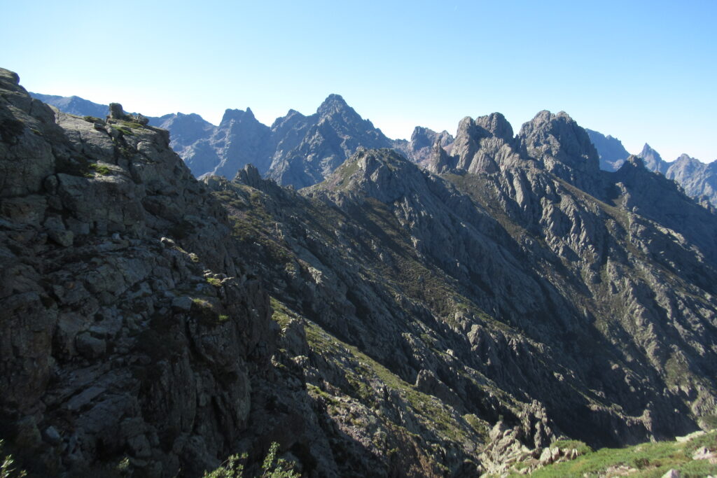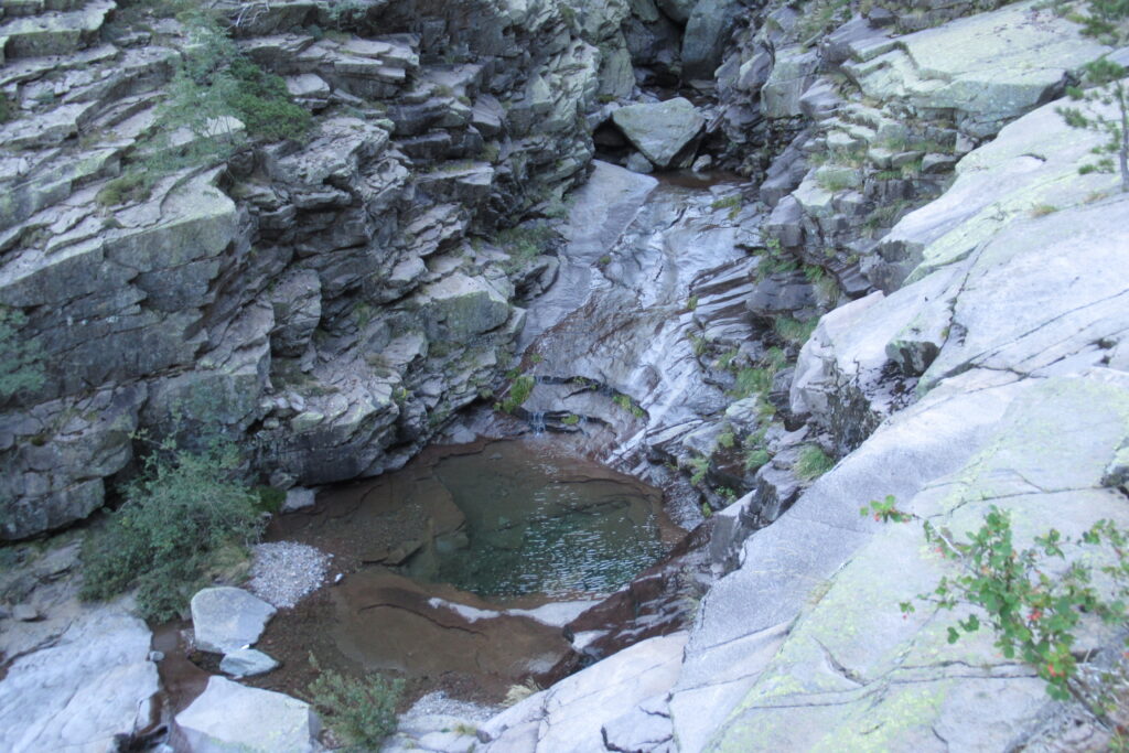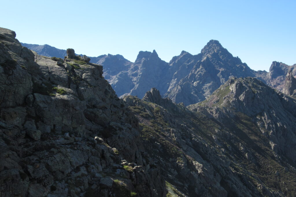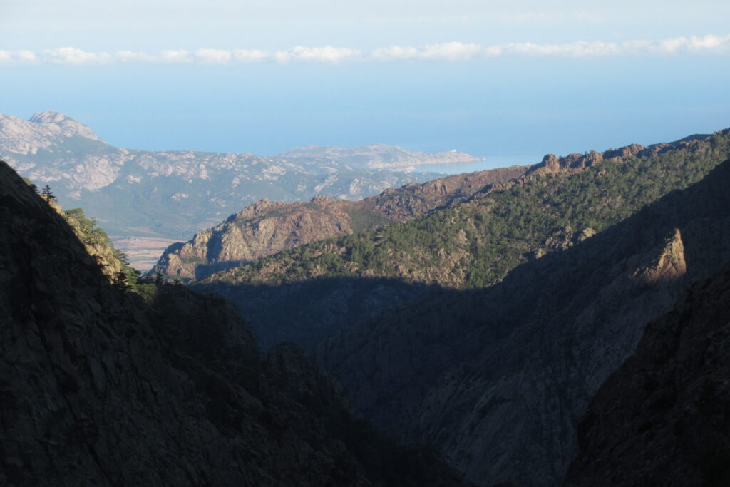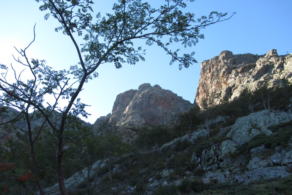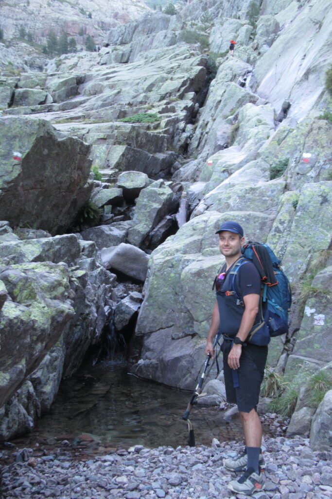 On change alors de décor avec une immense vallée peuplée d’arbres et entourée de hautes montagnes rocheuses. Quelques passages délicats au début, puis cela descend légèrement. Par moments il faut encore utiliser les mains pour assurer une meilleure prise. Enfin on arrive au dernier col de la Bocca Stagnu, et on aperçoit tout en bas le refuge d’Asco, dans la toute petite « station » de ski du même nom. Mais il est loin… très loin… infiniment loin 😫.
