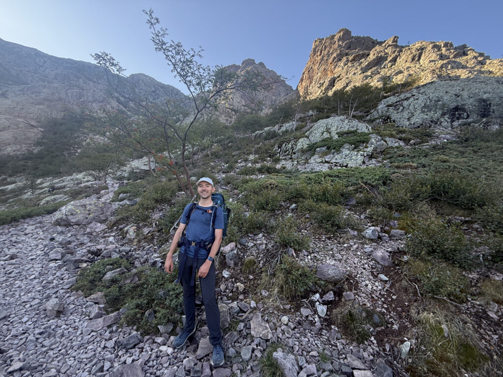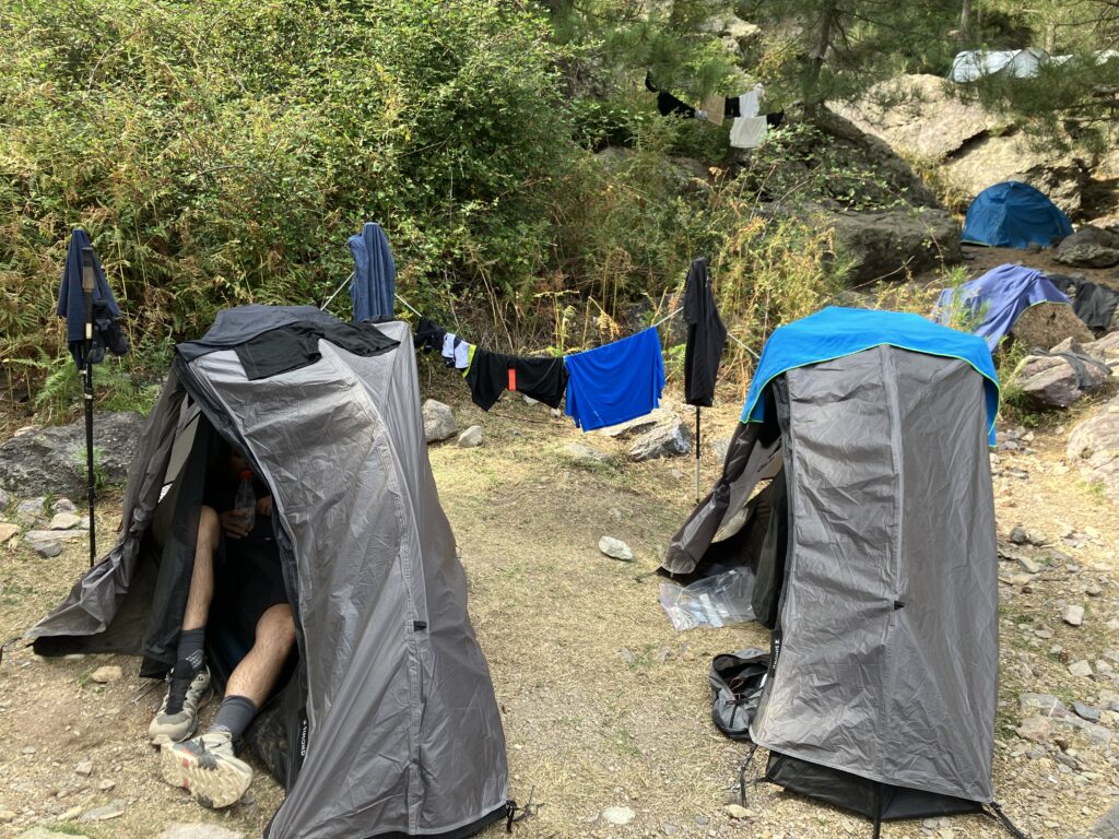 On installe ensuite les tentes, repos, lessive, douches chaudes, et briefing à 17h d’un guide. Il confirme que la météo s’annonce bonne pour le lendemain et répond aux questions des randonneurs sur la difficulté de l’étape suivante. Grosso modo, si on a réussi les 3 premières, la 4e est un examen final sans réelle nouveauté – ça devrait le faire ! 🤞 Les plus aguerris le suivront dans le Cirque de la Solitude (ancien tracé du GR20, théâtre d’un drame en 2015), mais on se contentera du tracé actuel par la Pointe des Eboulis.