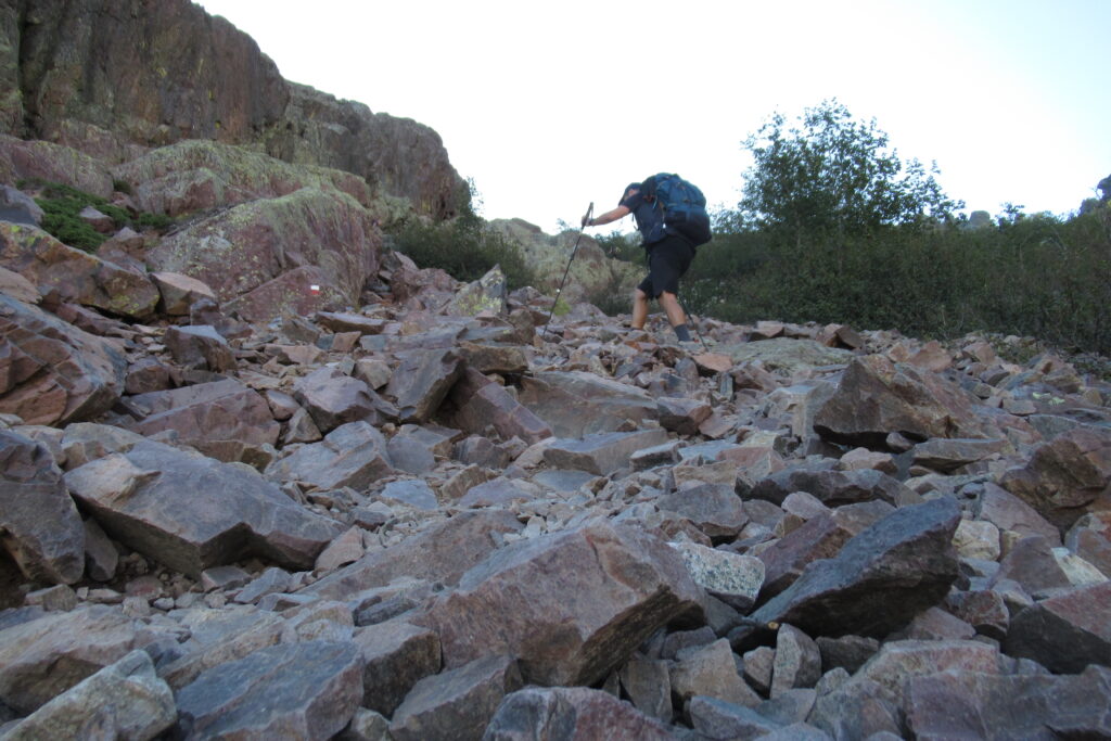 La descente se fait parmi des blocs rocheux assez hauts qui nécessitent de s’aider des bâtons, pour ne pas trop esquinter les genoux. Mais du coup ce sont aussi les cuisses qui prennent. À la longue les jambes deviennent raides et on a hâte d’en voir le bout. On fait un bout de chemin avec un groupe sympa de 3 randonneurs, dont 2 ont un bon niveau et le 3e est plus à la peine.