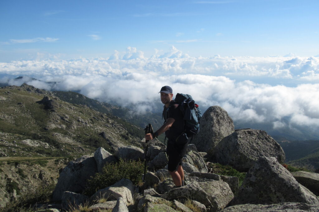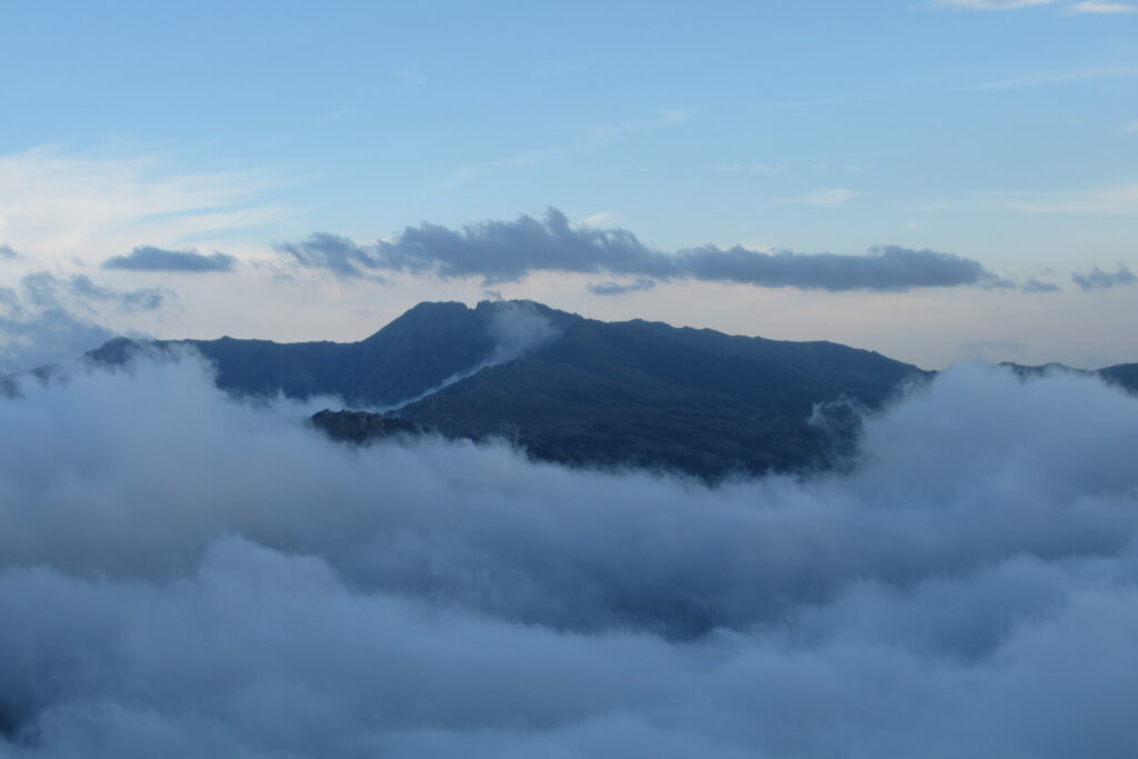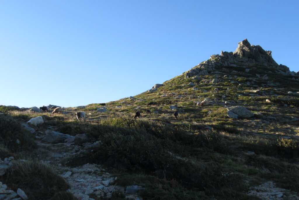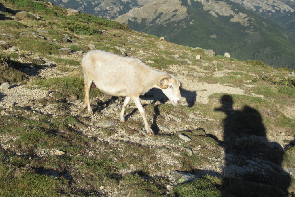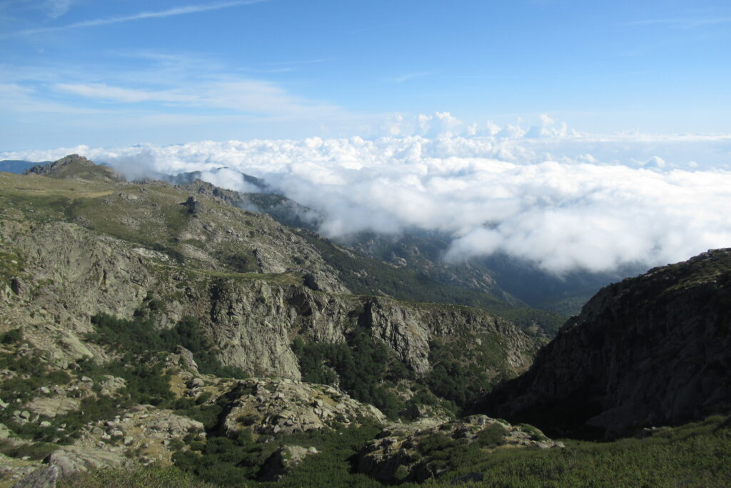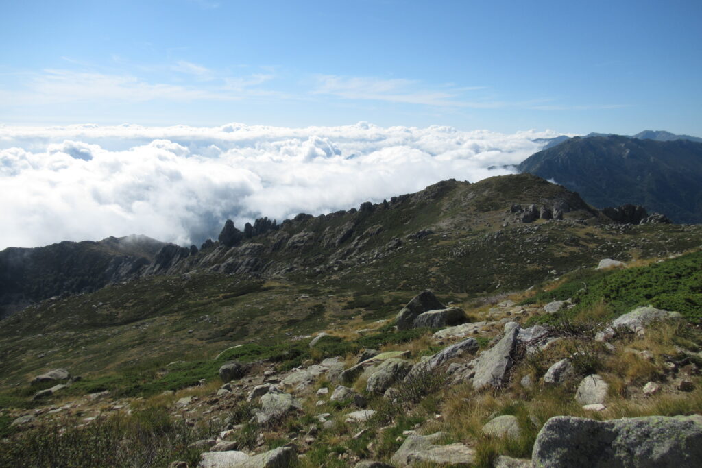 Et effectivement elle l’est : aujourd’hui on est fatigués, les jambes sont lourdes et Xavier souffre toujours de ses ampoules, malgré les soins apportés la veille au soir. On n’avance pas vite dans la première grande montée dans la forêt, puis à découvert. Au bout de 1h30 environ, on atteint le premier col de la Bocca d’Oru parmi les brebis qui paissent dans le soleil levant. Et de l’autre côté… une mer de nuages ! Le spectacle est saisissant, on se croirait en avion.
