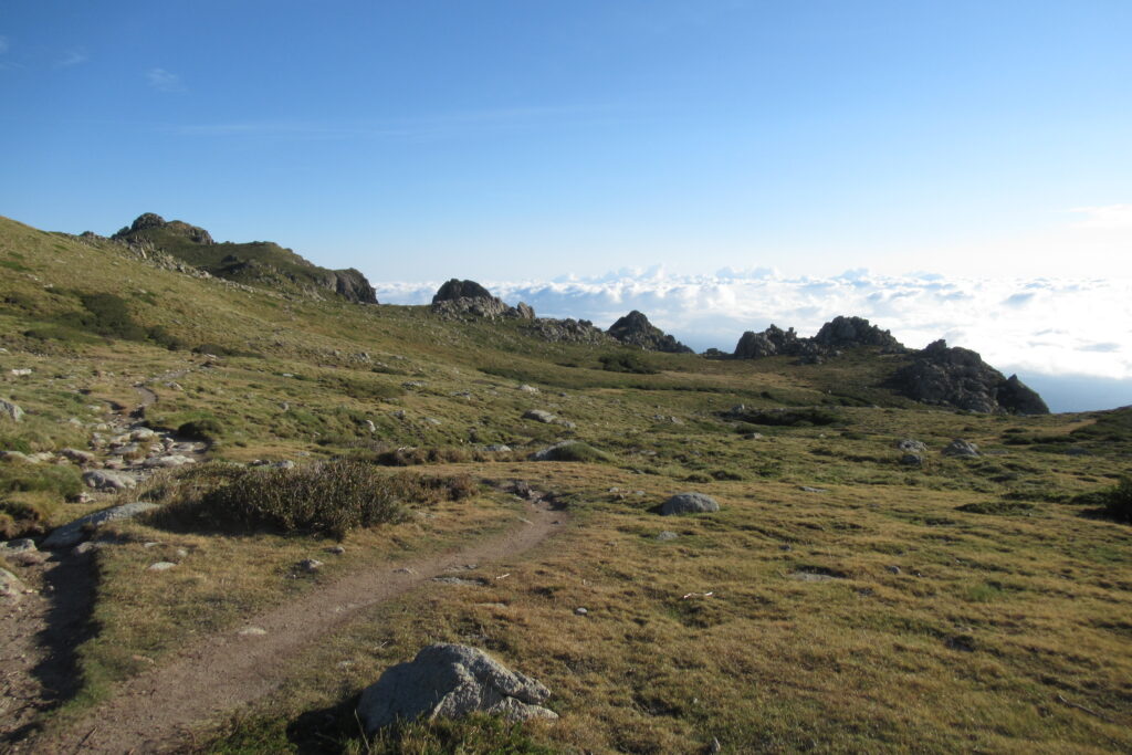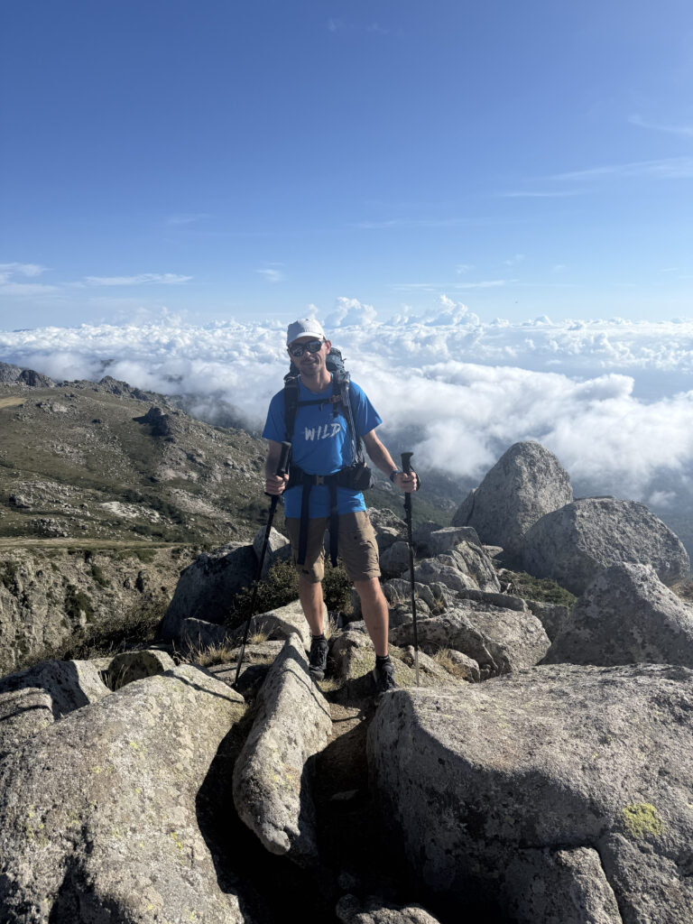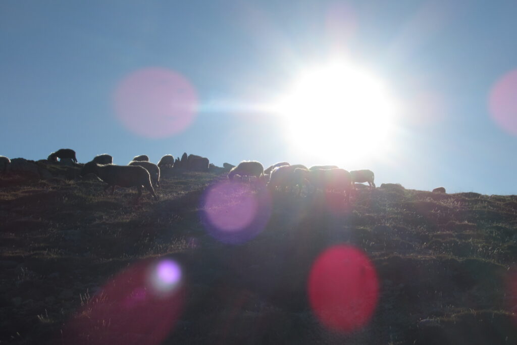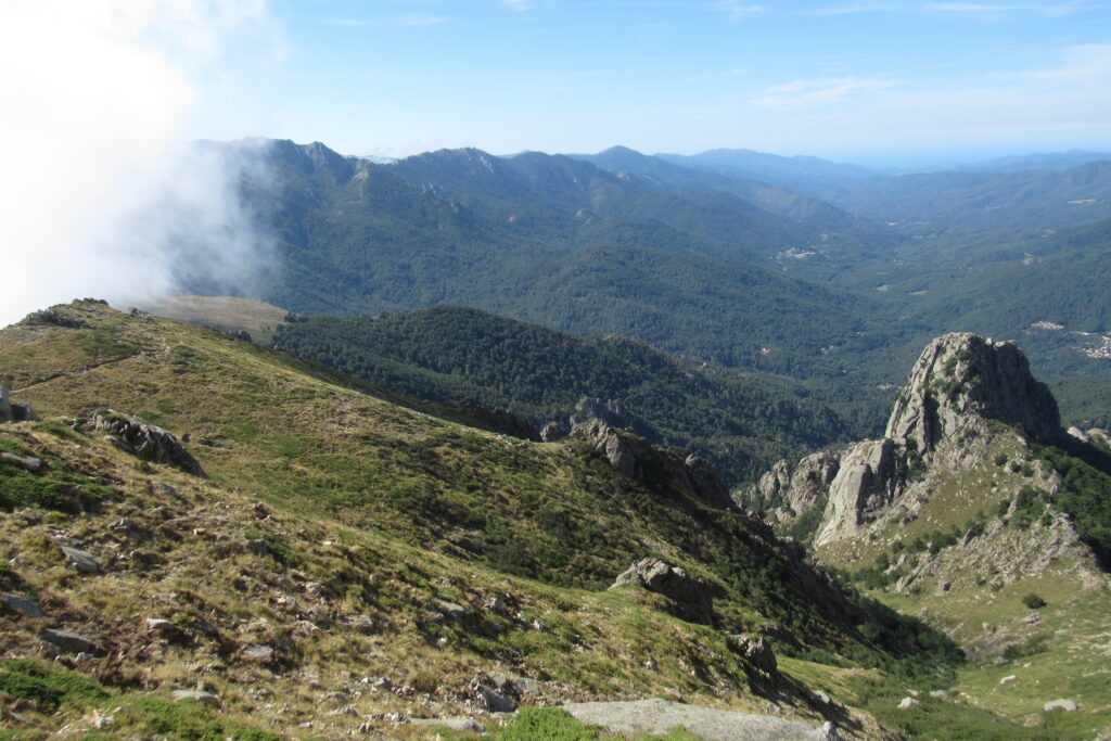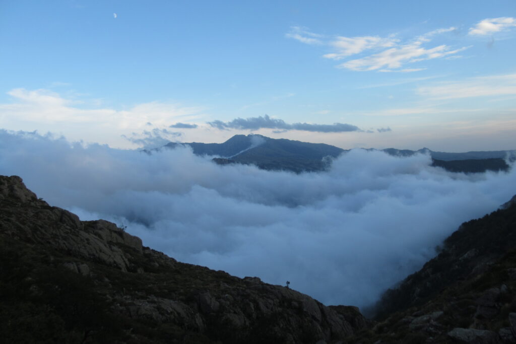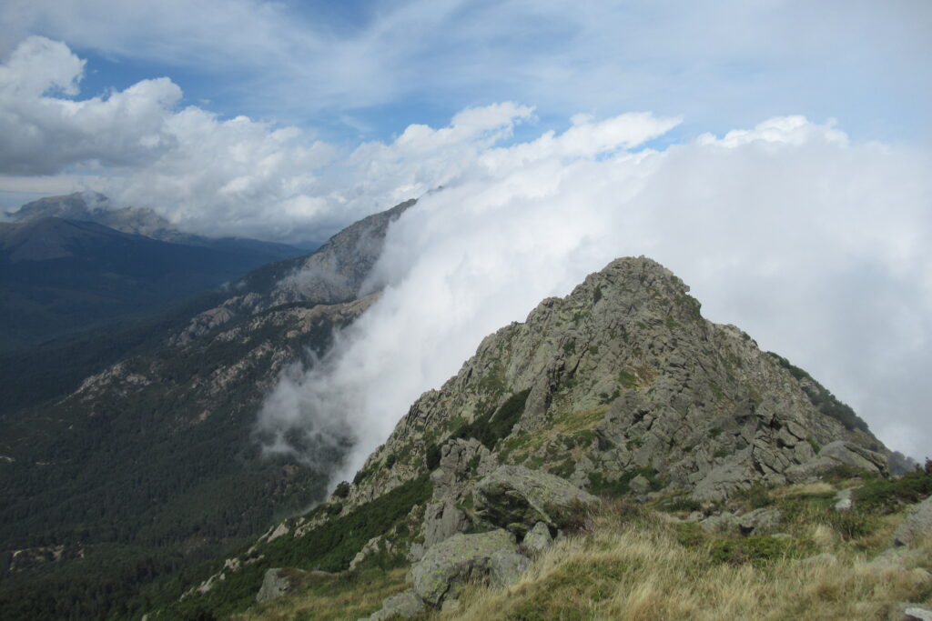 Et effectivement elle l’est : aujourd’hui on est fatigués, les jambes sont lourdes et Xavier souffre toujours de ses ampoules, malgré les soins apportés la veille au soir. On n’avance pas vite dans la première grande montée dans la forêt, puis à découvert. Au bout de 1h30 environ, on atteint le premier col de la Bocca d’Oru parmi les brebis qui paissent dans le soleil levant. Et de l’autre côté… une mer de nuages ! Le spectacle est saisissant, on se croirait en avion.