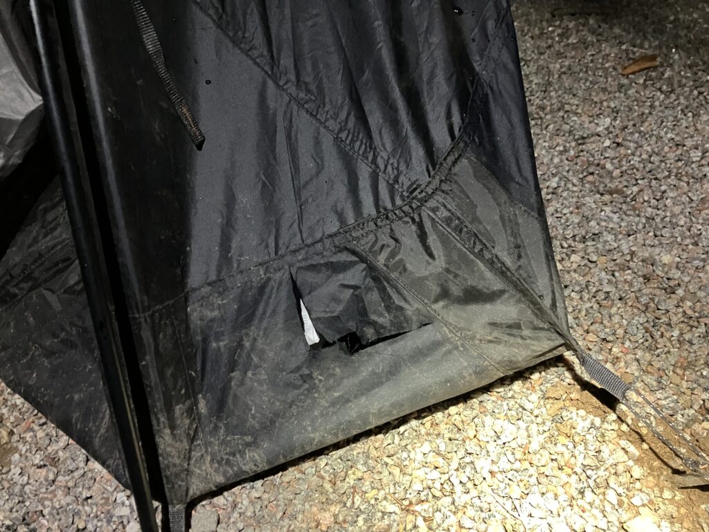 La nuit avait bien commencé… quand tout à coup, vers 23h30 la tente de Fabien se met à bouger violemment. Une rafale de vent ? Non, il n’y en a pas… et voilà qu’elle bouge à nouveau. Bizarre. Vérification avec la lampe frontale : le petit déjeuner déposé du côté « pieds » de la tente a été éventré ! Et il y a un gros trou dans la toile ! 😱 Une bête sauvage a dû le sentir et tenté de se l’accaparer.