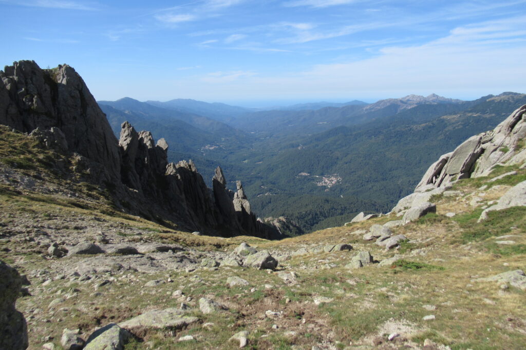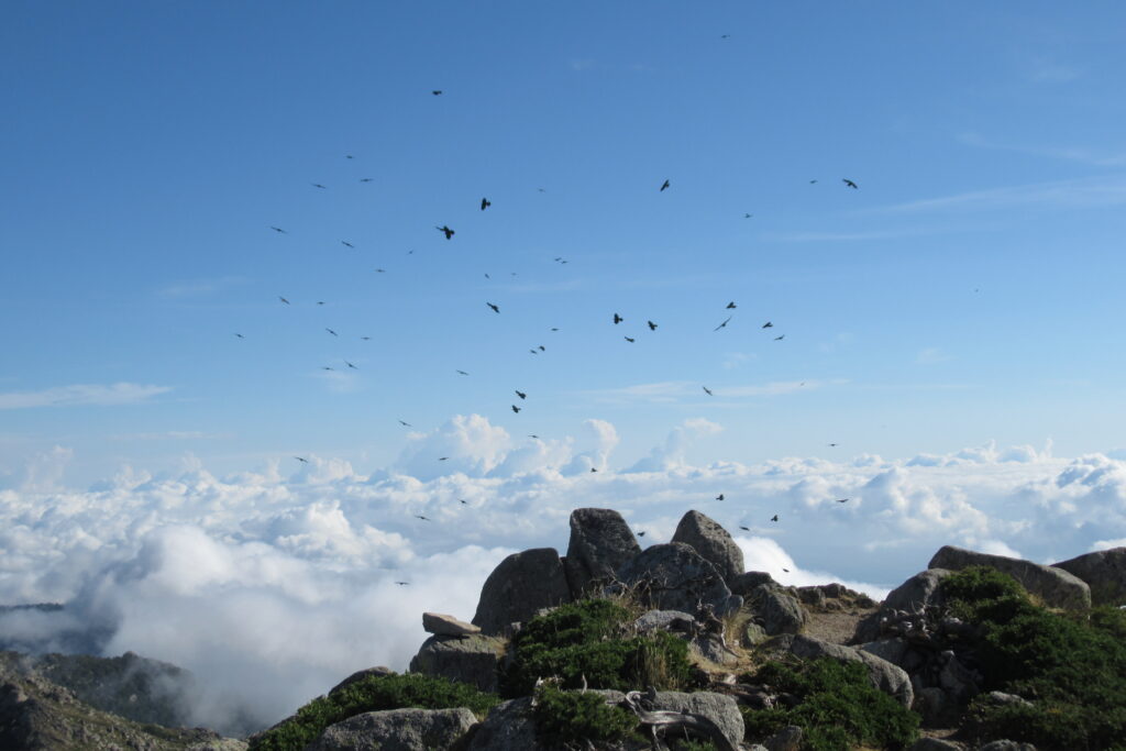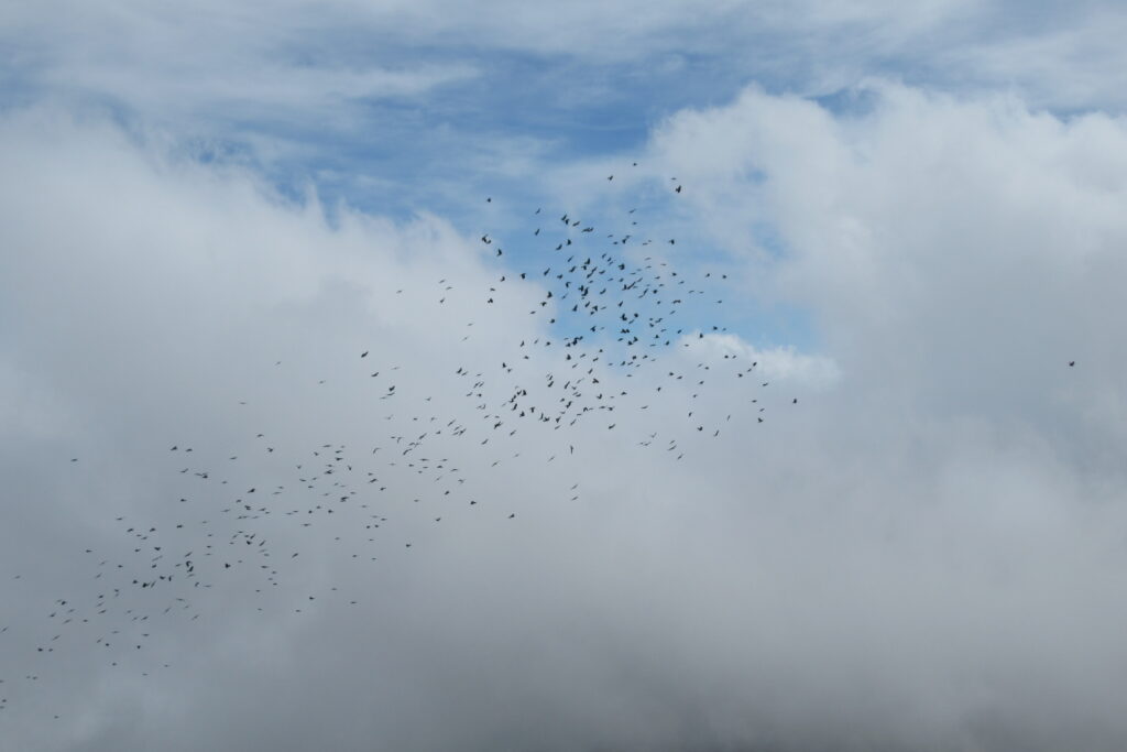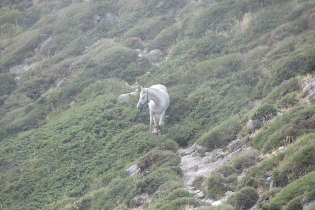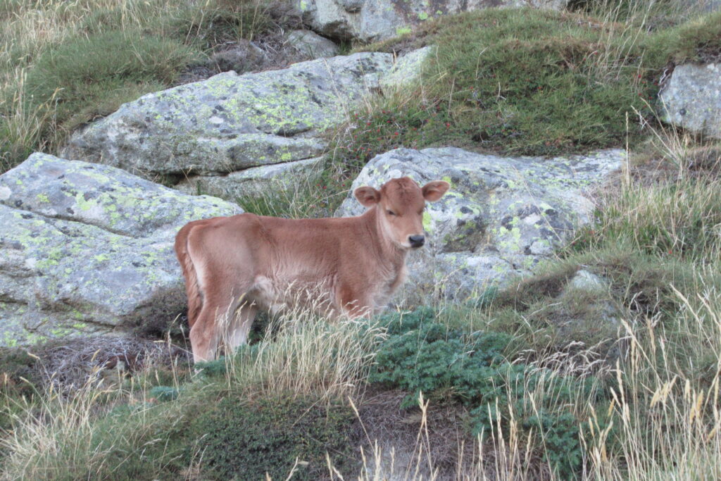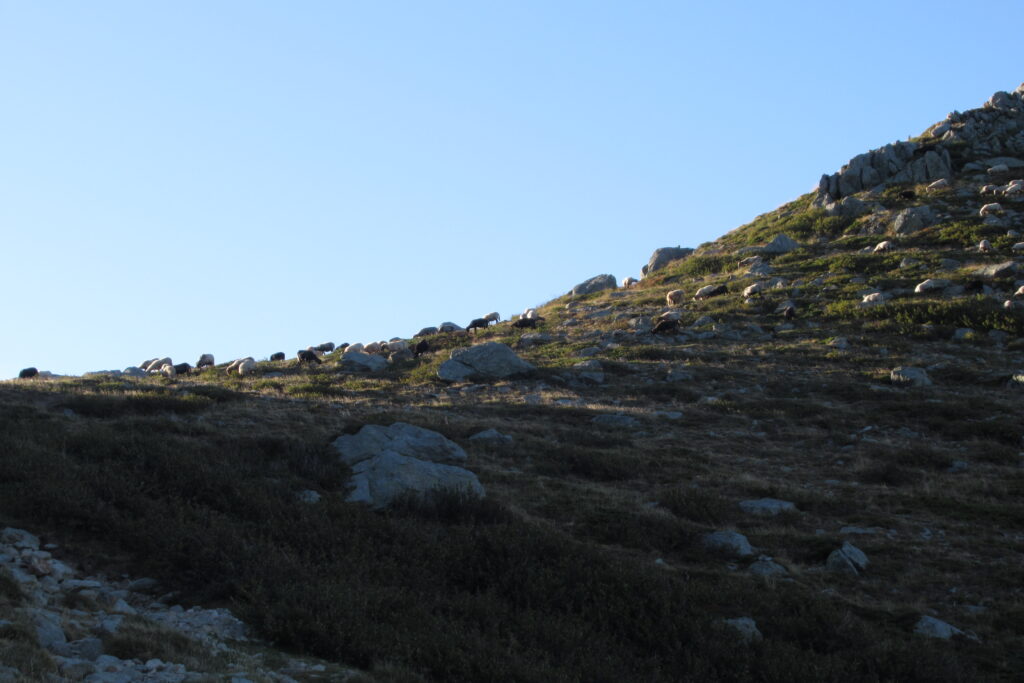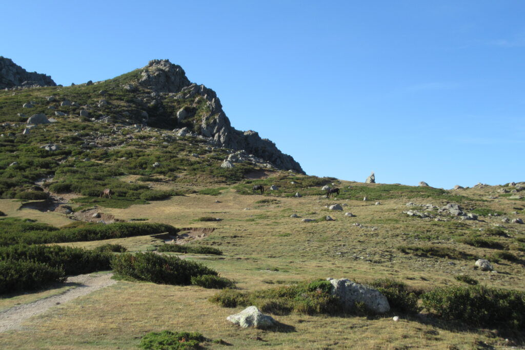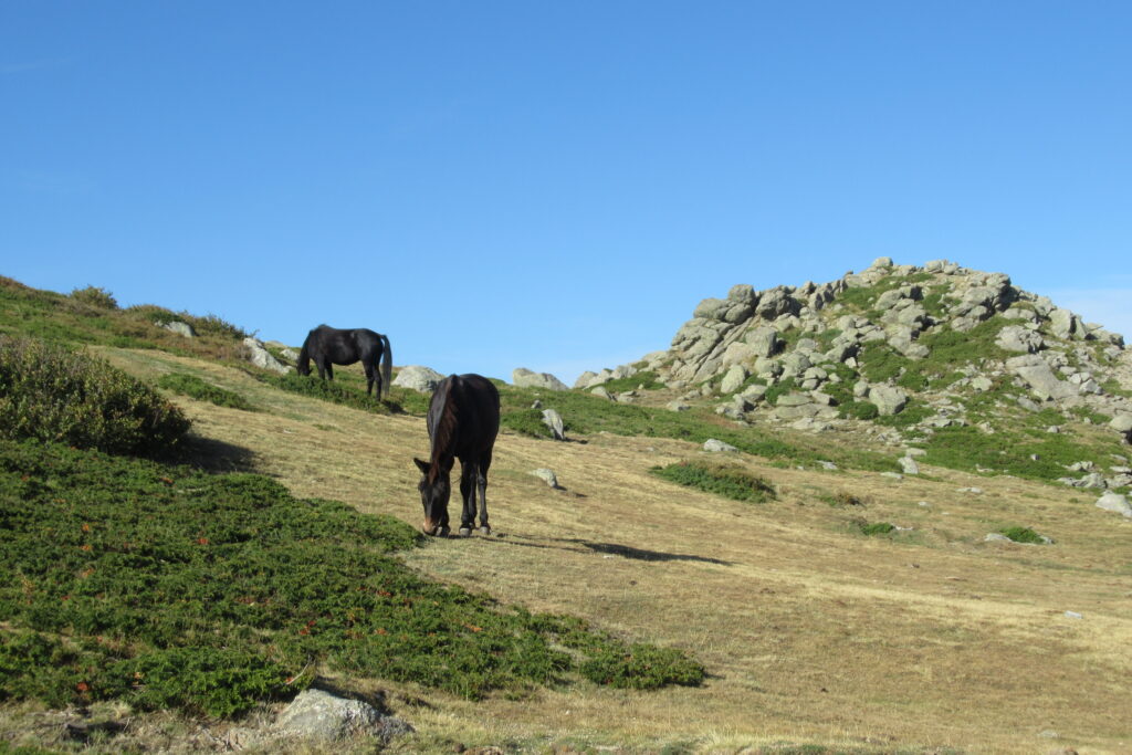 Après un court arrêt au refuge de Prati pour se désaltérer et faire quelques achats à l’épicerie pour le midi, on continue de prendre de la hauteur dans ce paysage idyllique. Les étendues herbeuses parsemées de gros rochers rappellent le Rohan du Seigneur des Anneaux (heureusement, pas de Wargs à l’horizon 😉). D’ailleurs quelques chevaux broutent en liberté. Des nuées d’oiseaux noirs viennent compléter le tableau par une chorégraphie impressionnante composée de dizaines, voire centaines d’individus.