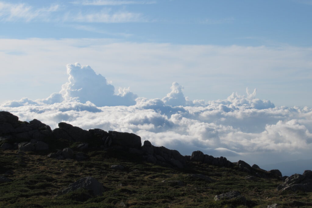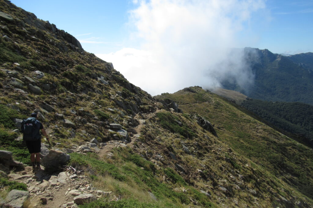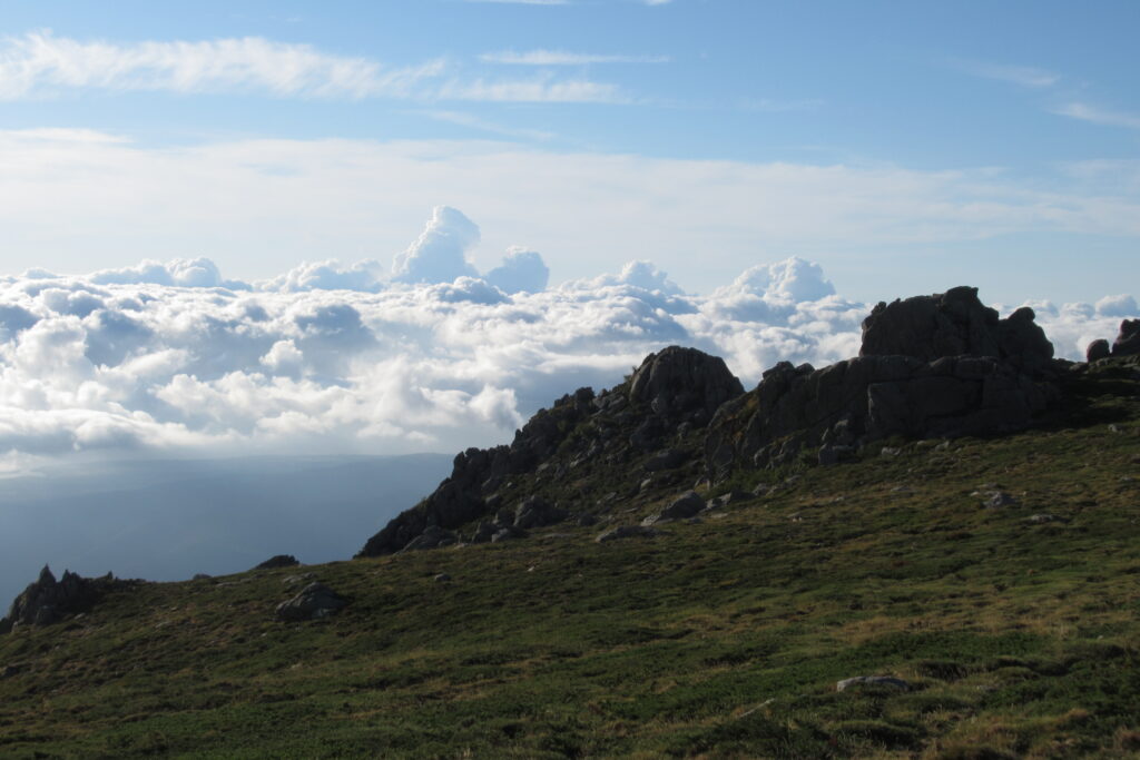 La suite du chemin sur les crêtes nous offre d’autres points de vue tout aussi beaux sous un soleil radieux. On peut même voir les nuages d’un côté de la montagne tenter de passer de l’autre côté, et échouer en se dissipant lentement. Si seulement on n’avait pas aussi mal aux jambes et si peu d’énergie ! 😩
