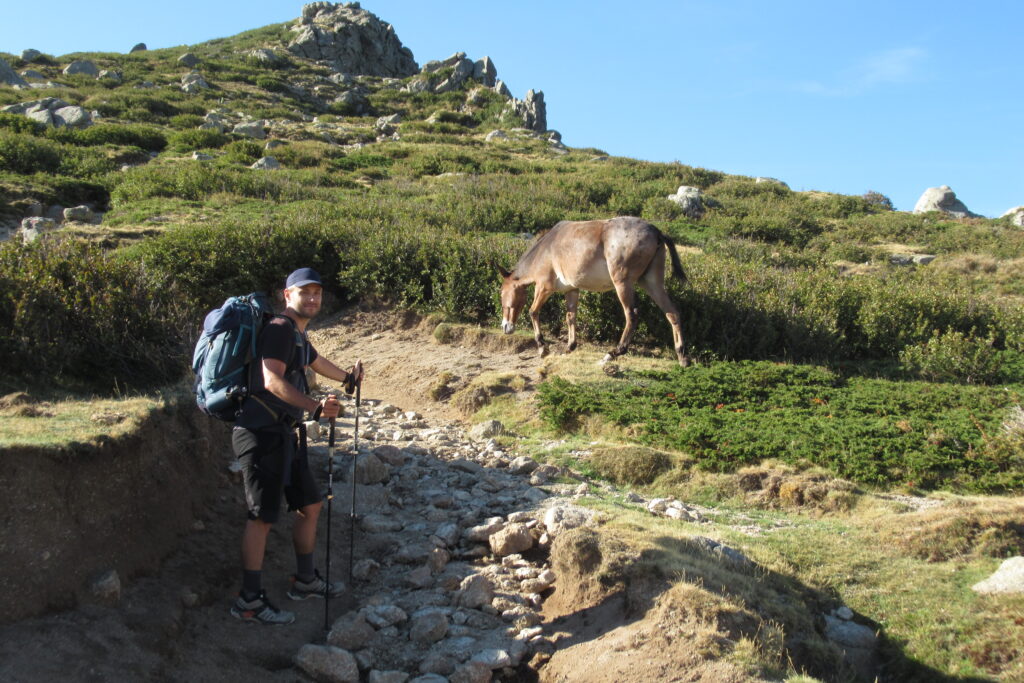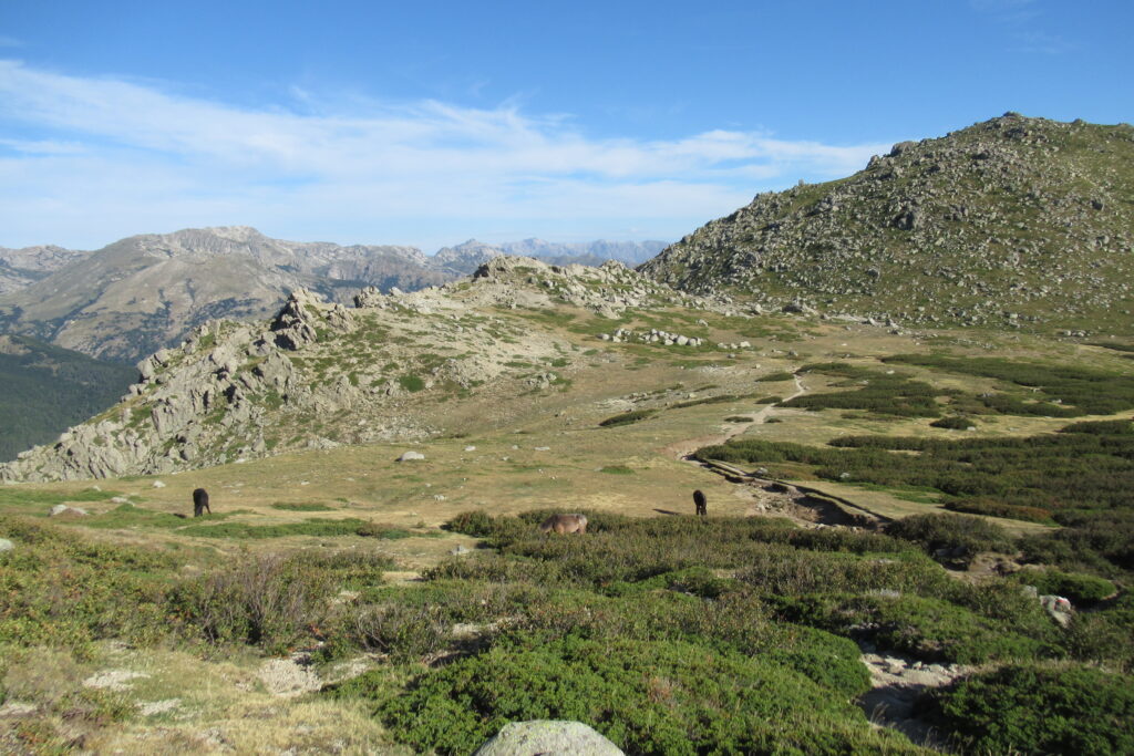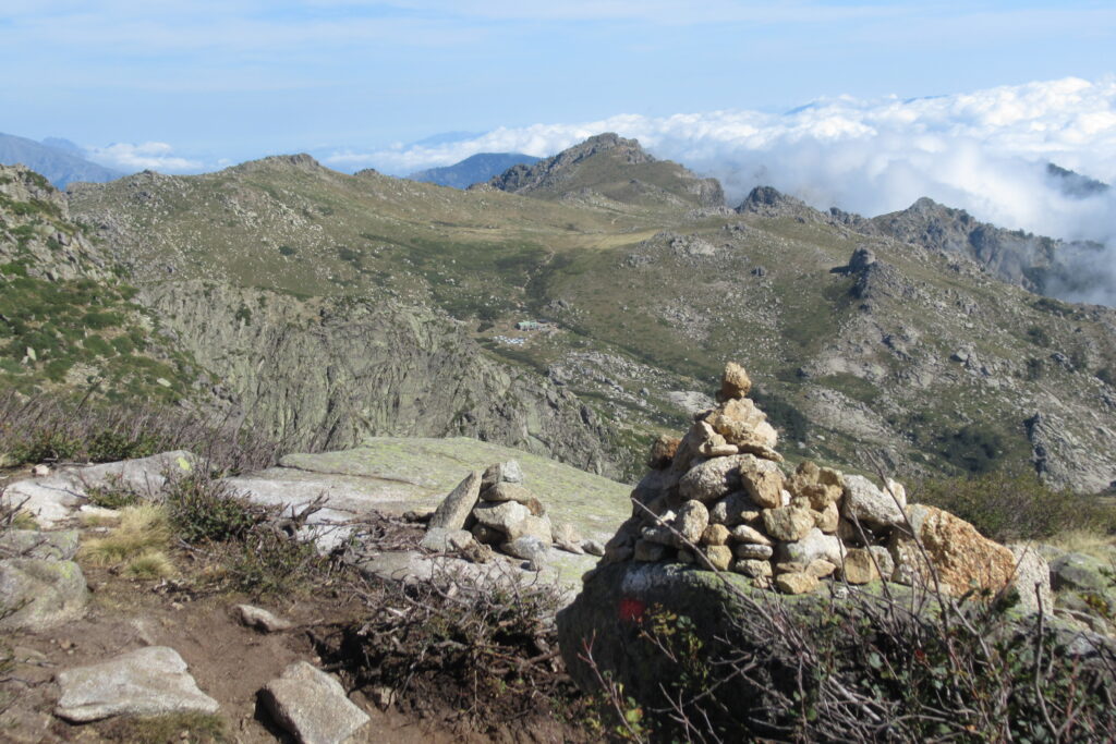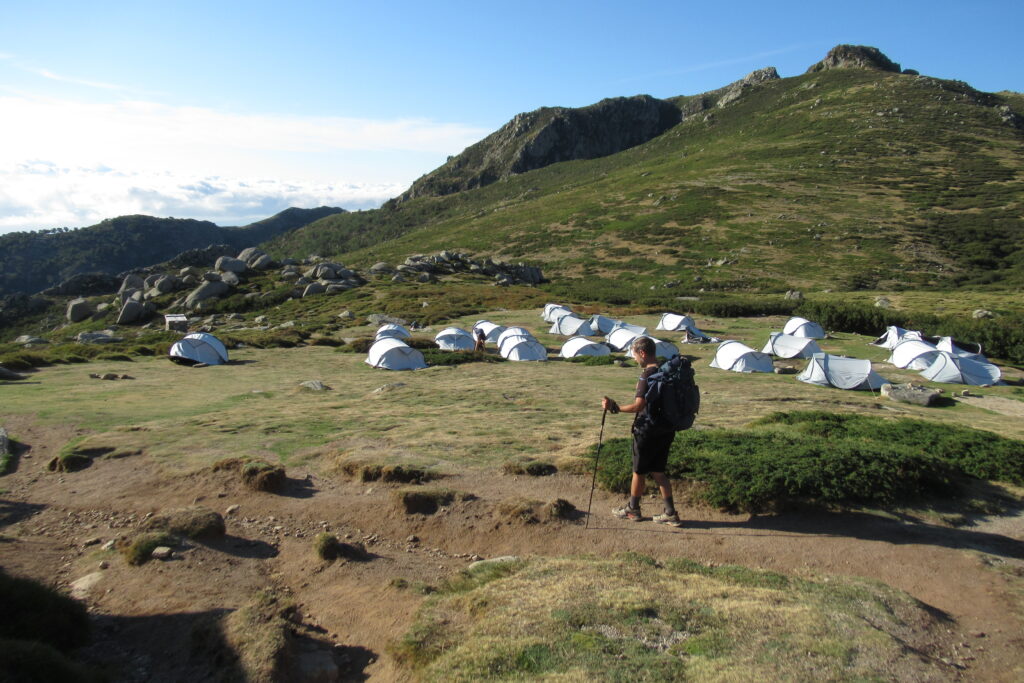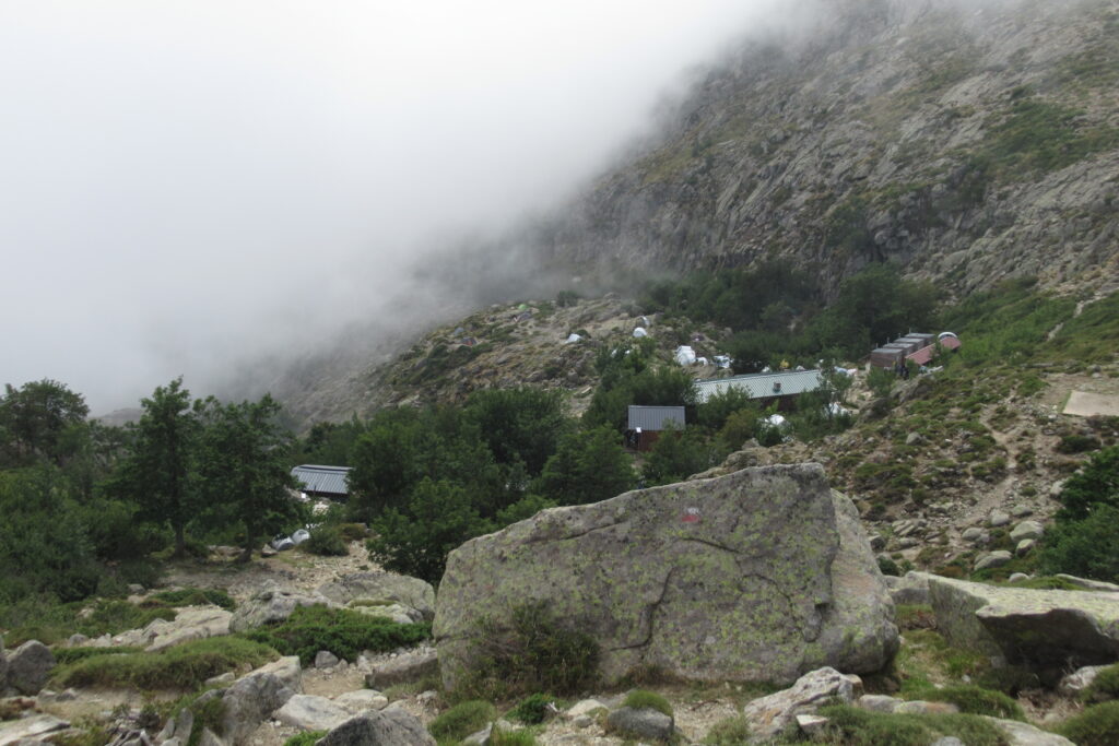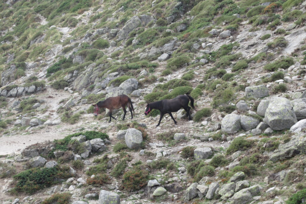 Après la Punta di a Furmicula à 1981m, le refuge d’Usciolu n’est plus très loin. Une dernière descente, et enfin il apparaît en contrebas ! On est contents d’arriver en compagnie des chevaux qui se baladent librement. On réserve le repas et on prend le temps de savourer un jus de fruits et un Coca avant de partir s’installer dans la pente.
