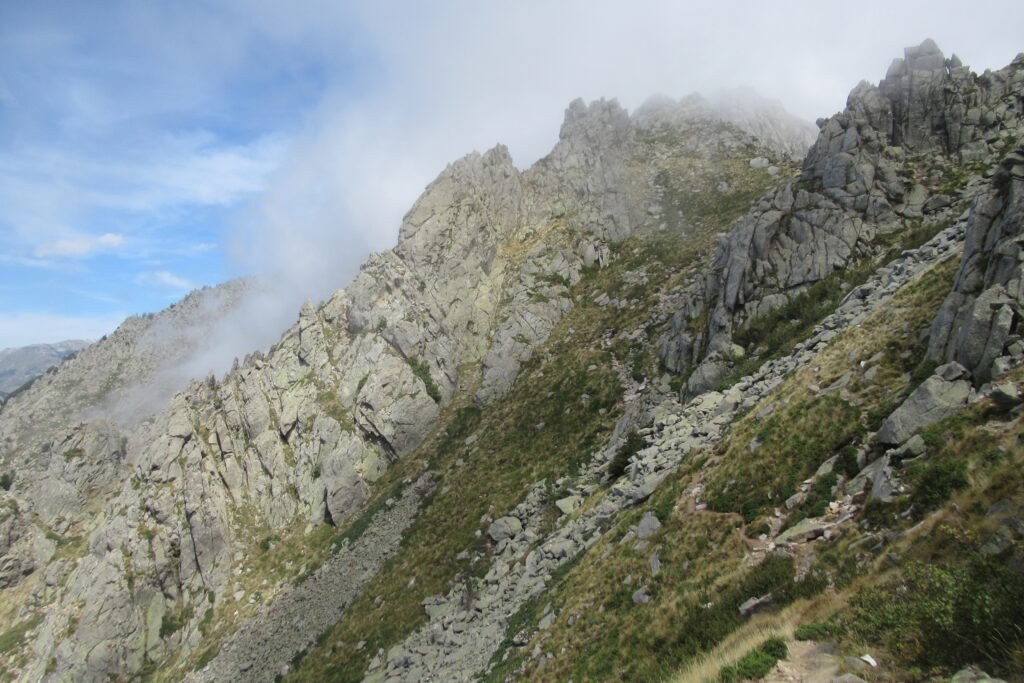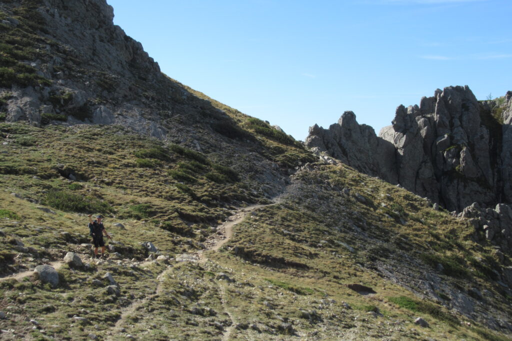 Le reste de la journée va être particulièrement éprouvant avec des montées extrêmement pentues où l’on avance au ralenti, et quelques passages d’escalade qui rappellent le GR20 Nord… On a le sentiment de ne jamais voir le bout de ces satanées montées, et on a besoin de plus de pauses que d’habitude. Le moral est mis à rude épreuve.
