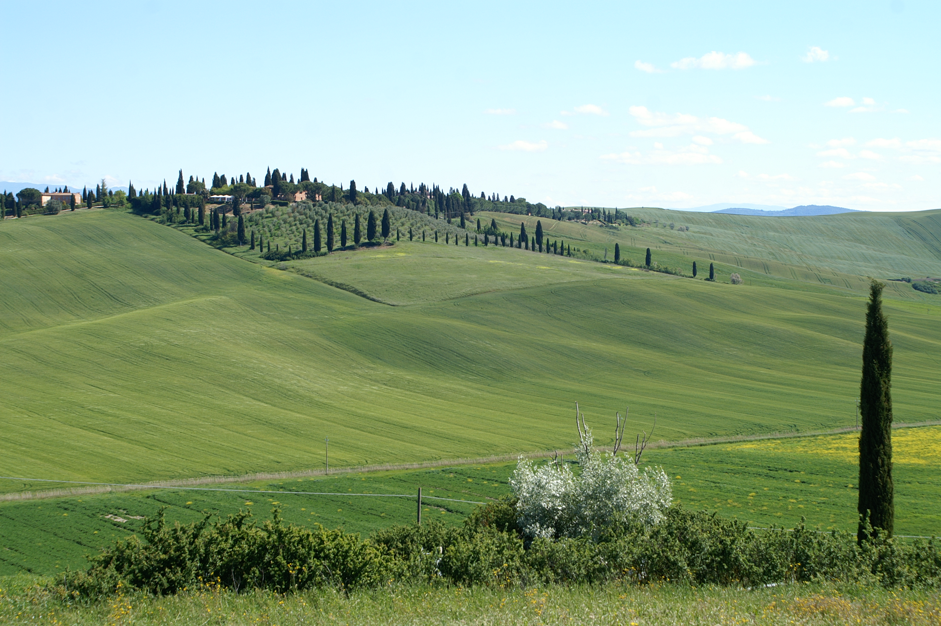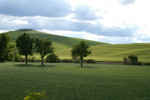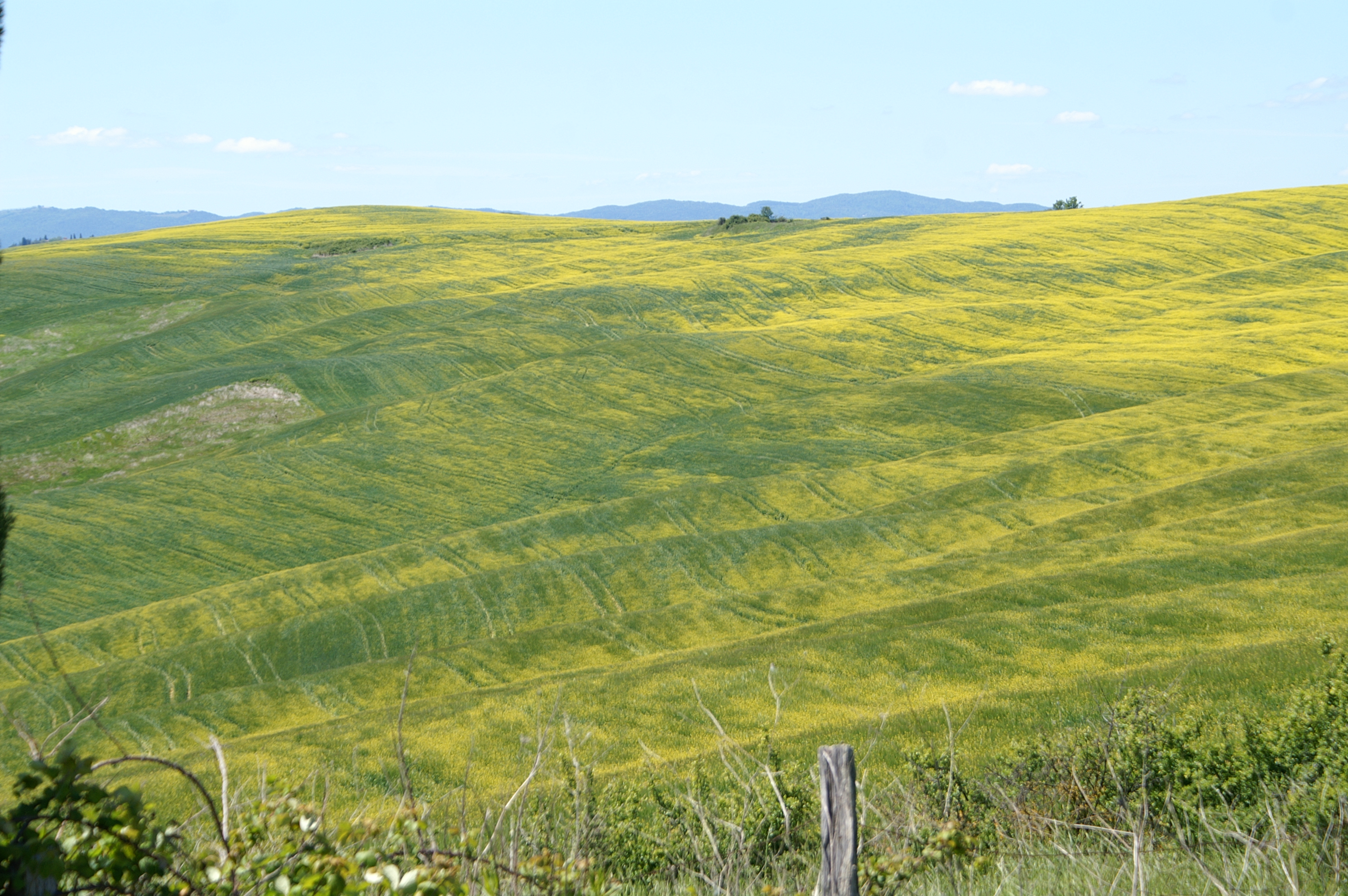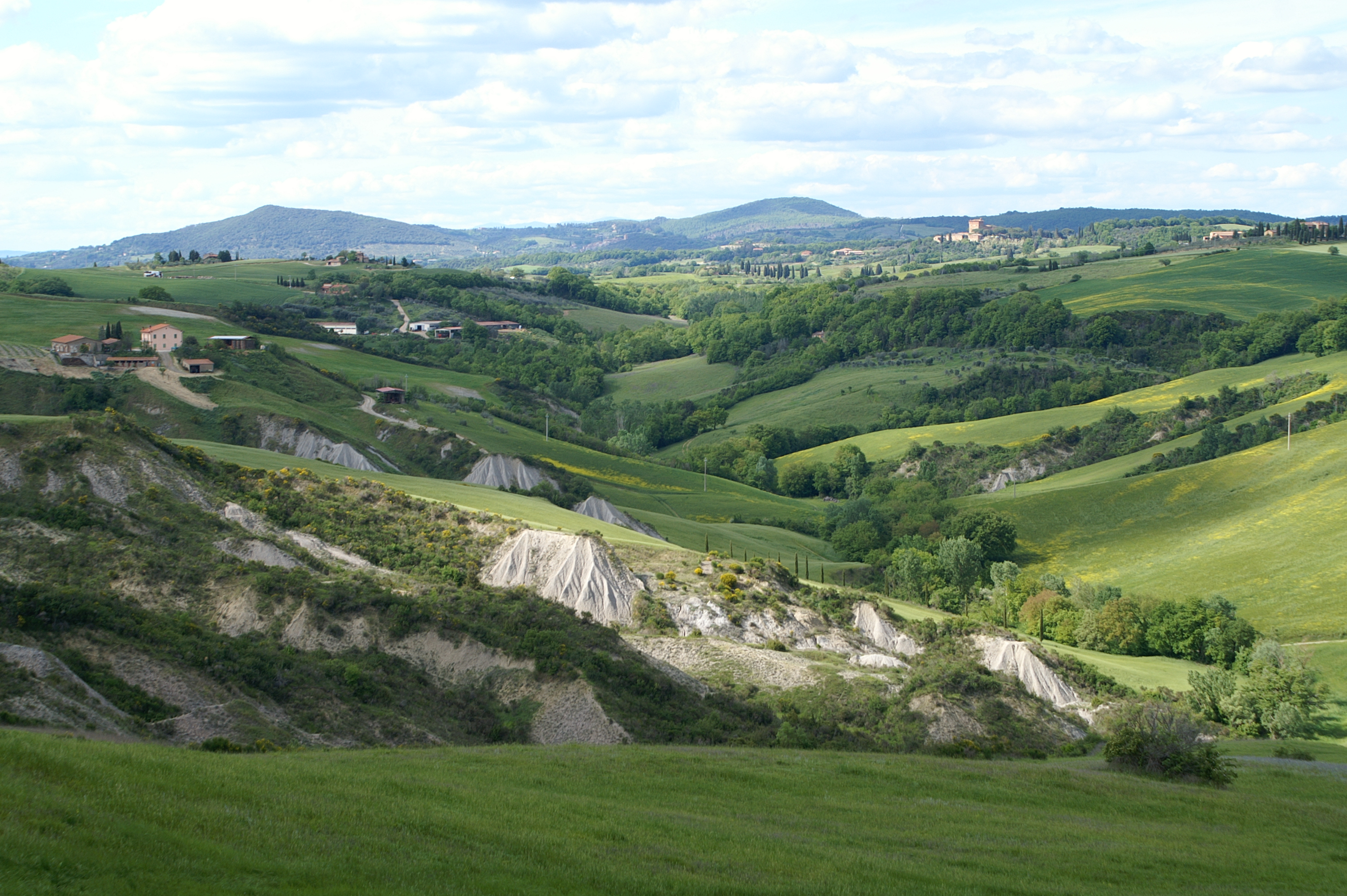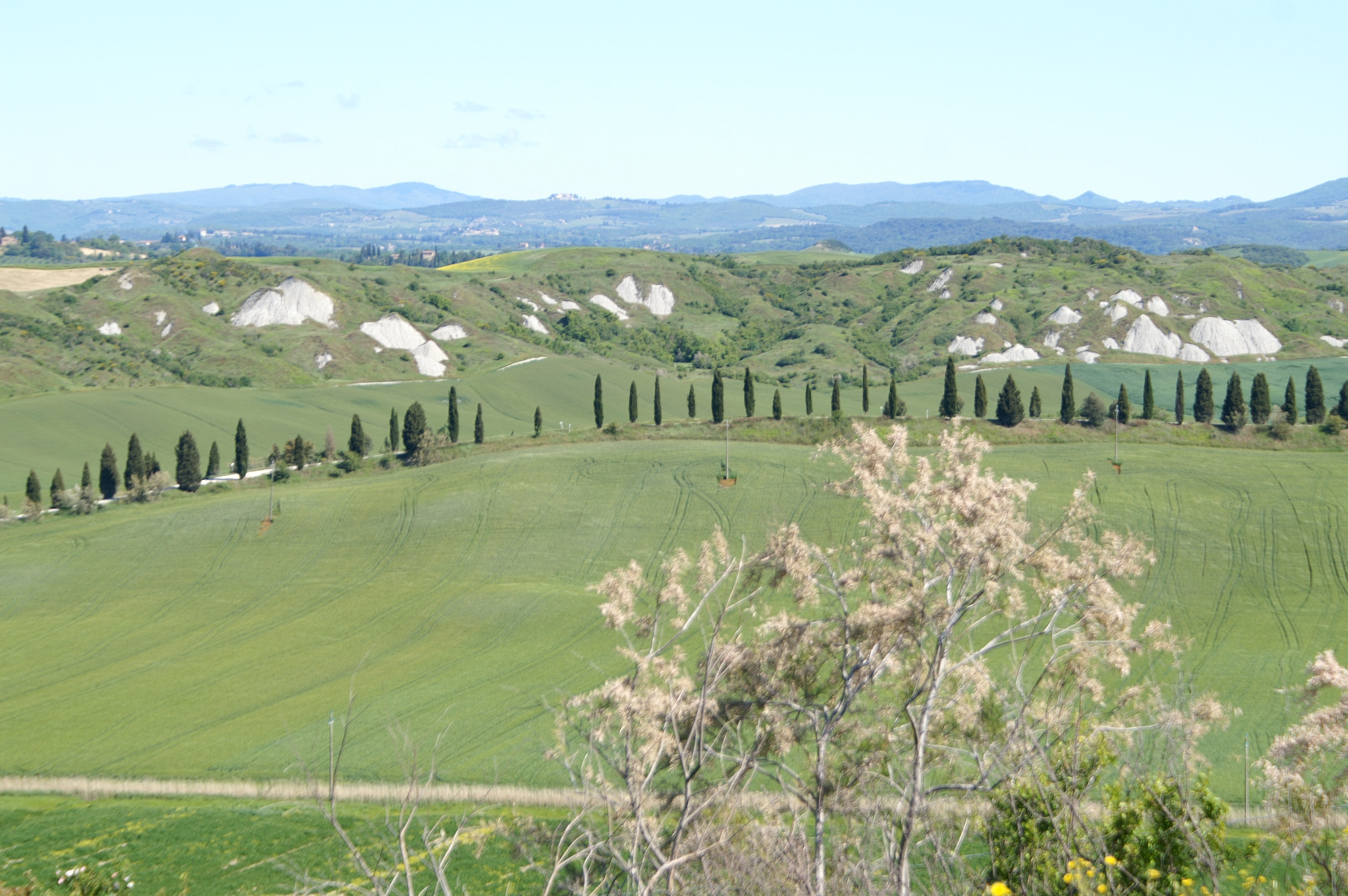 - Le but premier est d’emprunter la SP438 dite des « Crete Senesi » photo ci-dessus, de Arbia jusque l’abbaye de SM di Olivetto Maggiore. Cette route merveilleuse vue au printemps (de préférence…) sur tous les dépliants de Toscane. C’est parti pour env. 40km depuis Sienne, et les astres sont alignés, c’est superbe !