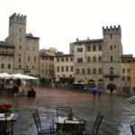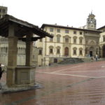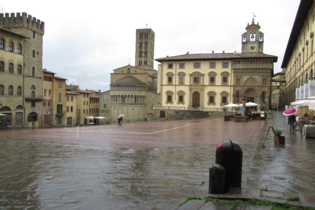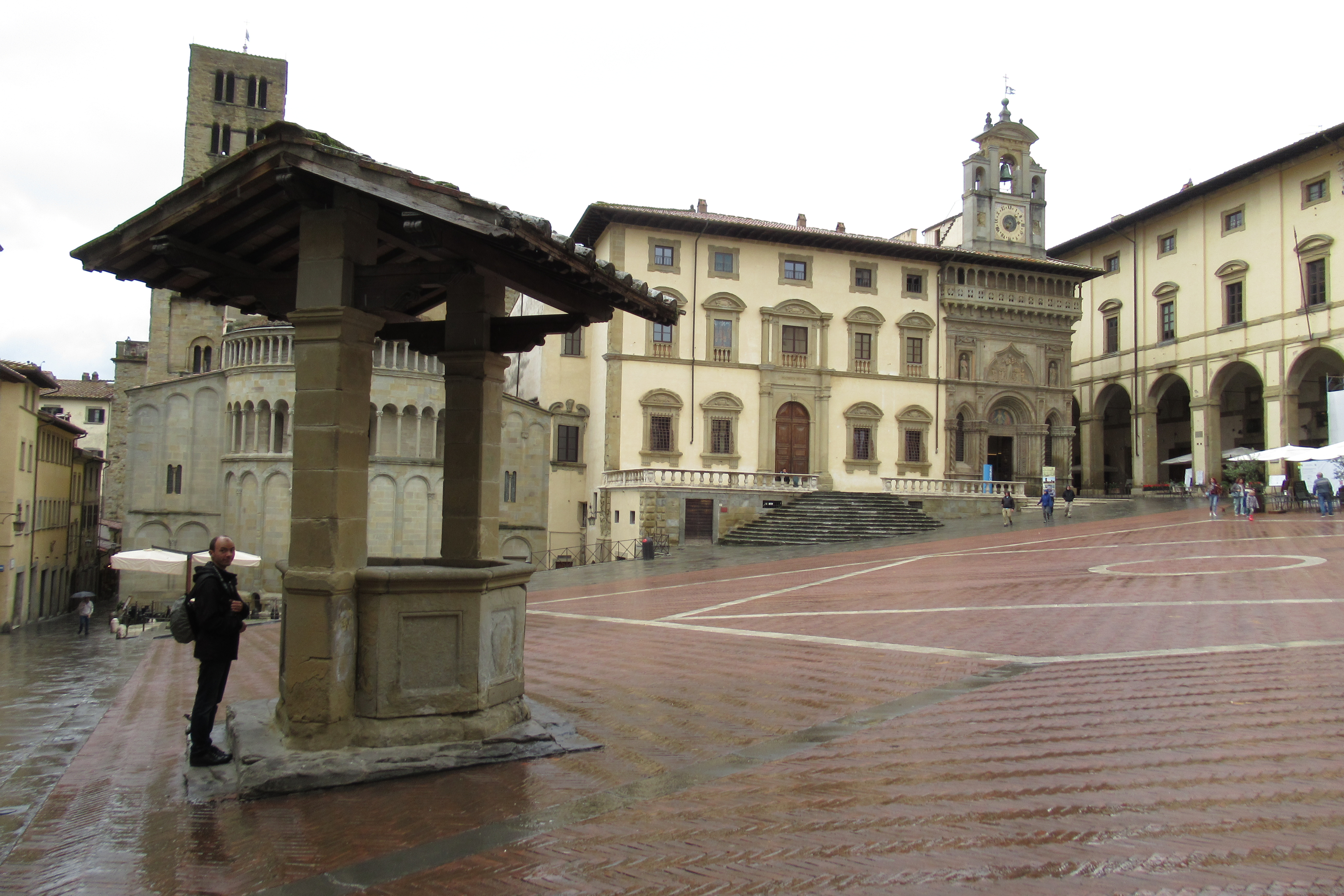 - En évitant les gouttes, nous entamons notre « tour de ville » sens horaire par la Parrochia di Badia, la piazza della SS Annunziata, la Casa Vasari (non visitée), l’imposante Cathédrale* (fermée à cette heure), le palazzo Pretorio, et enfin le morceau de choix « la Piazza Grande« ***photo ci-dessus.