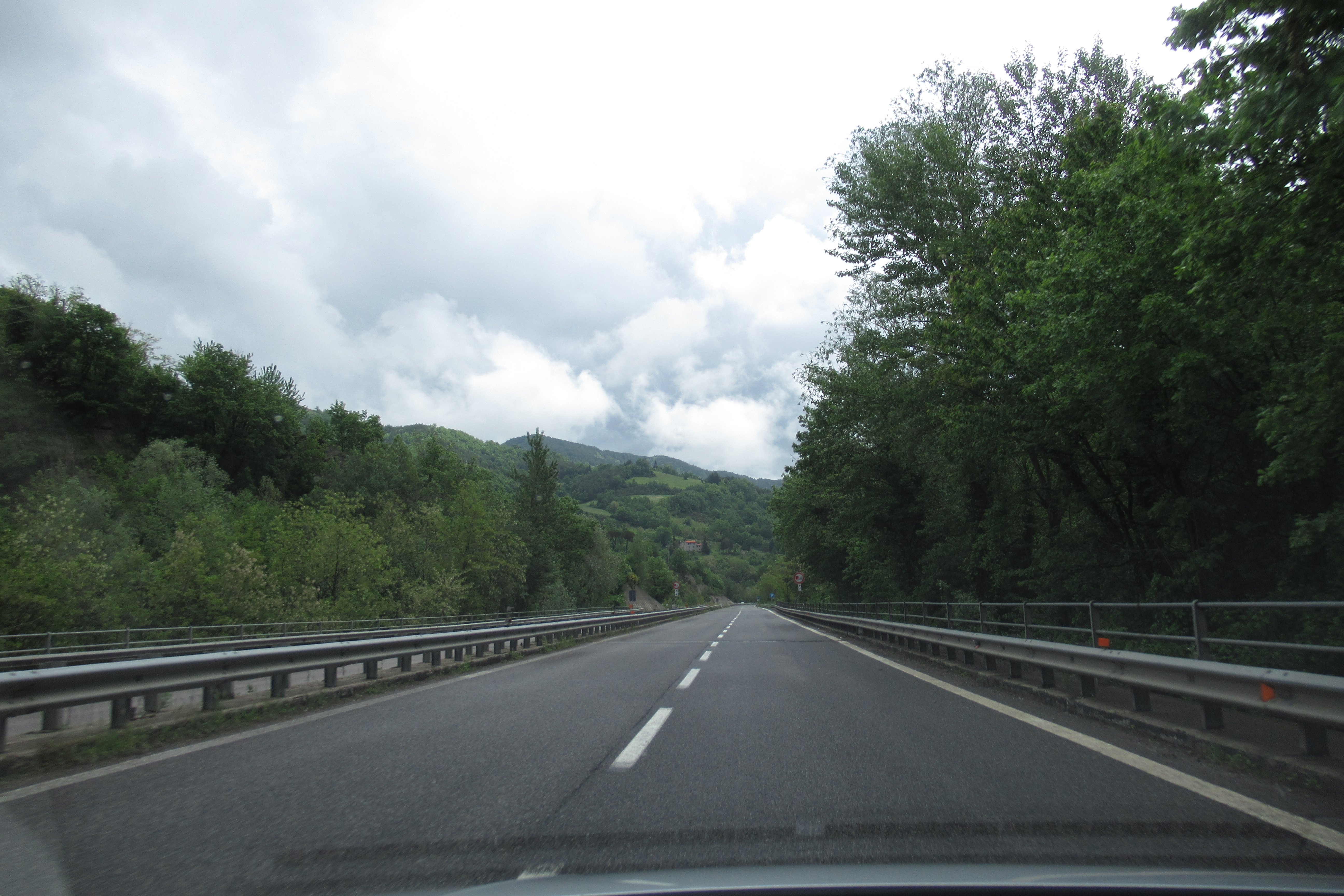 - Après le petit déjeuner trop frugal (c’est un « bon » pour le bar Stefano juste au pied du BandB: 1 boisson + 1 croissant…, supplément payant…), et une marche tonique avec valises jusqu’au parking, nous mettons le cap vers 10h10 pour rejoindre directement Ravenne à 161km/2h20. Autoroute avec paysages sympas mais avec de nombreuses zones en travaux, dont certains consécutifs aux viaducs en très mauvais état !
