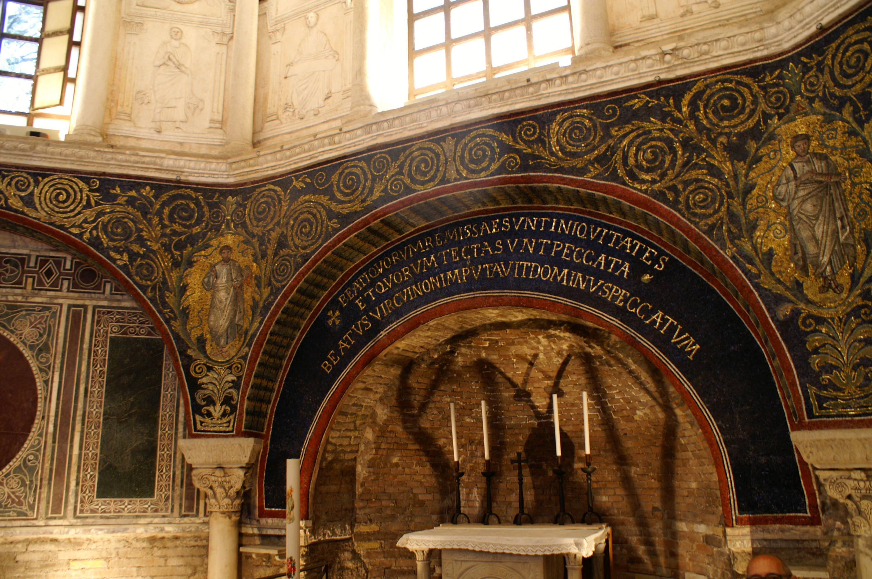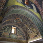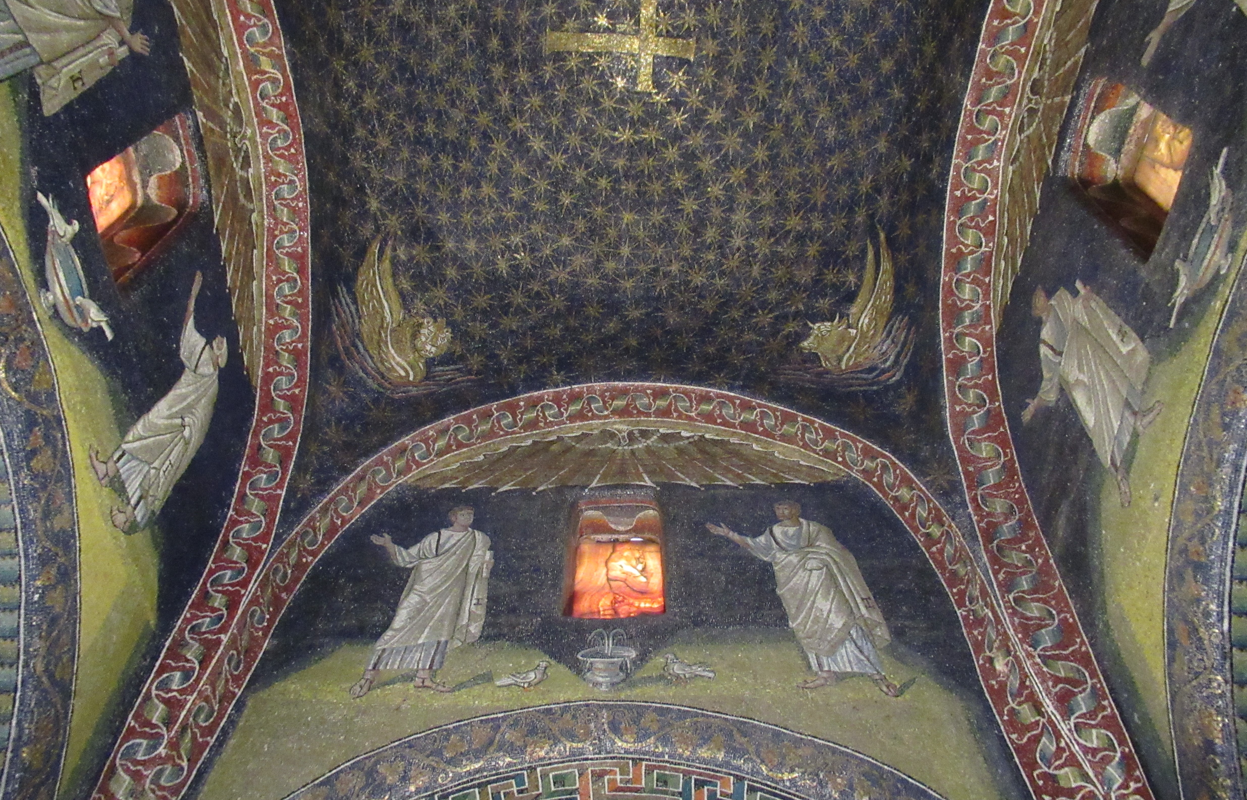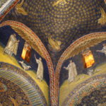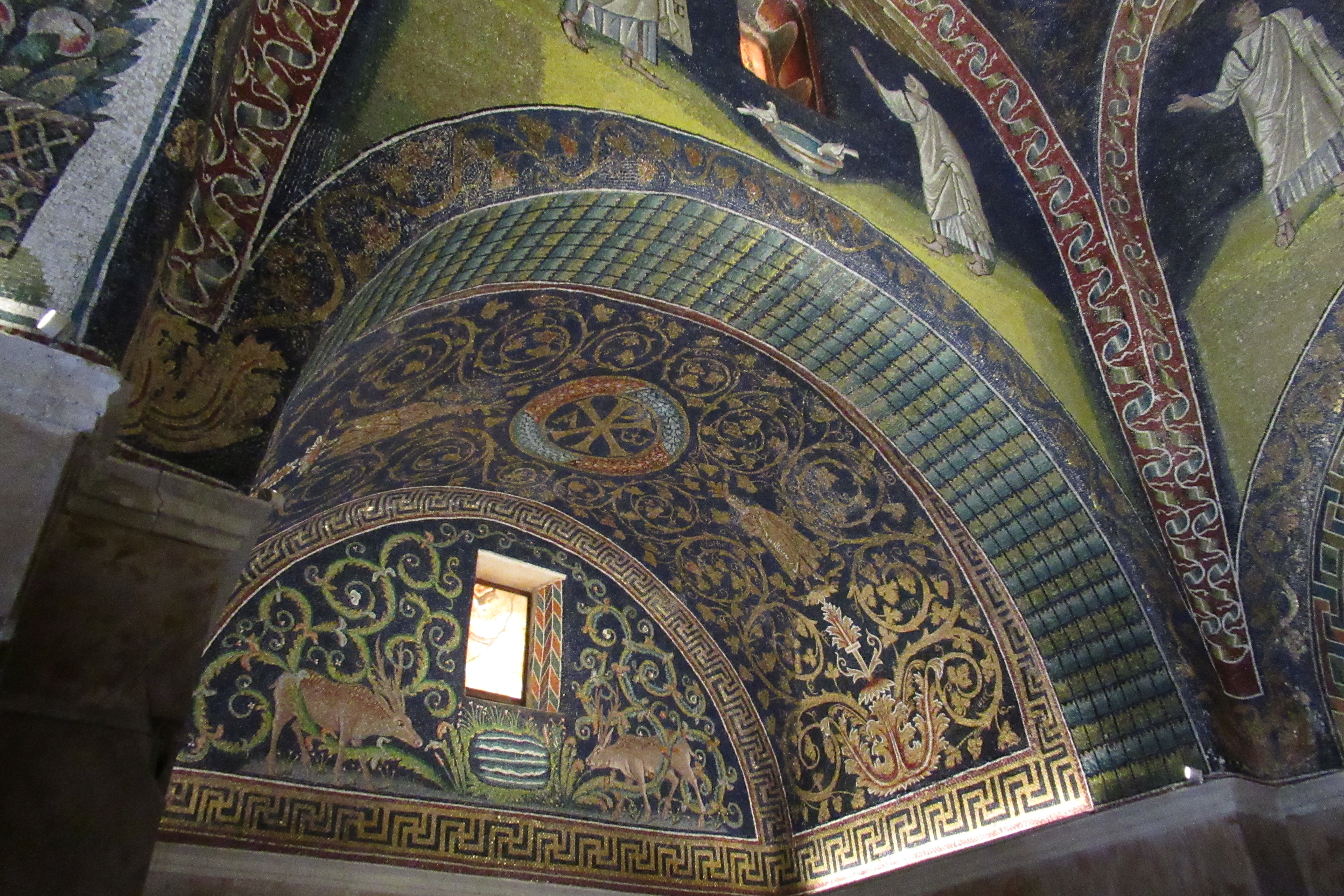 - 13h30 c’est parti vers le Mausoléo di Galla Placidia*** dans l’enceinte de la Basilica di San Vitale*** photo ci-dessus avec du Wahoouu en prime. Les mosaïques sont superbes. Ces premières visites à Ravenne donnent le ton ! suivent le Baptistère des Ariens* (1€ non inclus dans le forfait), la piazza del Popolo, la piazza San Francesco et son église** avec la crypte inondée, la tombe de Dante* juste à côté.