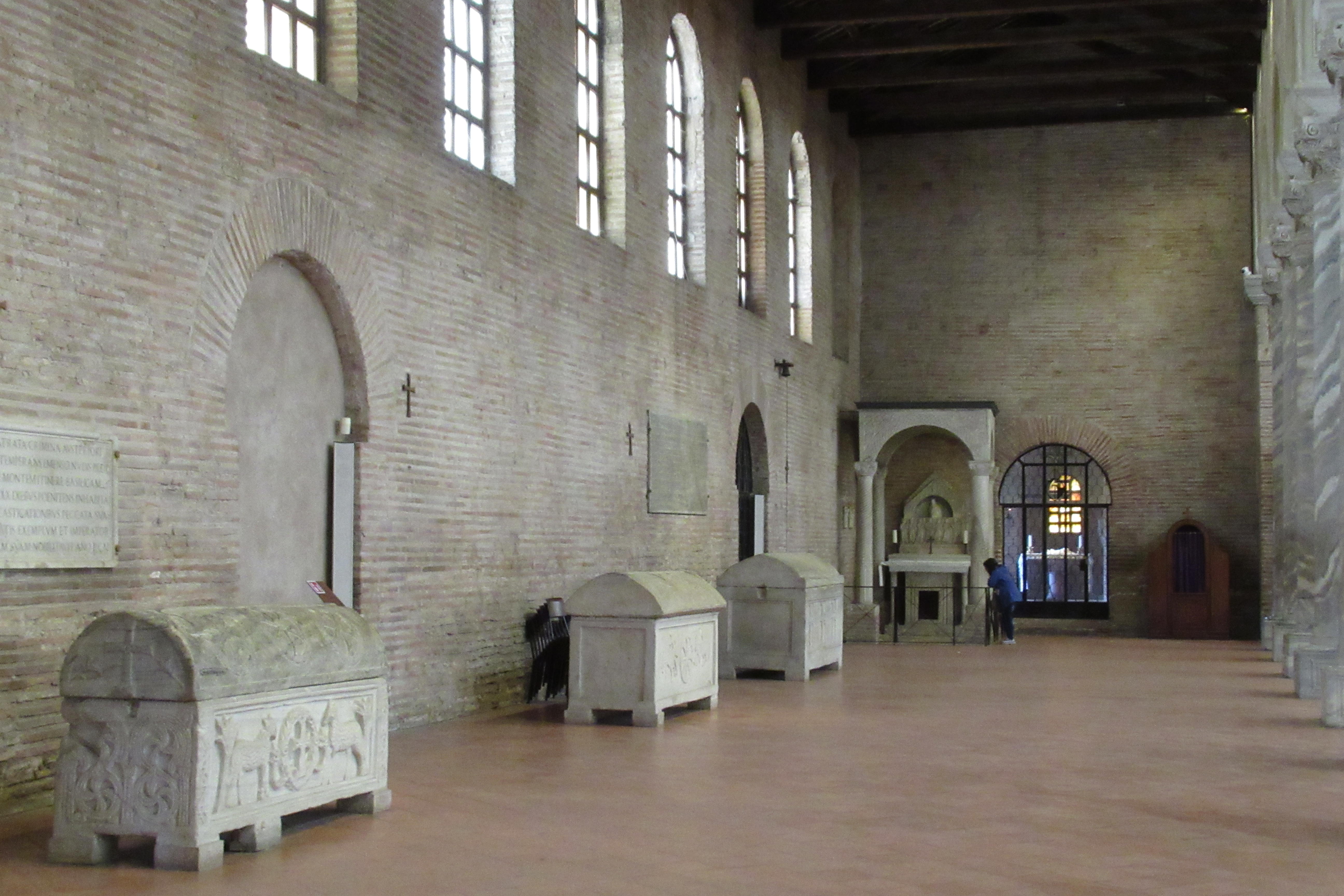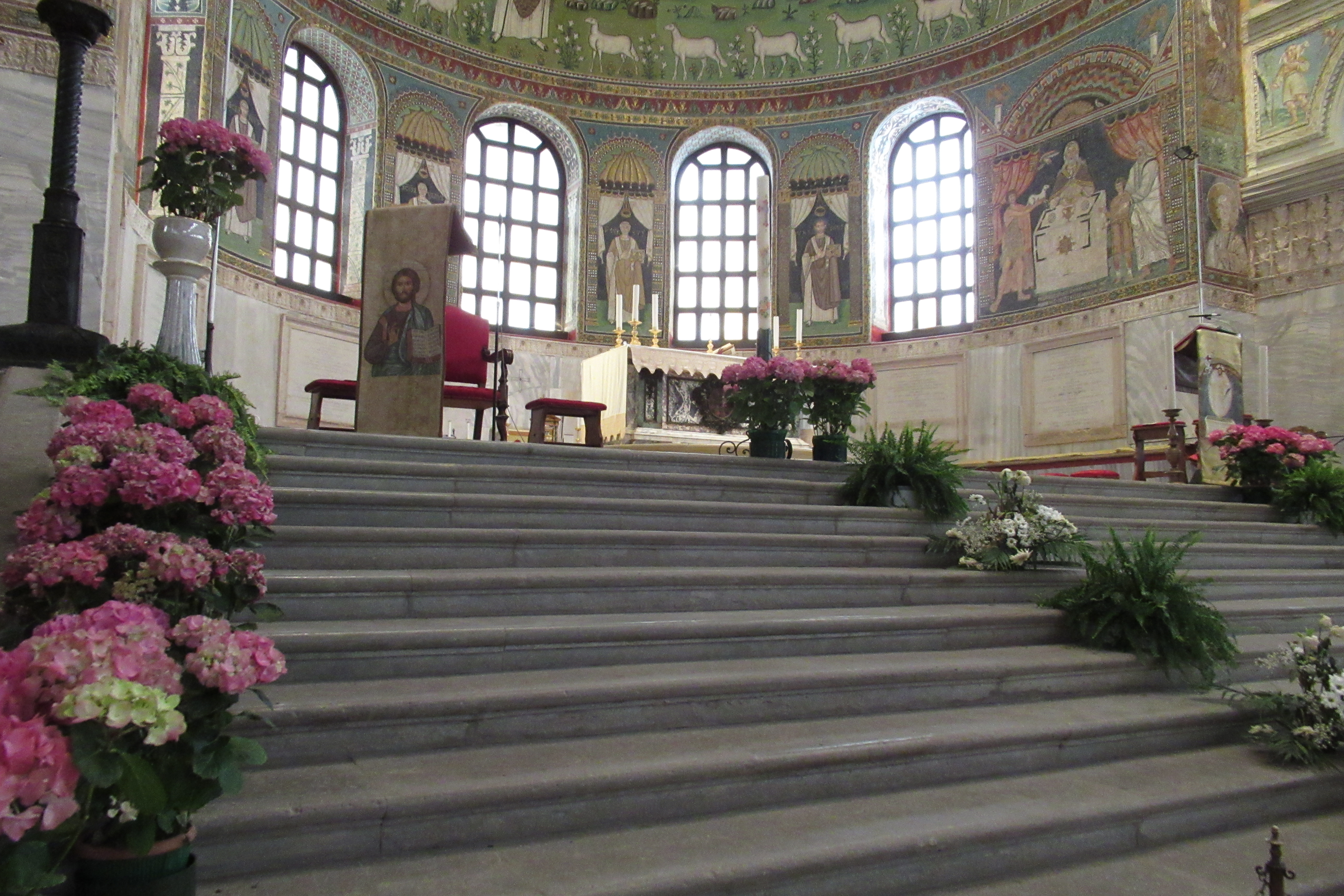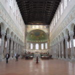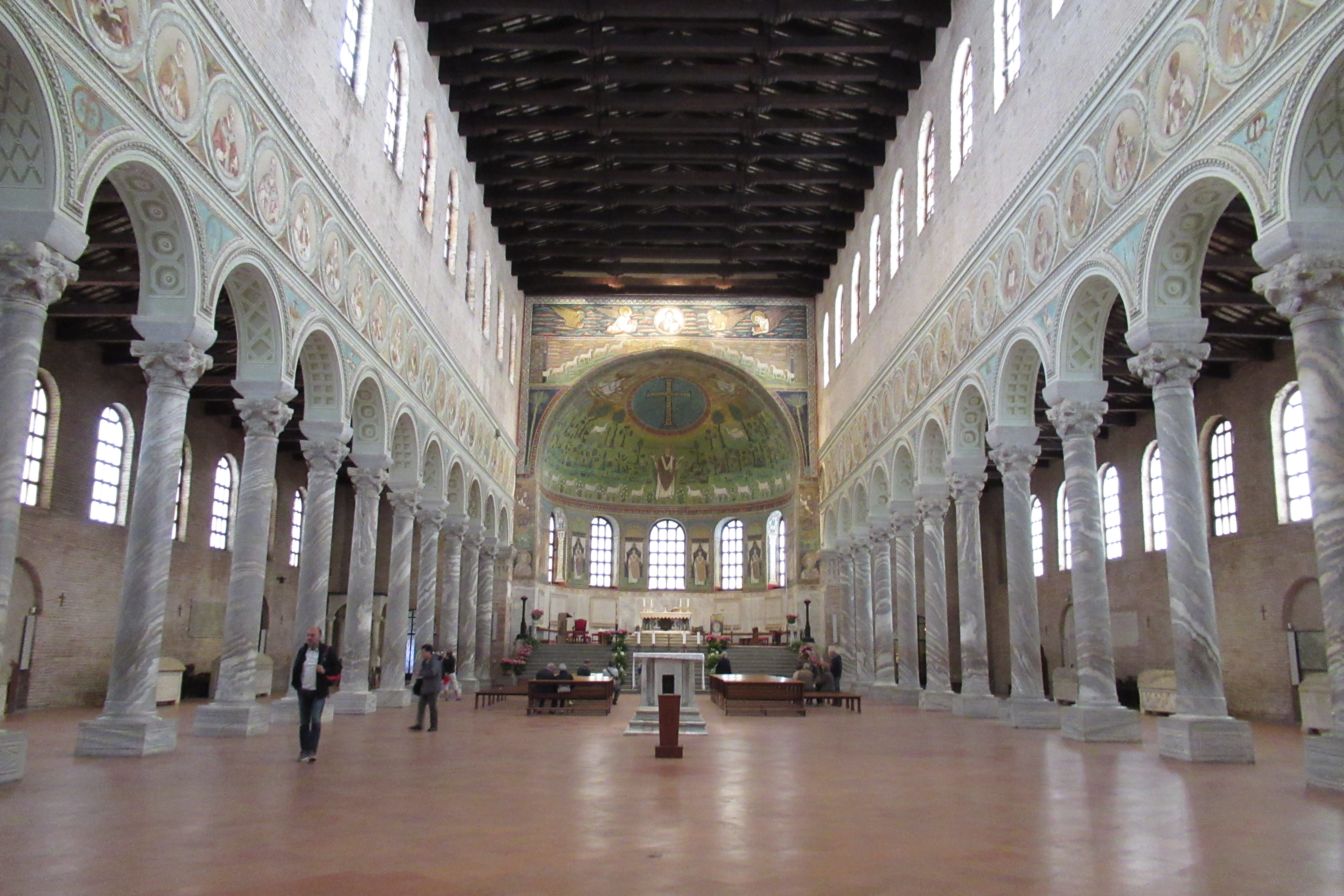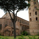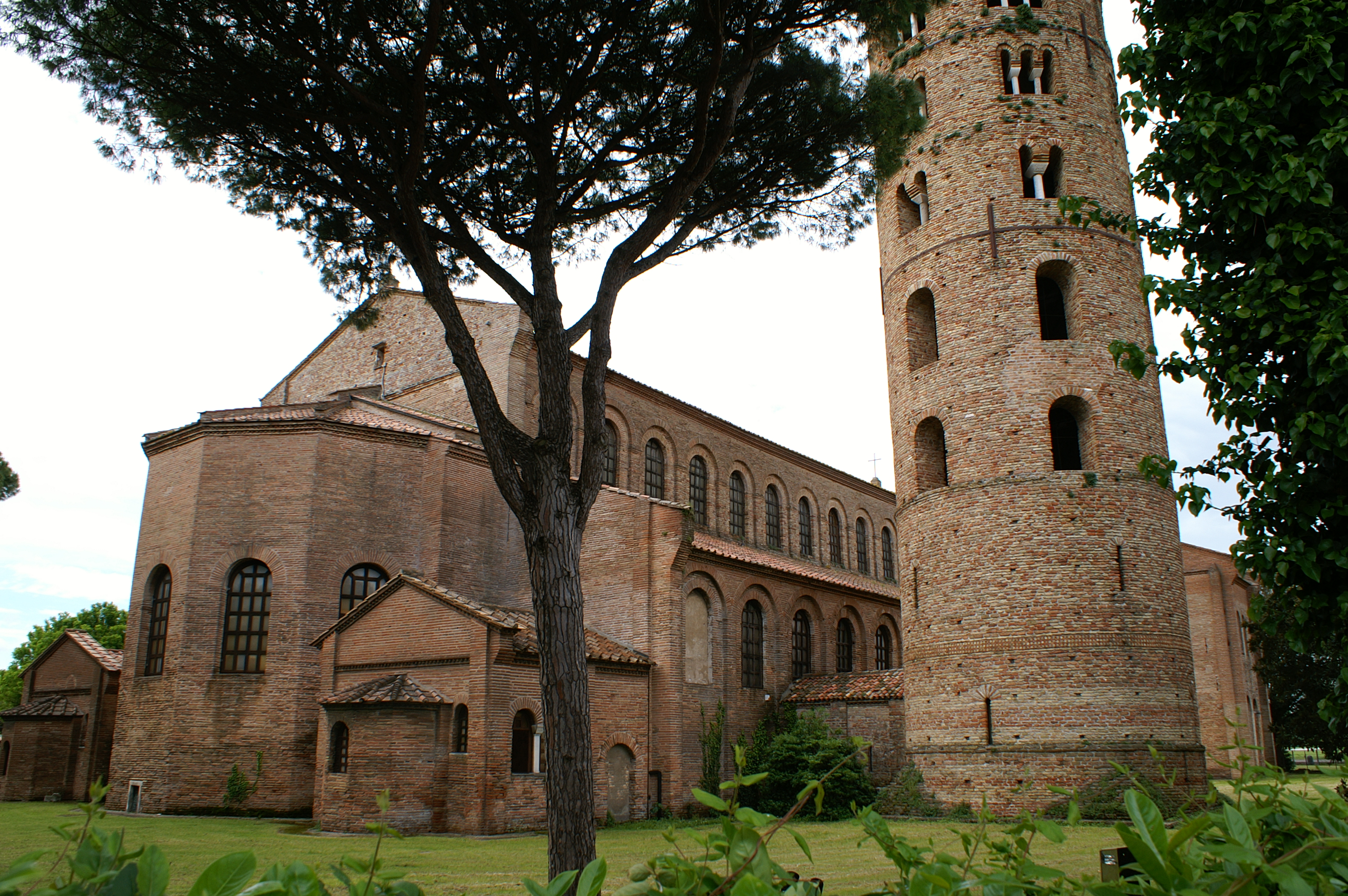 • Après le petit déjeuner copieux dans le très beau cadre de la salle à manger du Ai Giardini di San Vitale, nous n’avons que 8km/15 mn pour rejoindre Classe, l’ancien Port de Ravenne. C’est là que nous visitons cette grandiose Basilique de Sant’Appolinare*** (l’autre…).