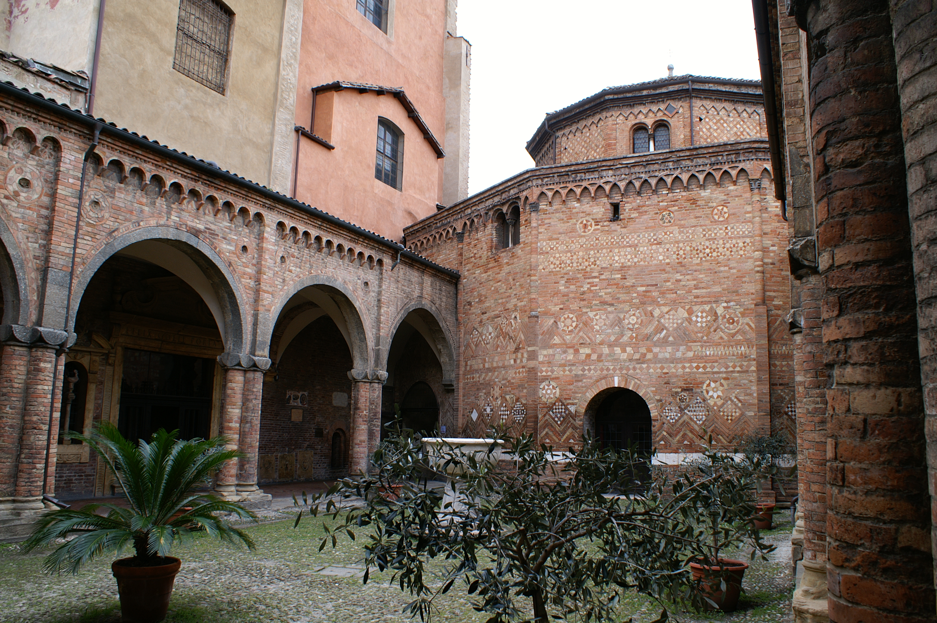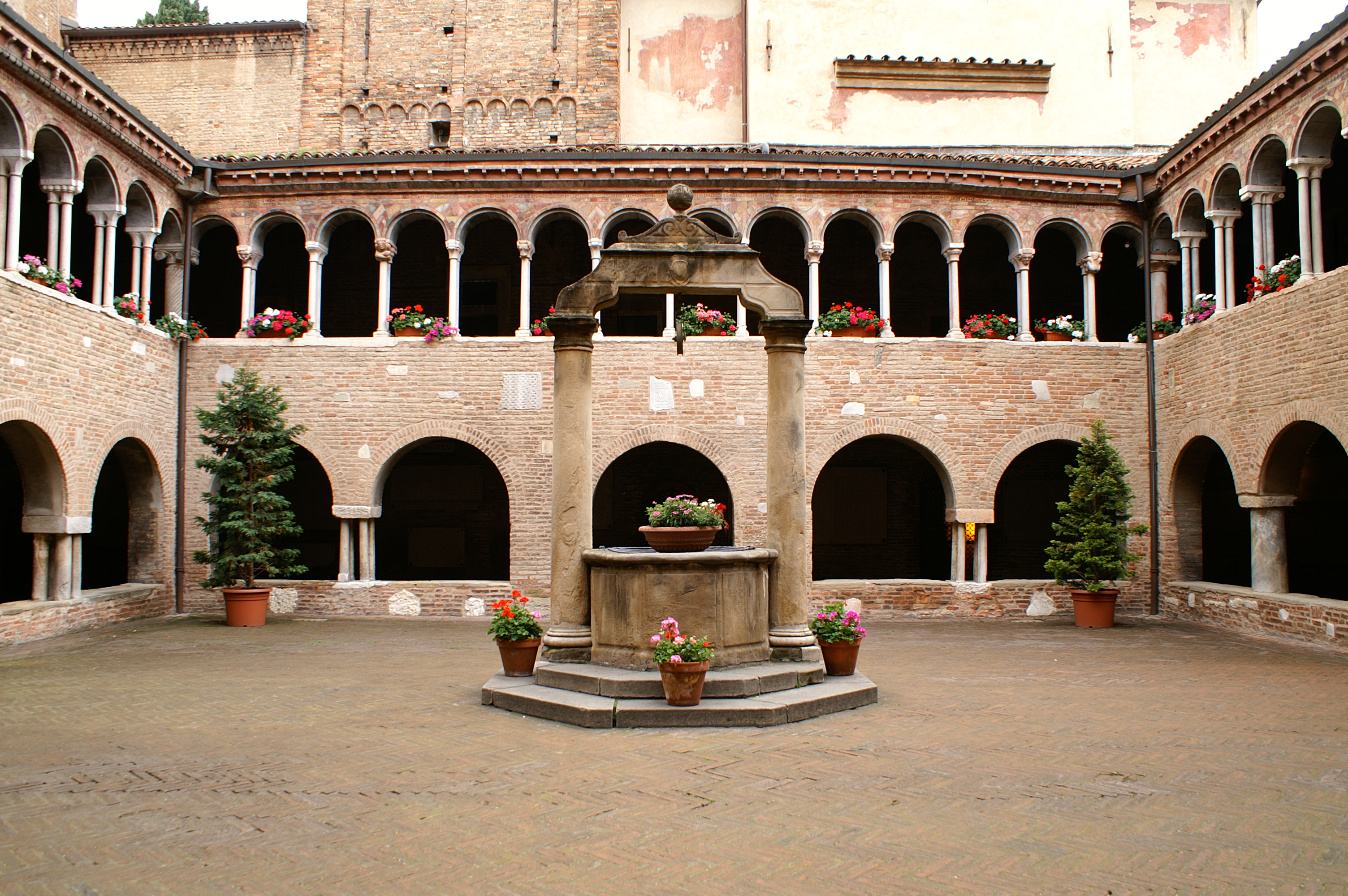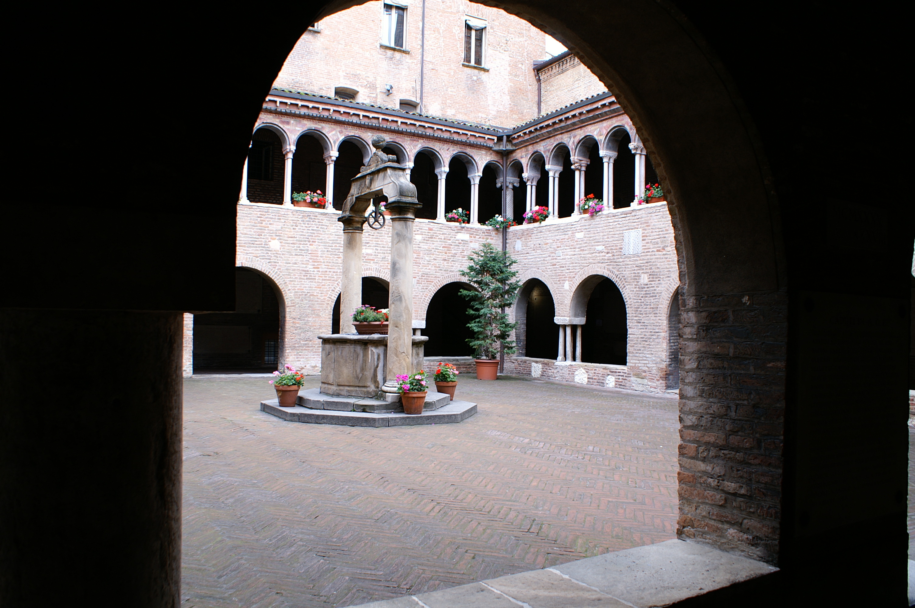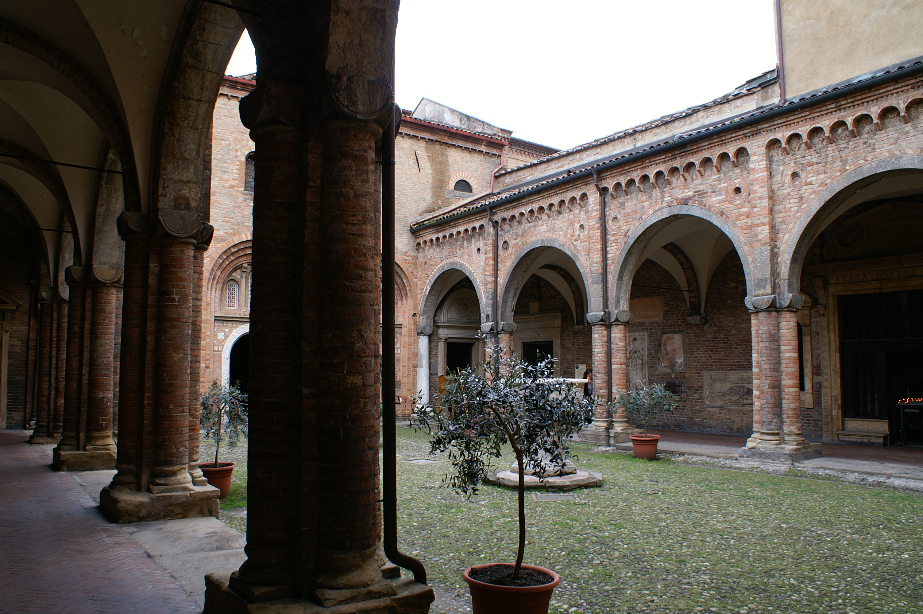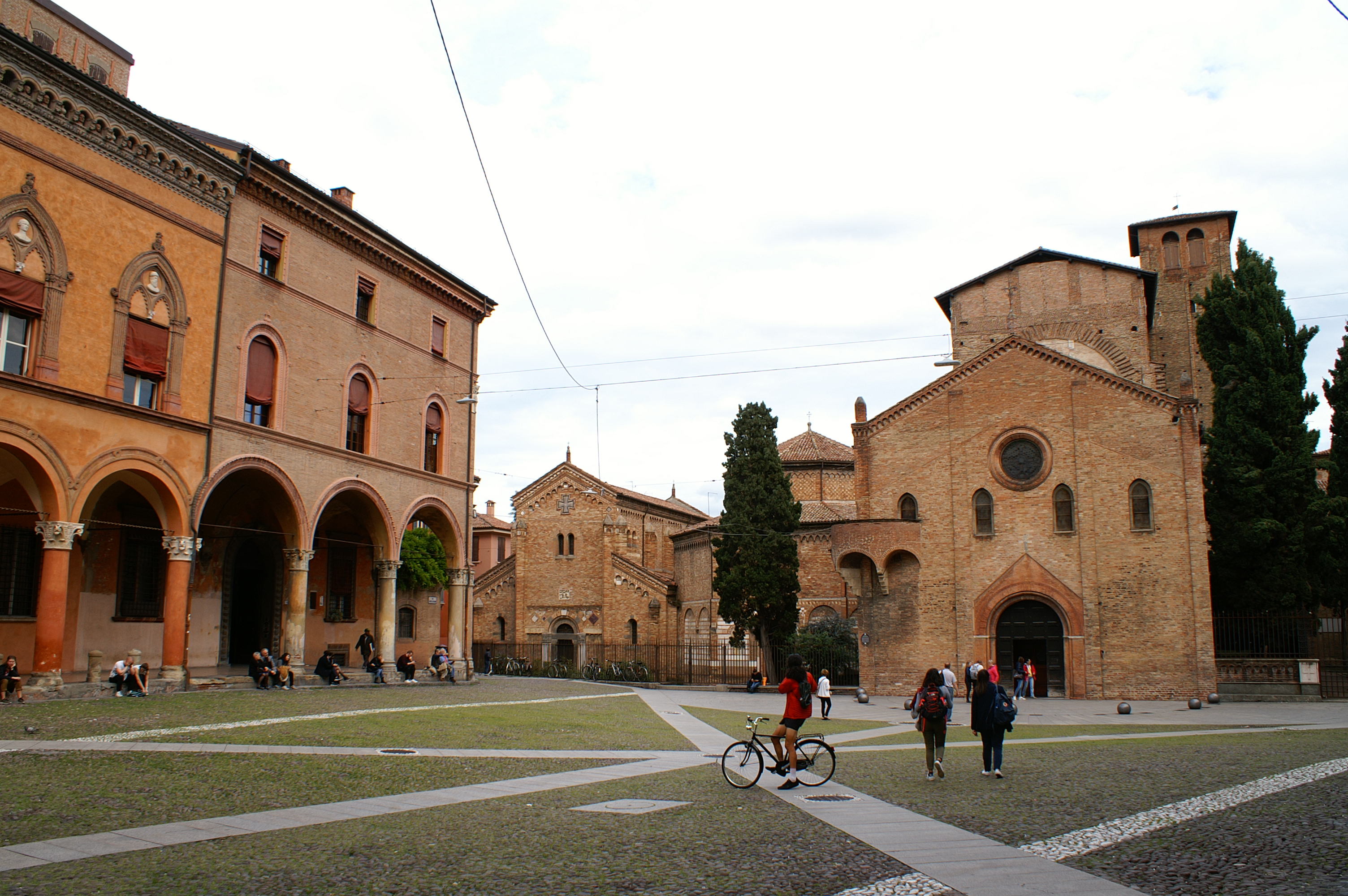 • D’abord emprunter les trottoirs mais surtout quelques uns des 48km d’arcades (bien pratiques) vers la piazza Maggiore**, la fontaine de Neptune**, le palais de l’Archiginnasio (en travaux), une galerie de commerces « très haut de gamme » : Gucci, Rolex, Hermès et Cie… puis nous nous retrouvons, vers l’Est, sur la plazza Santo Stefano*** et son incroyable complexe de 4 églises imbriquées + chapelles et 2 cloîtres, magnifiques ! surtout avec les commentaires du « frère » présent, ponctionneur de dons.