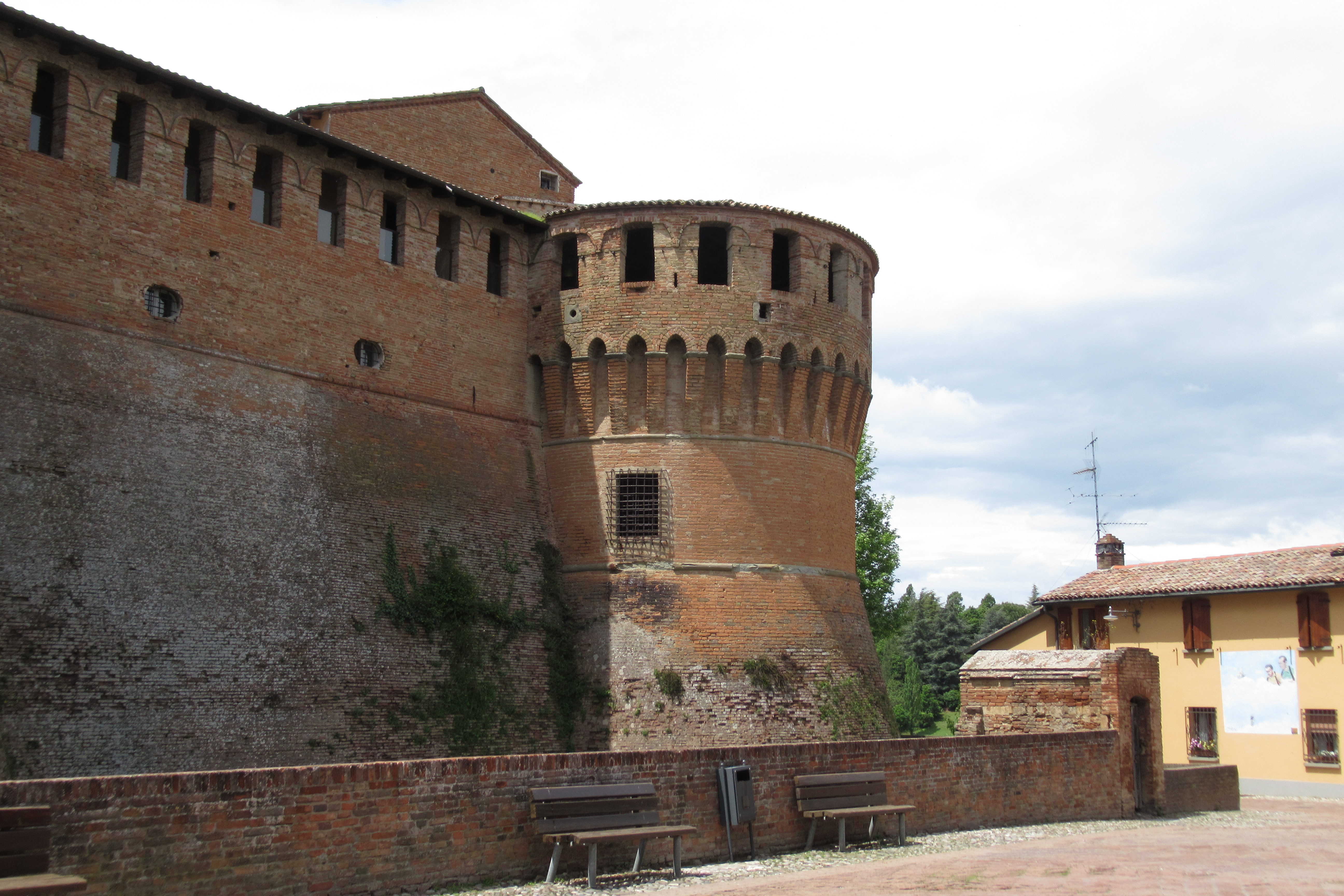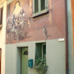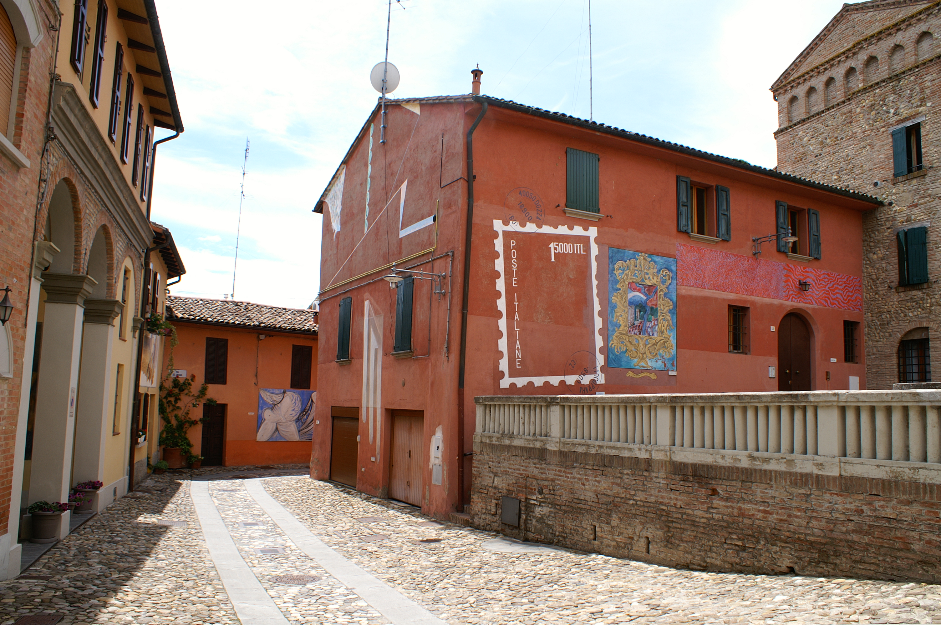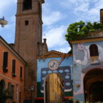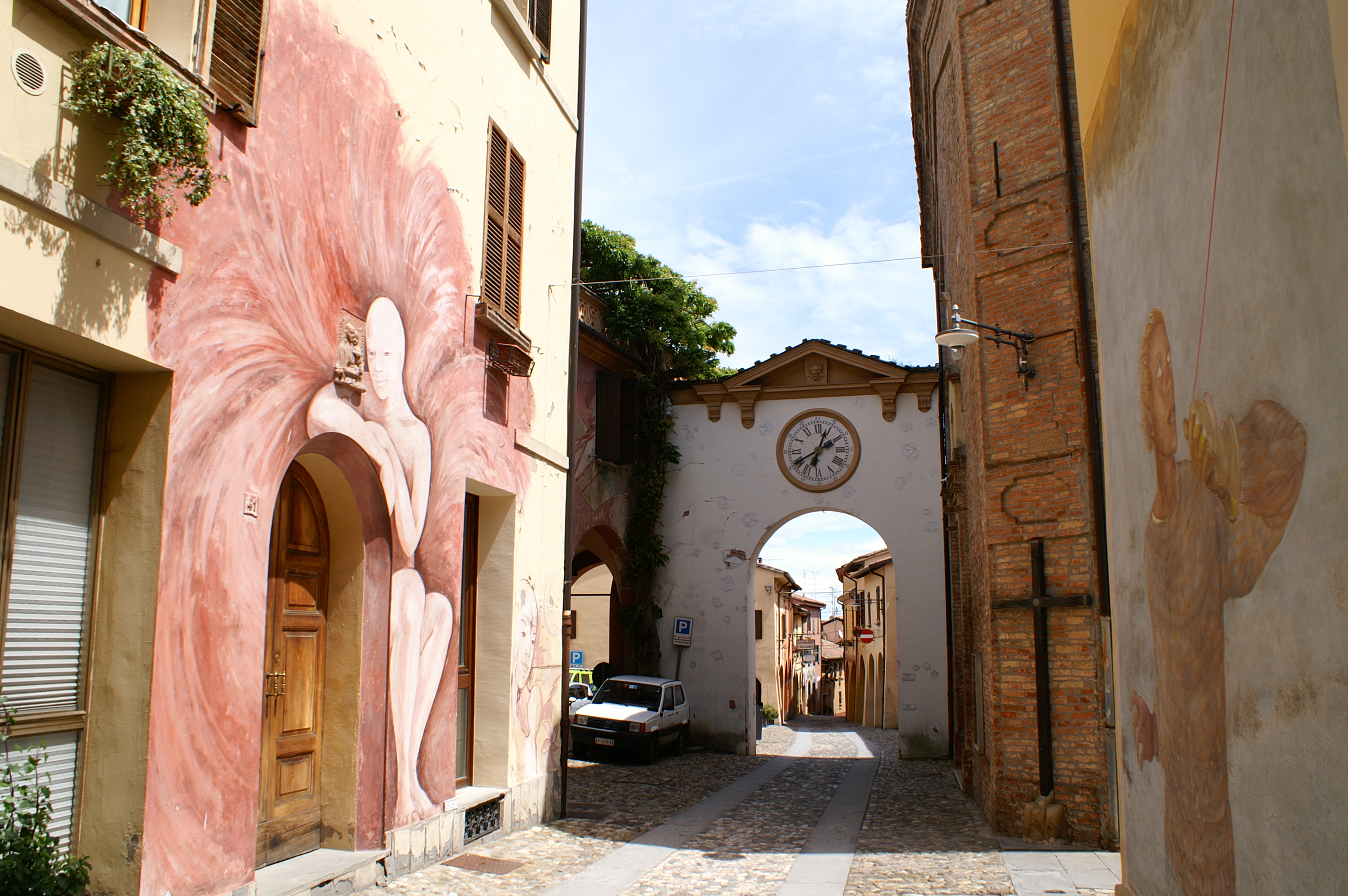 • Vers l’Ouest encore pour 11km/20mn et le village coloré de Dozza (c’est tout petit avec une rue principale et une petite rue parallèle= 60mx500m). Jolies façades et fresques peintes. Puis pique-nique sur le parking à l’entrée. Nous en repartons vers 13h30.