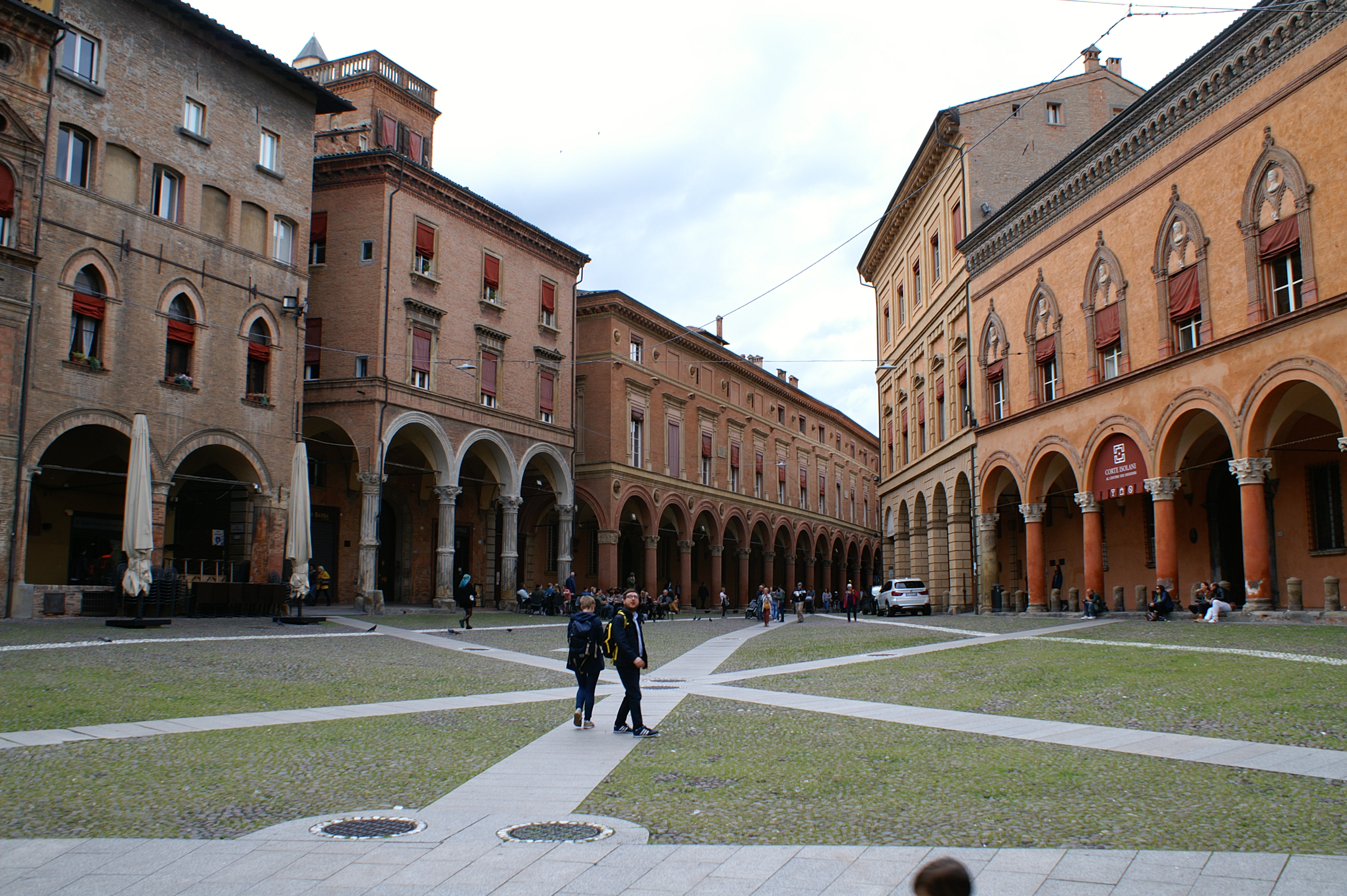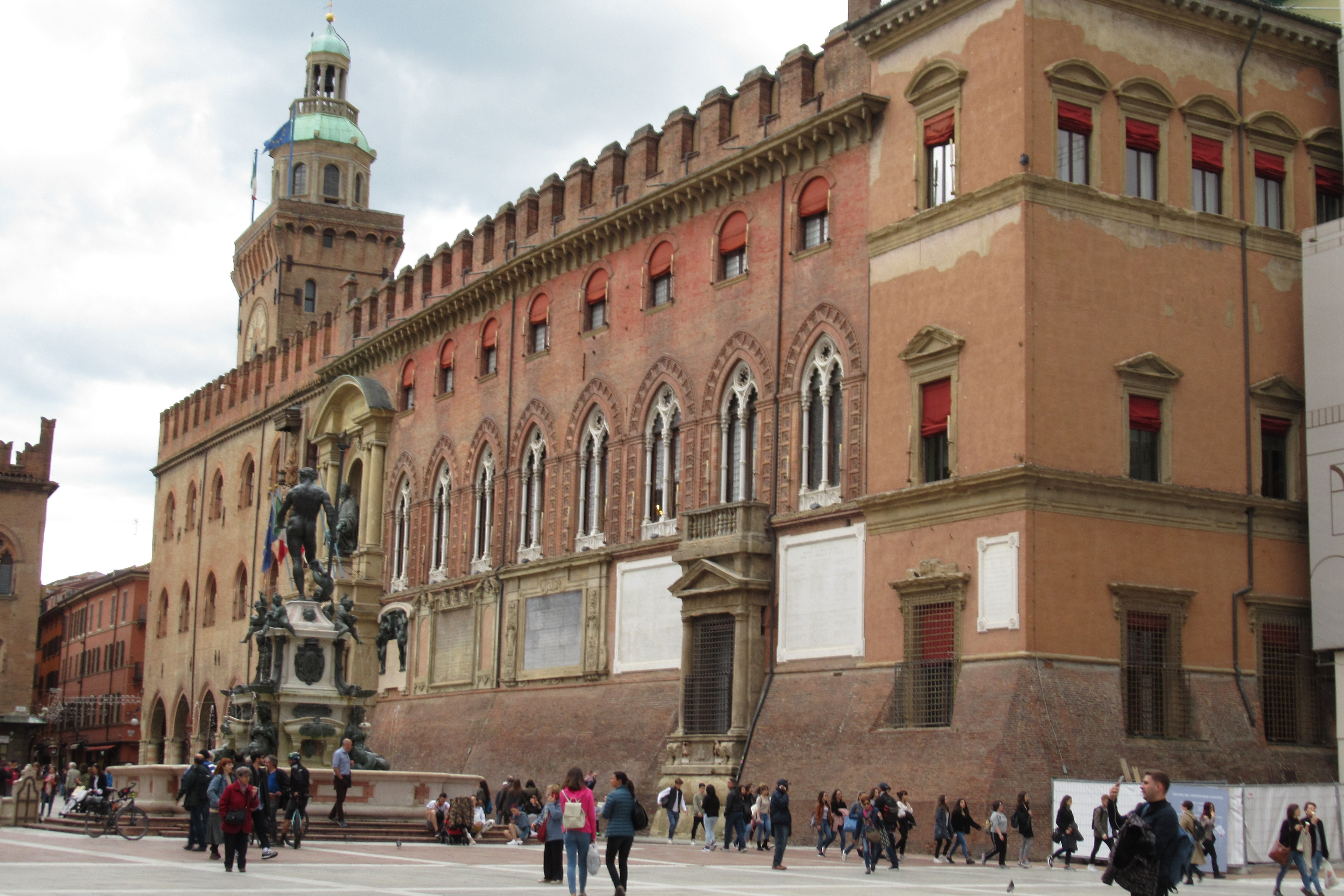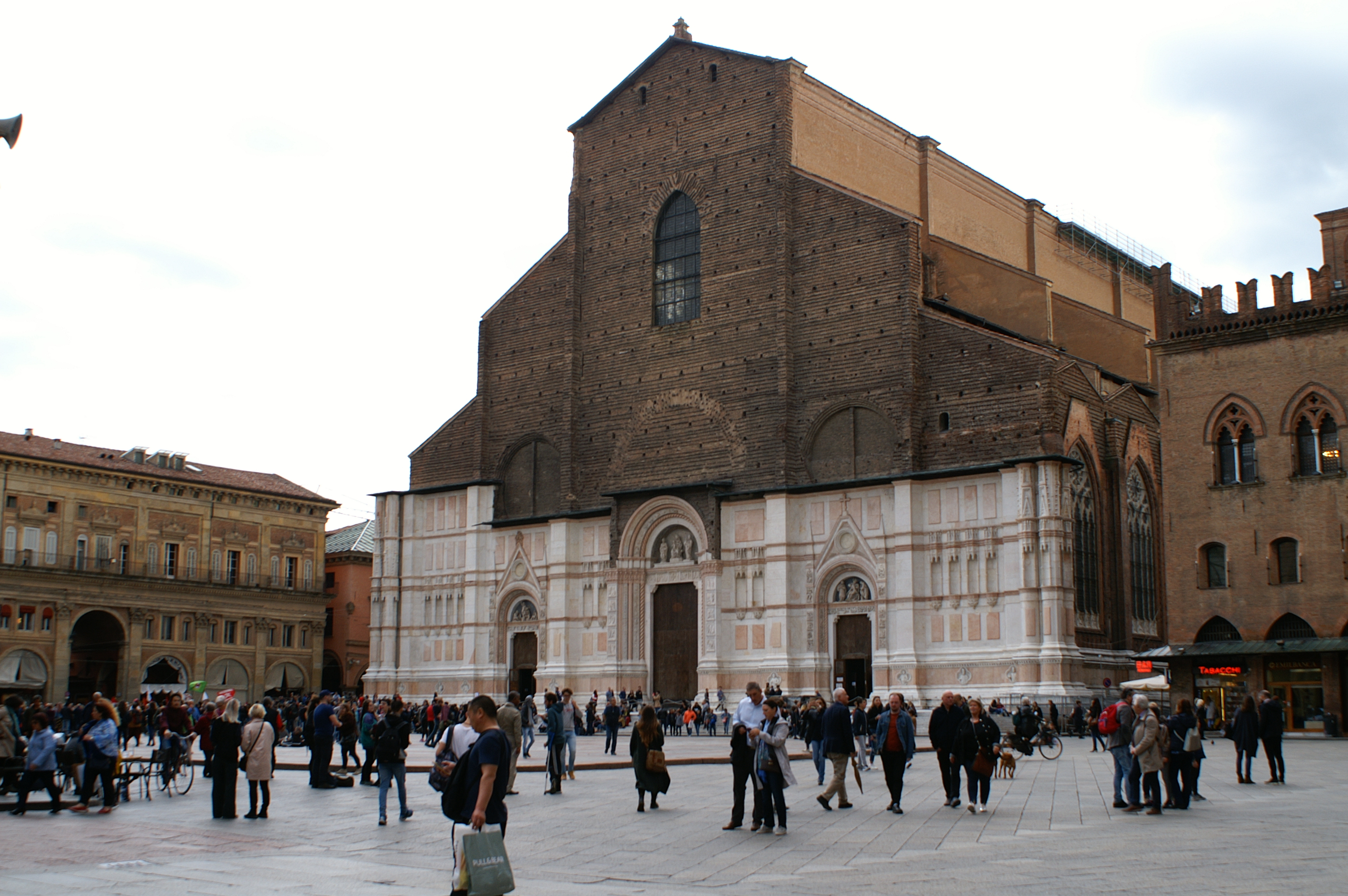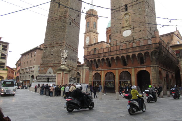 • De 16 à 18h00 nous attaquons notre première découverte de Bologne: il convient de rappeler que le style des bâtiments est très « médiéval » donc du gros, imposant voire lourd… ce n’est pas du style Renaissance… et que nous sommes dans une grande ville trépidante de 400.000 habitants dont 100.000 étudiants (plus ancienne université du monde Occidental, créée en 1088), donc assez animée !