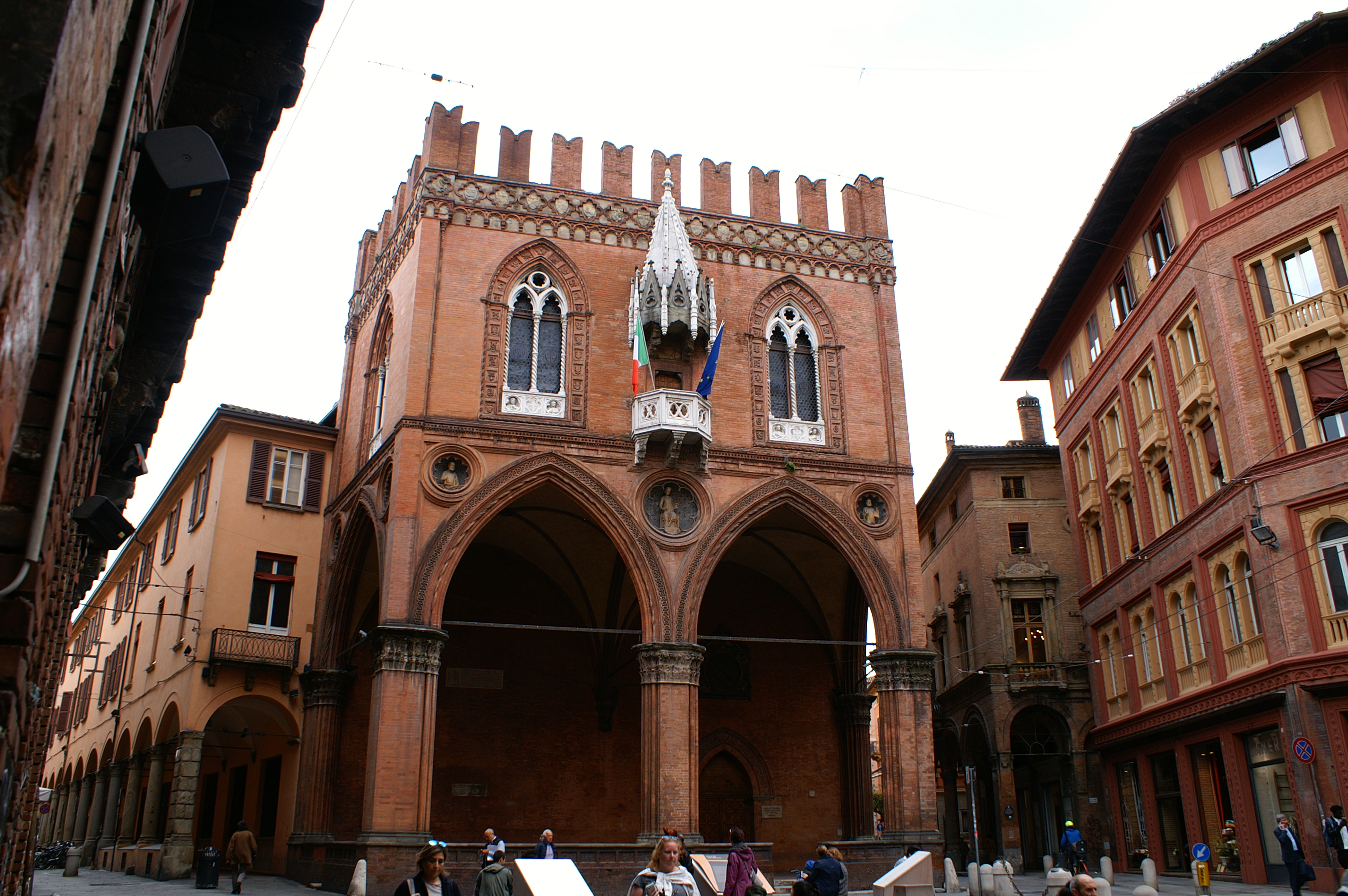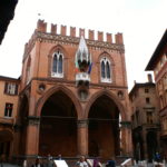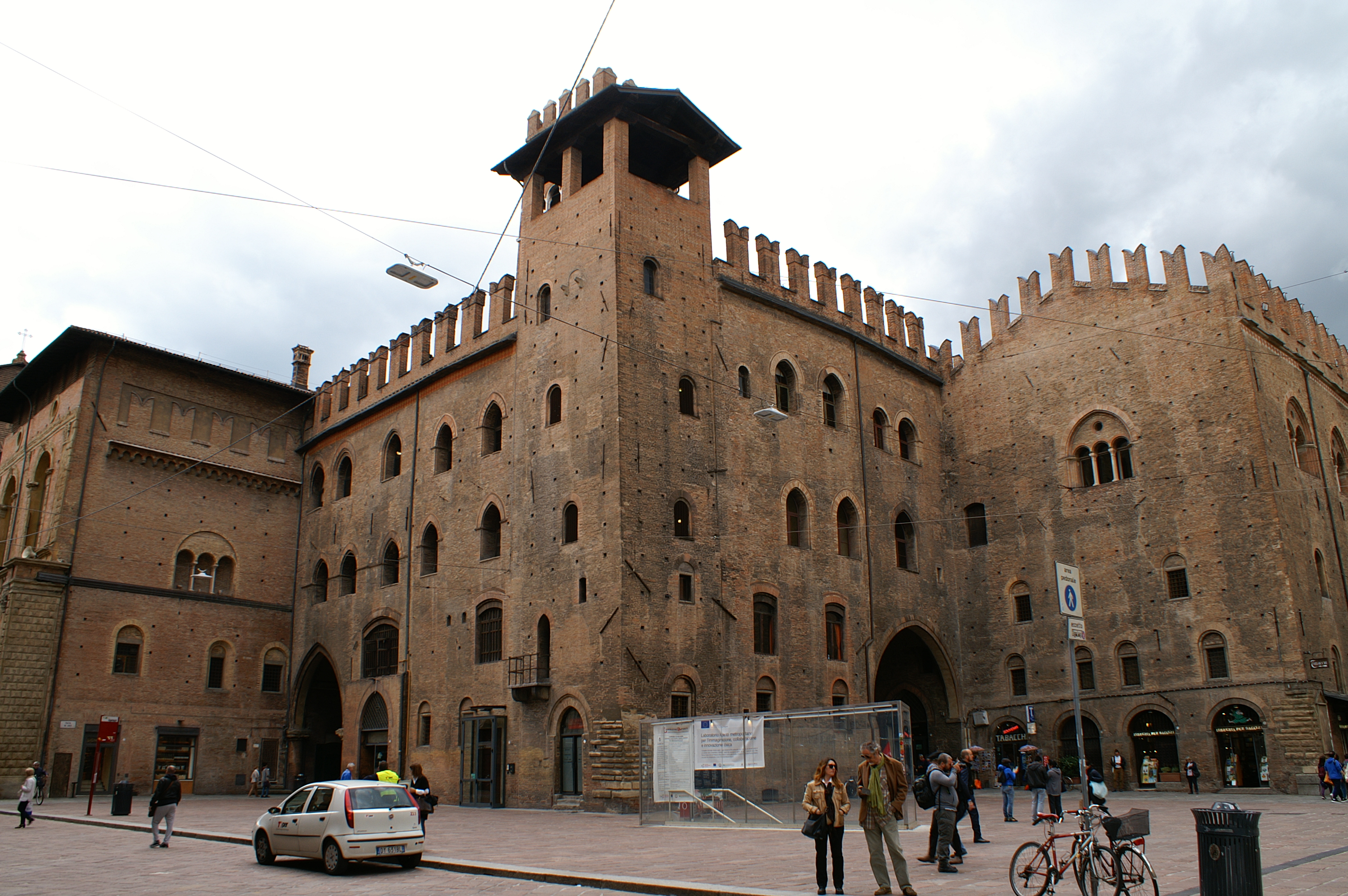 • Puis, vers le Nord, nous atteignons le point de ralliement des touristes et autochtones « Le Due Torri » photo ci-dessus (Asinelli avec 97,6m et 499 marches et Garisenda avec ses 48,16m penchés). Après la via Rizzoli voir le palazzo Re Enzo, une sorte de forteresse, et retour sur la piazza Maggiore. Ouf ! encore 400m pour rentrer à l’hôtel.