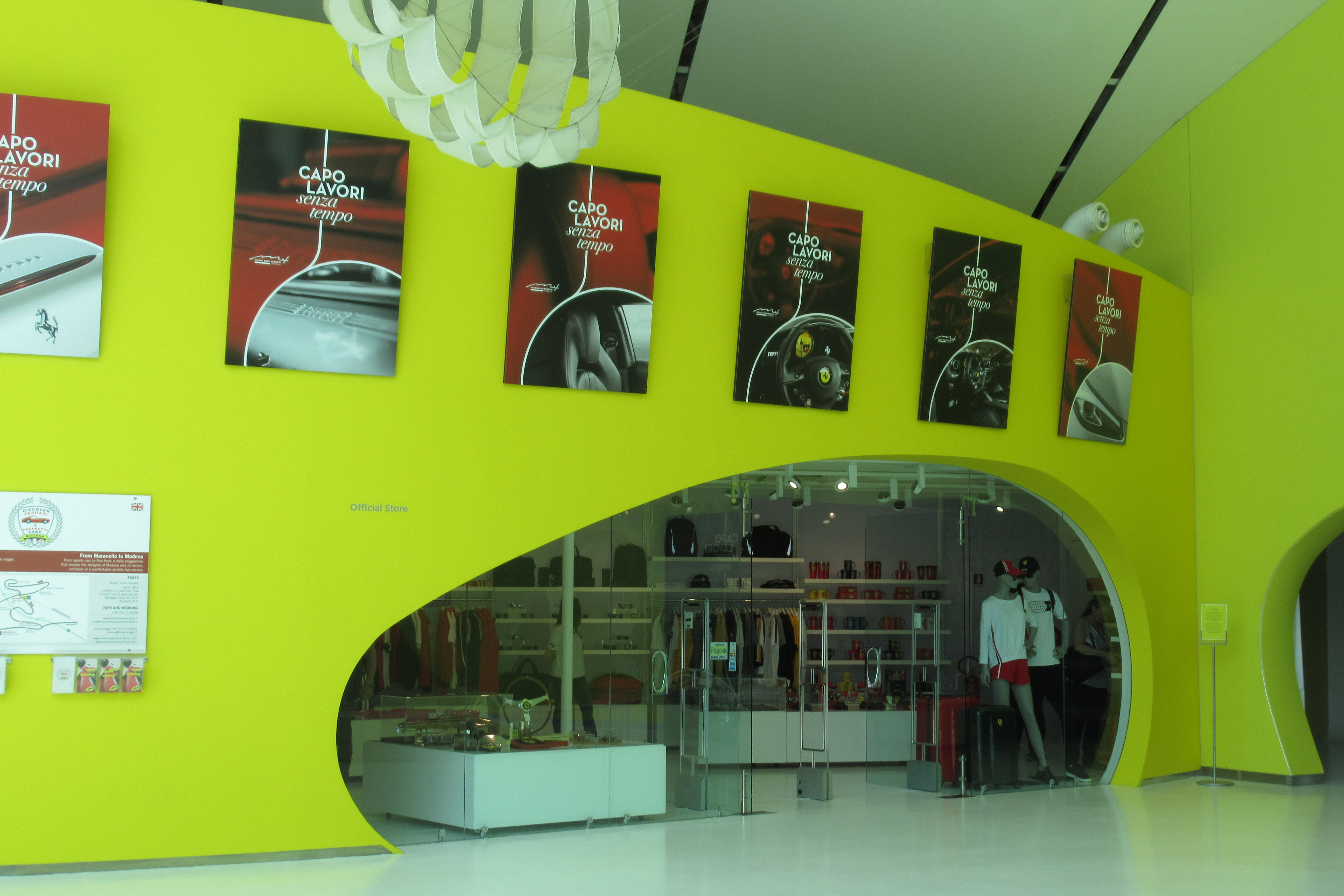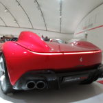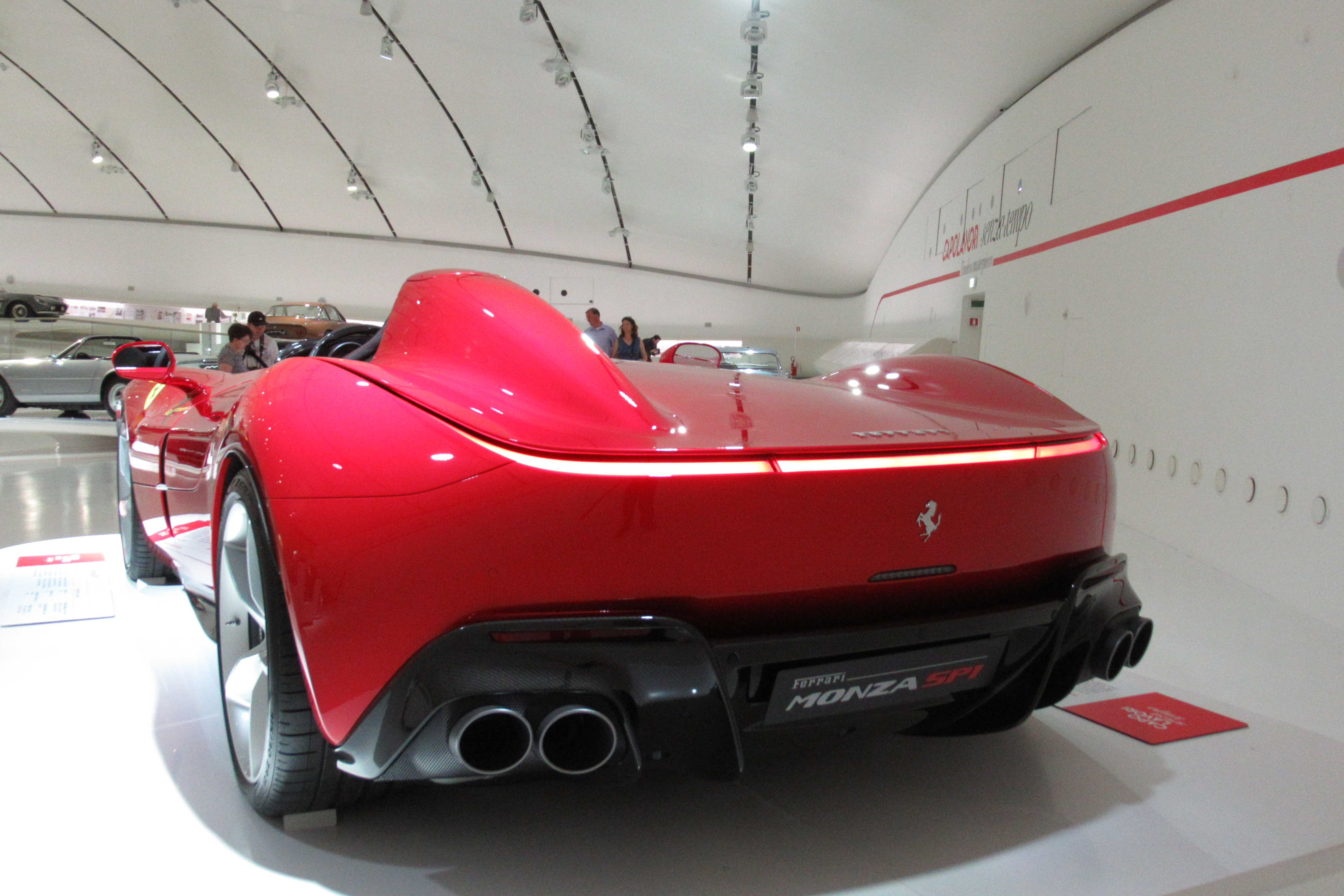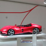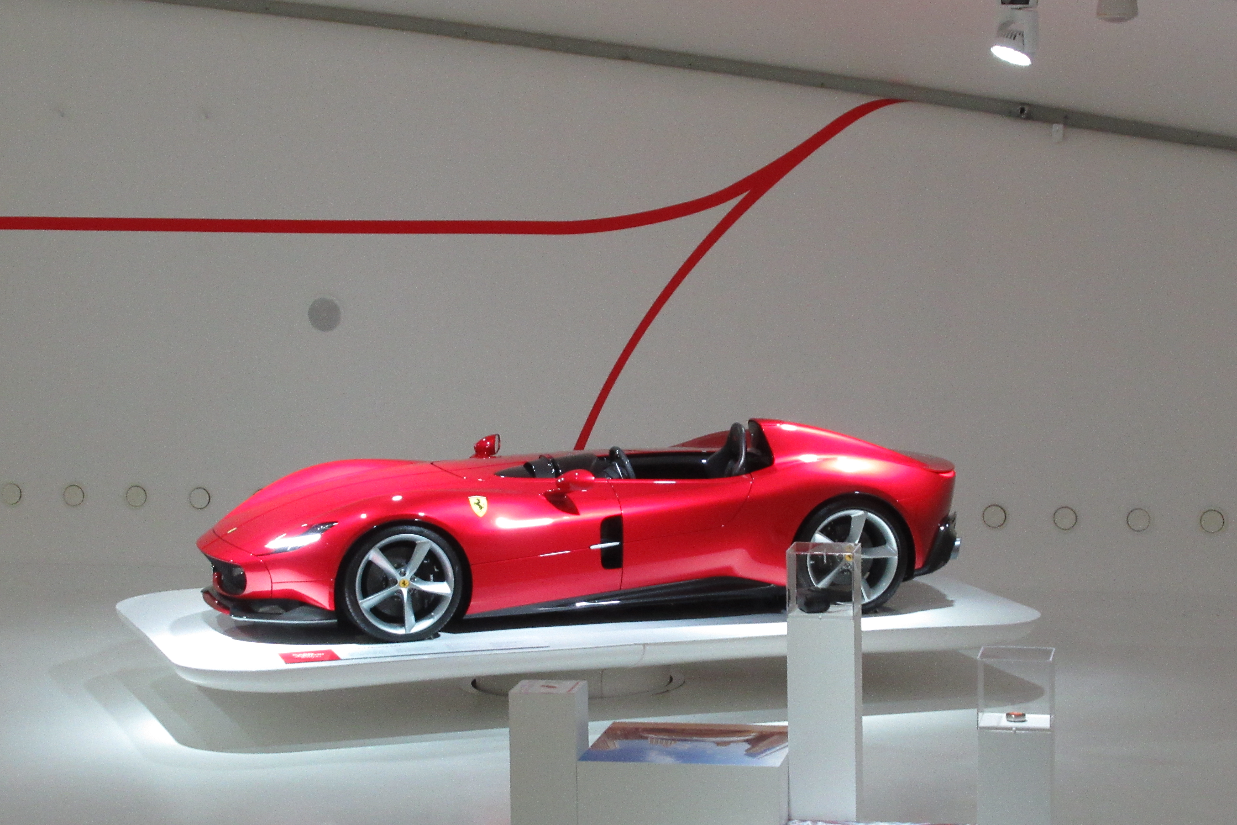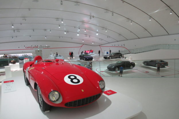 - Le musée Enzo Ferrari*** photo ci-dessus, est tout près, derrière la gare, un superbe bâtiment futuriste construit à côté de la maison où est né le Commendatore. Nous y sommes pour 14h15. La scénographie, lumières, socles et murs blancs est magnifique comme les modèles d’exception exposés (dont une 750 Monza de 1955 à l’entrée, et un proto Monza SP1 de toute beauté, au fond à droite). Juste à côté un autre bâtiment expose les moteurs, une réplique du bureau du Chef, 3 voitures (la F1 de A.Prost, une actuelle 488, et une Dino). Prix 44€/3pers.
