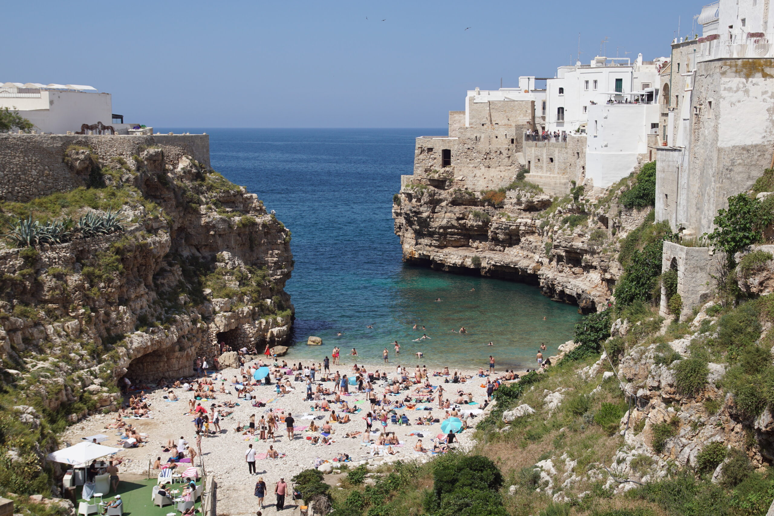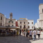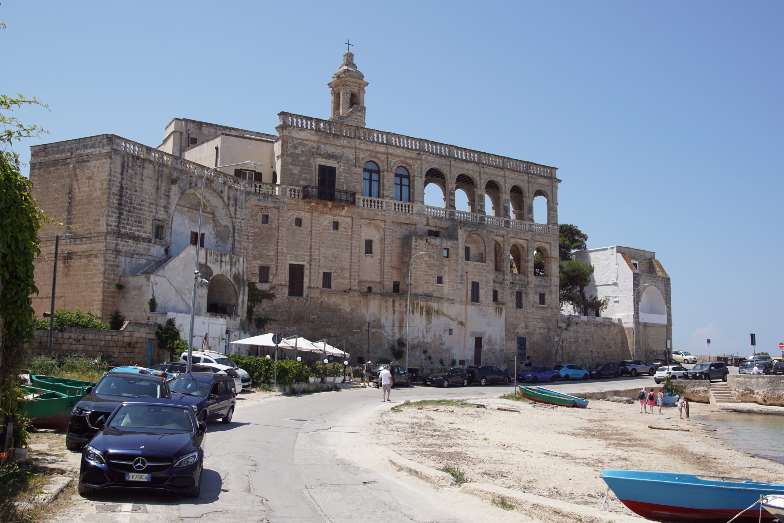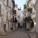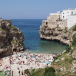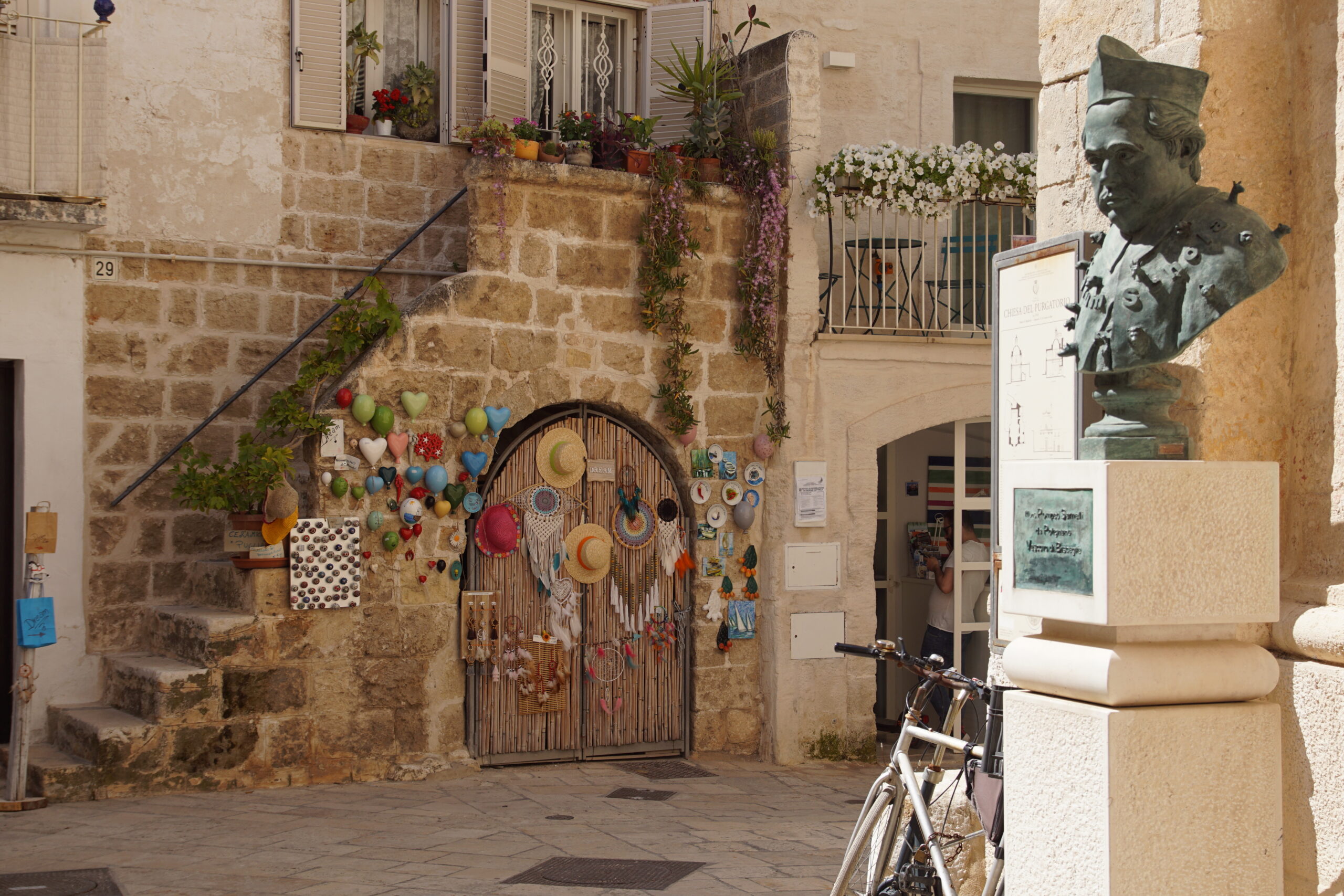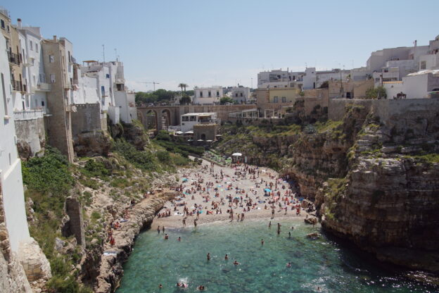 Encore 3km pour Polignano a Mare, un endroit réputé mais envahi, et où se garer vers 14h30 n’est pas facile. Juste en entrée de ville nous avons vu de loin la statue de Domenico Modugno (auteur/chanteur de « Volare »), puis le pont Romain et la plage de Lama Monachile et ses habitations en haut des falaises (photo ci-dessus). Tout à côté, le centre historique est bien sympathique à visiter… et propre !