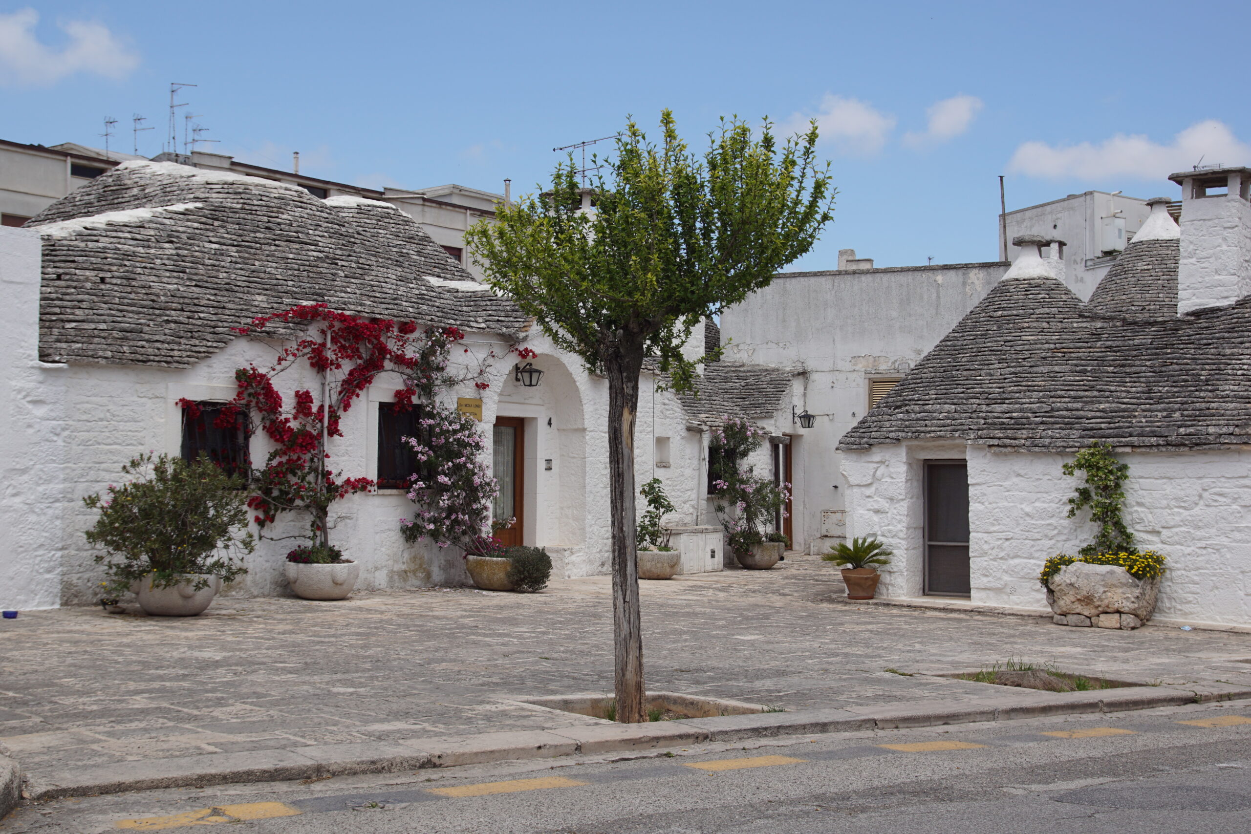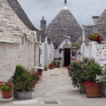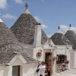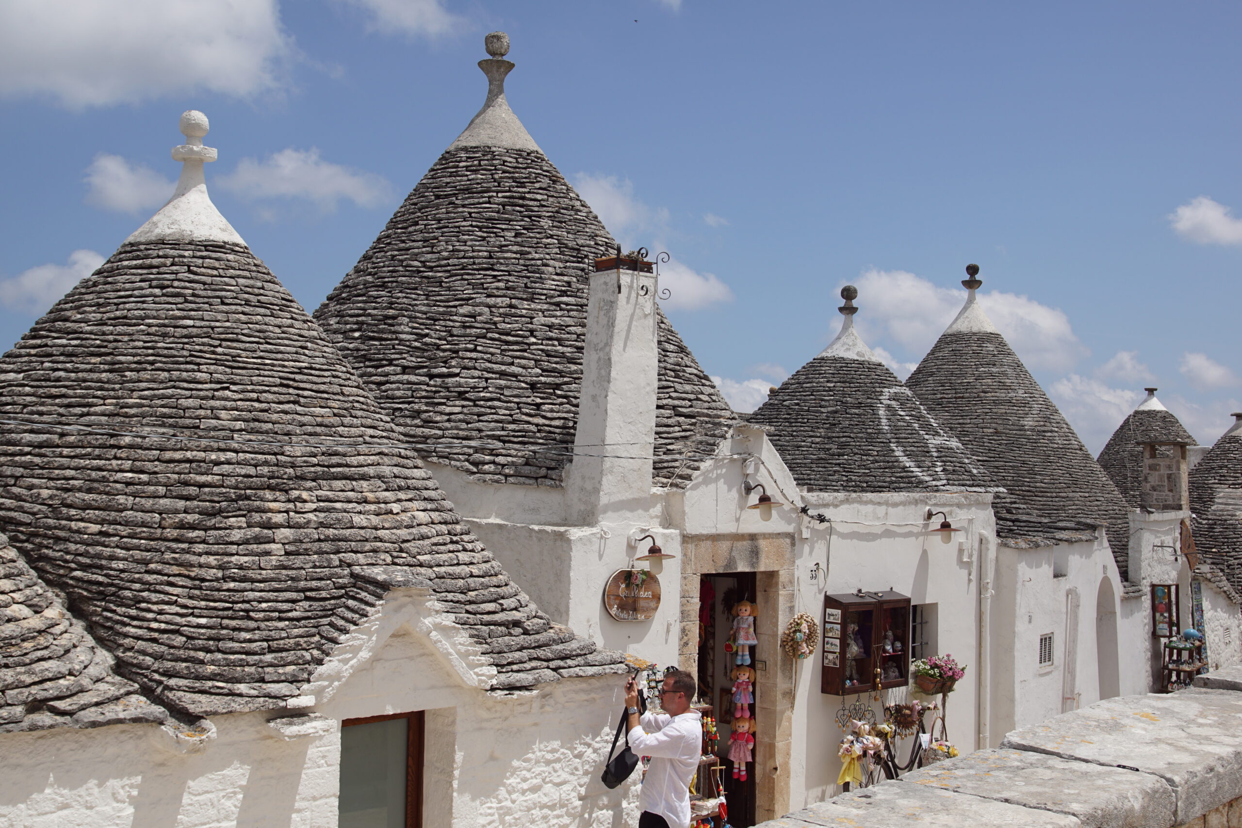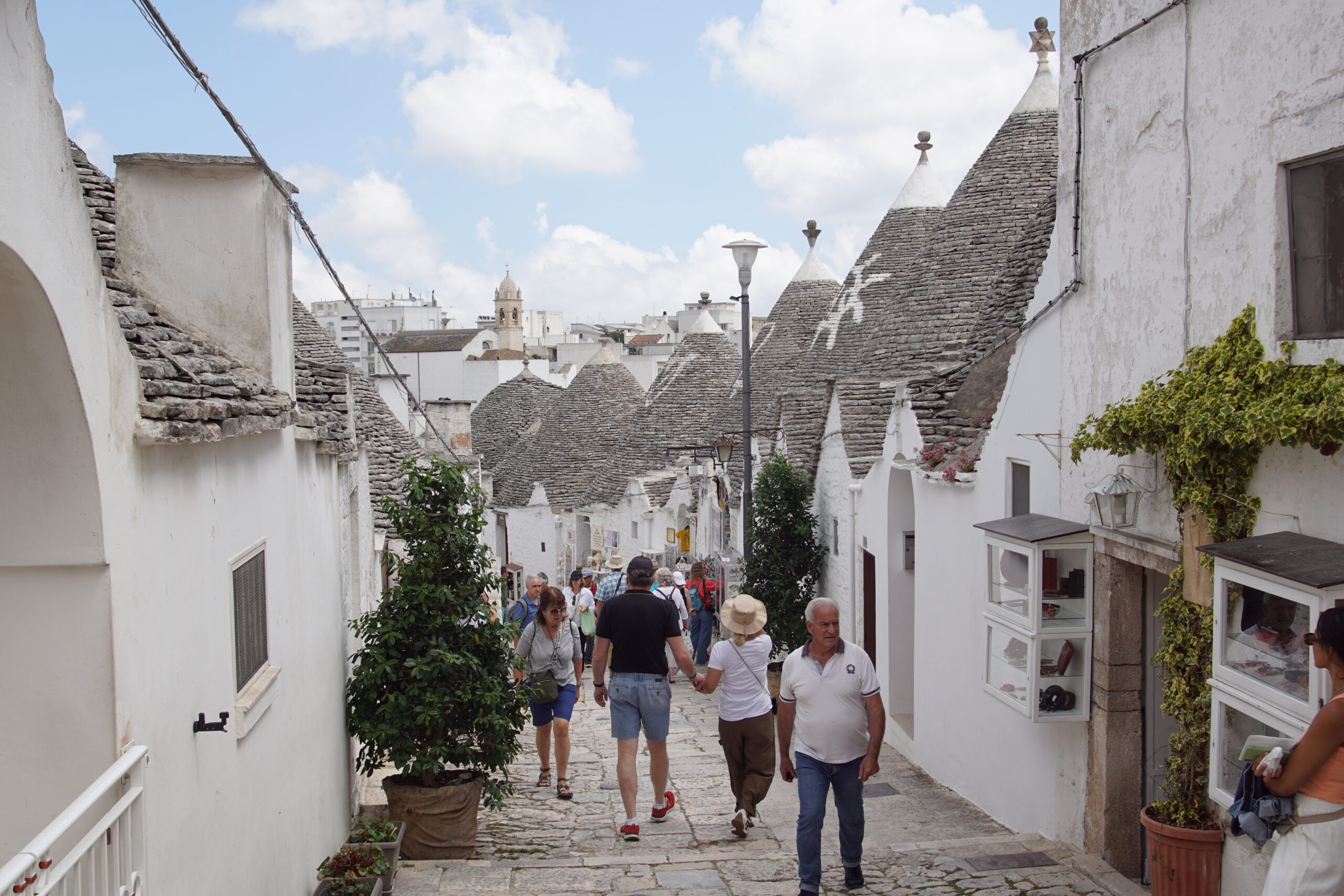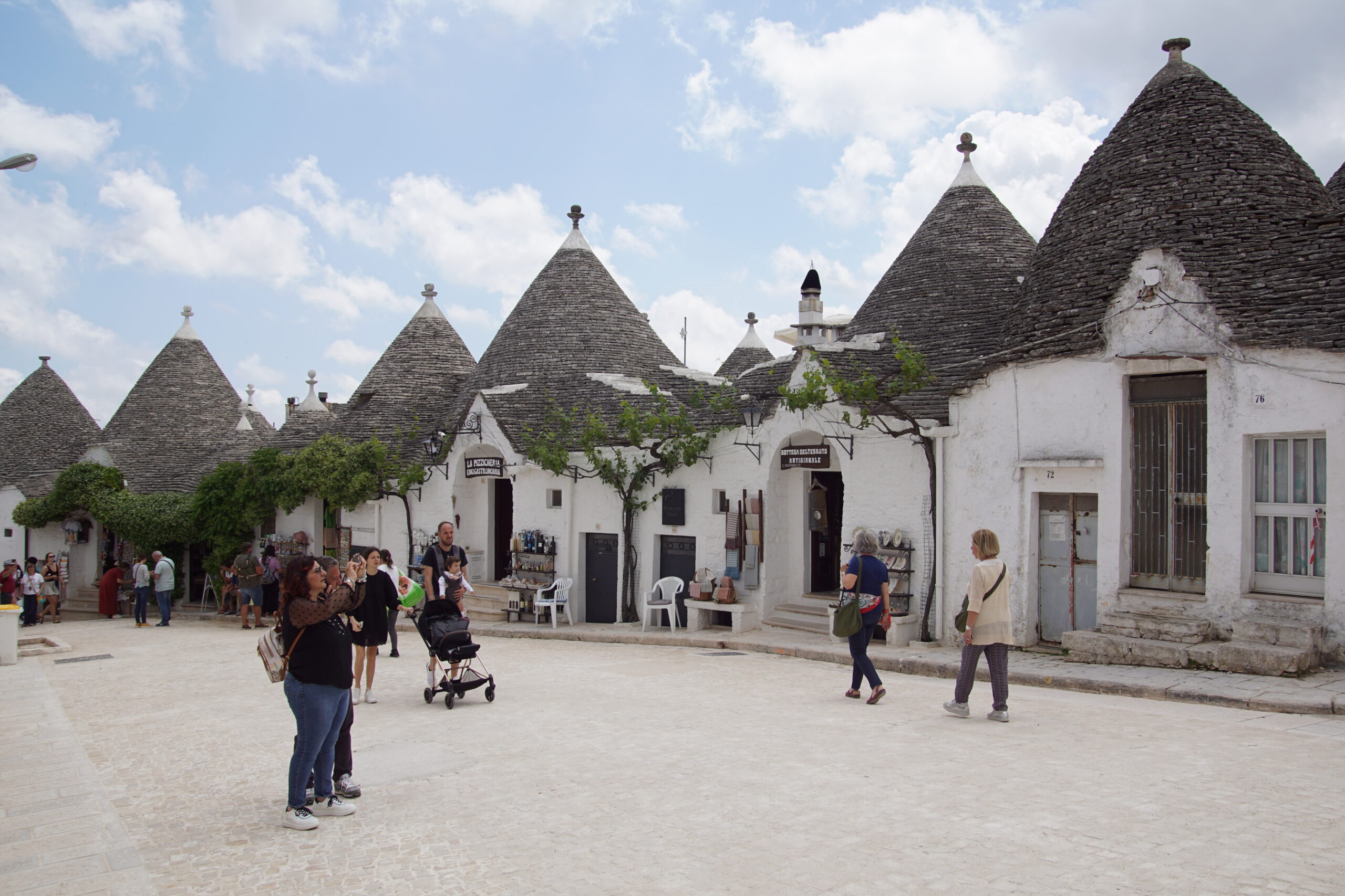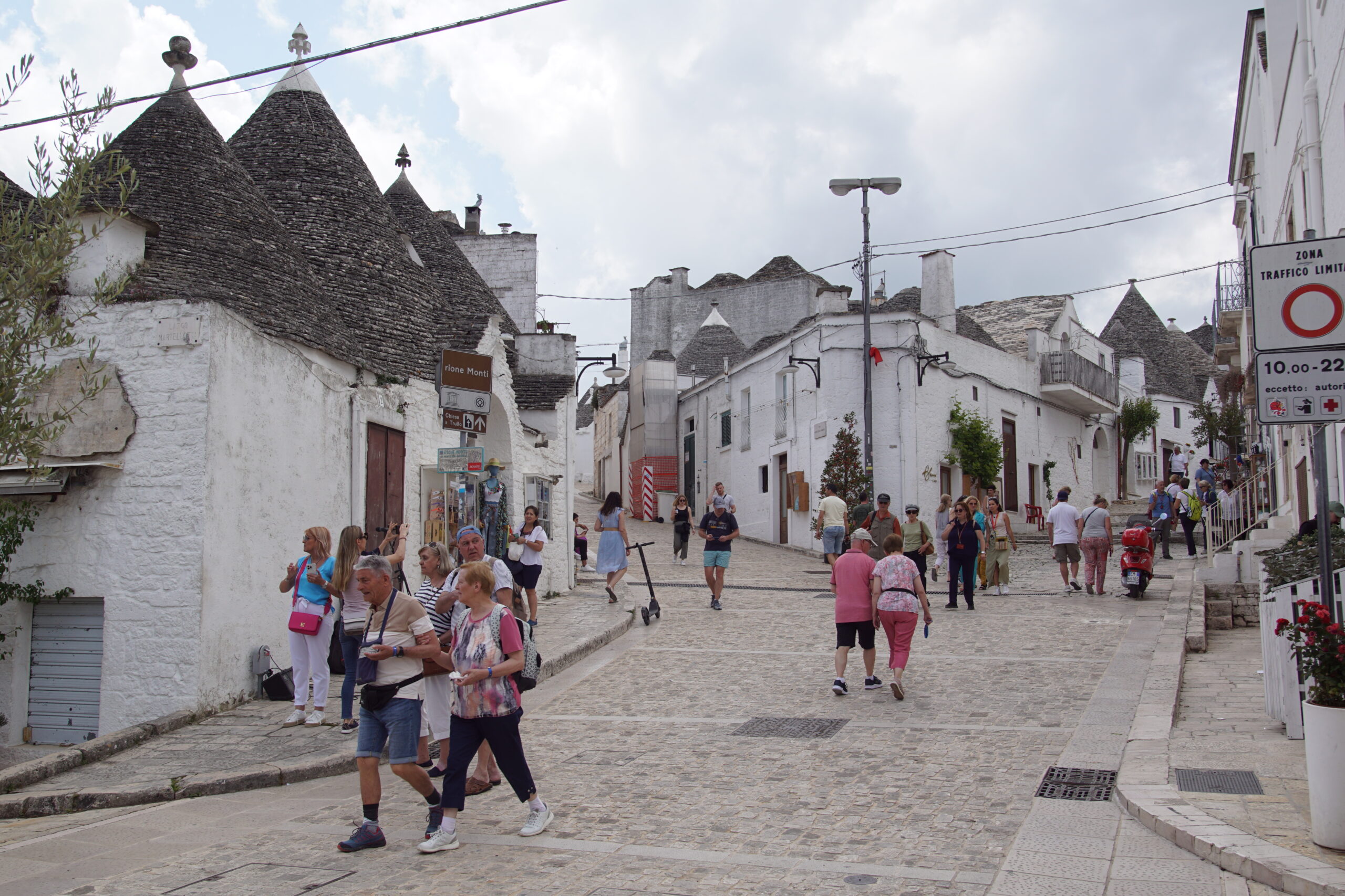 Départ tranquille vers 10h15 pour 61km/1h15 de route pour arriver dans l’un des nombreux parkings (6€) de Alberobello (photo ci-dessus), capitale « commerciale » des Trulli ! C’est ici que leur concentration est la plus importante. La 1ère butte au Sud (Rione Monti) où vous arrivez en premier en comporte 1000 reconvertis en boutique ou BandB. La seconde butte en face au nord (dit Rione Aia Piccola, où se situe la Basilique dei Santi Medici et l’unique trullo Sovrano avec 1 étage, tout en haut) en comporte 400. Cette dernière zone est plus authentique et calme (!). Nous repartons de cette petite ville incontournable des Pouilles, après y avoir pique-niqué. Illustré par les 18 premières photos en galerie.
