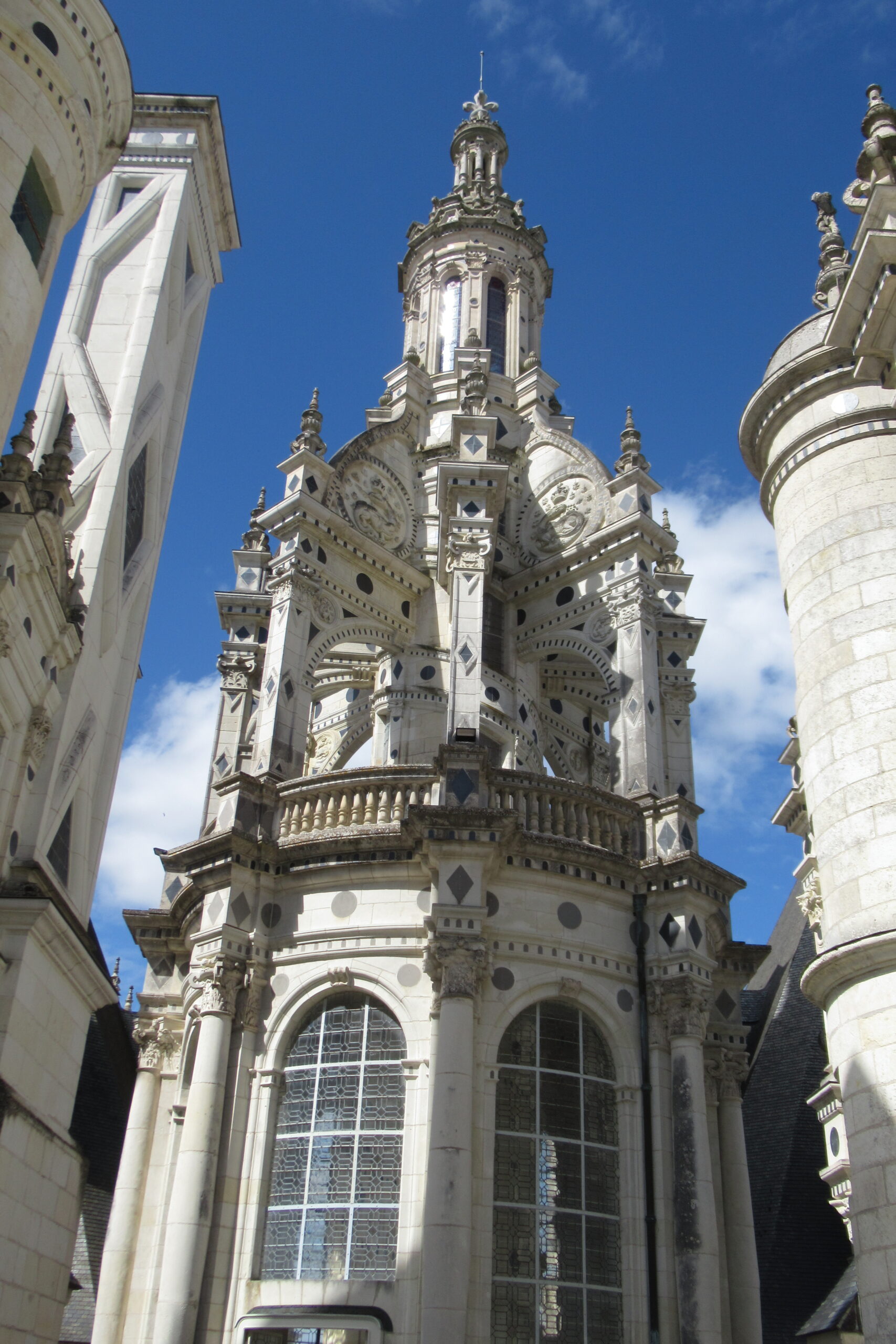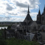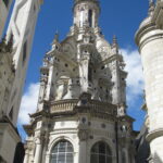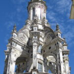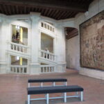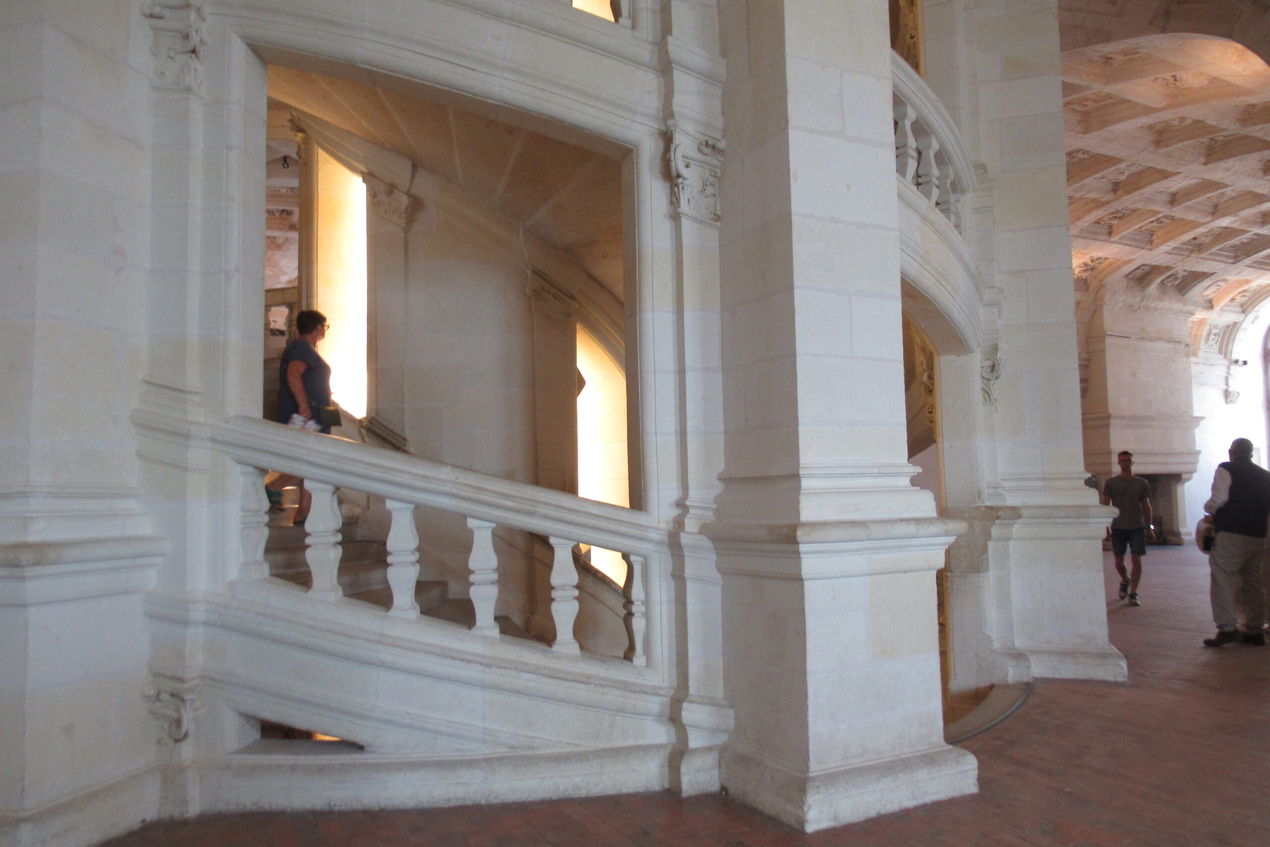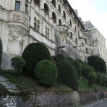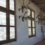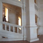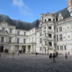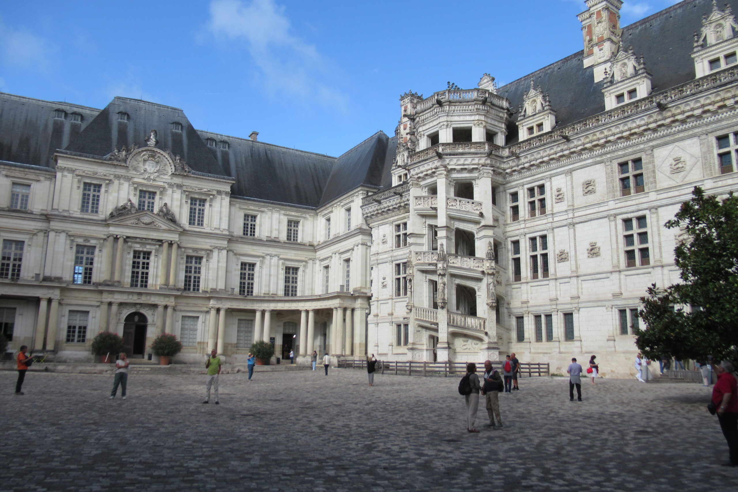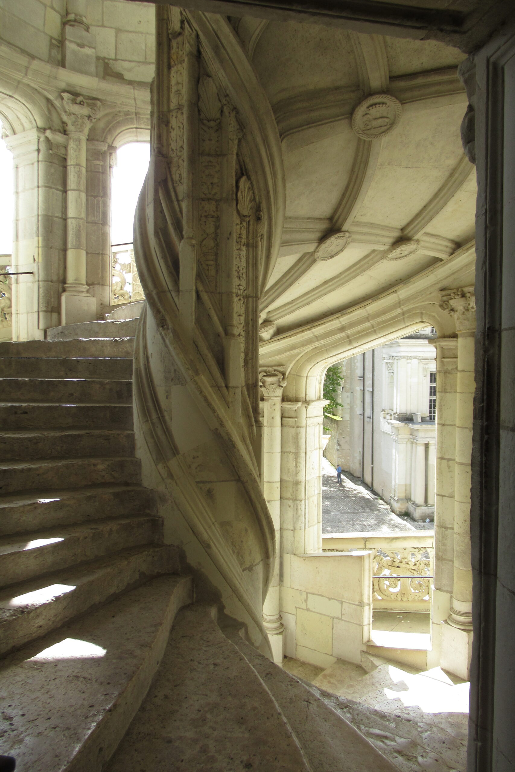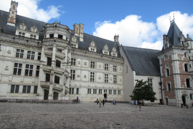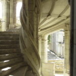 - D’abord suivre la D952 longeant la Loire sur 36km/40mn pour arriver au parking souterrain (1h gratuite +3,4€) du Château royal de Blois, on ne peut pas le rater. Malgré sa taille il semble étouffé par la ville jusqu’au pied des remparts. Dans la cour on remarquera, à droite, son escalier typique (à simple révolution photo ci-dessus). C’est ici que le Roi Henri III a fait assassiner le Duc de Guise, mais on y retrouve aussi l’emblème de François 1er, la Salamandre.