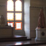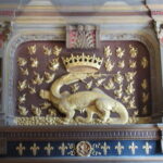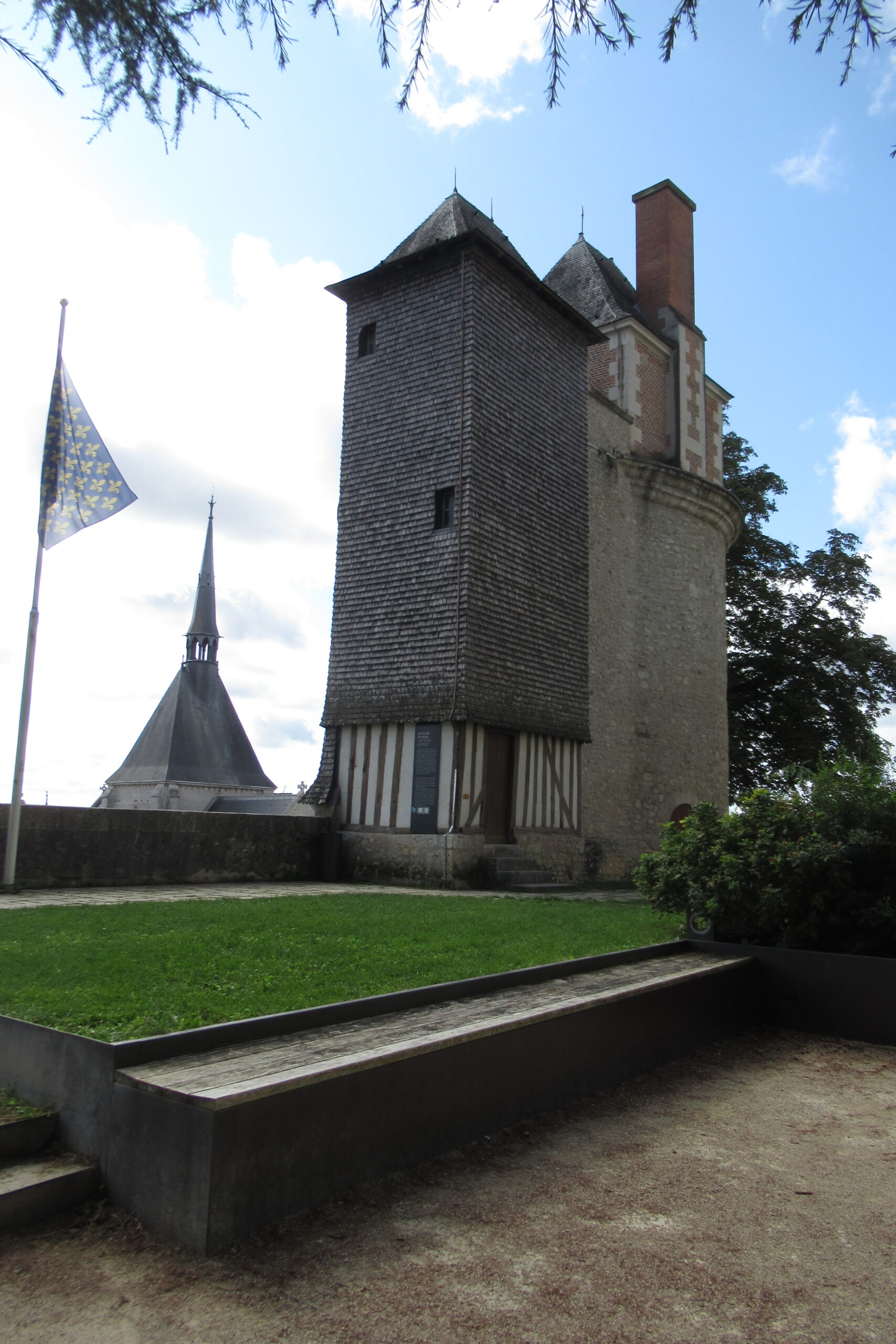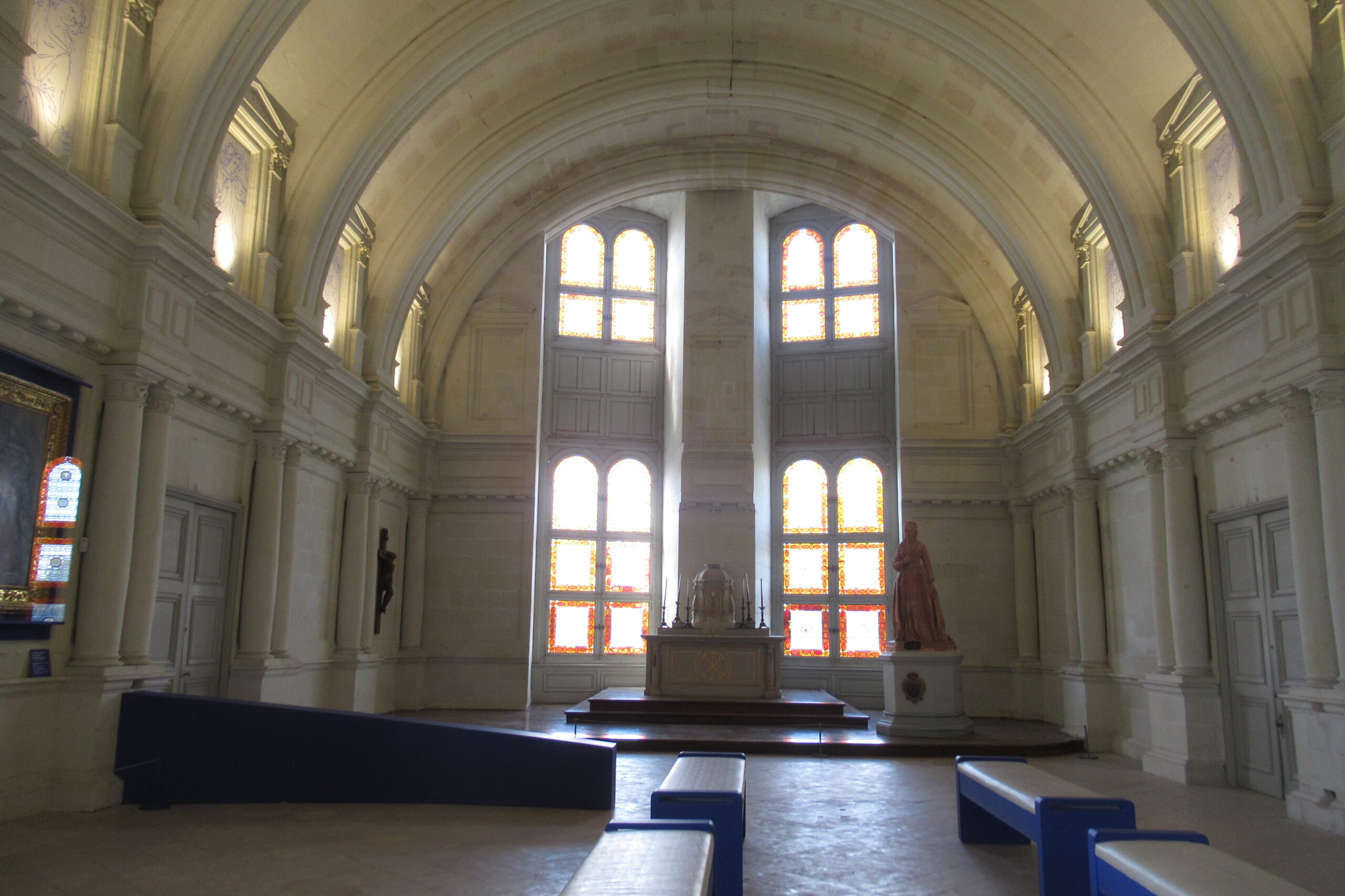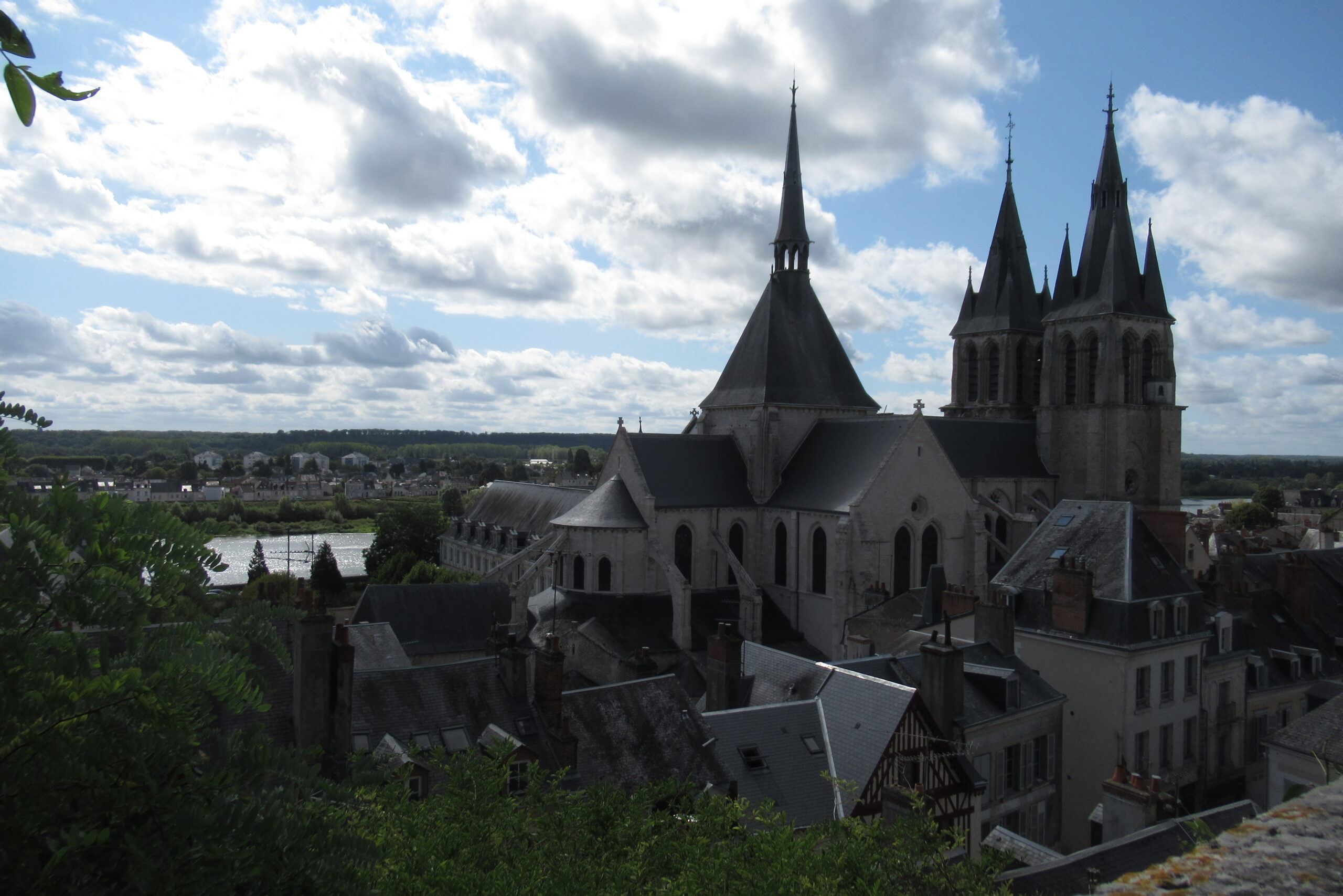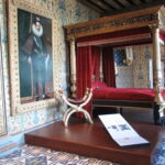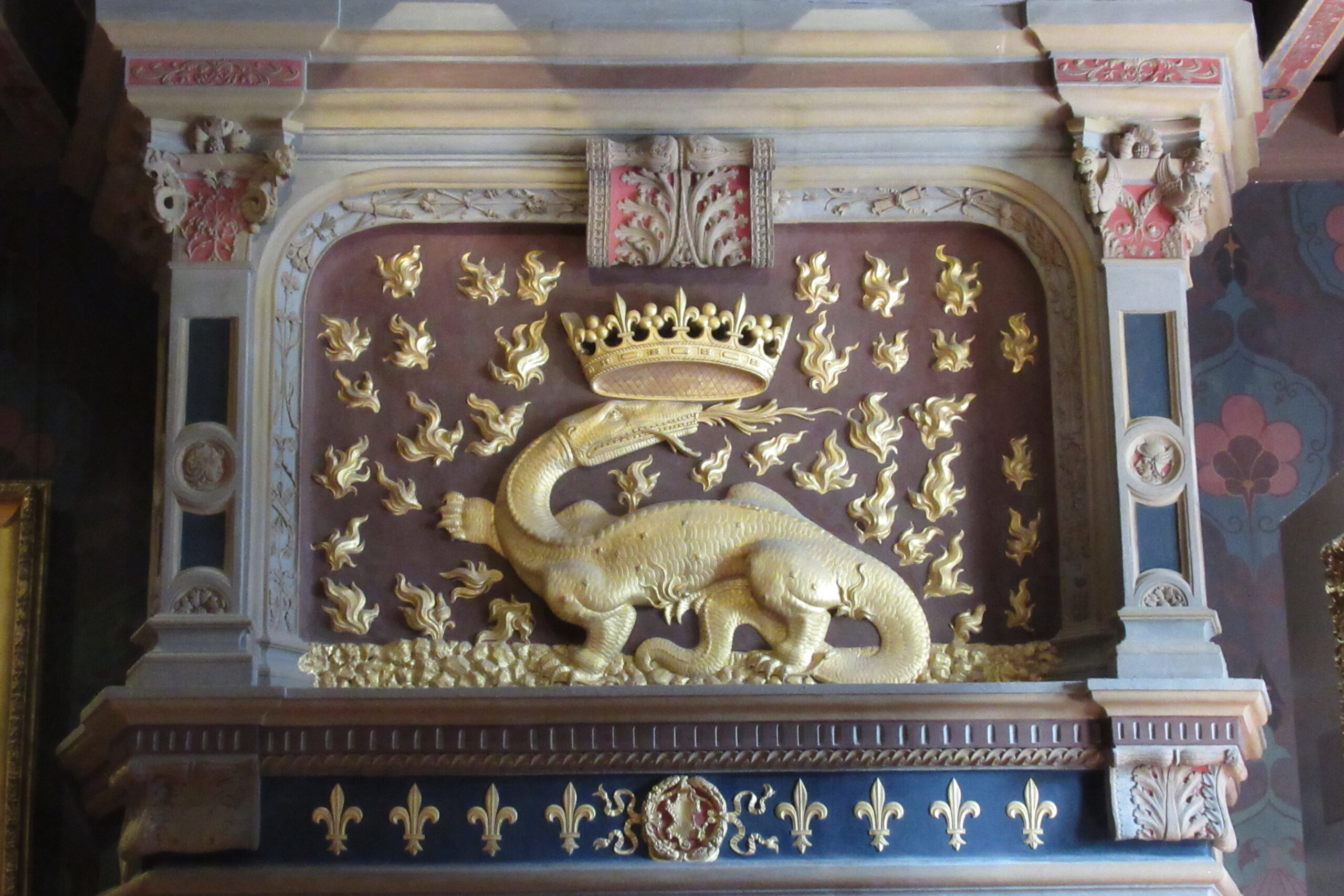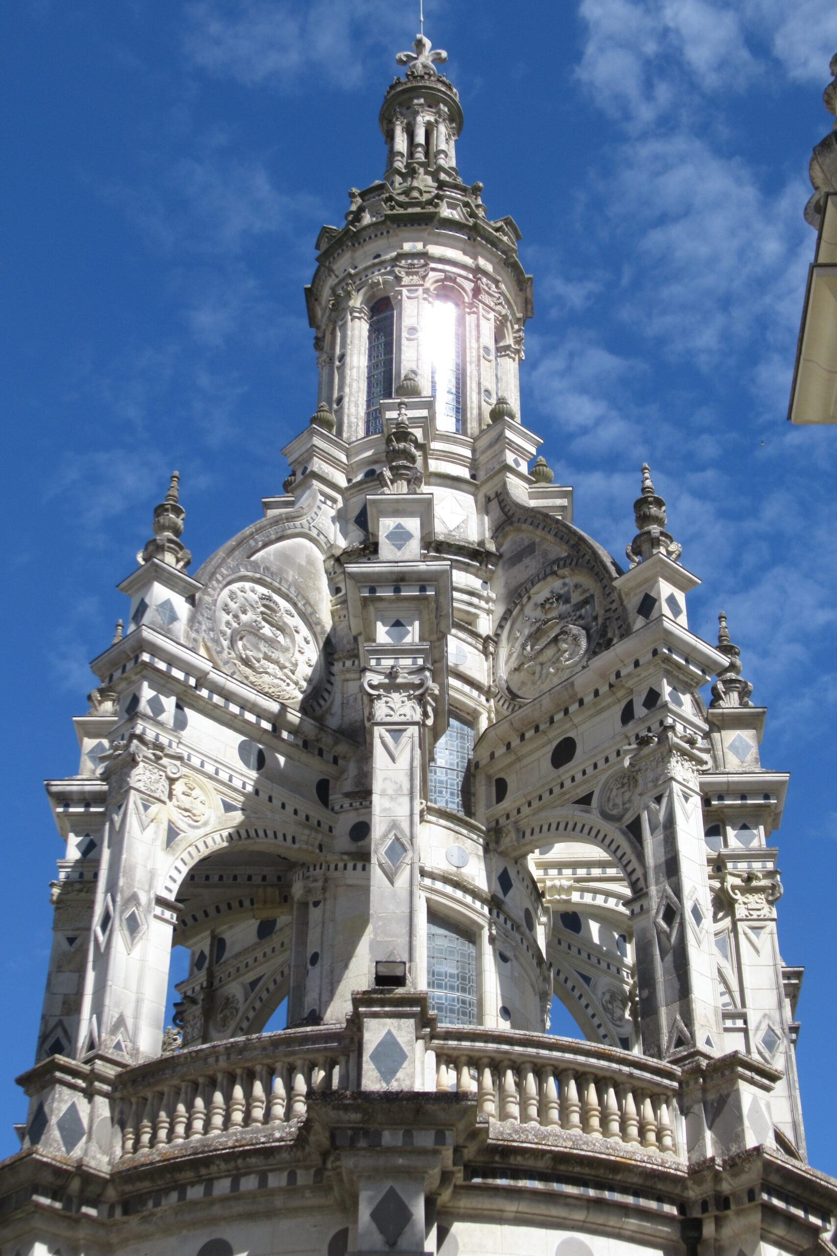 - D’abord suivre la D952 longeant la Loire sur 36km/40mn pour arriver au parking souterrain (1h gratuite +3,4€) du Château royal de Blois, on ne peut pas le rater. Malgré sa taille il semble étouffé par la ville jusqu’au pied des remparts. Dans la cour on remarquera, à droite, son escalier typique (à simple révolution photo ci-dessus). C’est ici que le Roi Henri III a fait assassiner le Duc de Guise, mais on y retrouve aussi l’emblème de François 1er, la Salamandre.