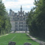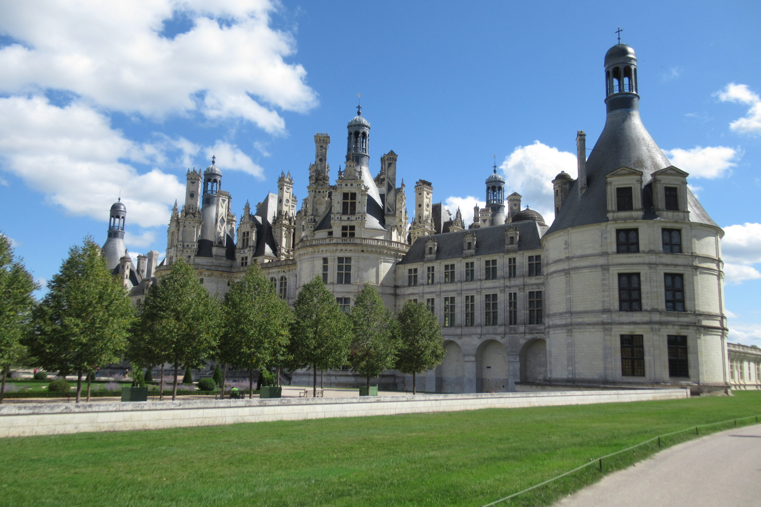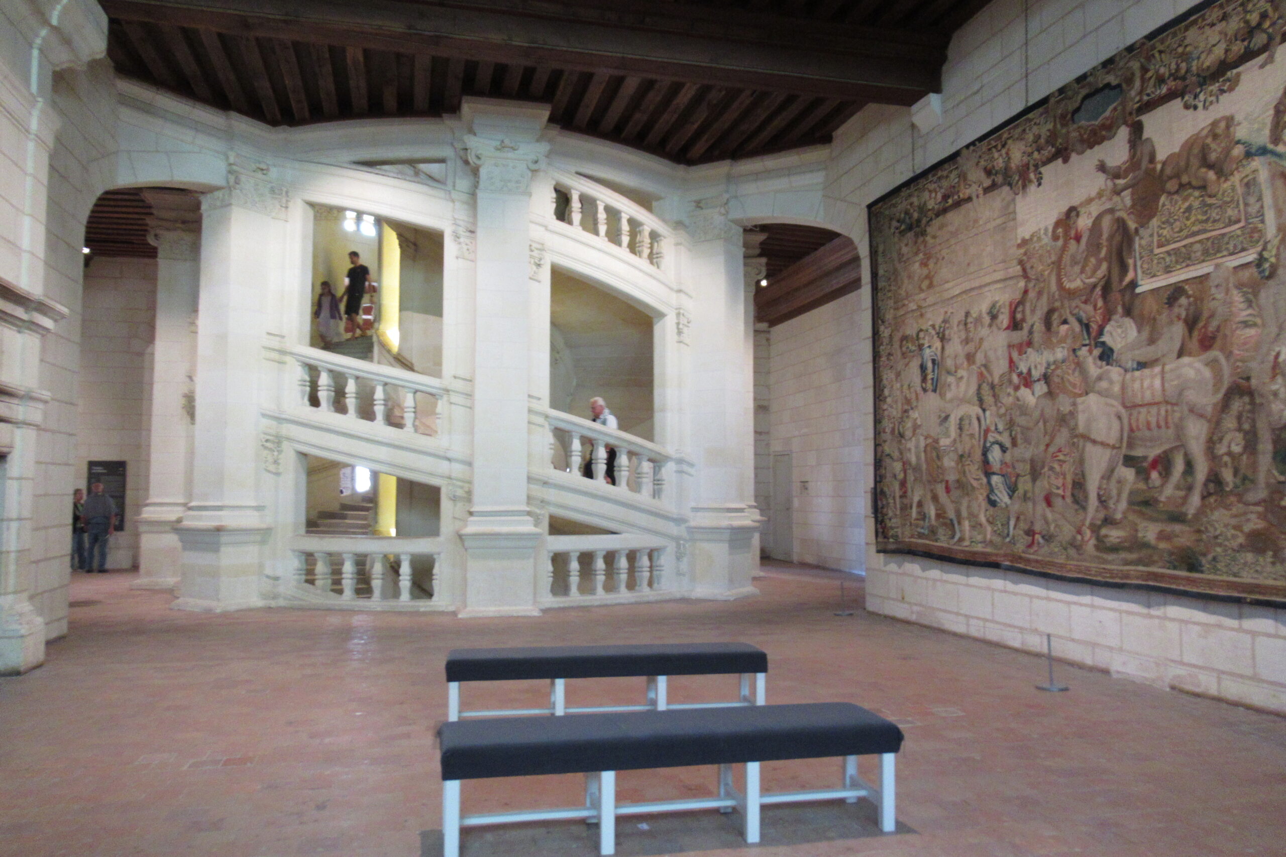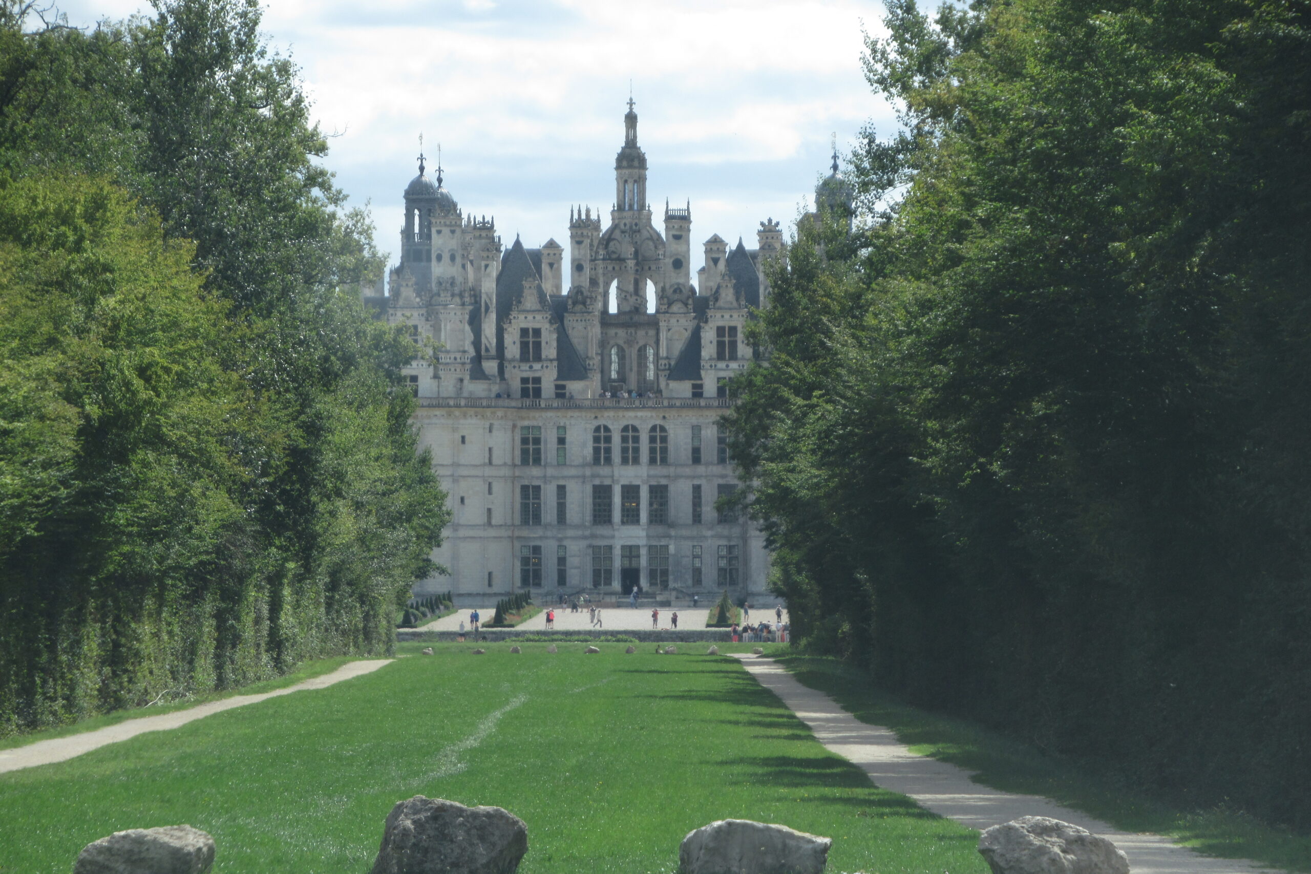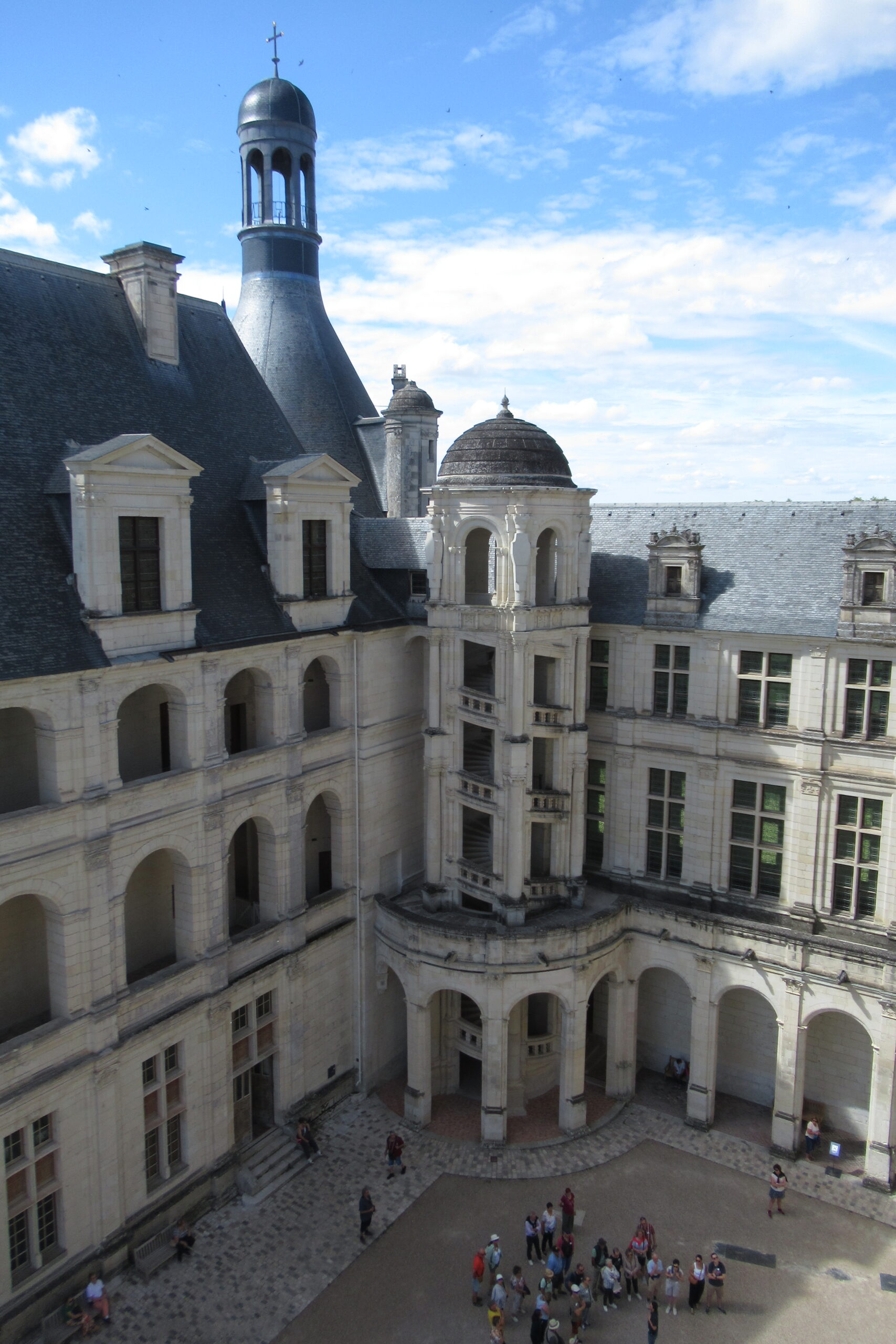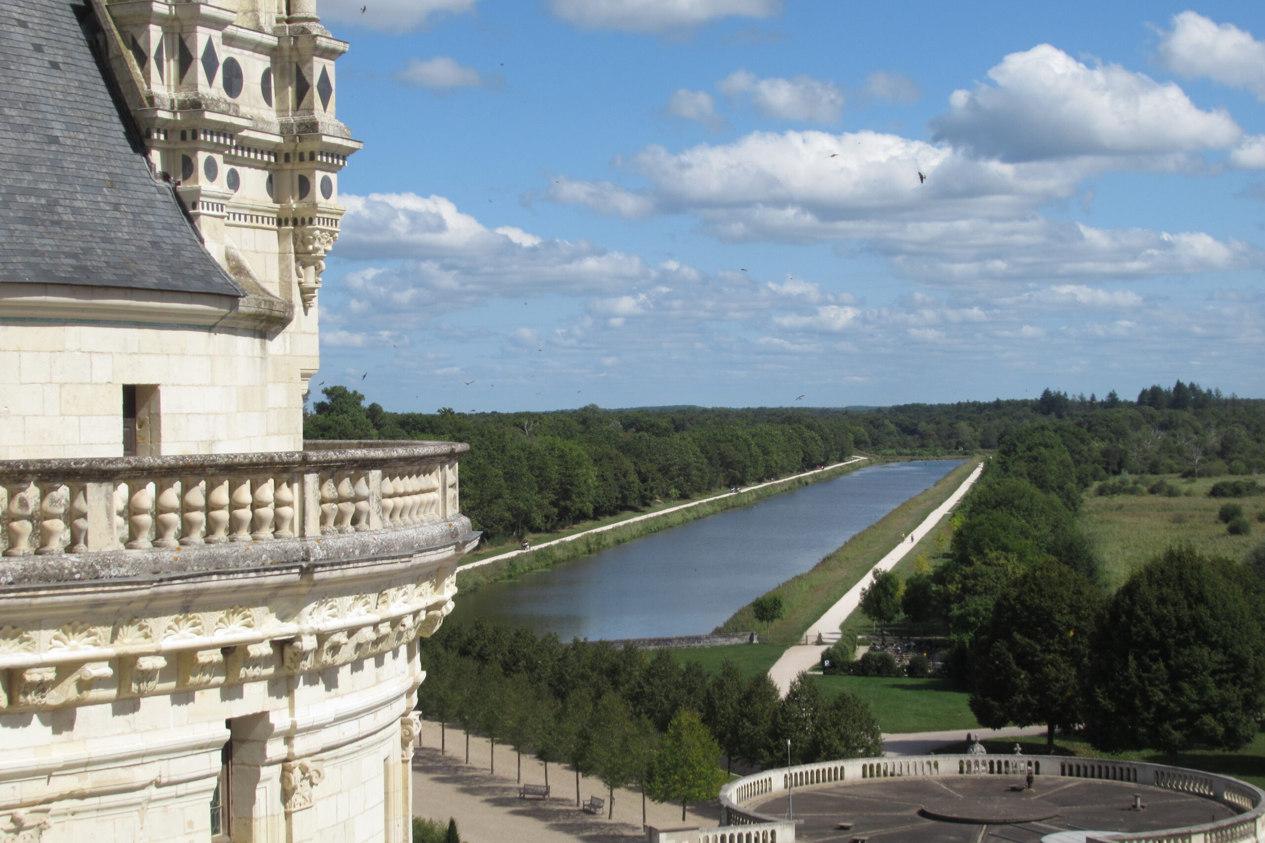 - Puis 12km/15mn de roulage pour apercevoir « au milieu des bois » la vedette de la région : le Château de Chambord, puis le parking (6€). Magnifique et imposant, il est encore plus beau qu’à la télé… son escalier à double révolution distribue les visiteurs vers les étages, tours et salles dont la symétrie est déroutante ! Il faut s’y perdre et entrer/sortir pour tout voir. Les vues depuis les terrasses sont top.