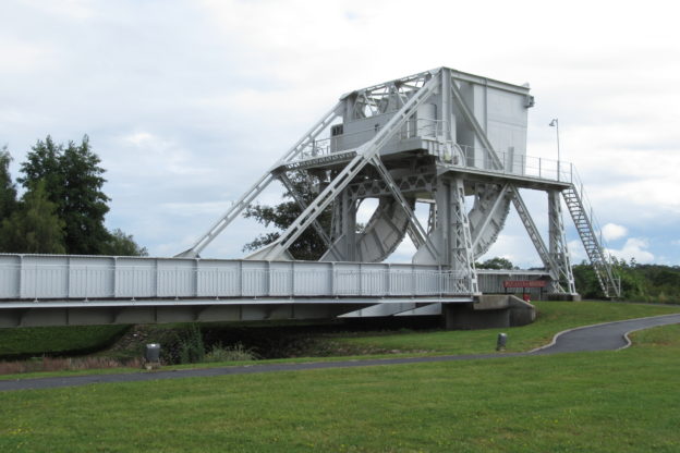 • Personnel sympa et compétent, qui nous emmène dehors (tiens il pleut !) et derrière, surprise, il y a un 2ème Pegasus Bridge !!! et celui là c’est le vrai, celui de 1944, car depuis, un ressemblant mais plus large et long est en service pour supporter l’important trafic.