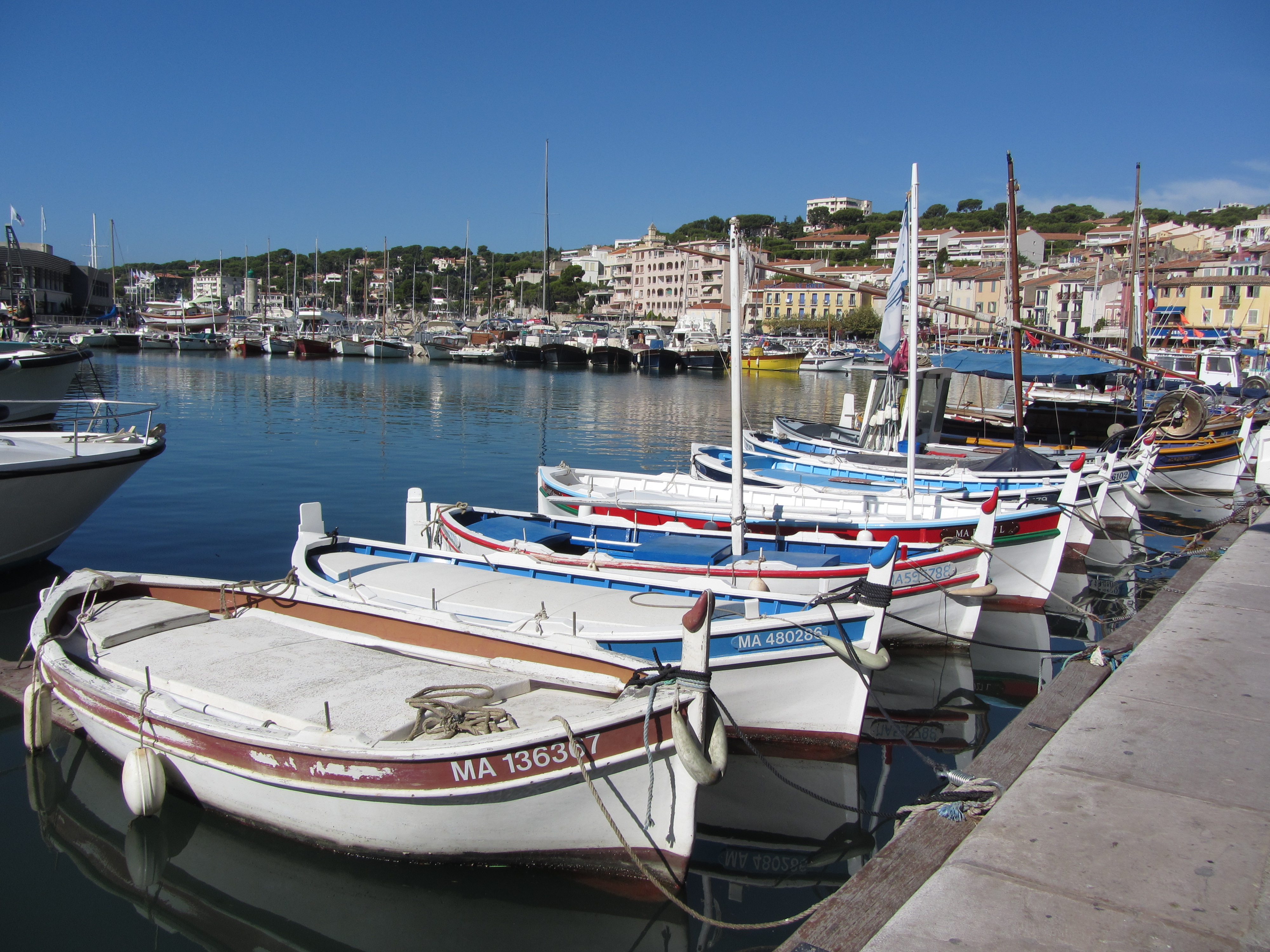 • Mercredi 10/09: descente (1km qu’il faudra remonter…) vers cette charmante petite ville, le marché, puis son port typique; c’est assez calme en ce début septembre. Il fait beau et le retour au gîte, pour le déjeuner, est agréable. Nous redescendons à 16h30 vers le port pour prendre le petit train touristique (40mn AR, 7€/pers. à éviter) qui nous emmène à la calanque de Port Miou. Balade en ville et dîner (peu recommandable) au Perroquet face au port (46€/3pers.).