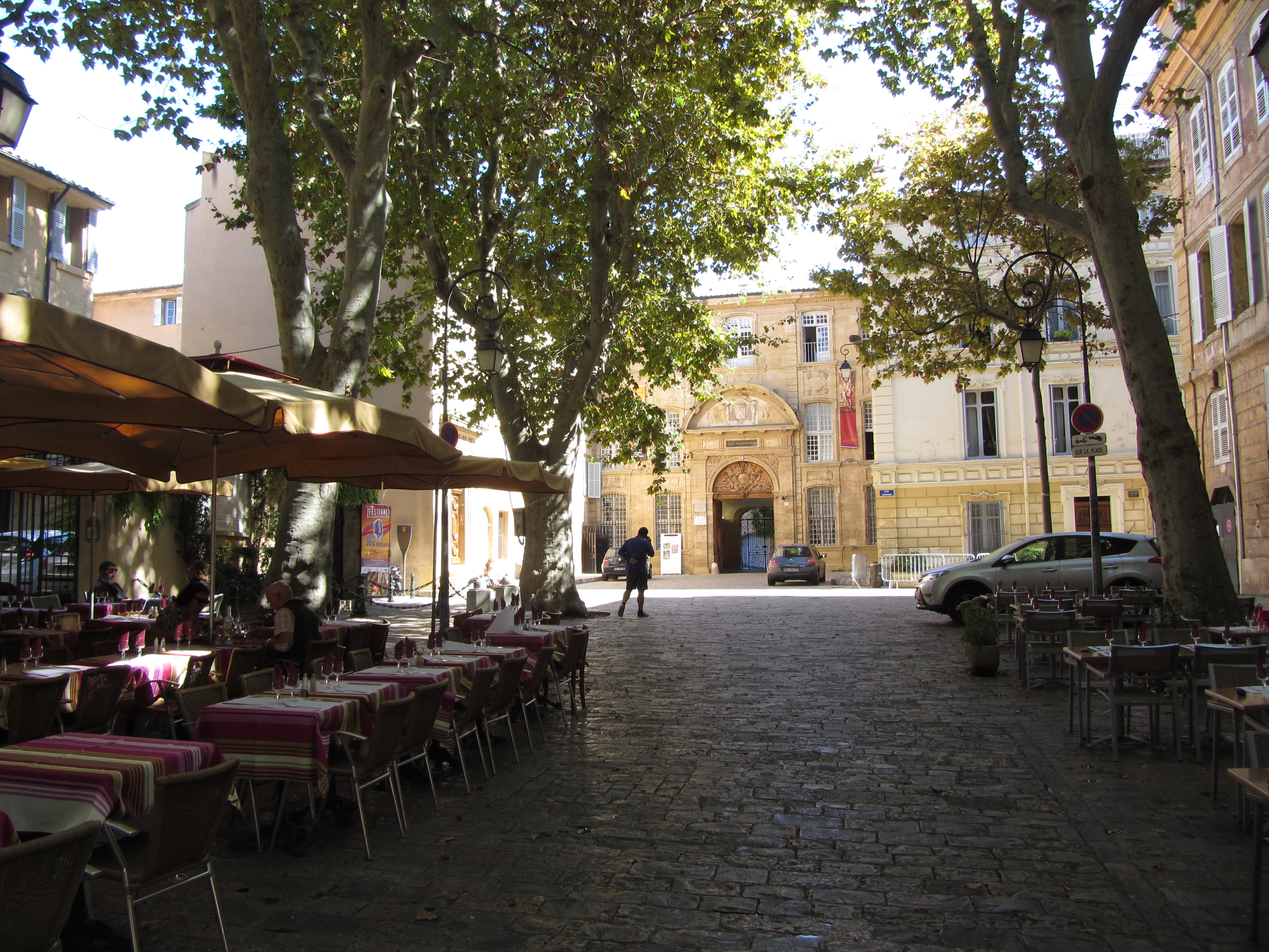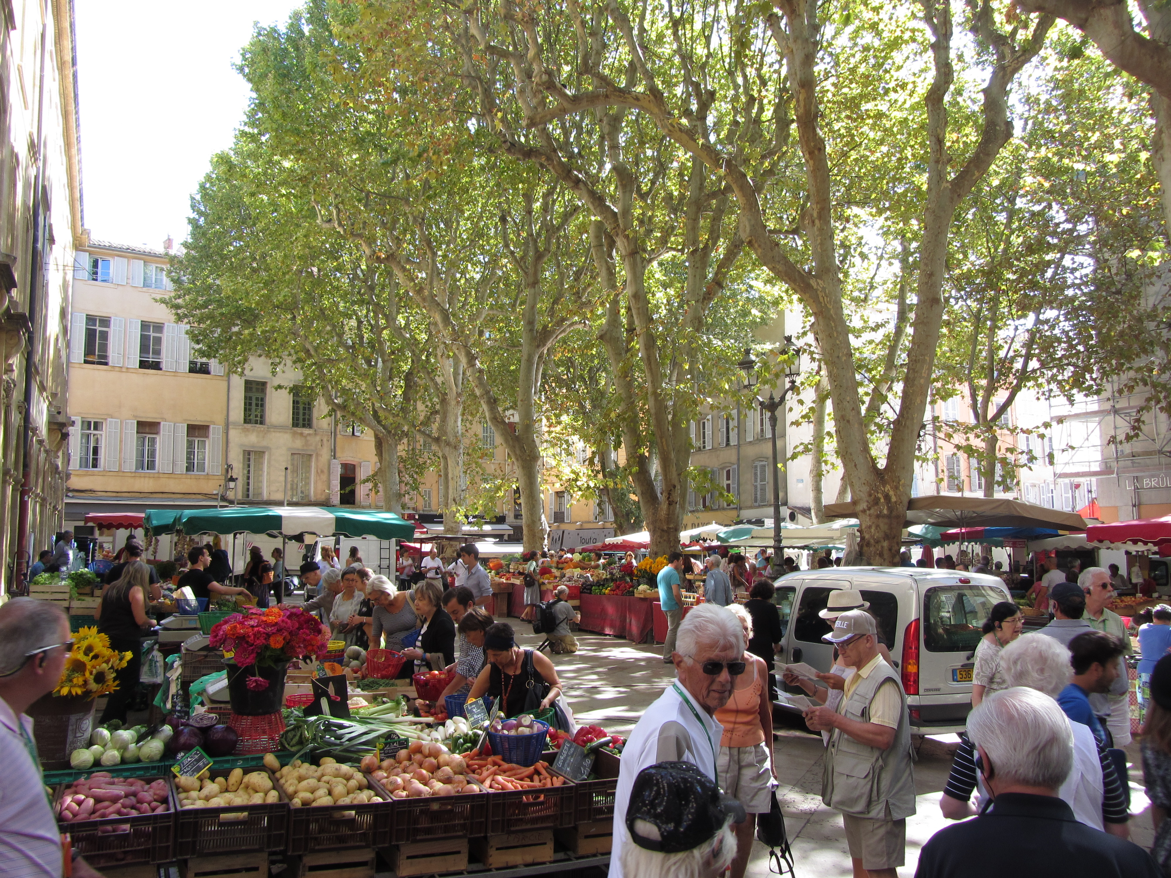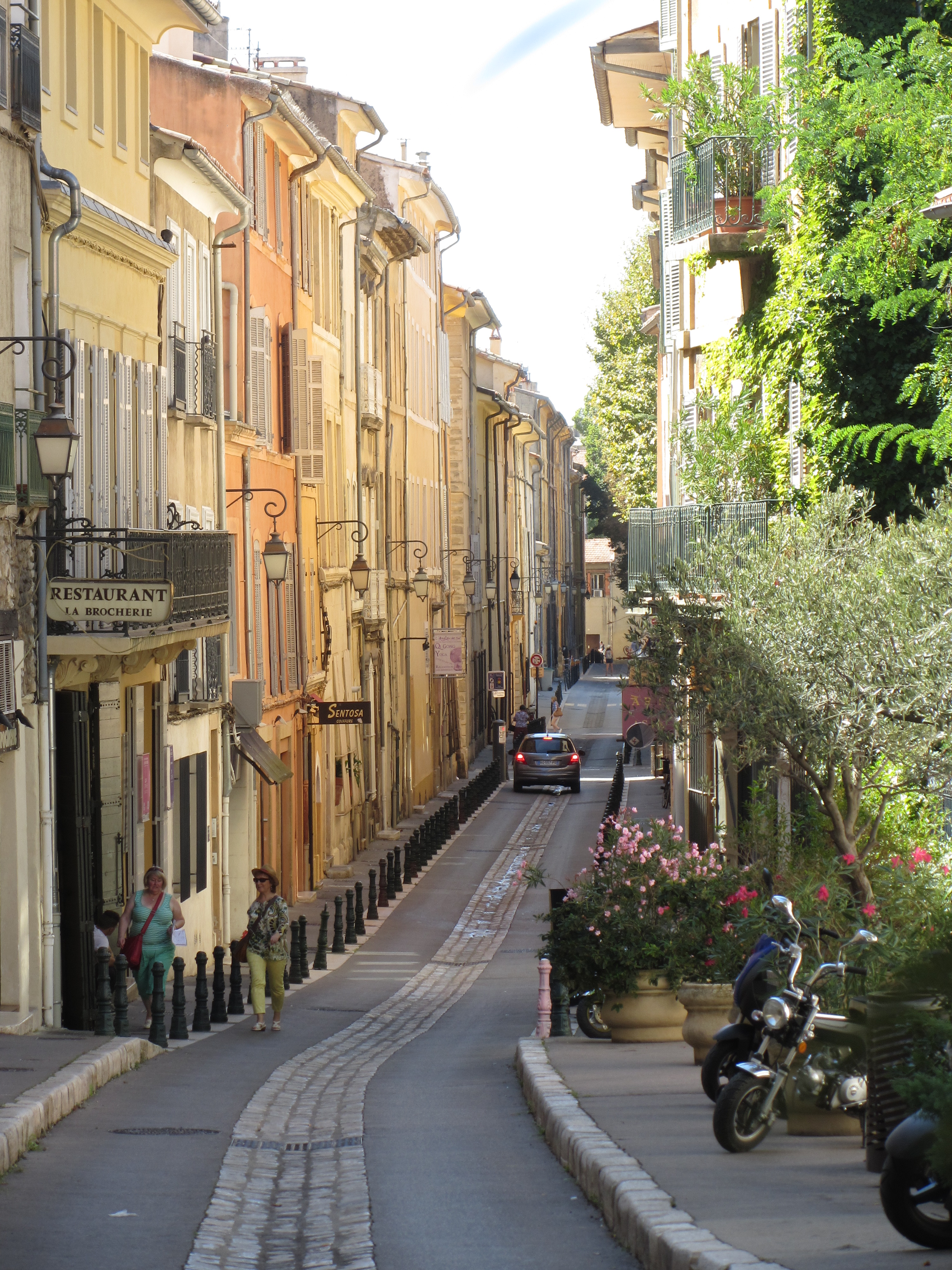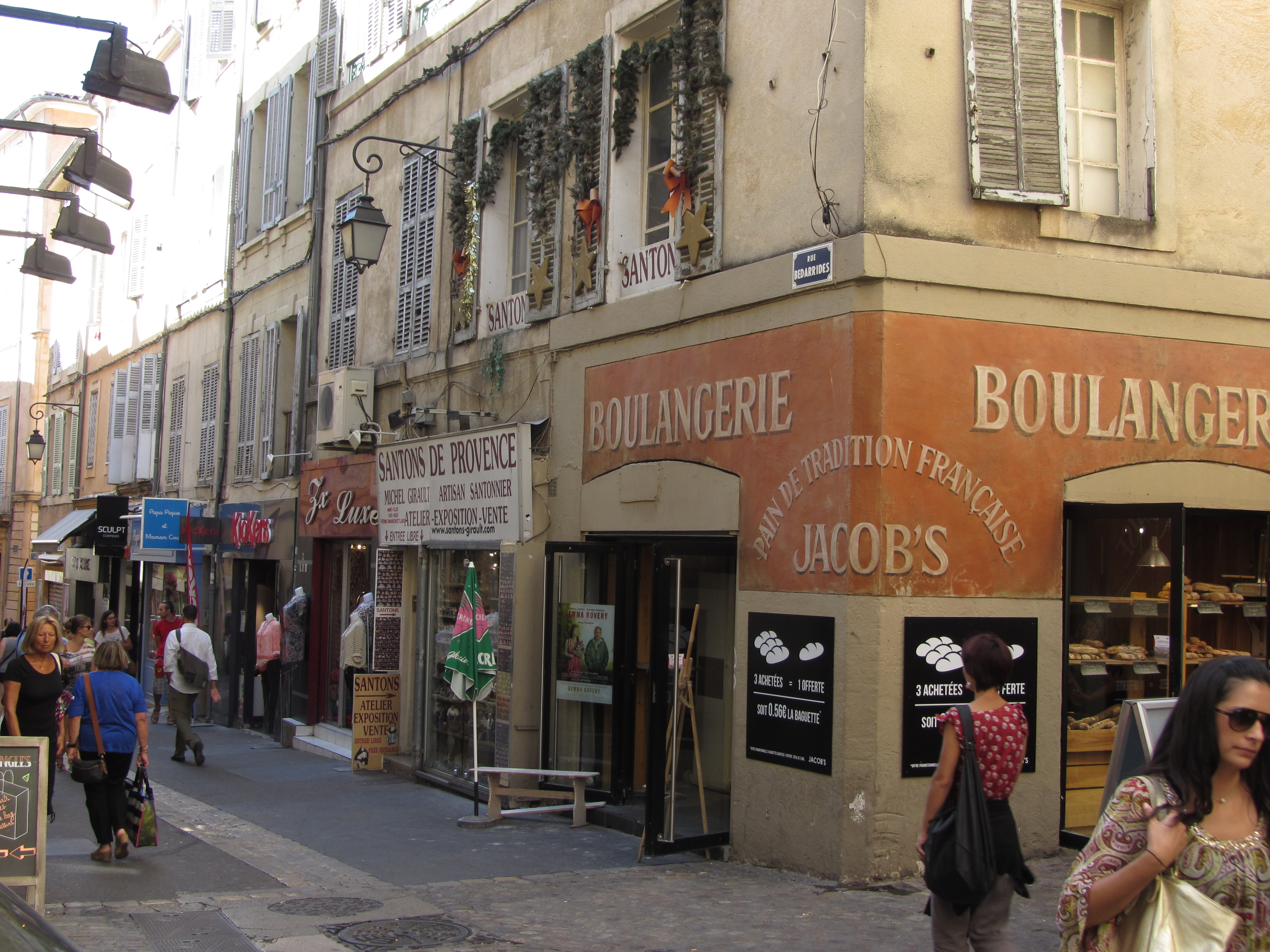 • Vendredi 12/09: Journée à Aix en Provence à 50km, où dès 10h30 nous entrons à l’office du tourisme (sympa, petite expo), près de la fontaine de la Rotonde. S’en suit, la remontée du cours Mirabeau avec ses autres fontaines et hôtels particuliers, puis l’hôtel de ville et les vieux quartiers (piétons…) où les calissons et vrais santons nous font craquer. Repas au Beffroi (53€/3pers. très moyen…). Pour finir par la cathédrale et le cloître St Sauveur (magnifiques). Très belle journée dans cette ville animée et accueillante.