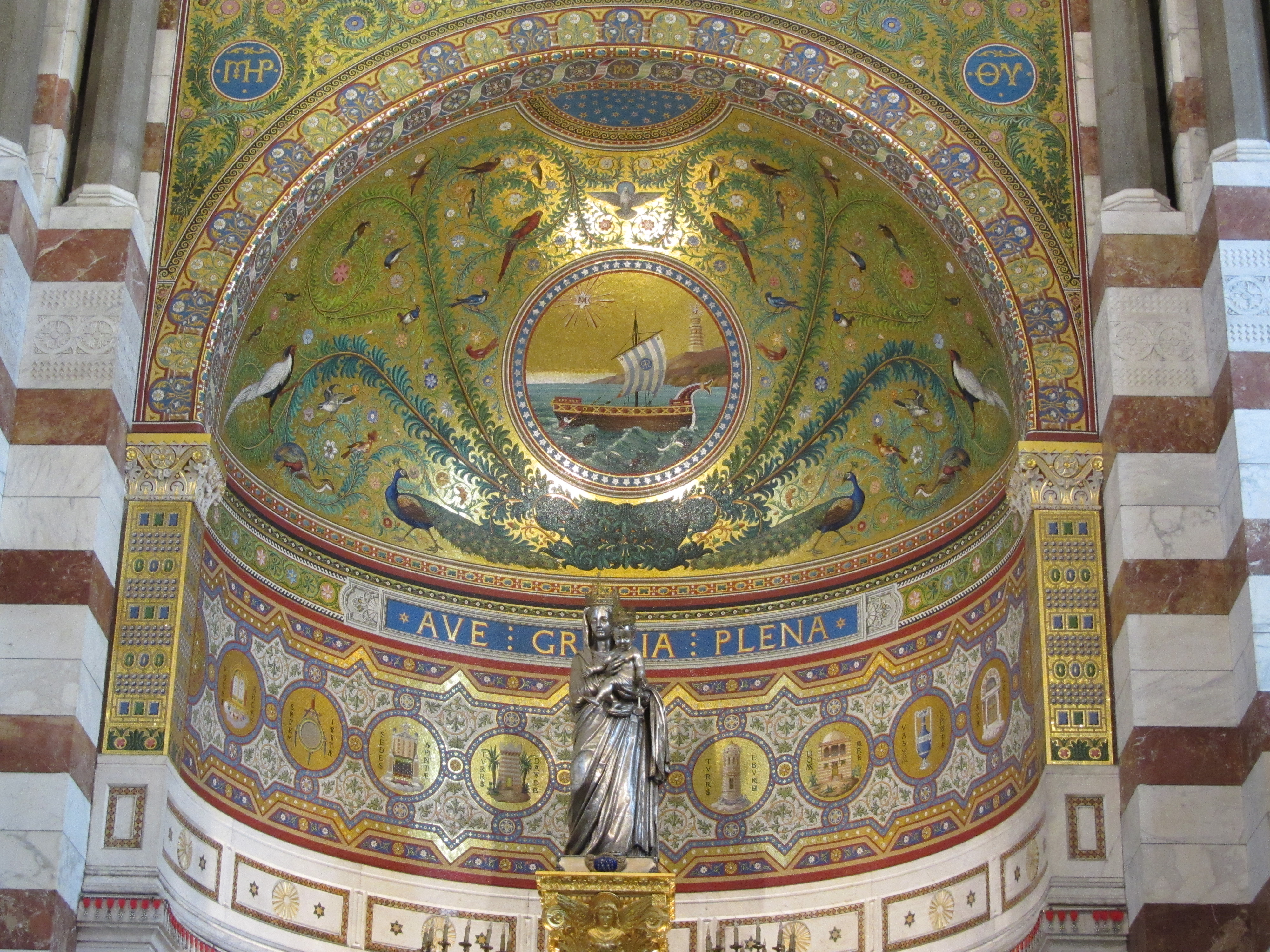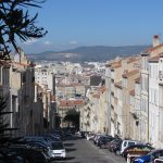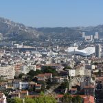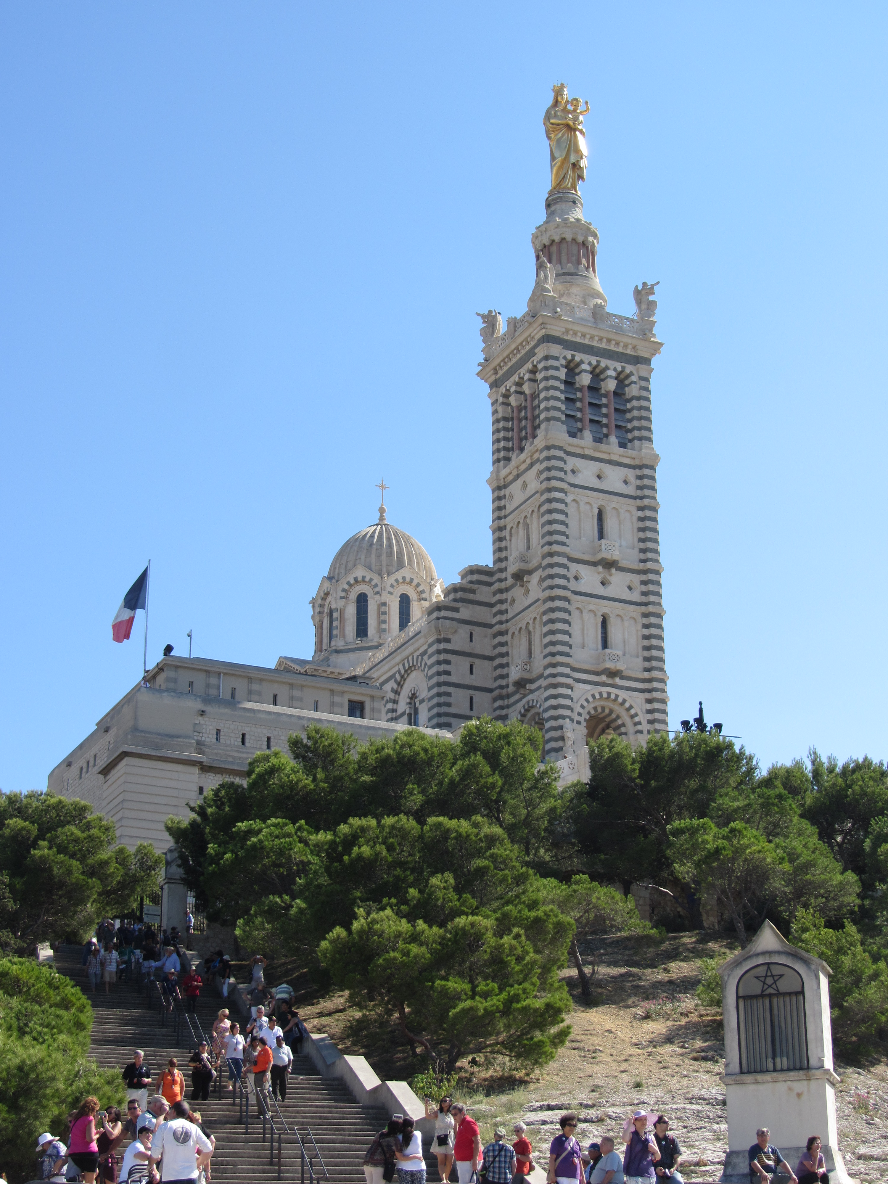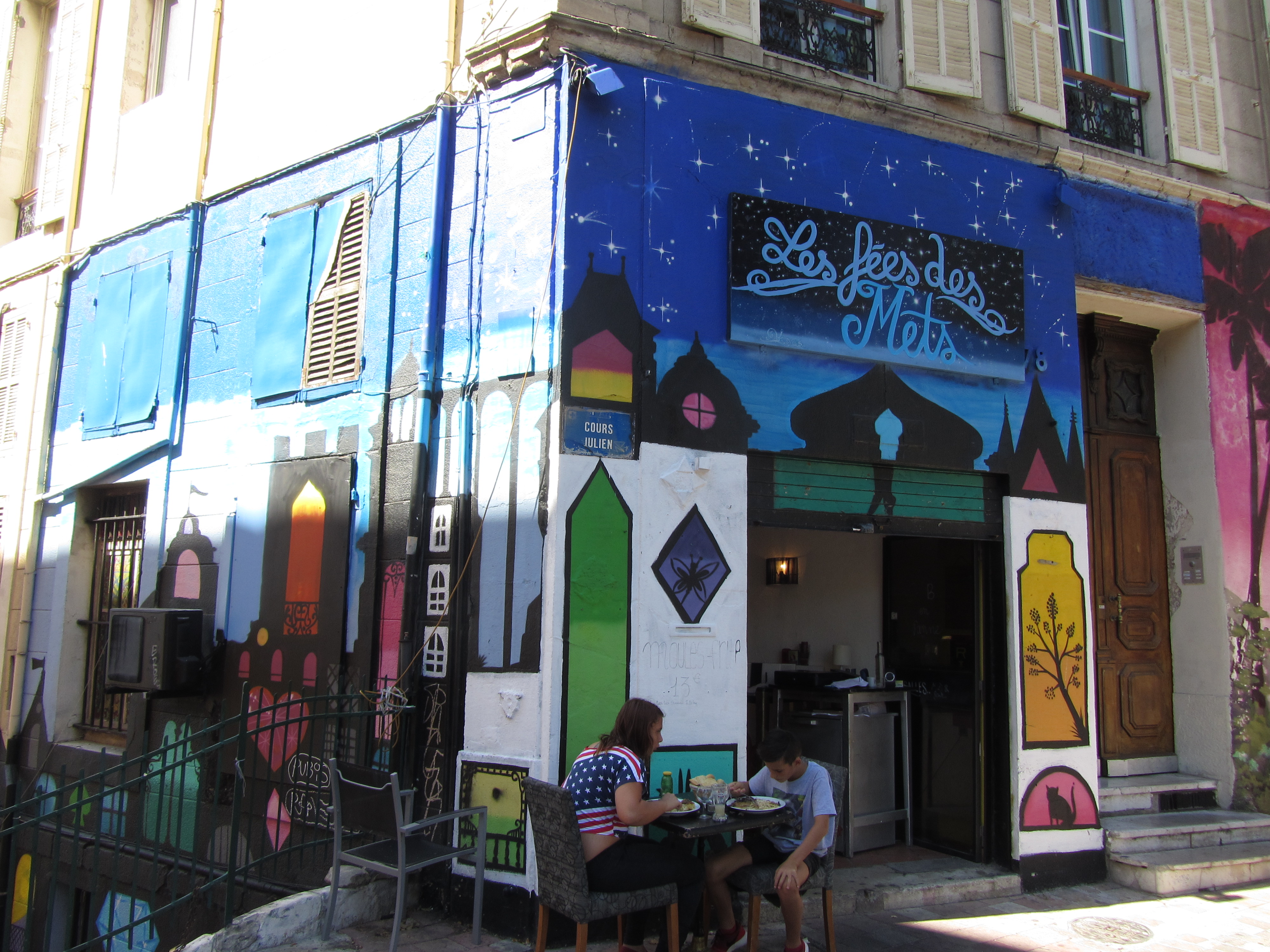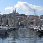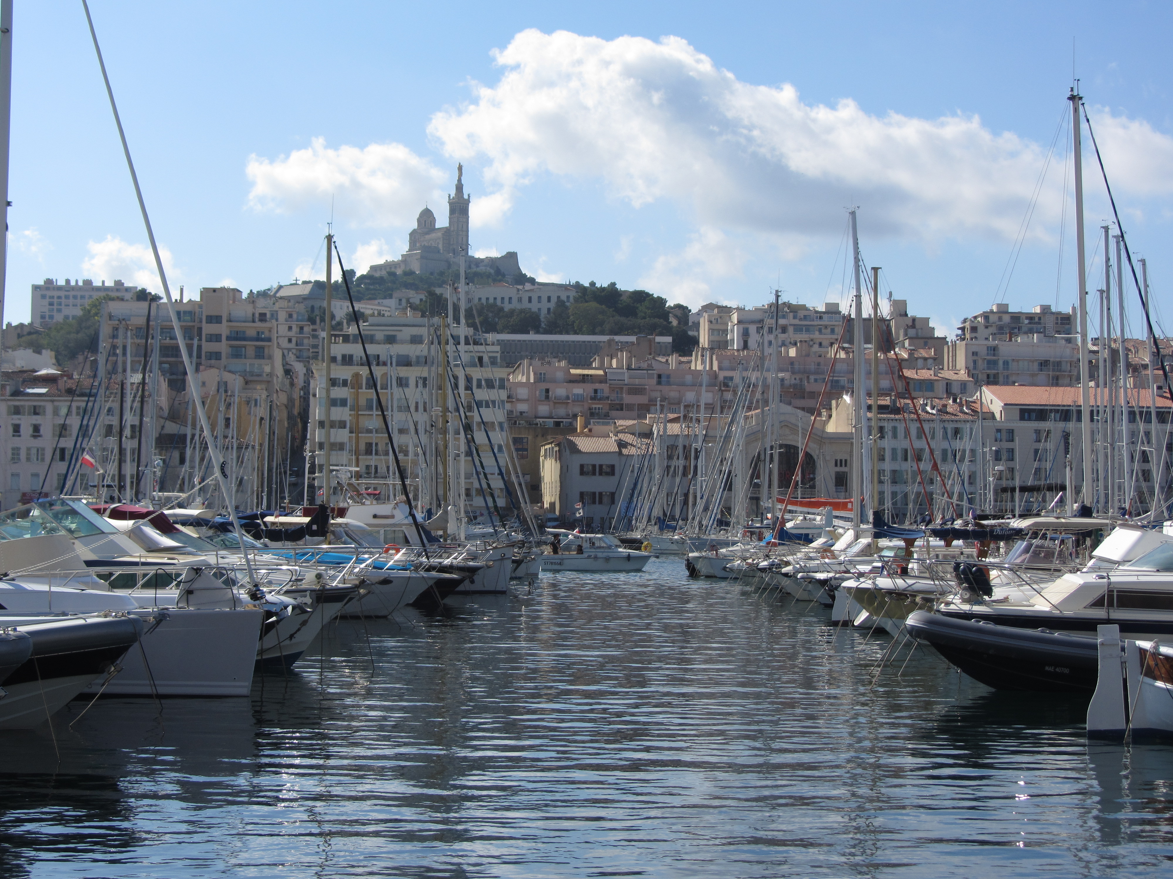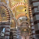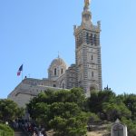 • Dimanche 14/09: Journée à Marseille à 25km par le col de la Gineste. Mais c’est la journée du patrimoine et le marathon local; les boutiques sont fermées et le stationnement impossible avec les interdictions d’accès= galère à tourner 1h00 pour enfin trouver une place au parking du tribunal. Il est 10h30 quand nous découvrons ce Vieux port (dont l’eau est bien sale et noire…) mais le décor vaut le coup avec les forts St Nicolas et St jean tout au bout, puis l’église St Laurent et le Mucem. Nous remontons vers cette étrange et imposante cathédrale de la Major (byzantine à l’intérieur* c’est à voir) puis nous traversons le quartier typique et coloré du Panier avec ses boutiques, places et terrasses animées, pour enfin finir à table vers 13h00 à Le Soleil, resto correct face au vieux port (57€/3pers.). Ensuite c’est reparti par la Canebière jusqu’au Cours Julien avec ses terrasses et ses tags, ses escaliers qui, en ce dimanche après-midi sont fréquentables !  de là il nous « reste »… 2 bons km pour atteindre la basilique ND de la garde (dont une raide montée de 380m à 16% puis 290 marches) mais c’est le clou du spectacle à l’intérieur ET à l’extérieur. Vers 16h30, épuisés, nous quittons Marseille par le bord de mer pour retrouver notre terrasse ombragée.