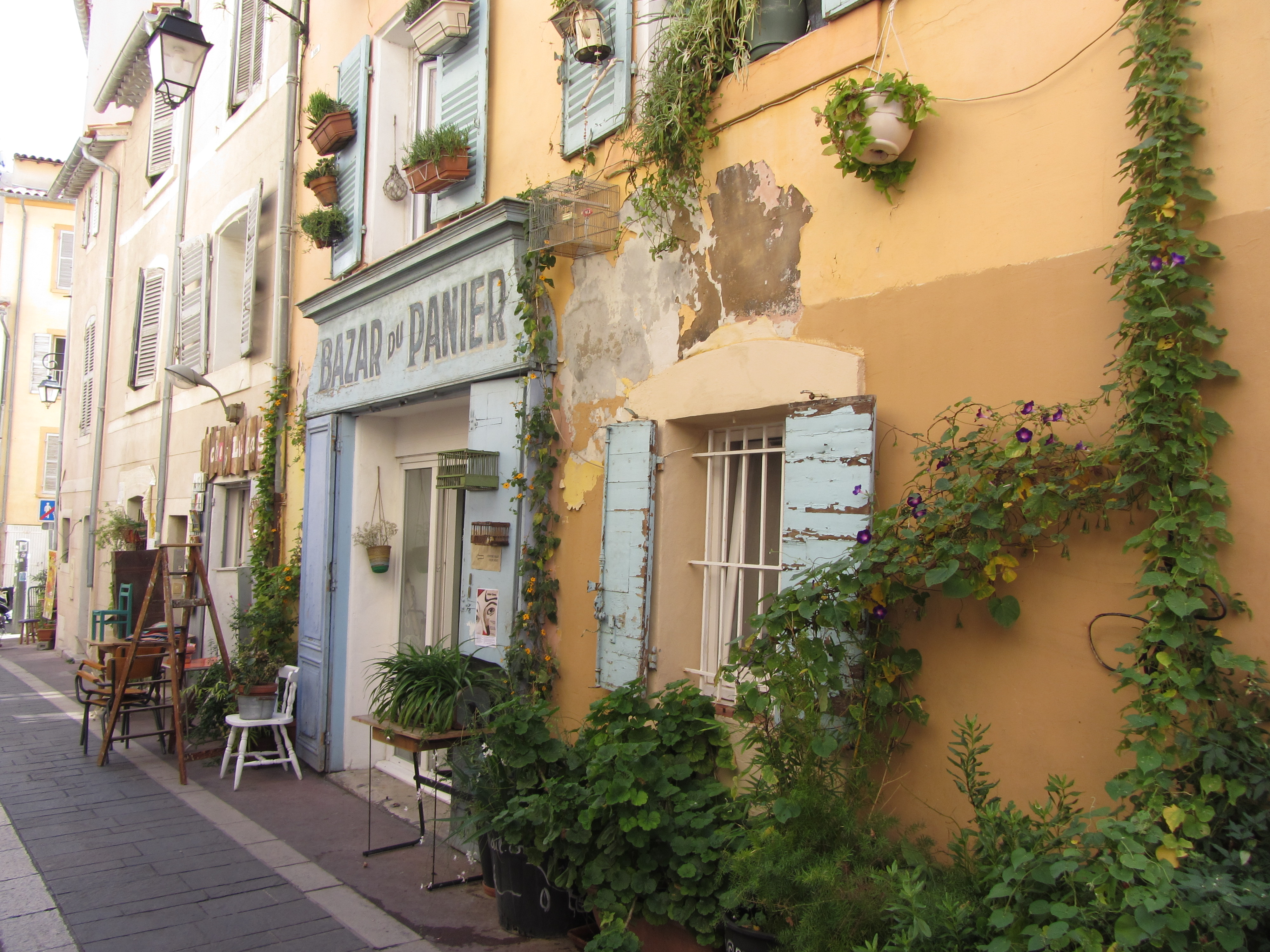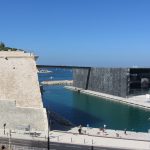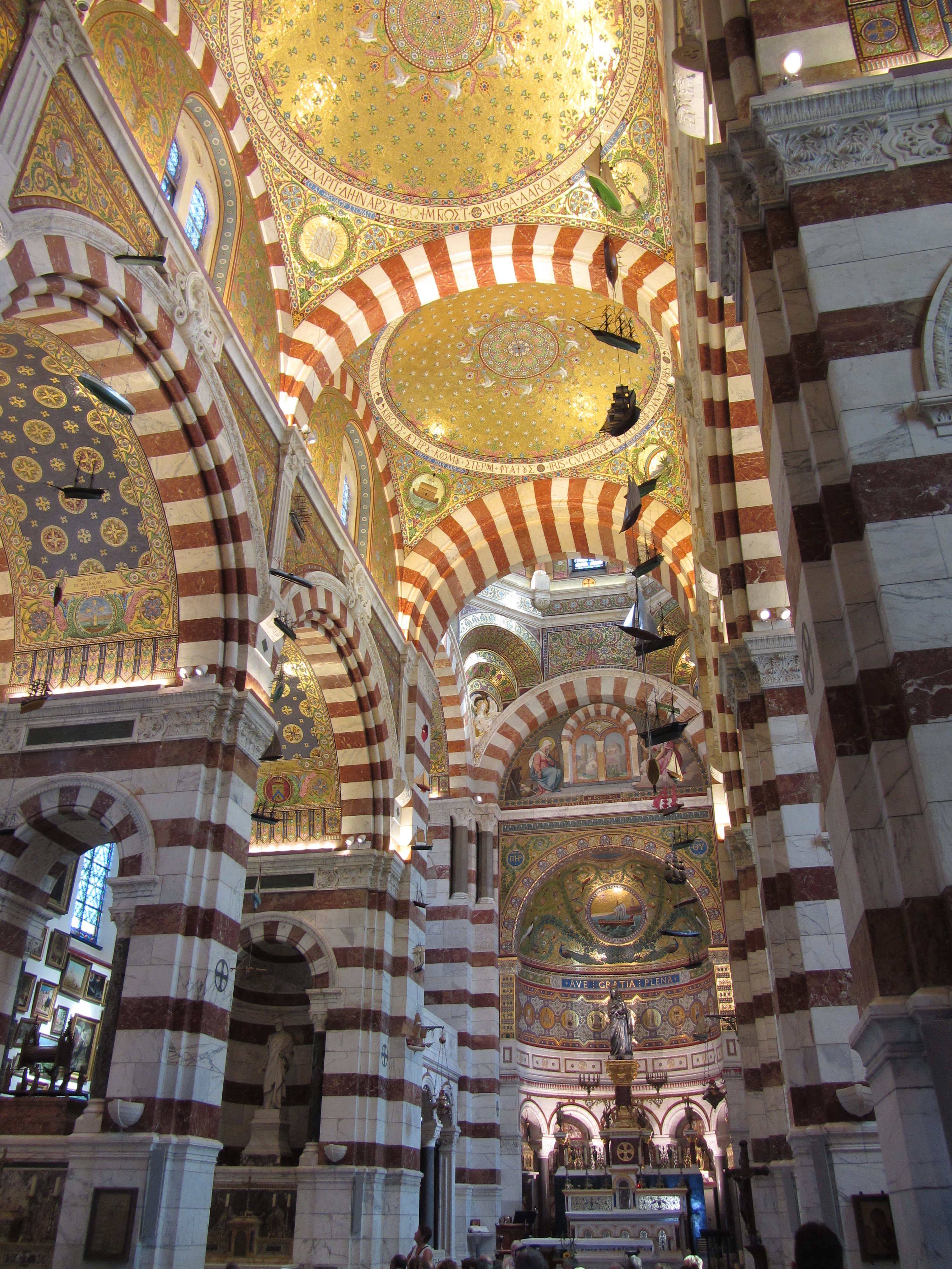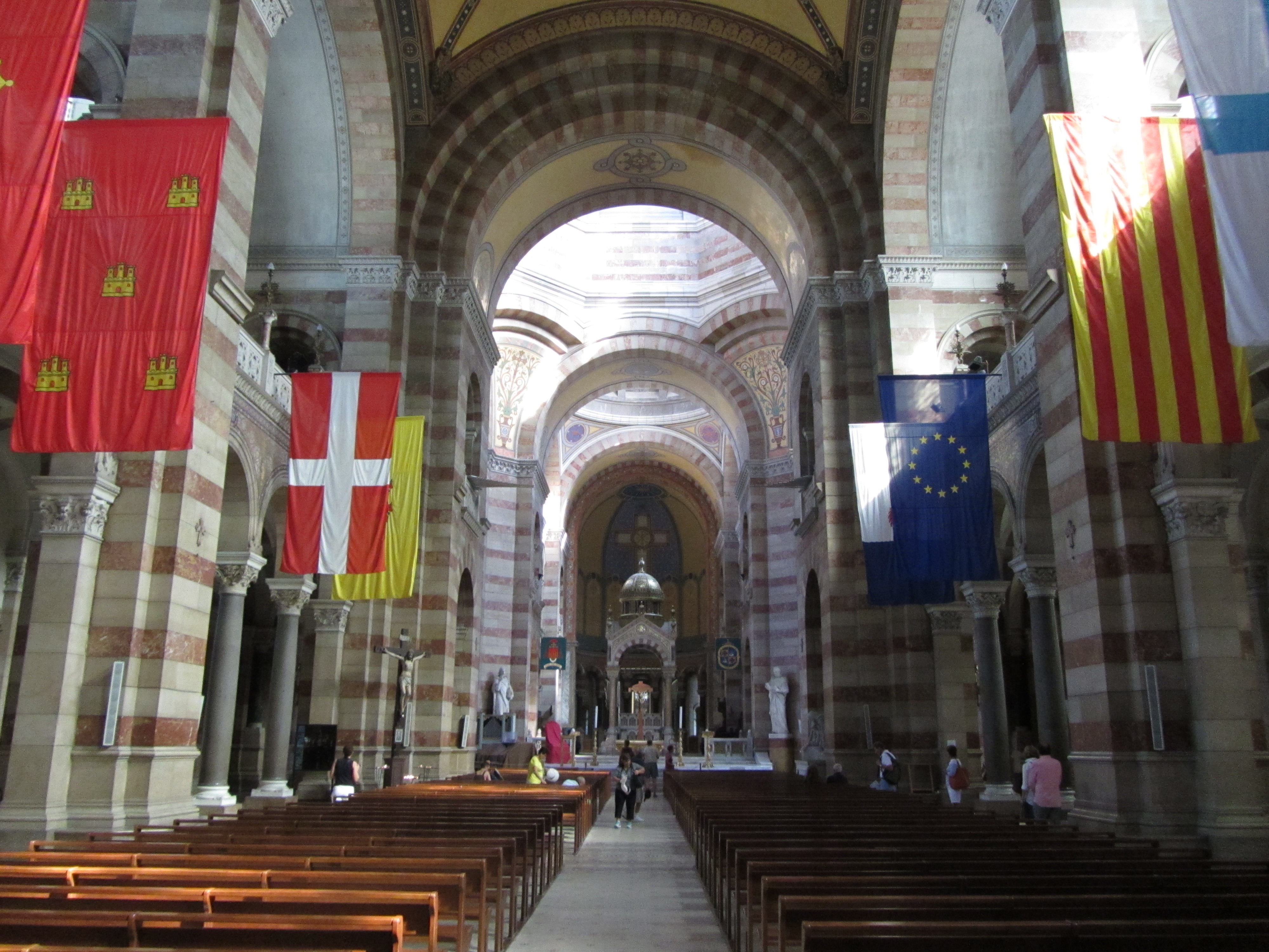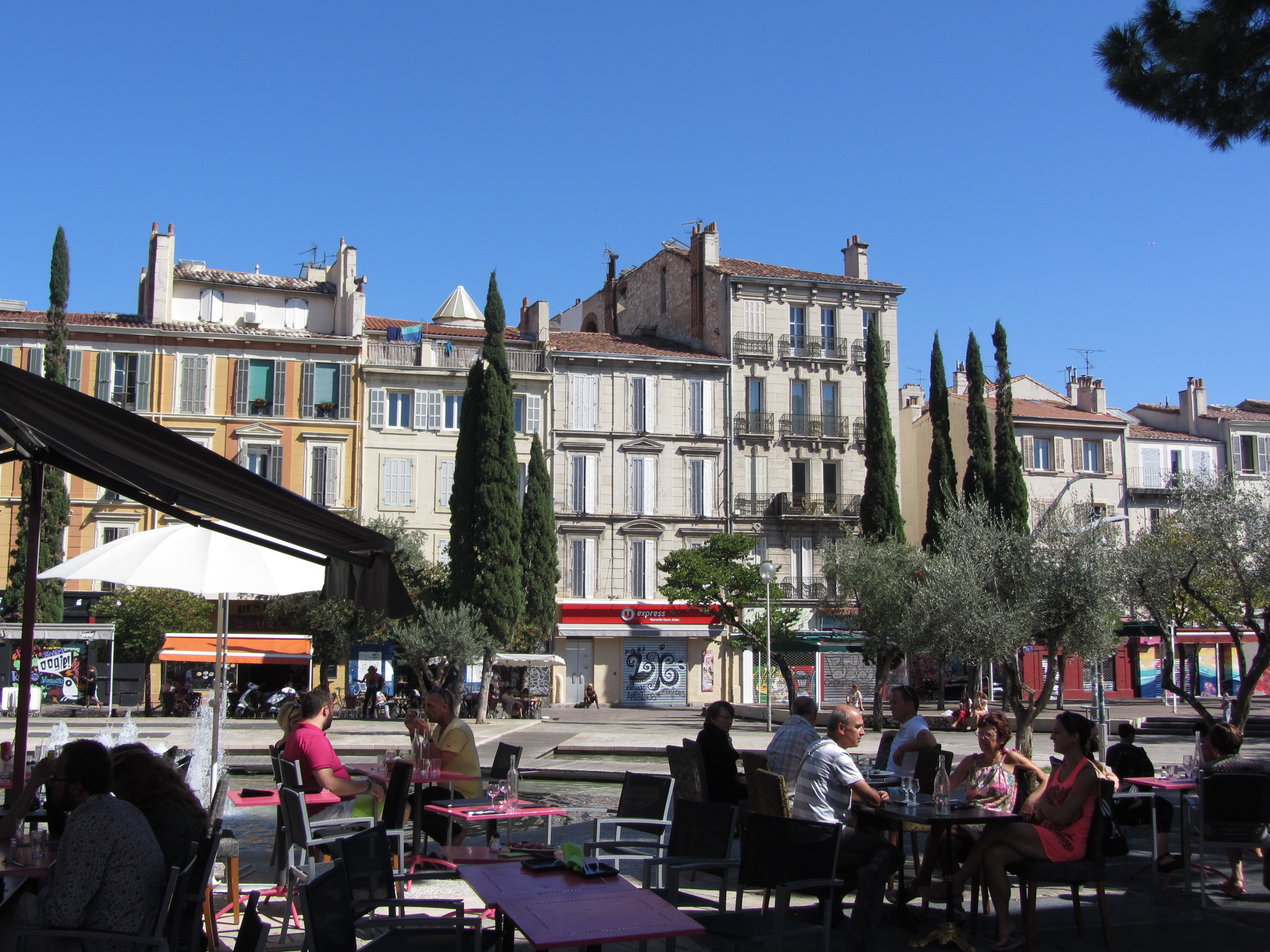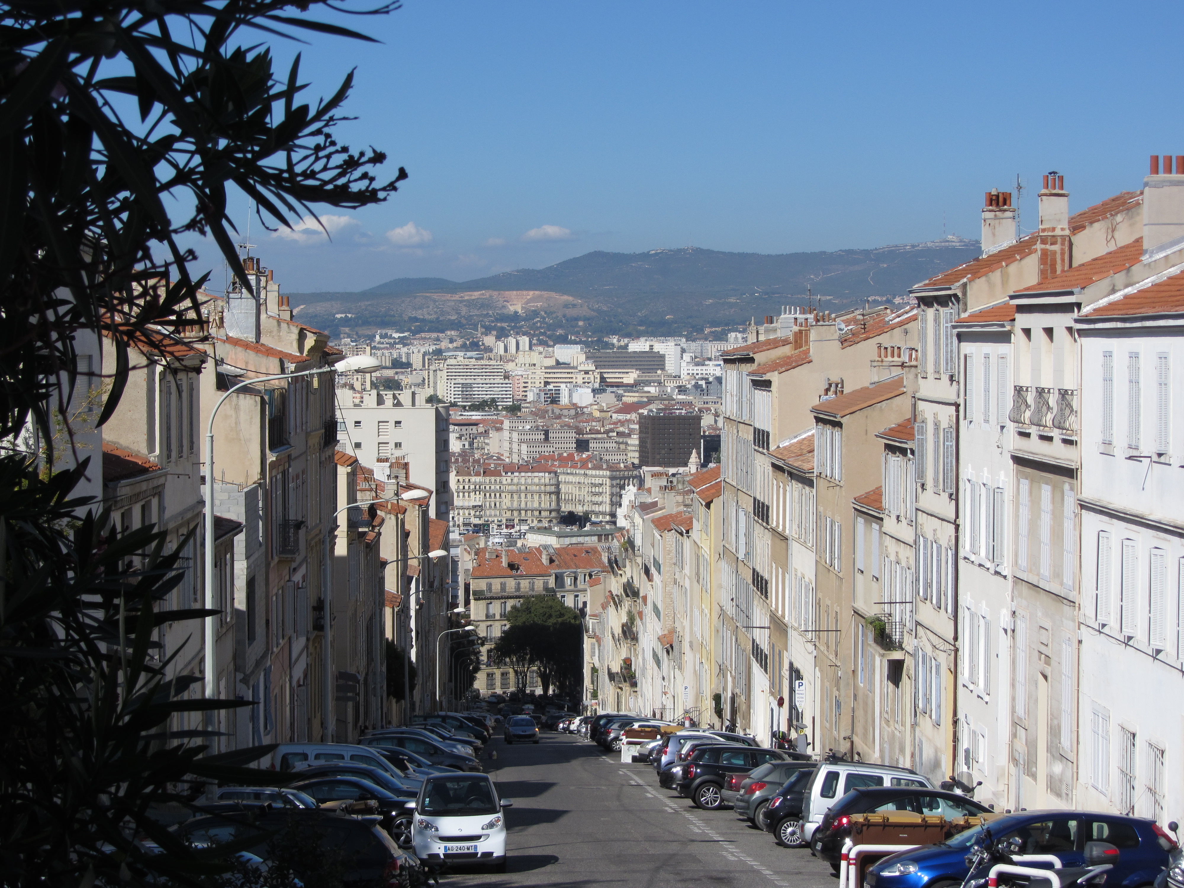 • Dimanche 14/09: Journée à Marseille à 25km par le col de la Gineste. Mais c’est la journée du patrimoine et le marathon local; les boutiques sont fermées et le stationnement impossible avec les interdictions d’accès= galère à tourner 1h00 pour enfin trouver une place au parking du tribunal. Il est 10h30 quand nous découvrons ce Vieux port (dont l’eau est bien sale et noire…) mais le décor vaut le coup avec les forts St Nicolas et St jean tout au bout, puis l’église St Laurent et le Mucem. Nous remontons vers cette étrange et imposante cathédrale de la Major (byzantine à l’intérieur* c’est à voir) puis nous traversons le quartier typique et coloré du Panier avec ses boutiques, places et terrasses animées, pour enfin finir à table vers 13h00 à Le Soleil, resto correct face au vieux port (57€/3pers.). Ensuite c’est reparti par la Canebière jusqu’au Cours Julien avec ses terrasses et ses tags, ses escaliers qui, en ce dimanche après-midi sont fréquentables !  de là il nous « reste »… 2 bons km pour atteindre la basilique ND de la garde (dont une raide montée de 380m à 16% puis 290 marches) mais c’est le clou du spectacle à l’intérieur ET à l’extérieur. Vers 16h30, épuisés, nous quittons Marseille par le bord de mer pour retrouver notre terrasse ombragée.