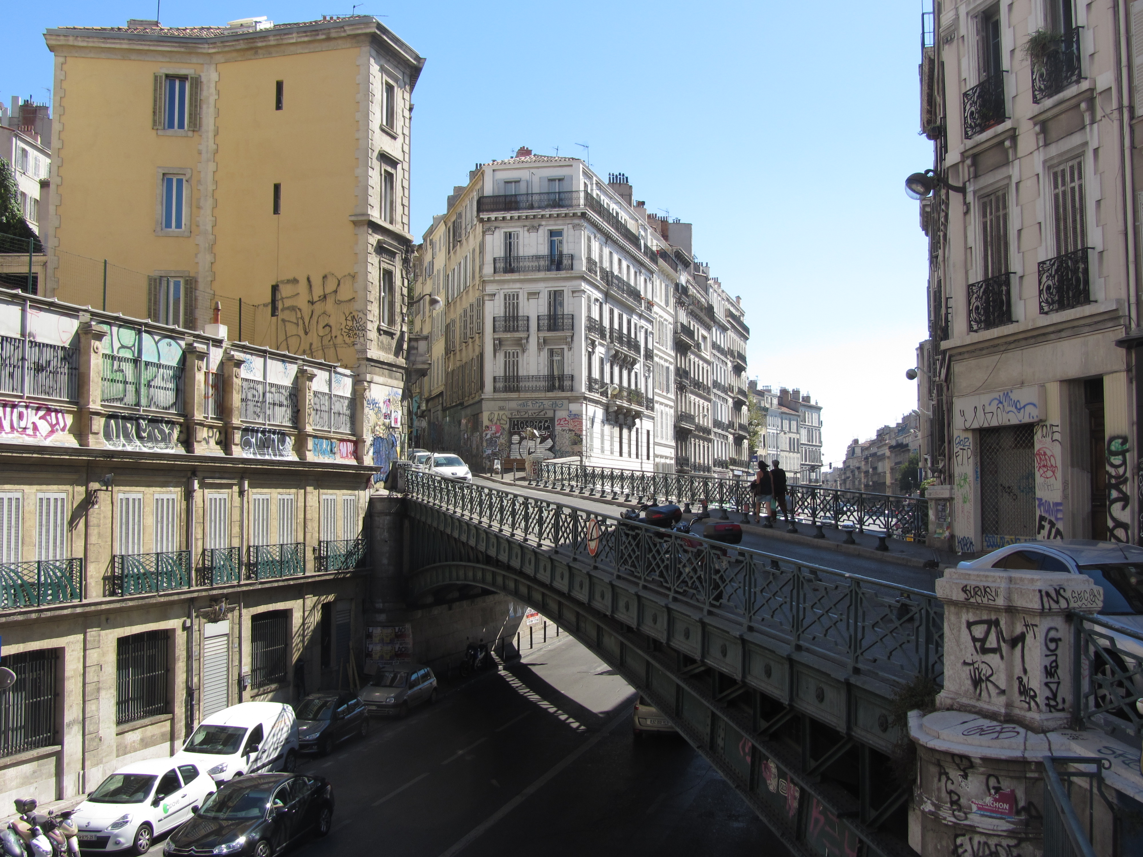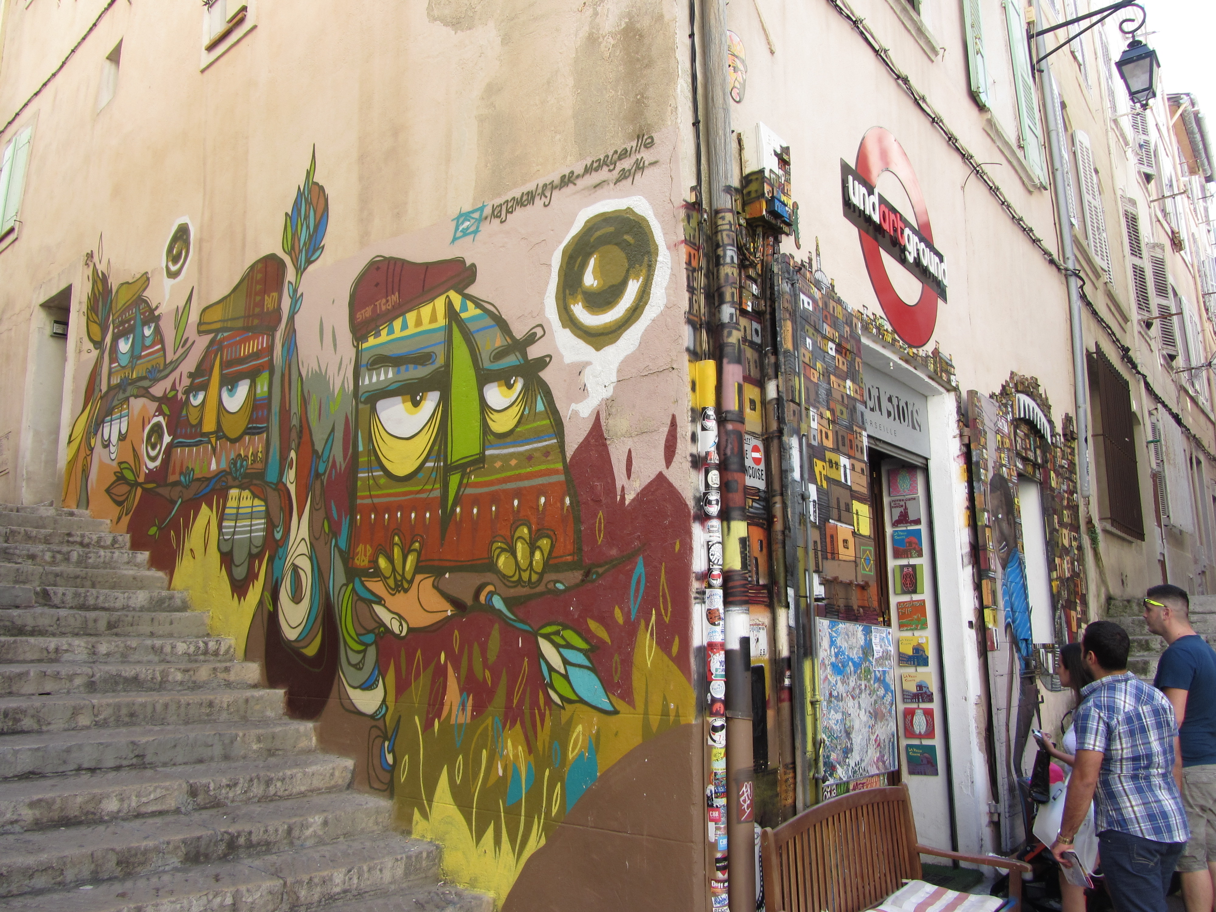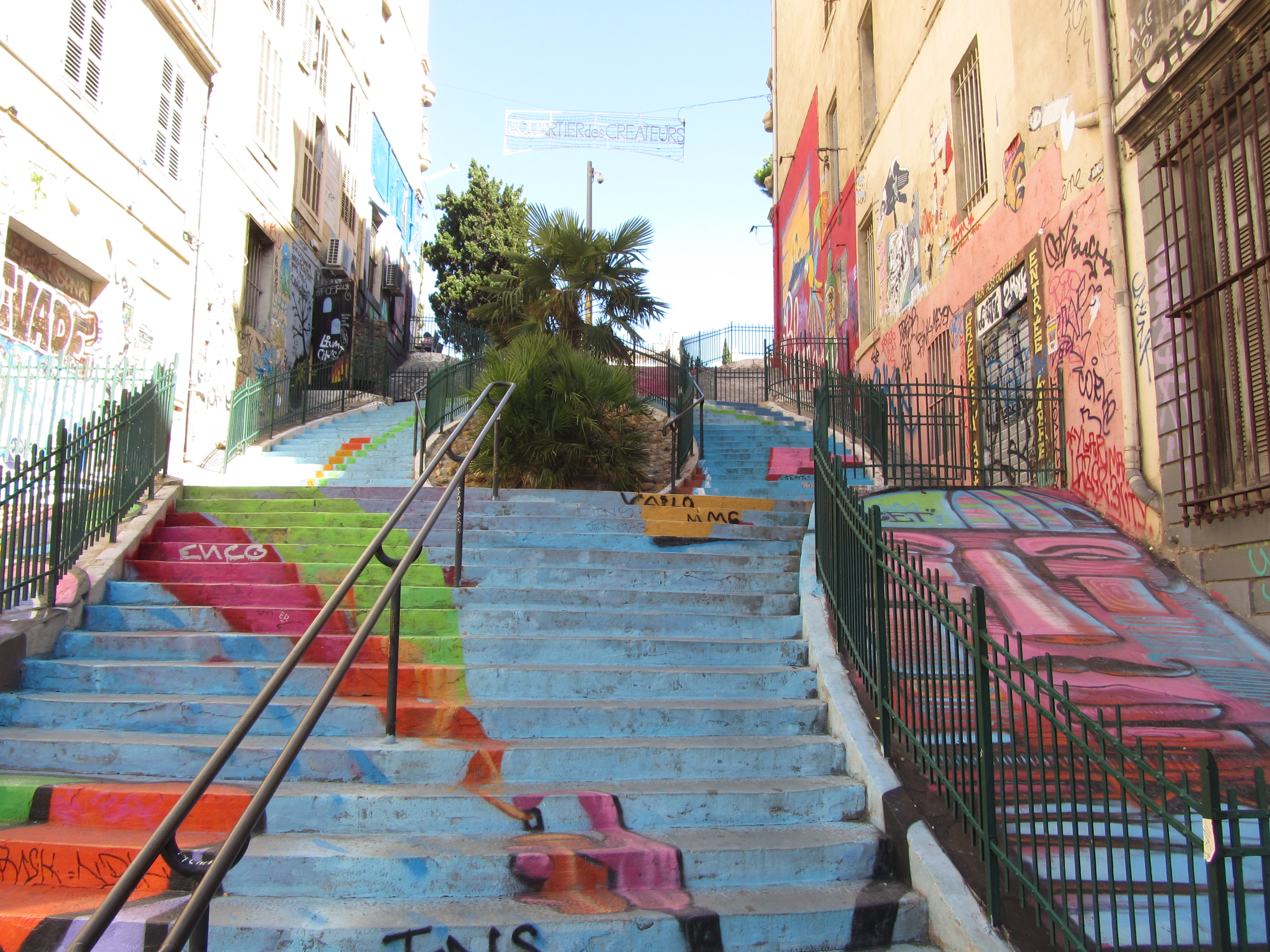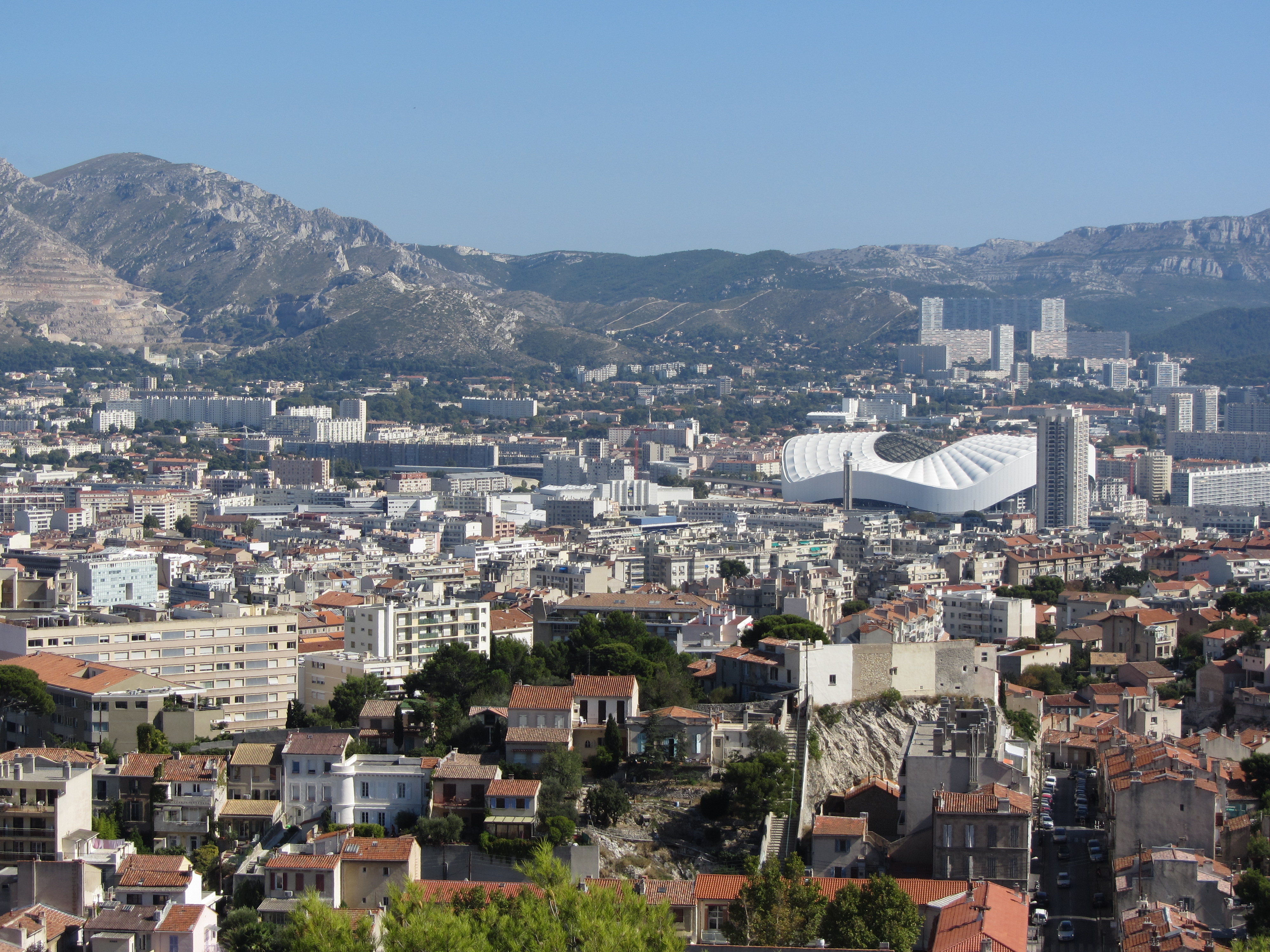 • Dimanche 14/09: Journée à Marseille à 25km par le col de la Gineste. Mais c’est la journée du patrimoine et le marathon local; les boutiques sont fermées et le stationnement impossible avec les interdictions d’accès= galère à tourner 1h00 pour enfin trouver une place au parking du tribunal. Il est 10h30 quand nous découvrons ce Vieux port (dont l’eau est bien sale et noire…) mais le décor vaut le coup avec les forts St Nicolas et St jean tout au bout, puis l’église St Laurent et le Mucem. Nous remontons vers cette étrange et imposante cathédrale de la Major (byzantine à l’intérieur* c’est à voir) puis nous traversons le quartier typique et coloré du Panier avec ses boutiques, places et terrasses animées, pour enfin finir à table vers 13h00 à Le Soleil, resto correct face au vieux port (57€/3pers.). Ensuite c’est reparti par la Canebière jusqu’au Cours Julien avec ses terrasses et ses tags, ses escaliers qui, en ce dimanche après-midi sont fréquentables !  de là il nous « reste »… 2 bons km pour atteindre la basilique ND de la garde (dont une raide montée de 380m à 16% puis 290 marches) mais c’est le clou du spectacle à l’intérieur ET à l’extérieur. Vers 16h30, épuisés, nous quittons Marseille par le bord de mer pour retrouver notre terrasse ombragée.