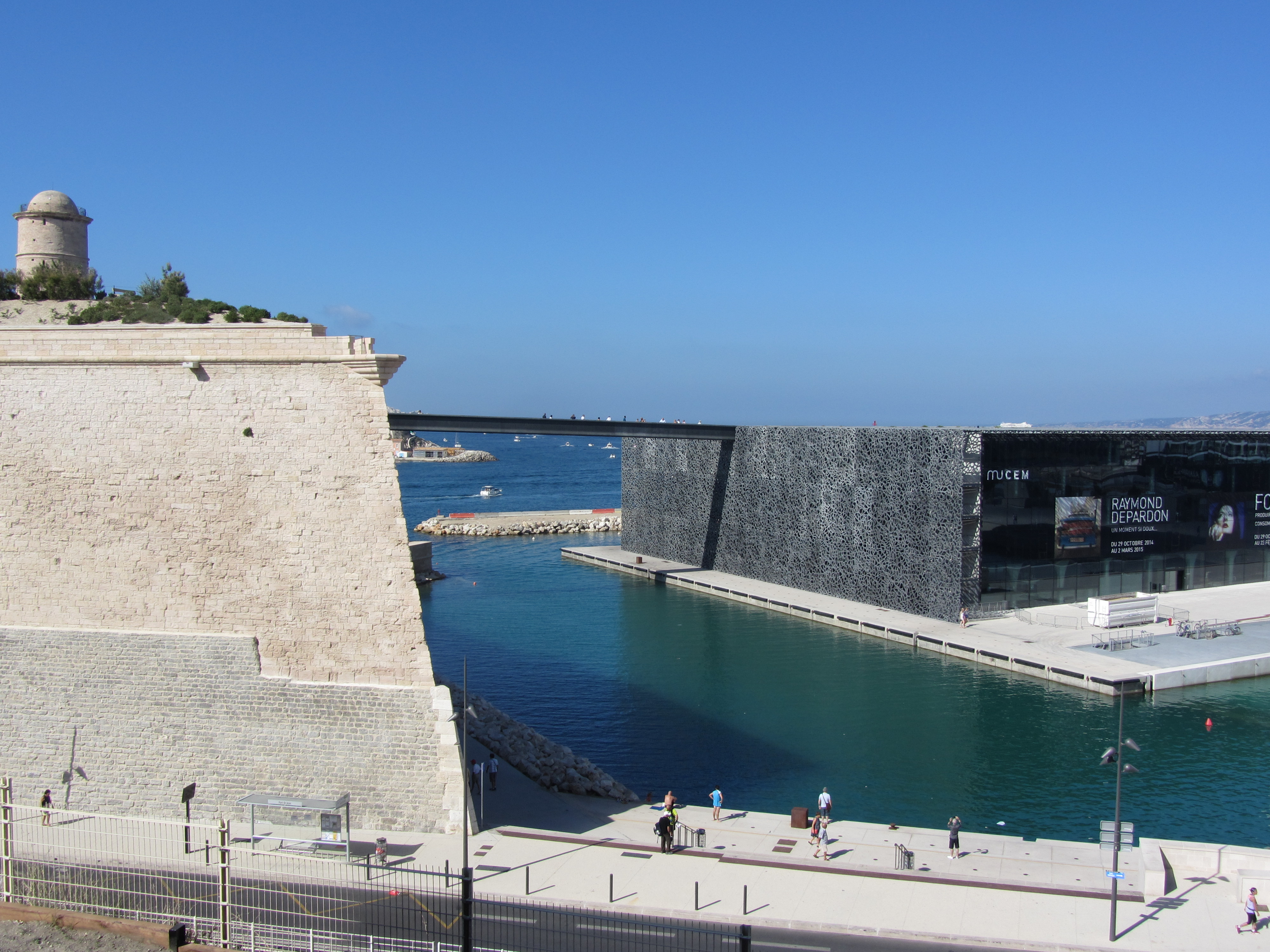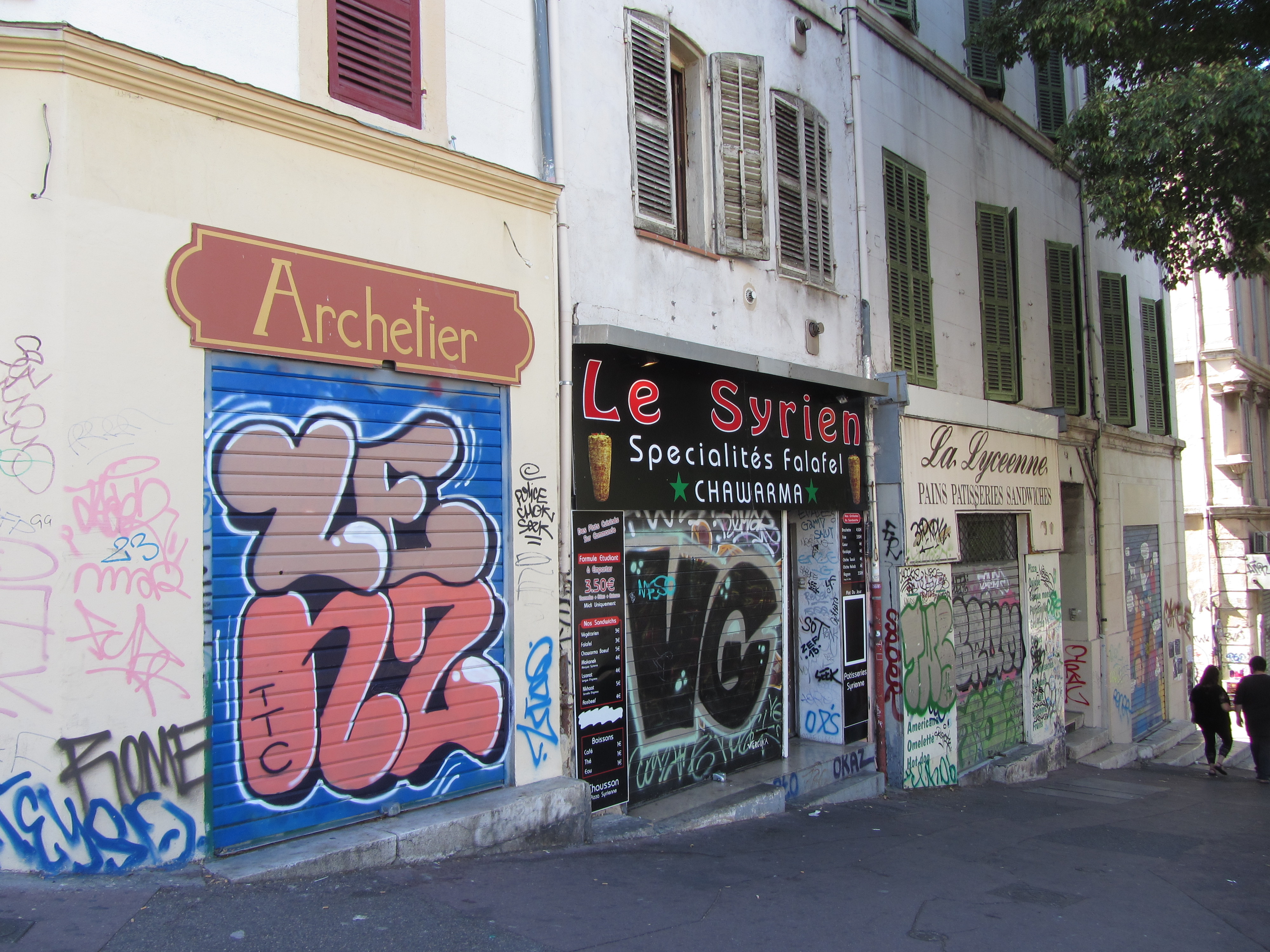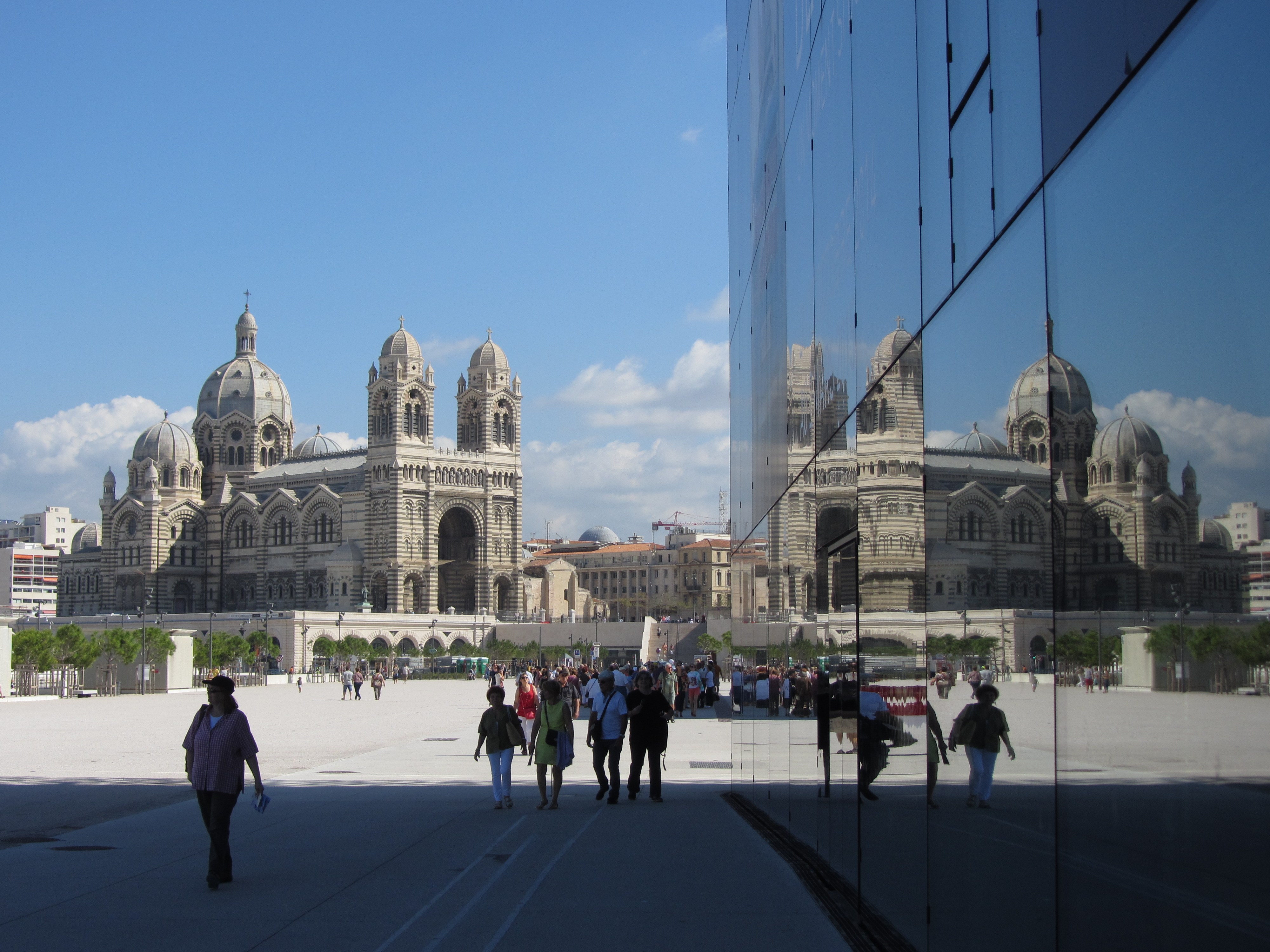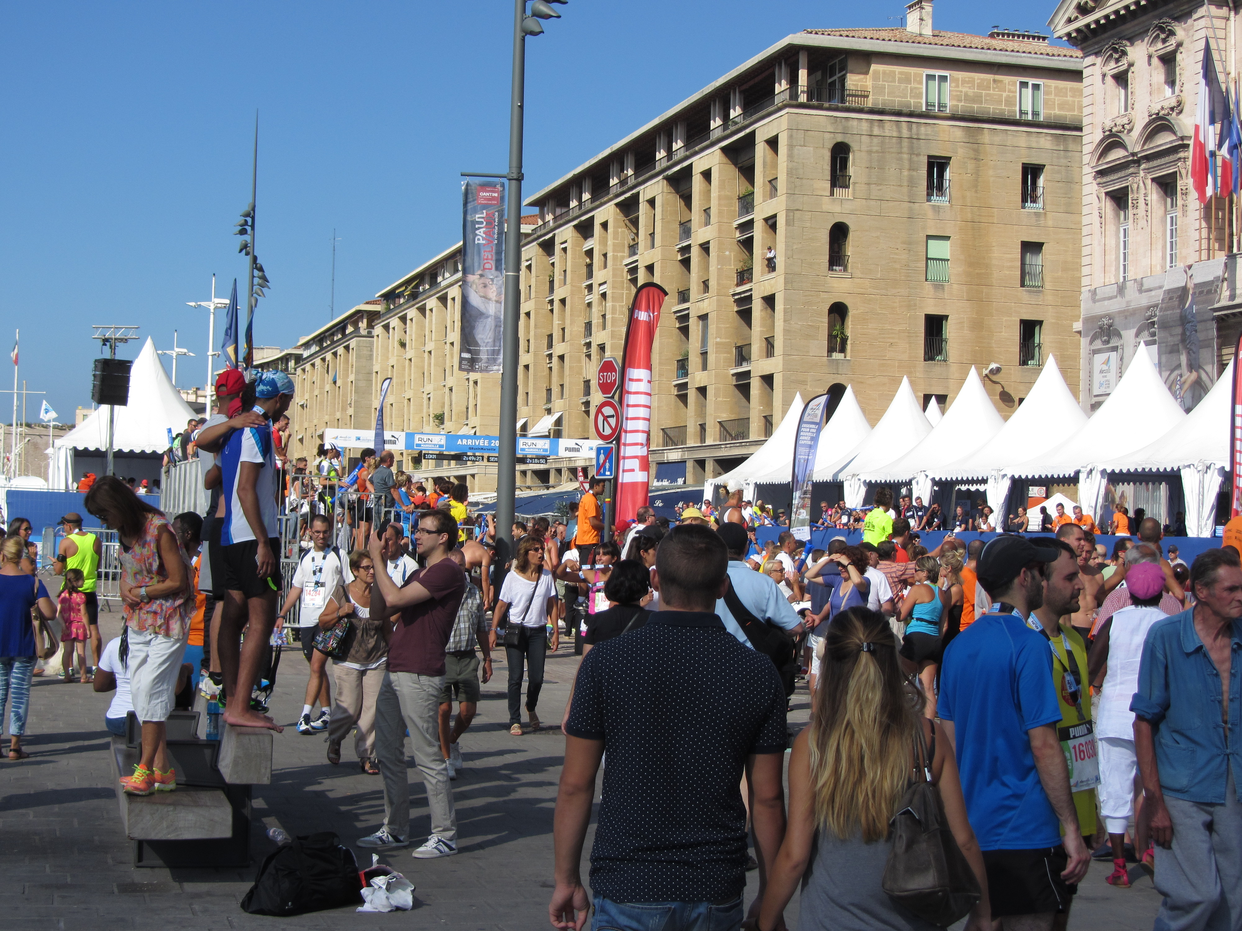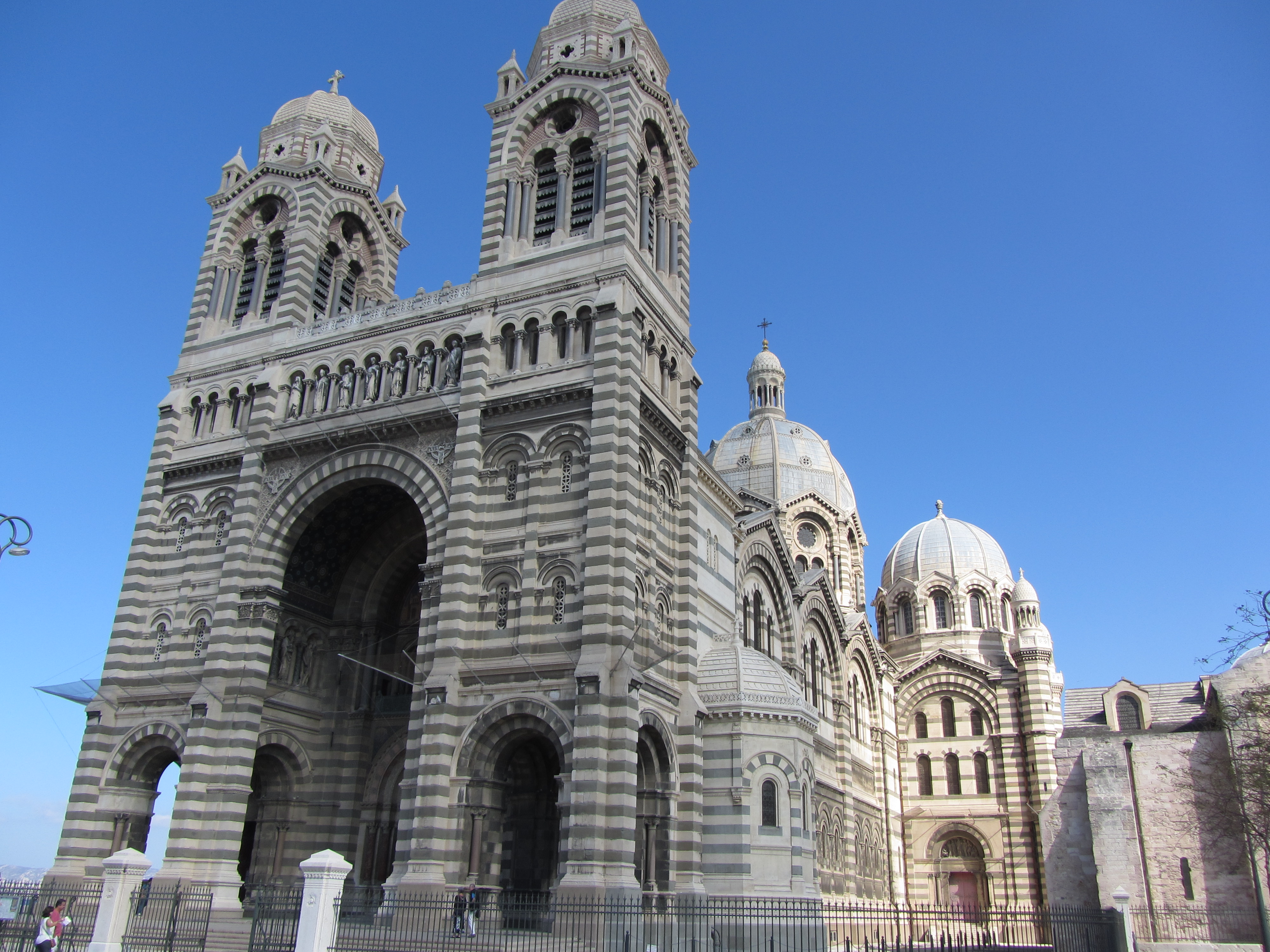 • Dimanche 14/09: Journée à Marseille à 25km par le col de la Gineste. Mais c’est la journée du patrimoine et le marathon local; les boutiques sont fermées et le stationnement impossible avec les interdictions d’accès= galère à tourner 1h00 pour enfin trouver une place au parking du tribunal. Il est 10h30 quand nous découvrons ce Vieux port (dont l’eau est bien sale et noire…) mais le décor vaut le coup avec les forts St Nicolas et St jean tout au bout, puis l’église St Laurent et le Mucem. Nous remontons vers cette étrange et imposante cathédrale de la Major (byzantine à l’intérieur* c’est à voir) puis nous traversons le quartier typique et coloré du Panier avec ses boutiques, places et terrasses animées, pour enfin finir à table vers 13h00 à Le Soleil, resto correct face au vieux port (57€/3pers.). Ensuite c’est reparti par la Canebière jusqu’au Cours Julien avec ses terrasses et ses tags, ses escaliers qui, en ce dimanche après-midi sont fréquentables !  de là il nous « reste »… 2 bons km pour atteindre la basilique ND de la garde (dont une raide montée de 380m à 16% puis 290 marches) mais c’est le clou du spectacle à l’intérieur ET à l’extérieur. Vers 16h30, épuisés, nous quittons Marseille par le bord de mer pour retrouver notre terrasse ombragée.