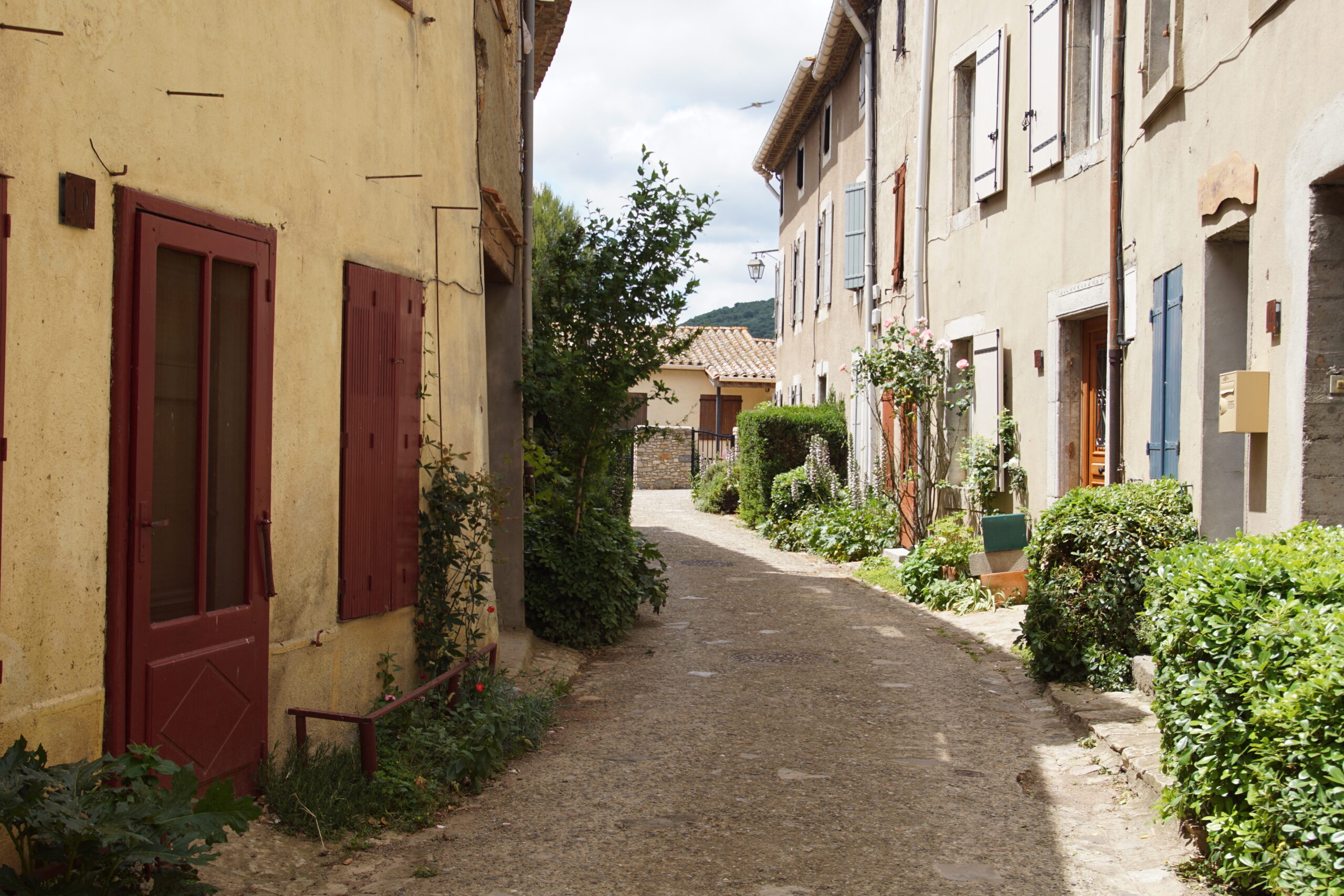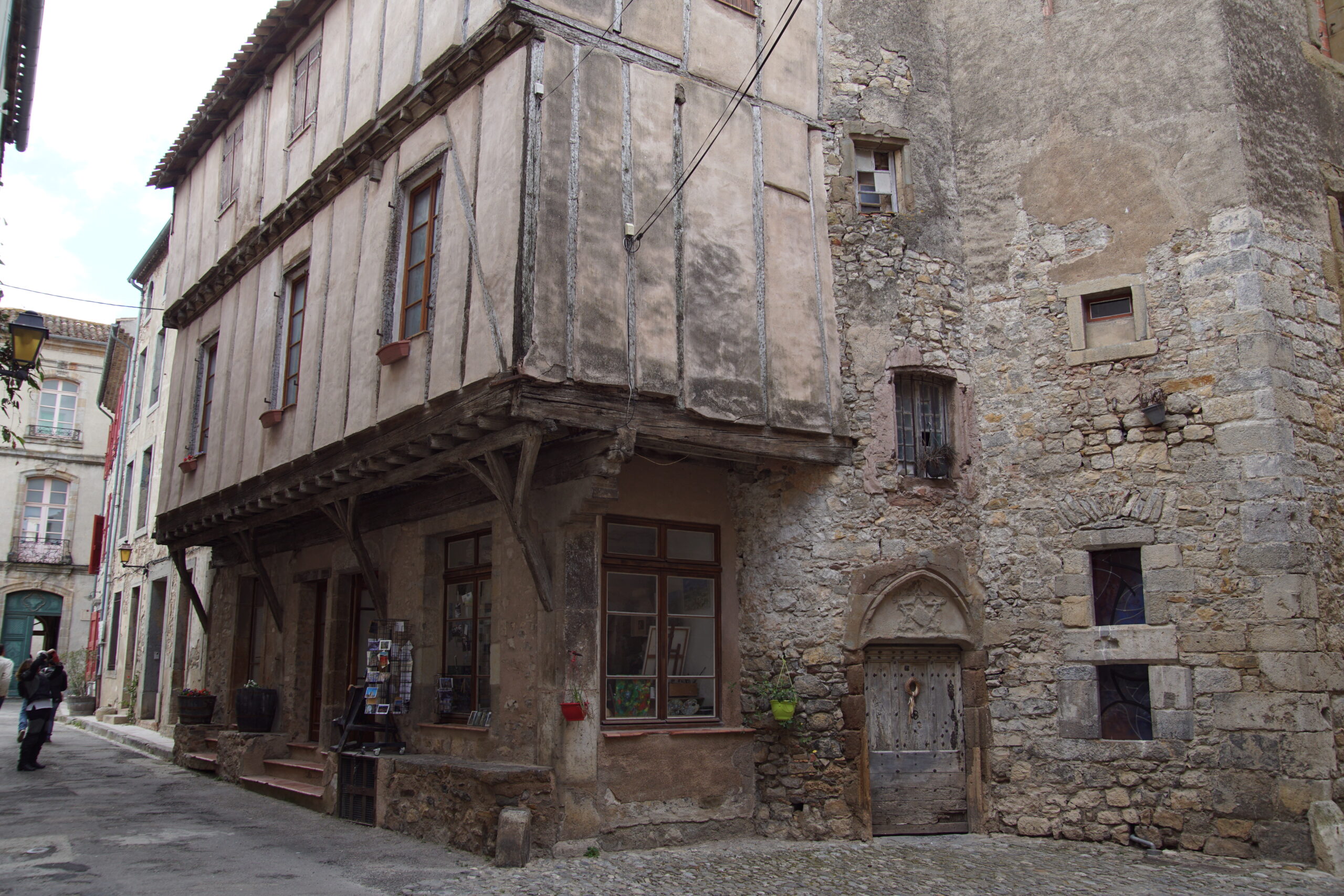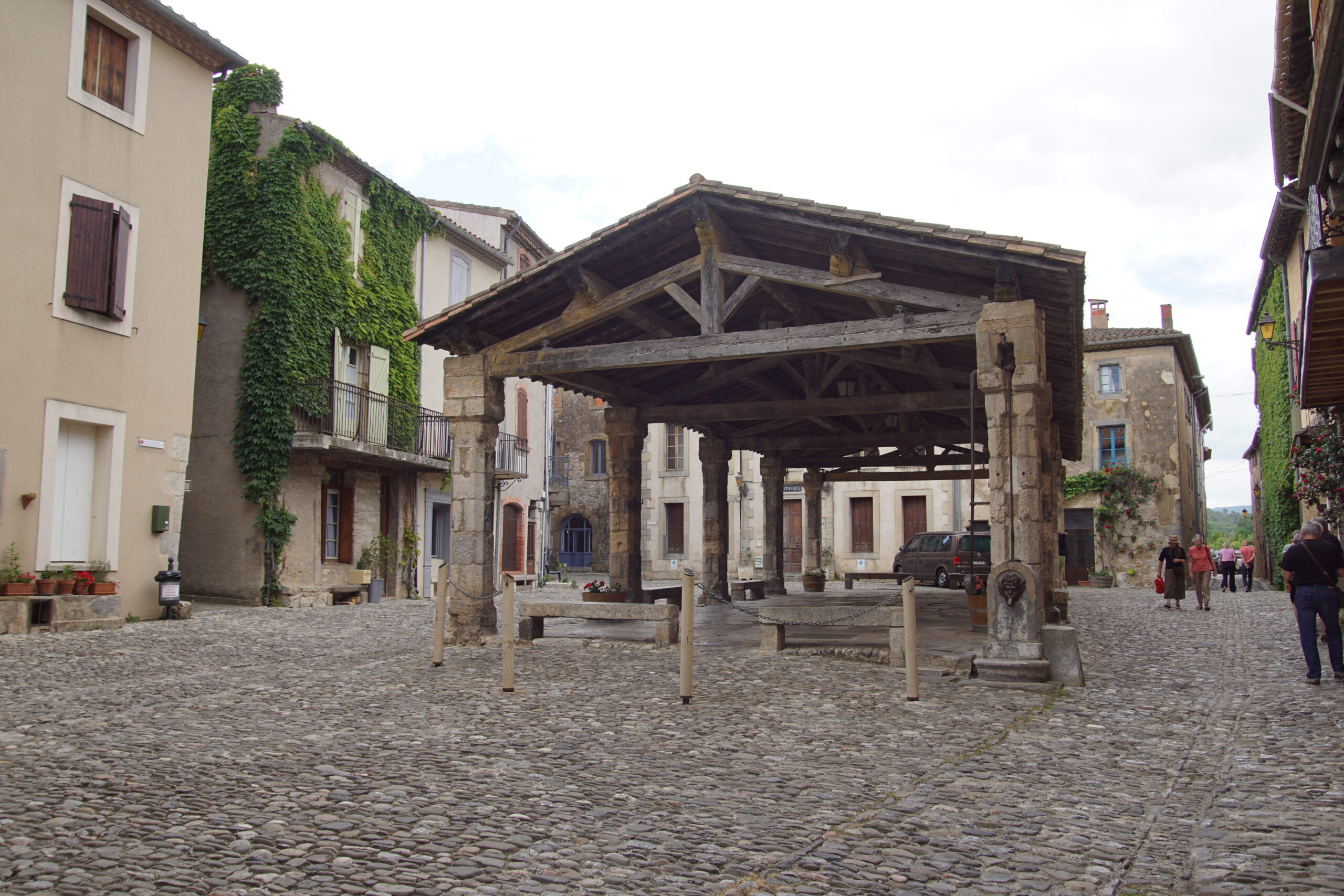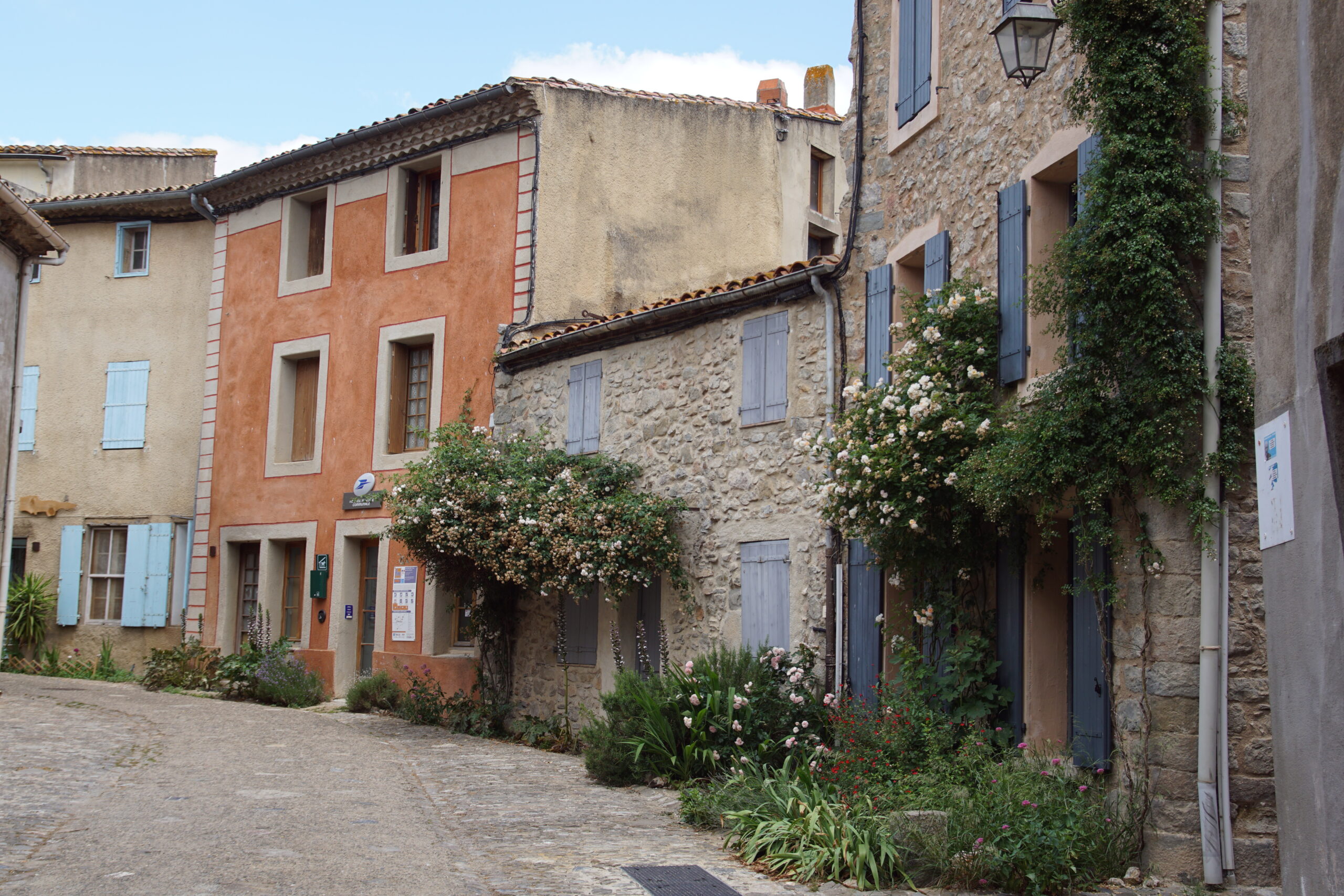 • Mais il y a là comme un défaut (et pourtant j’ai bien scruté Google Street View…). Il faut se garer au village, puis route interdite et fort étroite sur 400m, puis chemin empierré 450m à 10% puis visite, et retour idem ! c’est trop pour nous, on le verra de loin. Et l’on suit ensuite la D212 belle et tortueuse sur 21km/30mn qui nous emmène près de Lagrasse*** (village classé), nous inversons donc les visites prévues. C’est très joli, médiéval et festif après une cérémonie du dimanche (sortie de messe à l’Abbaye Ste Marie d’Orbieu), mais le village est calme, peu de touristes.