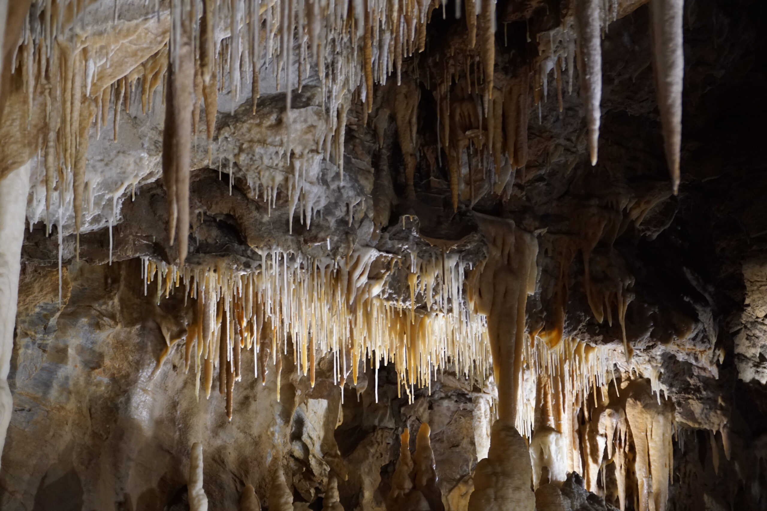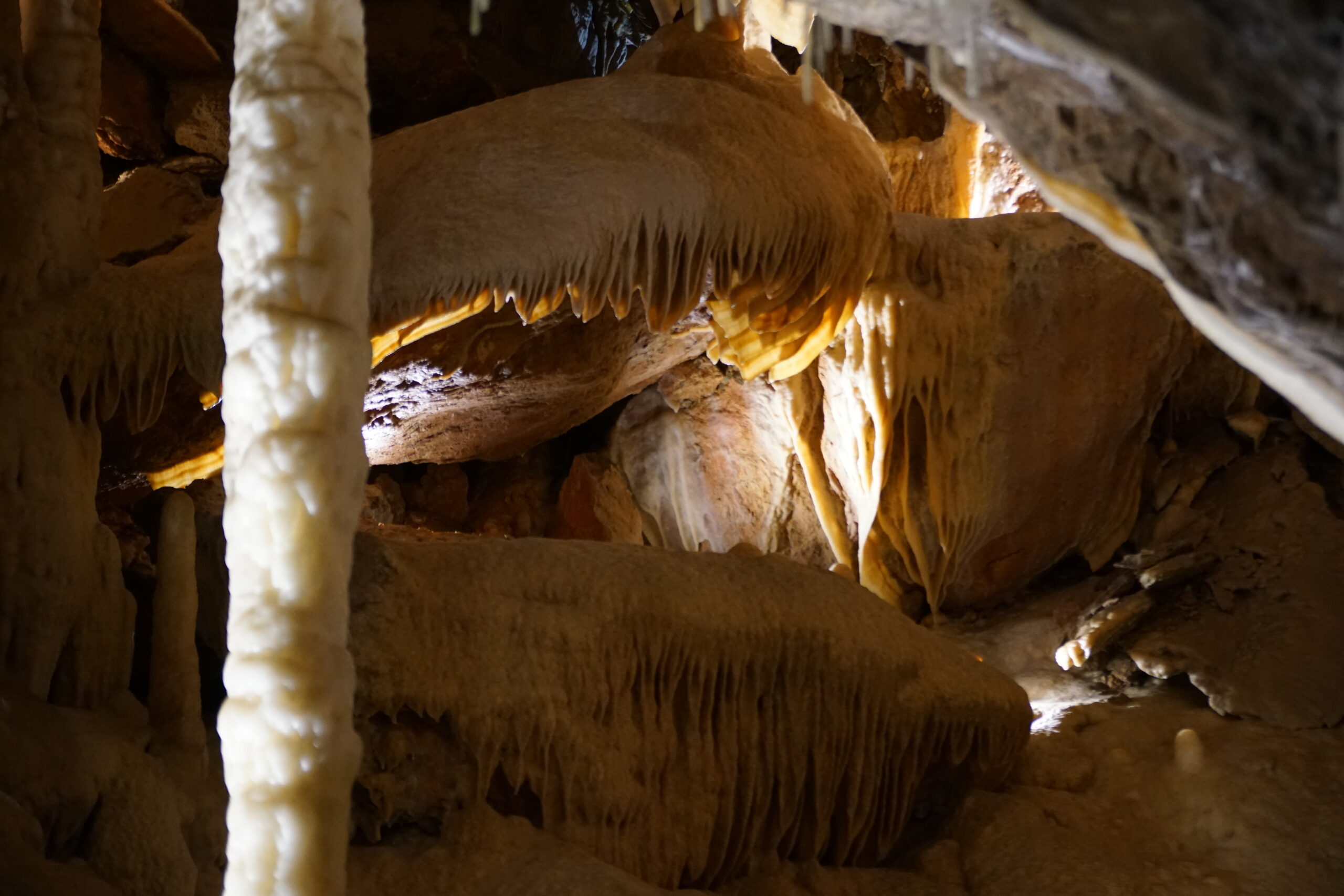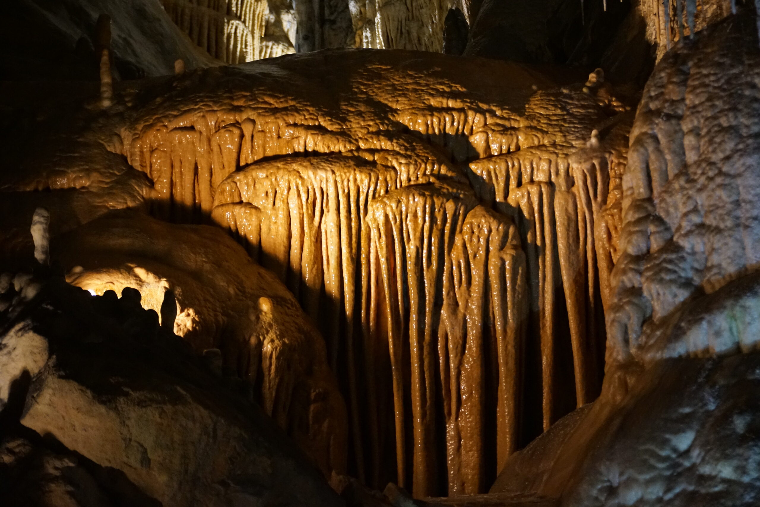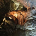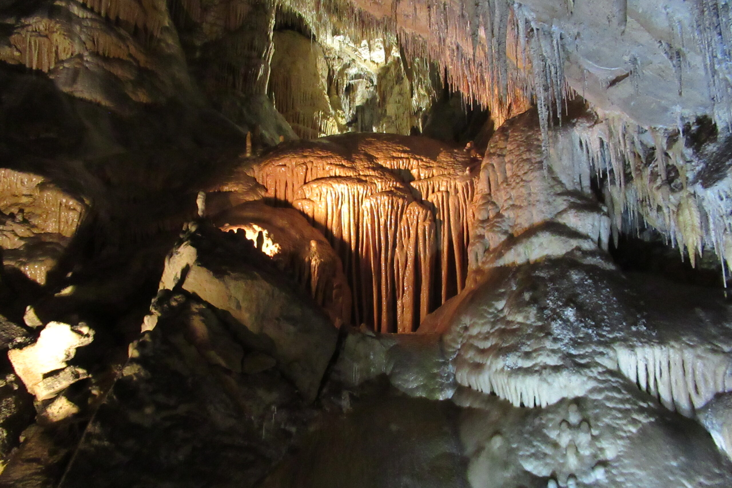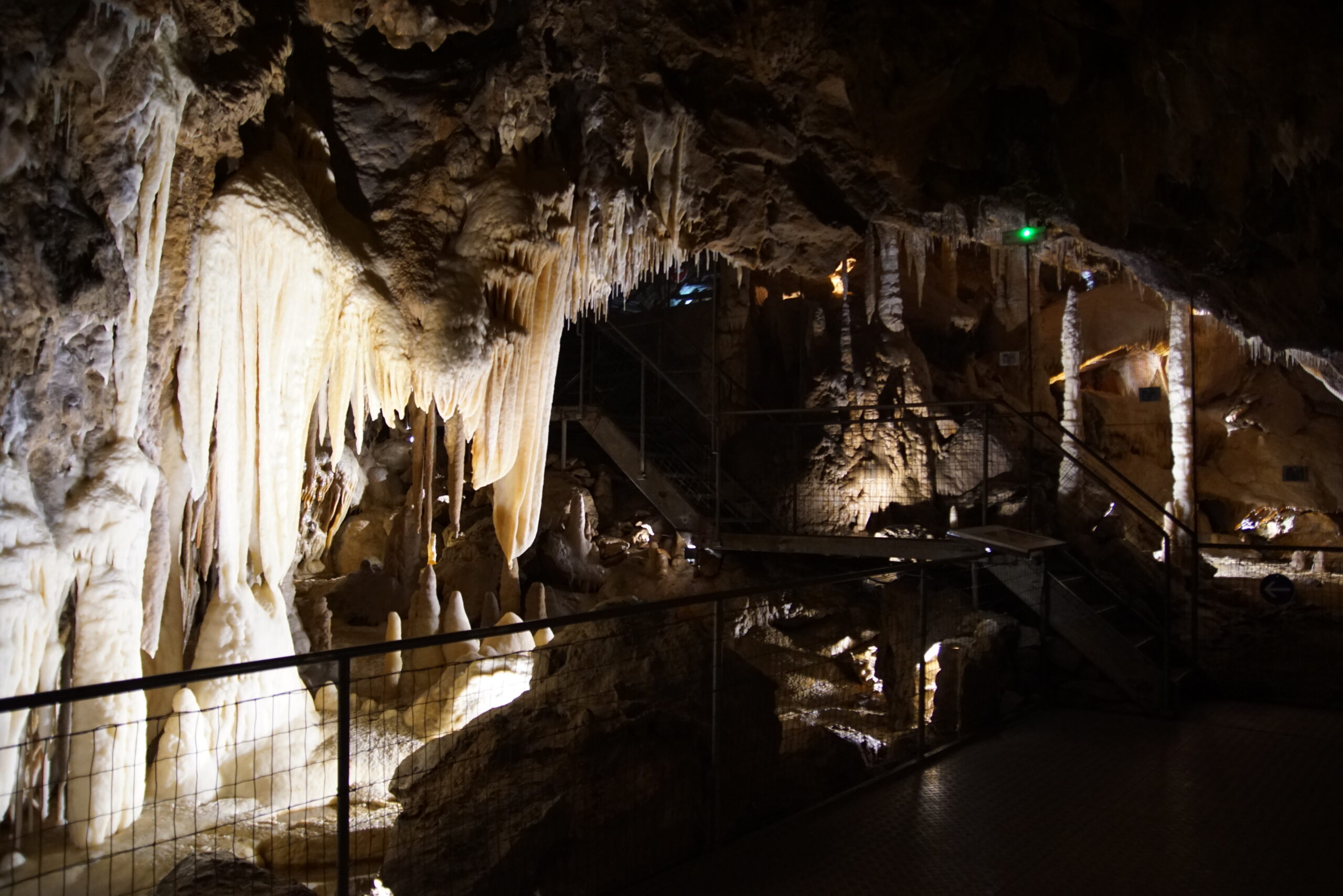 - L’après-midi il fait très chaud et un orage semble possible, nous prenons la voiture pour… 1,5km (!) et le parking de la grotte des Grandes Canalettes*** (direction Vernet les Bains). Très peu de monde et il fait 14° là en bas (11€/pers. en CB). Circuit très bien balisé et escaliers faciles, petit son/lumières tout au bout. Chouette activité conseillée aux familles et aux autres, compter 1h00 AR, et il y a une petite boutique expo avant la sortie.