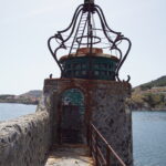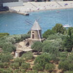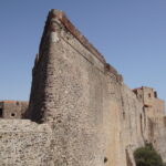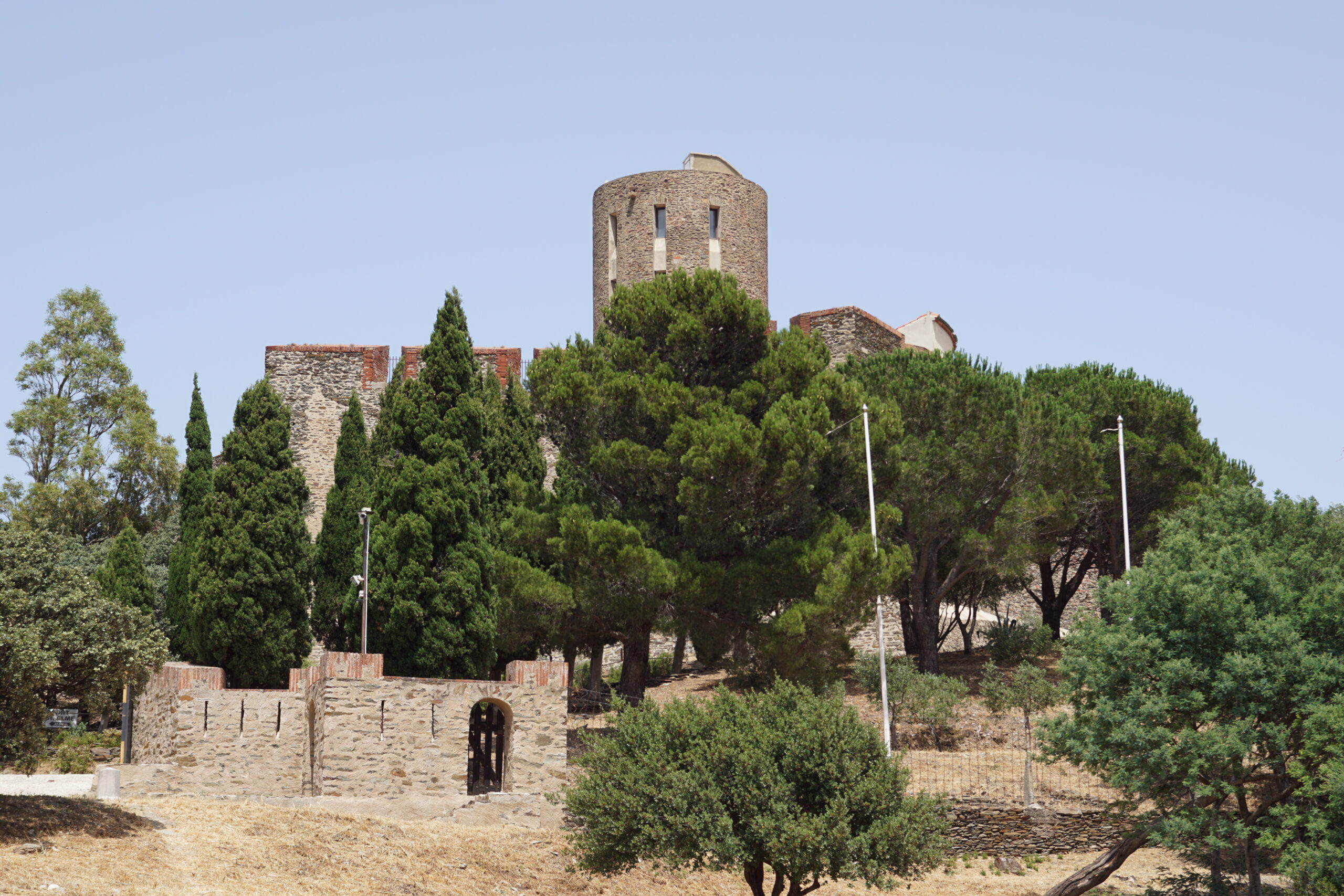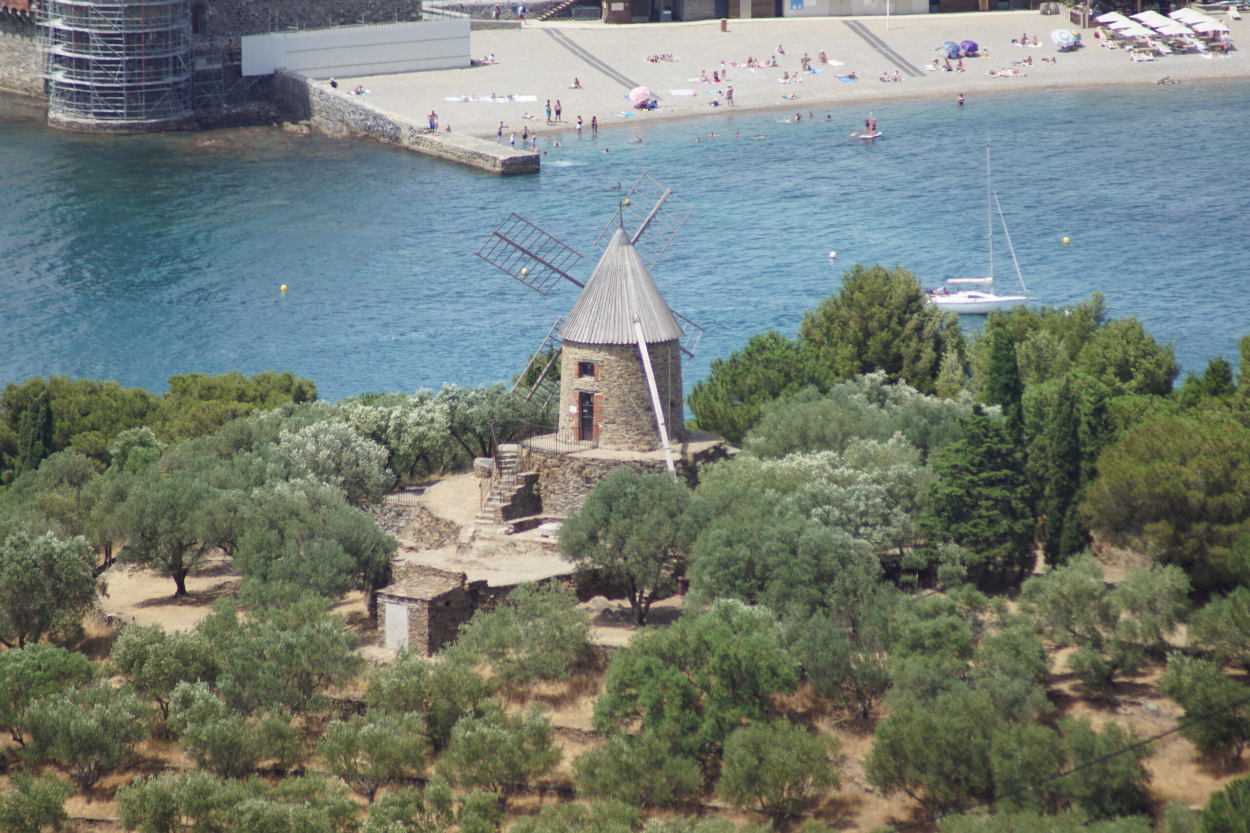 • Nous allons ensuite de l’autre côté vers la Tour d’Avall et le bout de sa plage (direction Port-Vendres). Nous sommes presque au pied du Moulin de la Cortina* (qui n’est pas visitable le mardi…). Et plus haut l’on aperçoit le Fort St Elme* (non visité). Le point de vue depuis là haut doit être sympa !