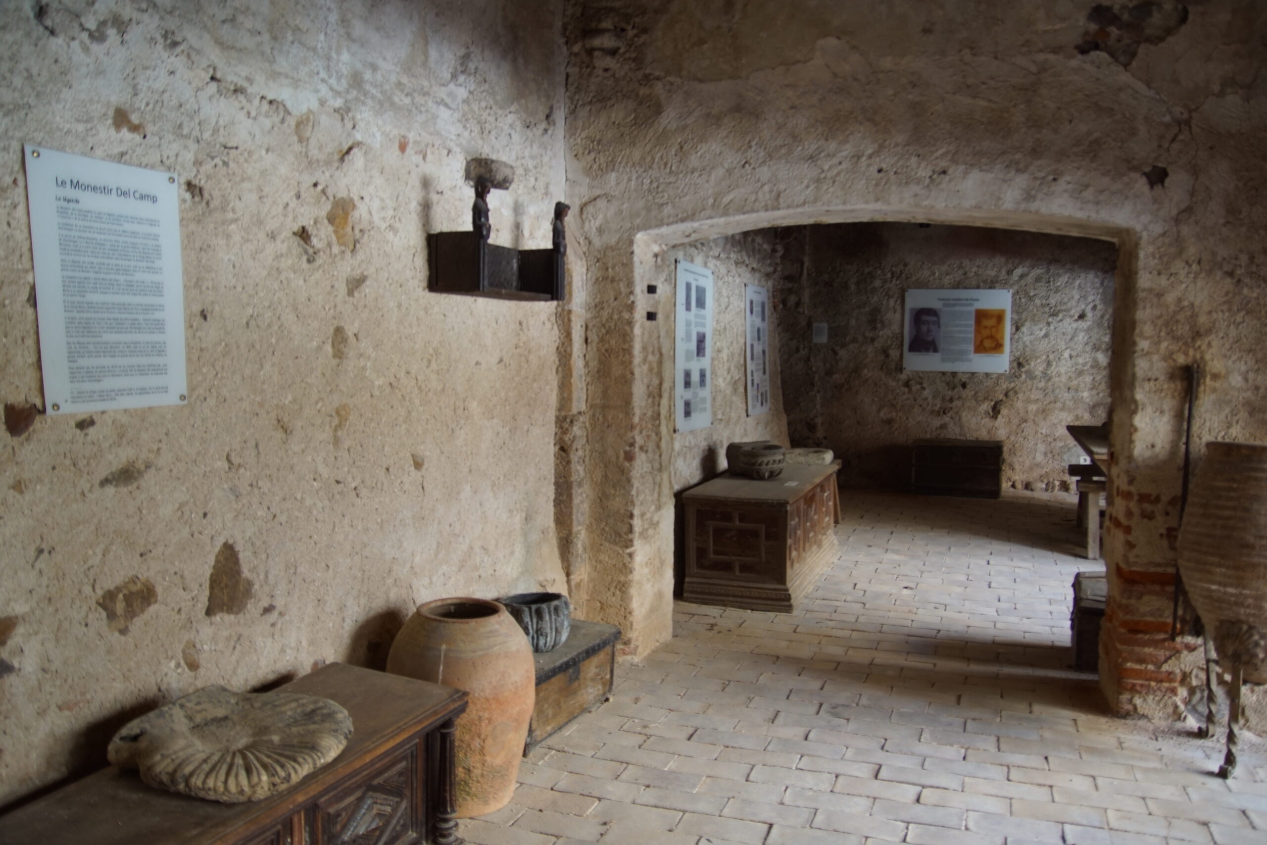 • En début d’après midi, par St Cyprien, les abords d’Elne, puis la campagne nous arrivons au Prieuré du Monastir del Camp*** (photo ci-dessus, c’est le nom qui m’a fait flasher…), après 30km/40mn, il est alors 15h20 et nous sommes les premiers visiteurs de la saison. Découverte totale de cet endroit avec la gardienne des lieux depuis 35 ans, projection sur l’histoire du lieu, puis visite libre 3€/pers. cash. Chapelle, cloître et différentes salles à l’état brut ou en cours de réhabilitation, collection de crucifix du nouveau propriétaire. Il y a aussi une expo d’un peintre « original » avec discussions surréalistes… Nous en repartons enchantés vers 17h00.