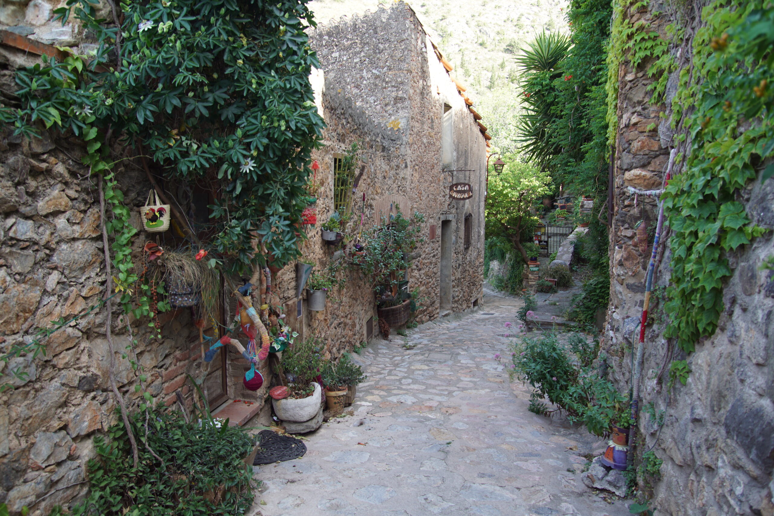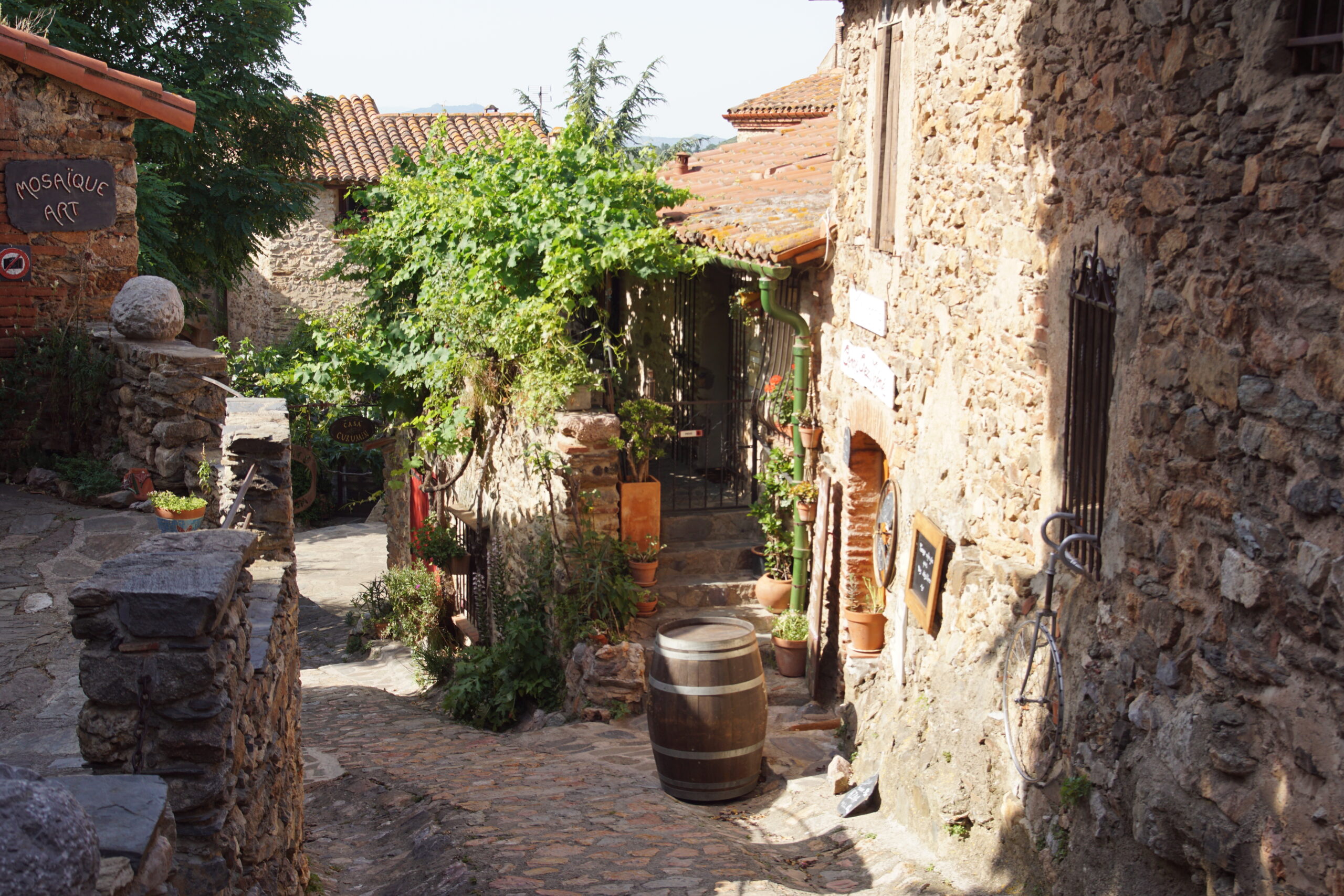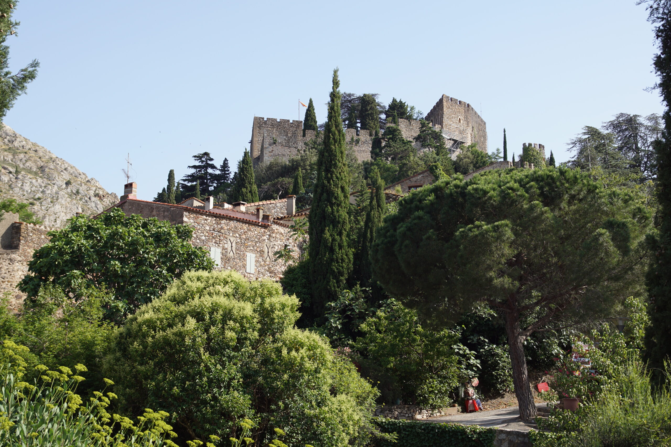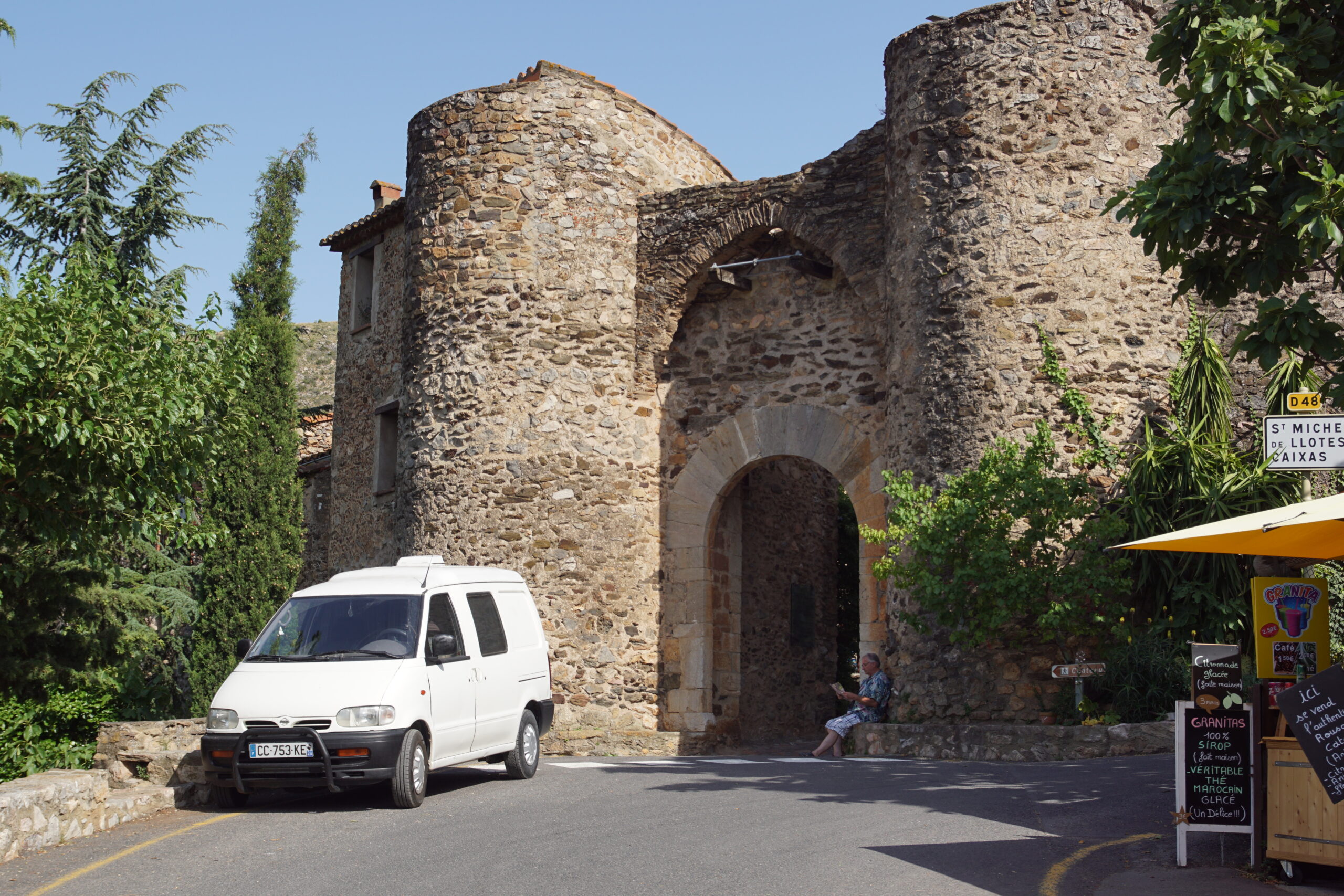 • L’autre but du jour est à 15km/20mn : le village perché de Castelnou*** (parking à l’entrée). Bonnes chaussures pour arpenter les ruelles pentues. Nombreux artisans et expos malgré l’heure tardive. Papotages avec une des 8 habitants permanents (!). Village authentique méritant d’y passer un peu de bon temps.